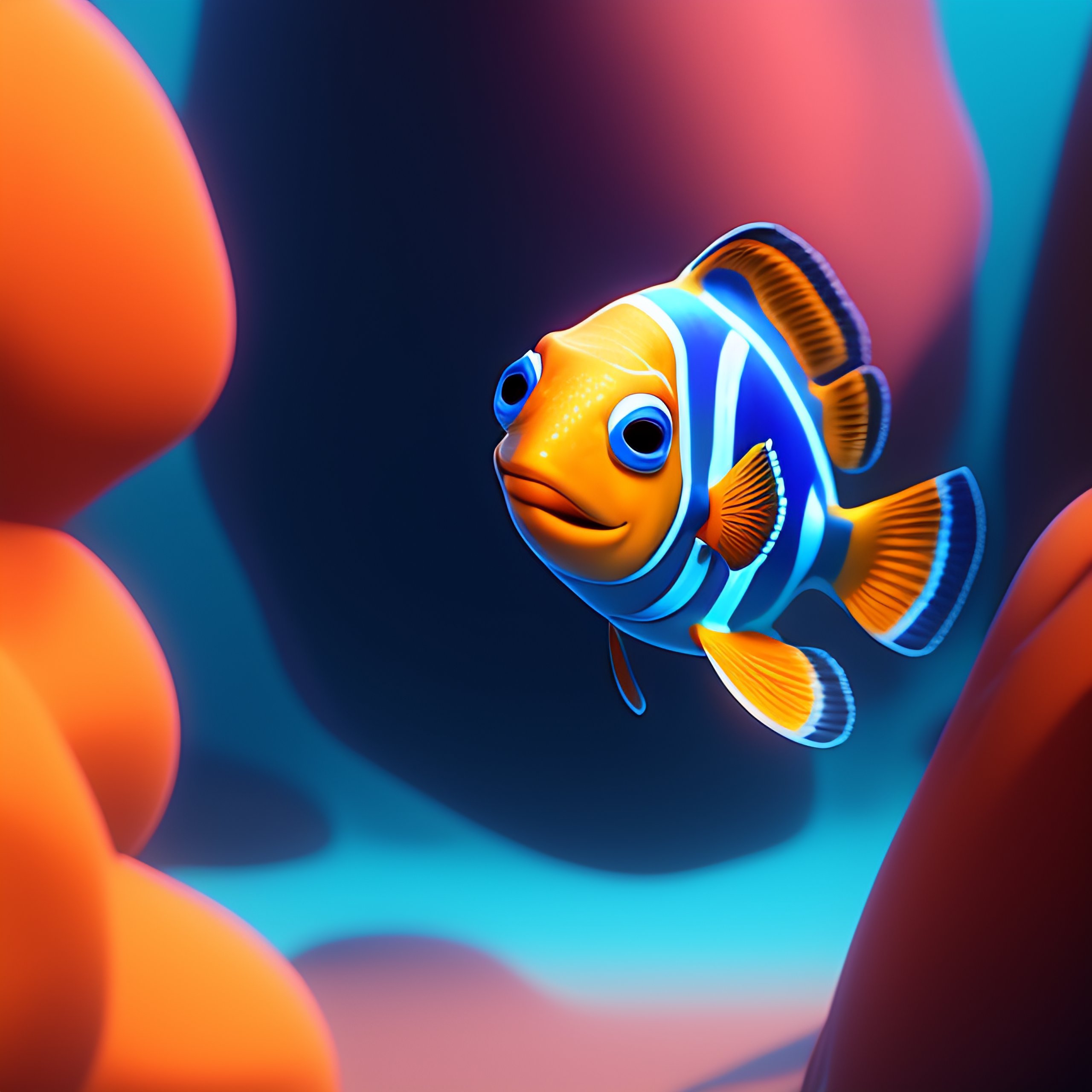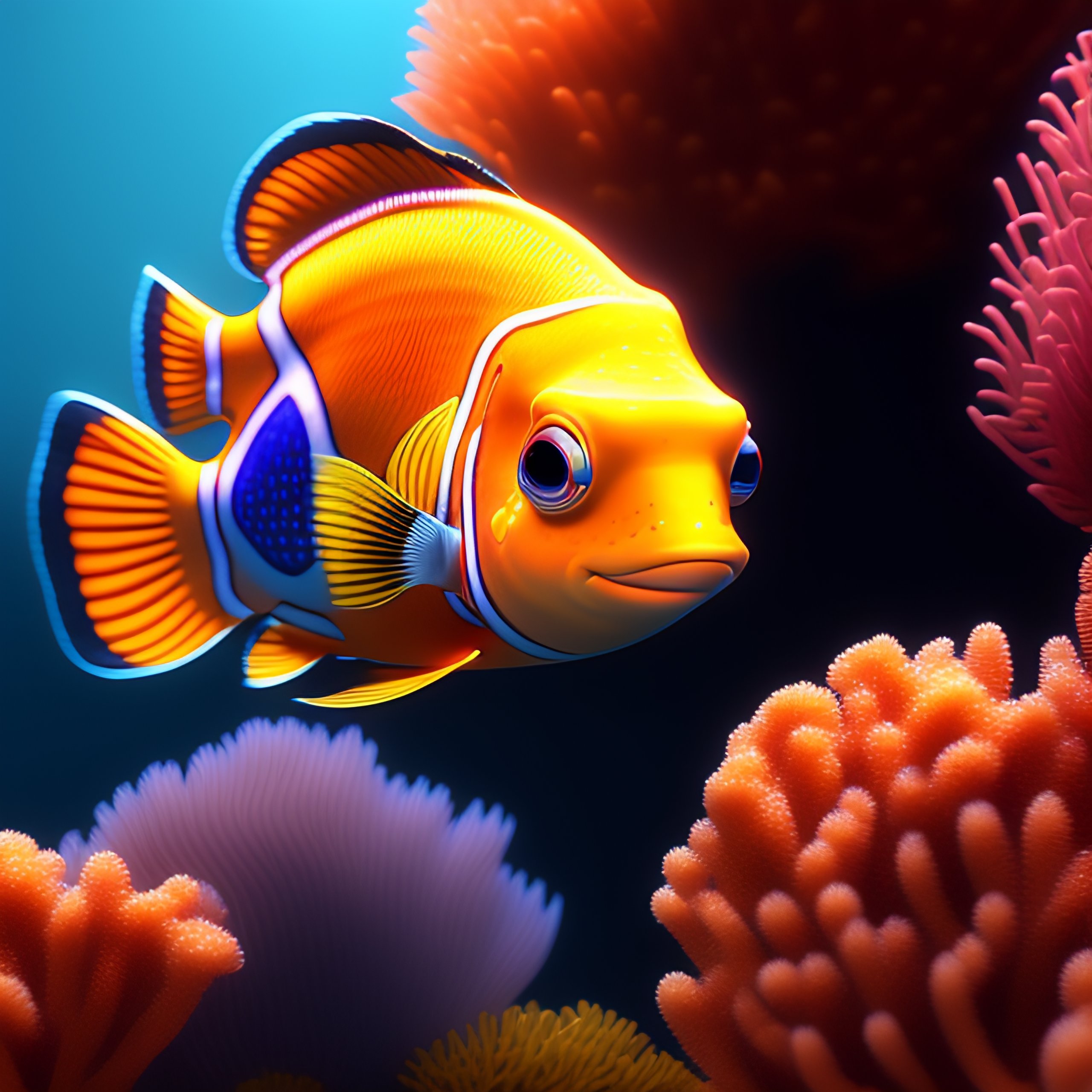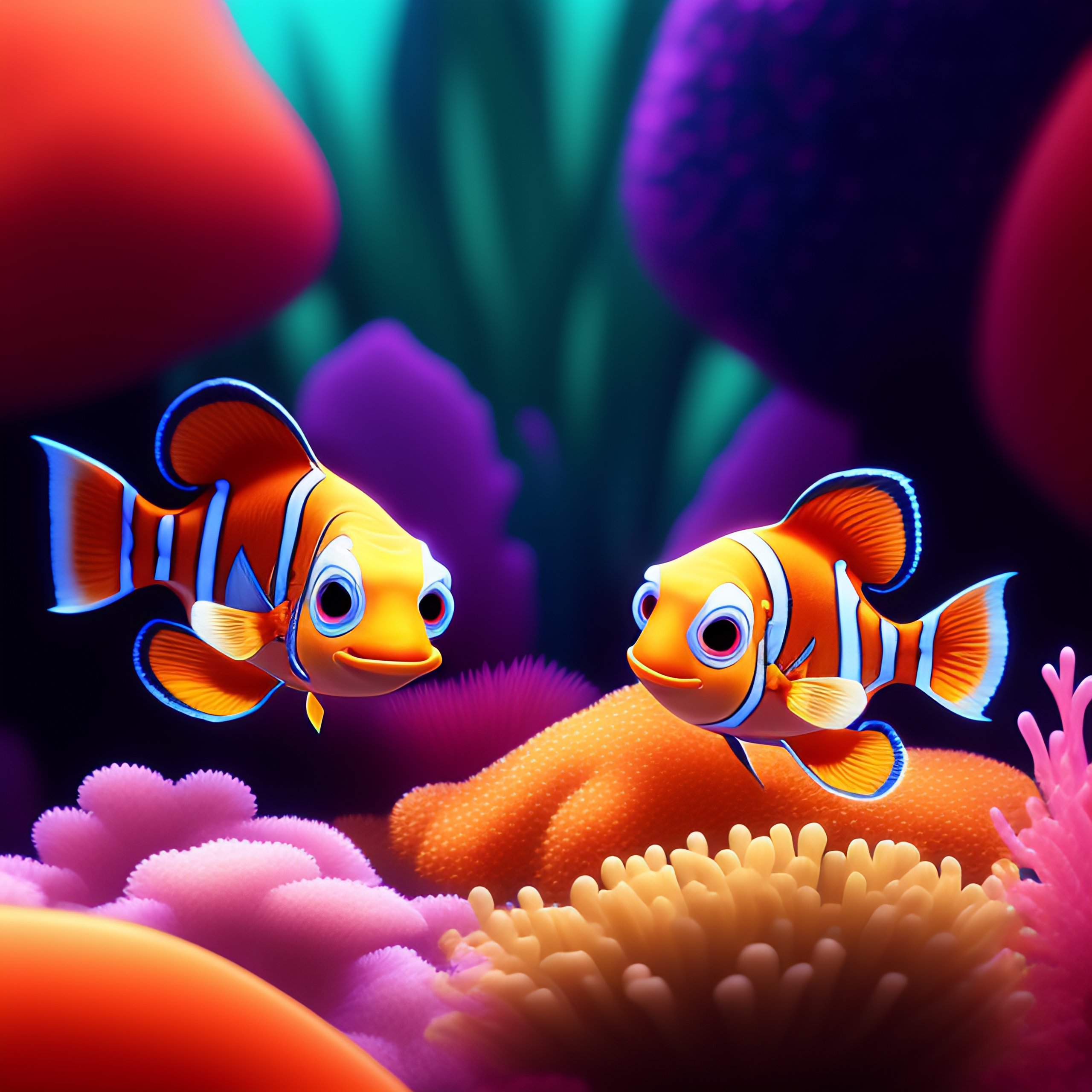 Nemo and dory cartoon character in love, old disney style in 2d, coral reef background, hdr, ray tracing, global illumination, unreal engine 5