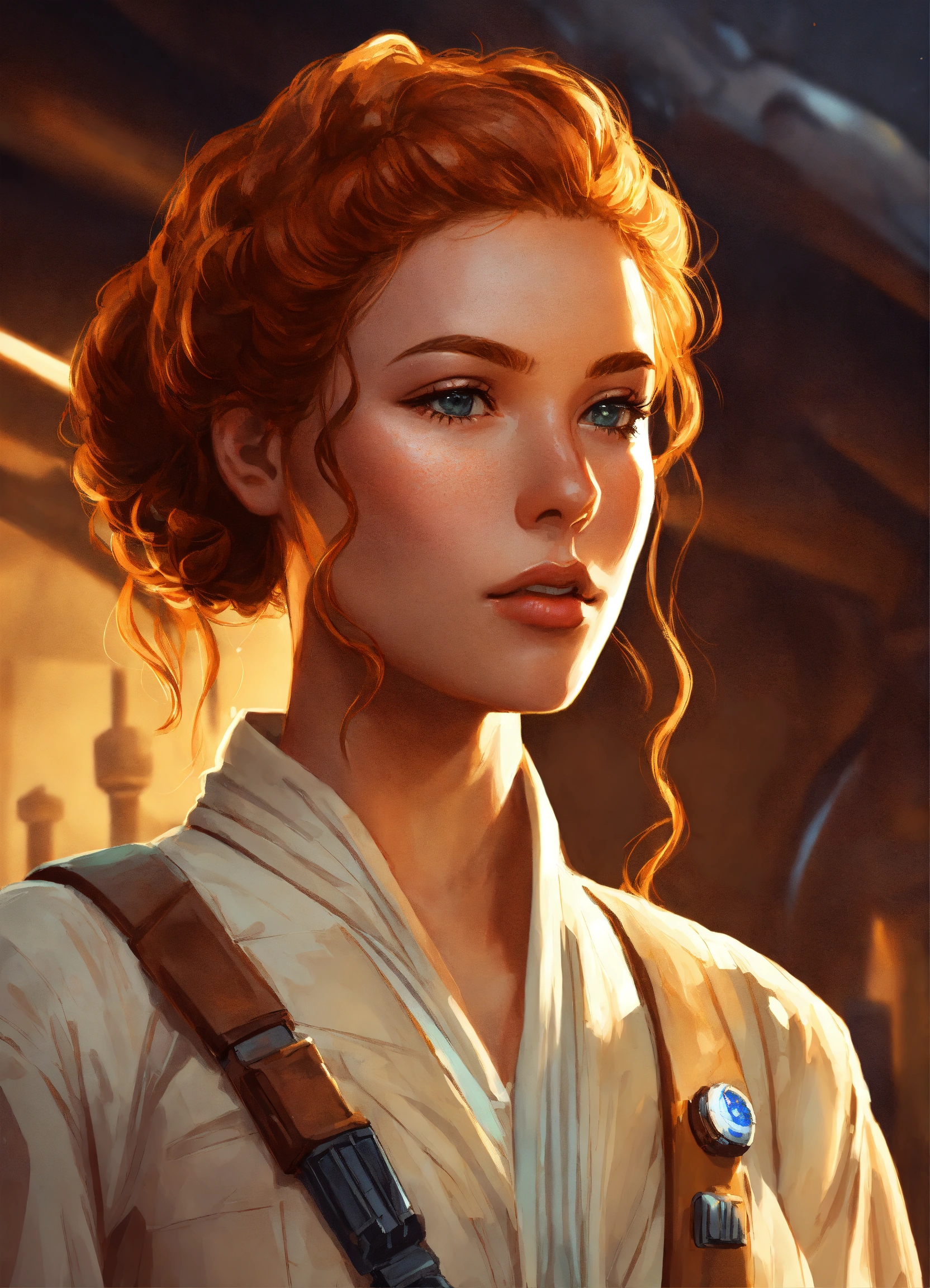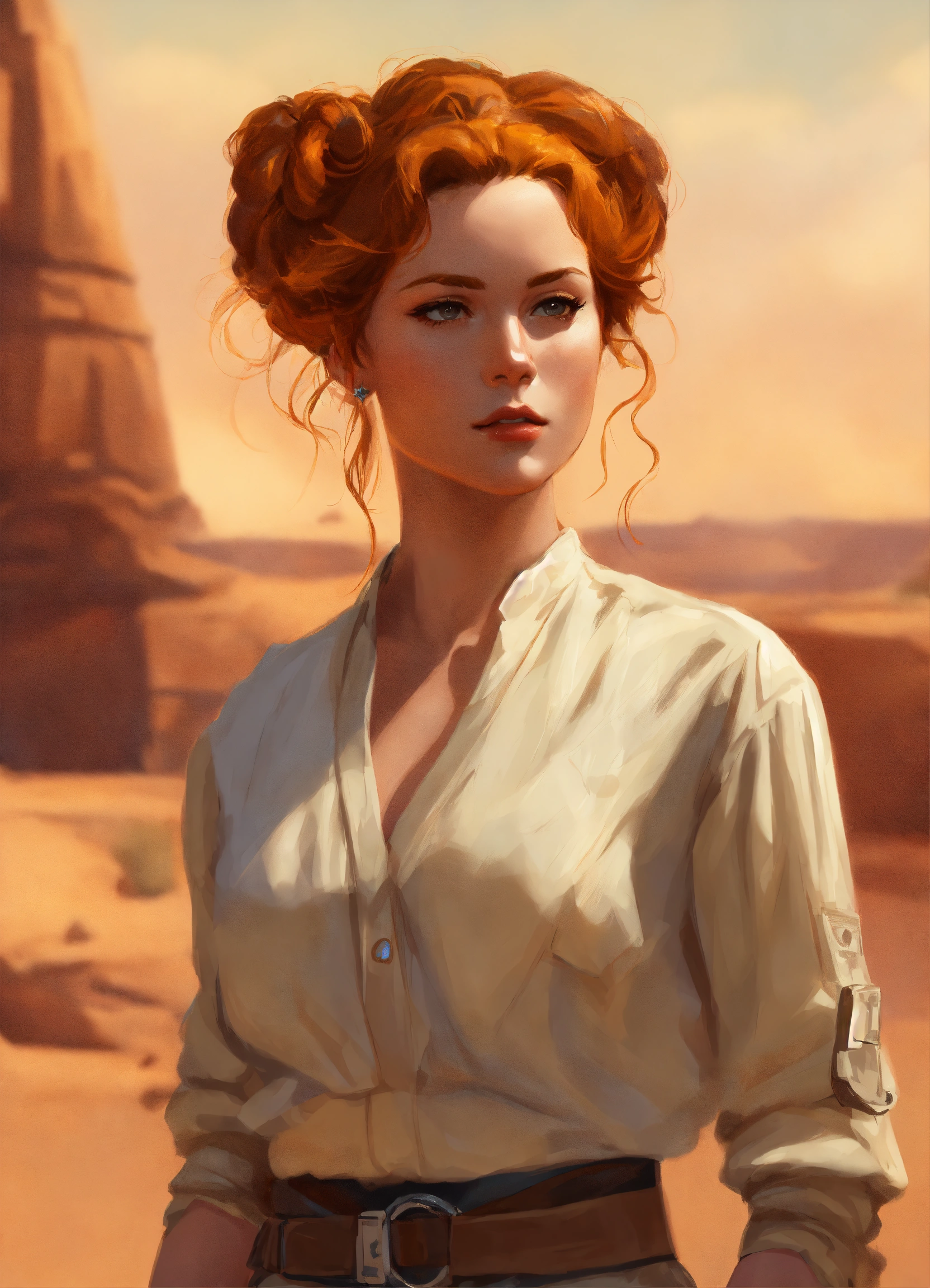 A digital character art portrait of a stunningly gorgeous star wars archaeologist woman with coiffed ginger hair, in a puffy cream blouse.