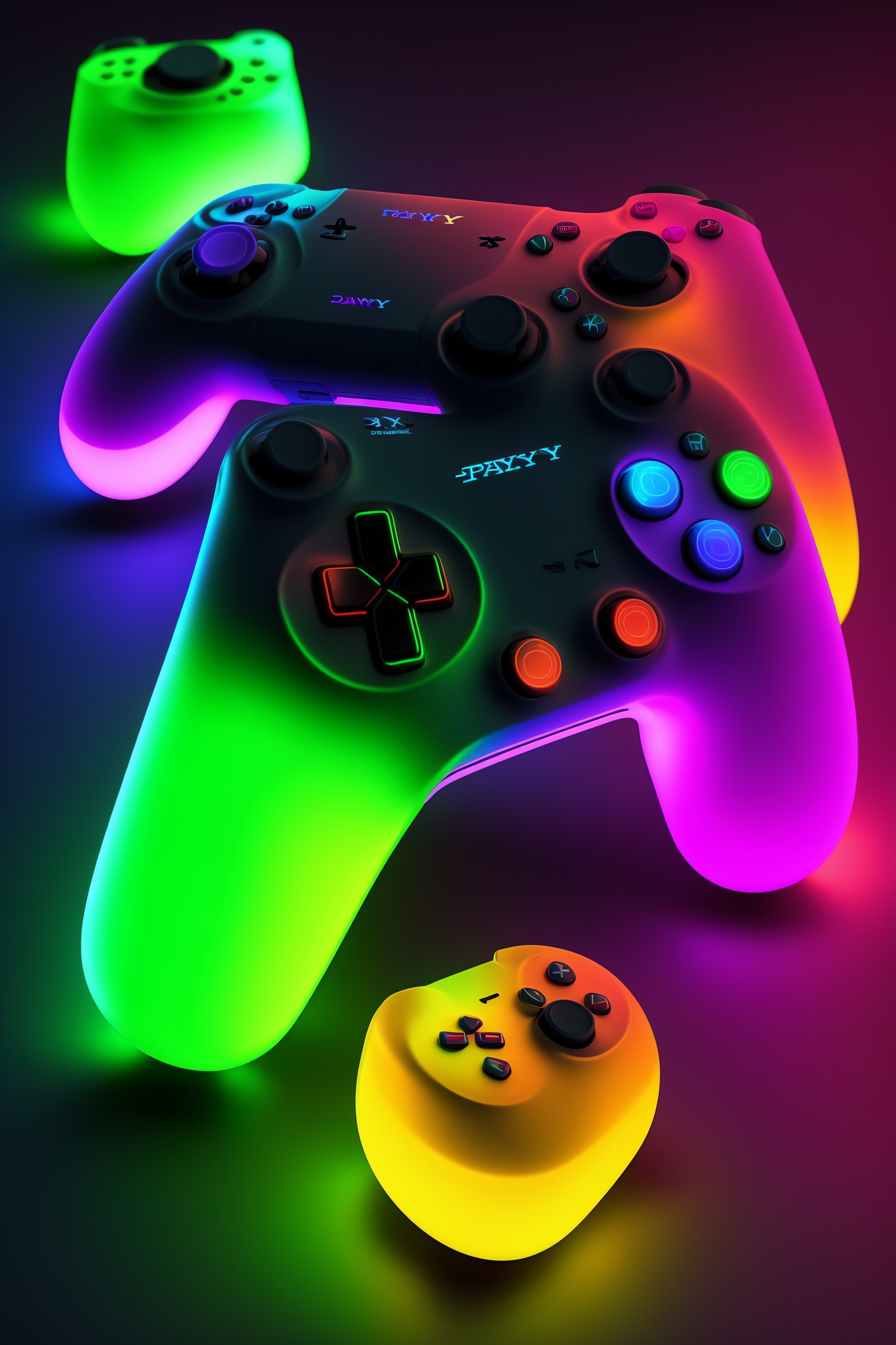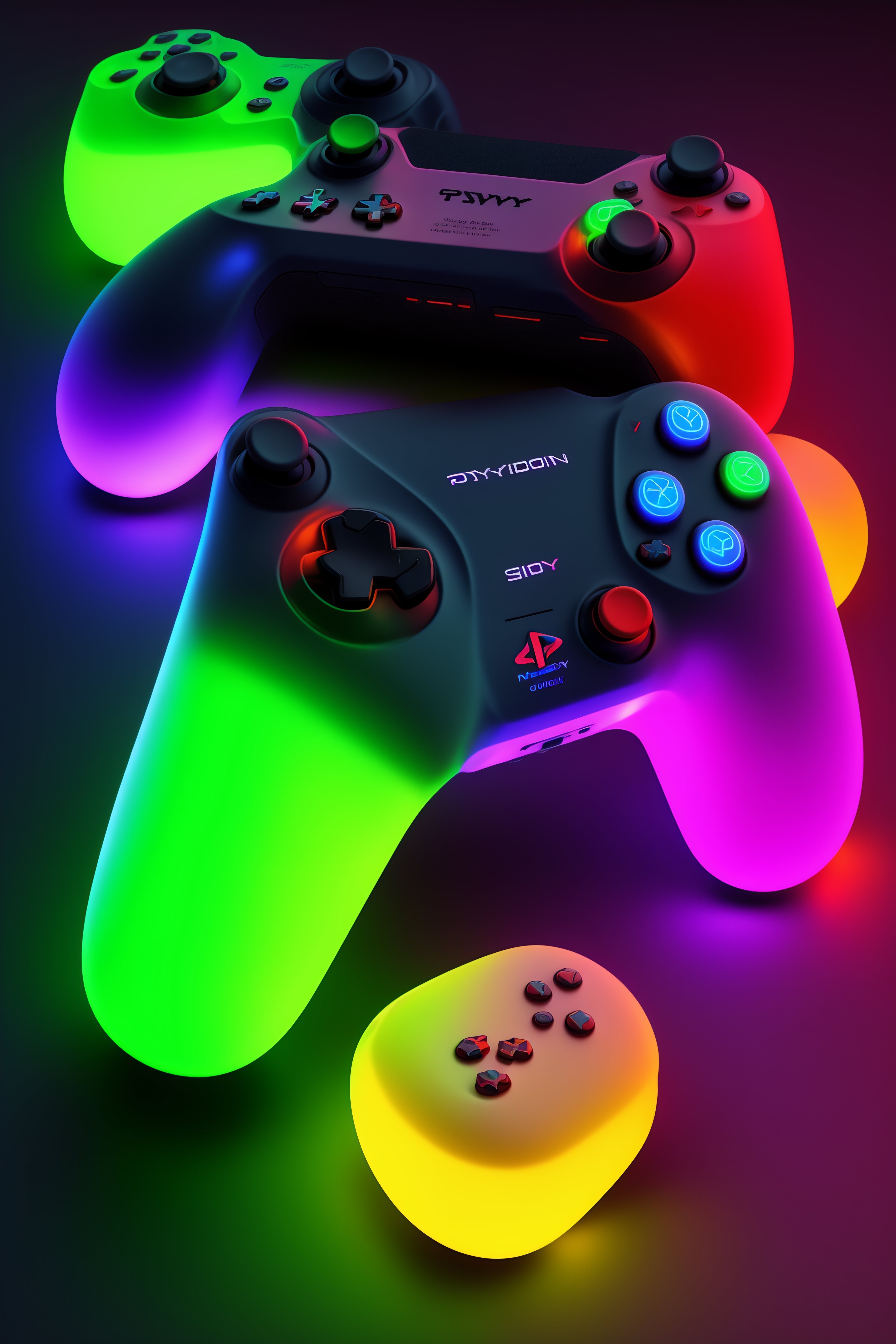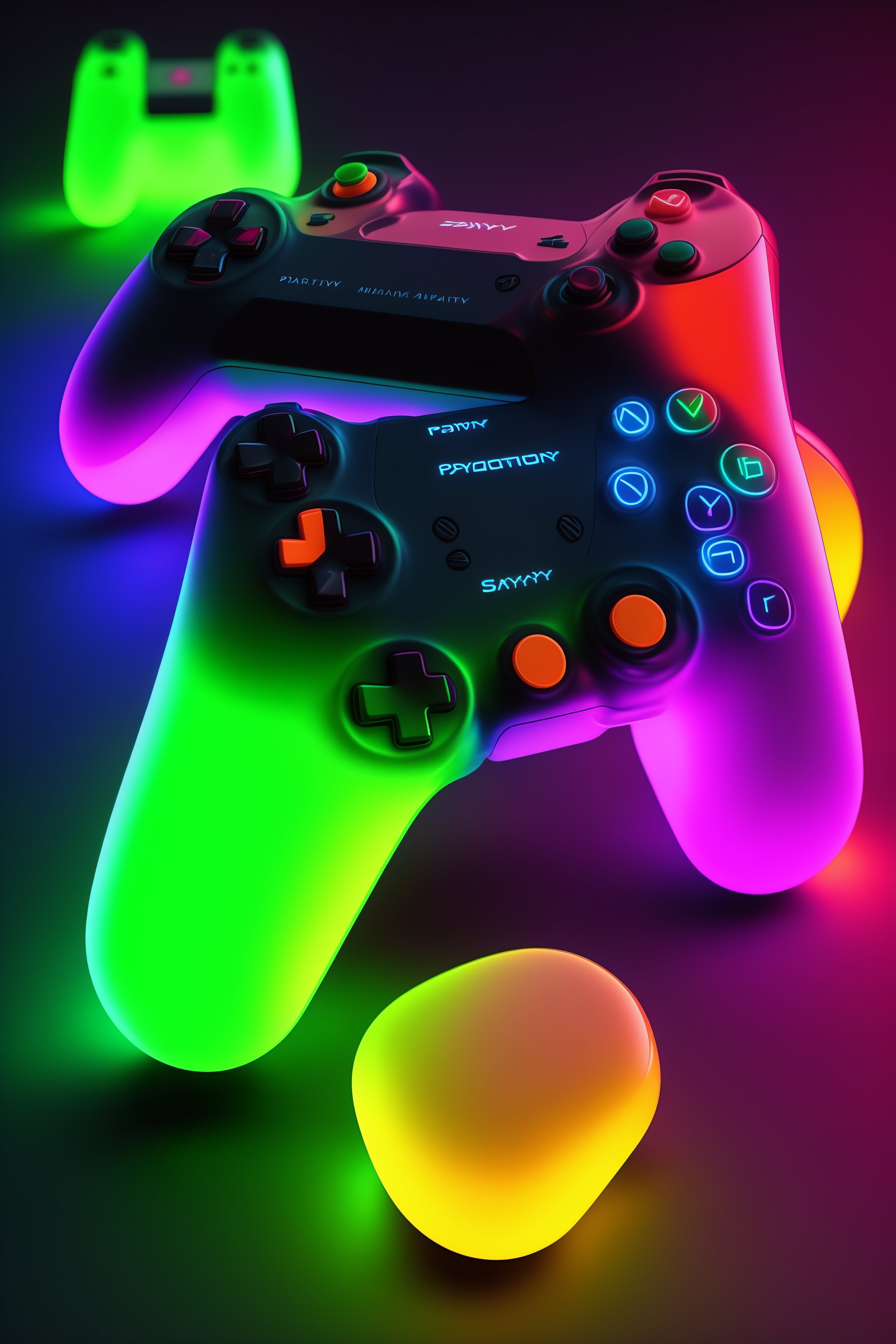 Design a futuristic, neon-colored gaming controller in the style of a playstation controller. the controller should have a liquified, metallic appearance and should be surrounded by swirling, glowing neon accents.