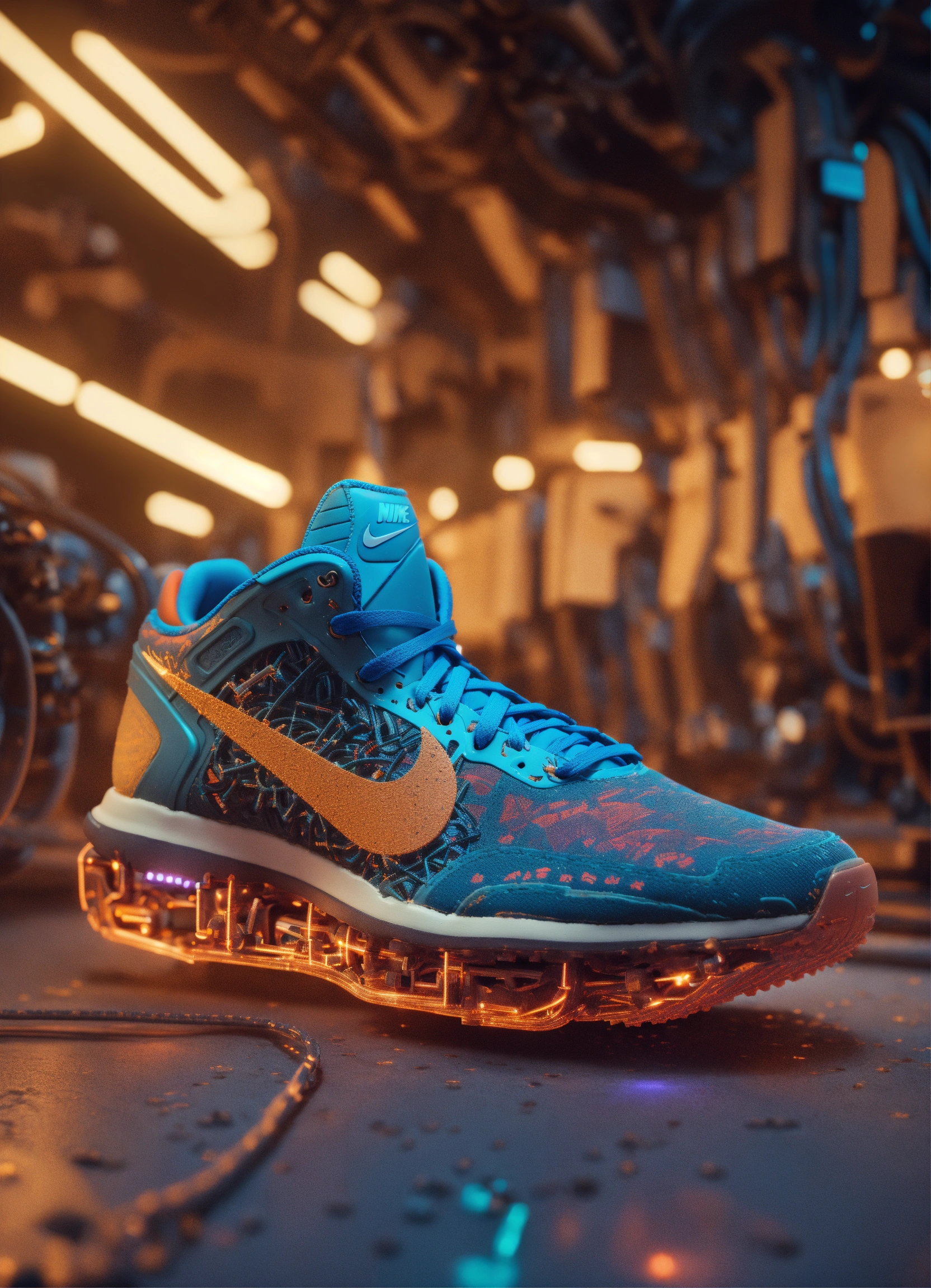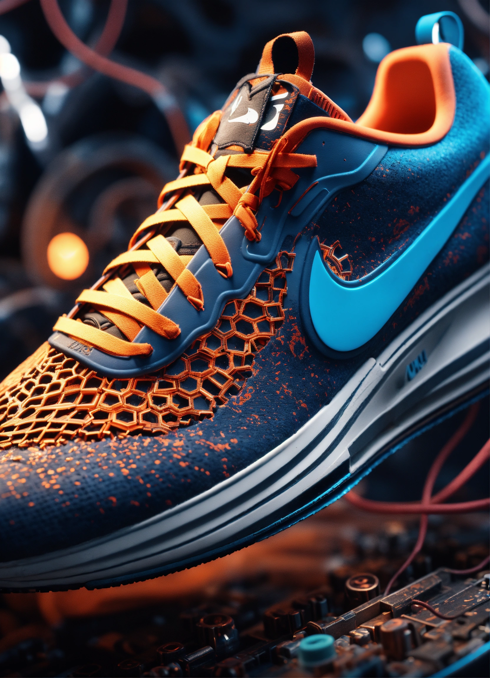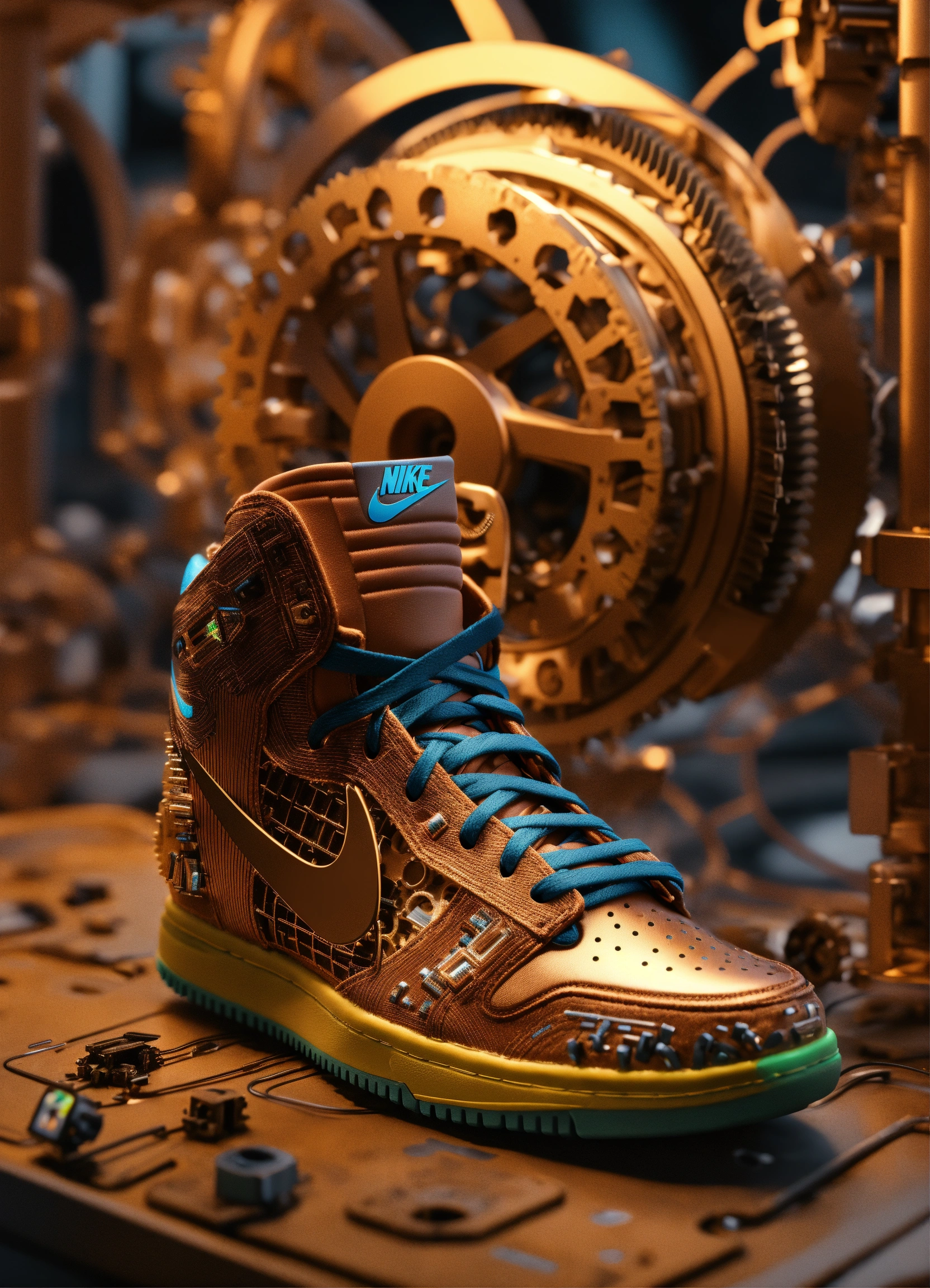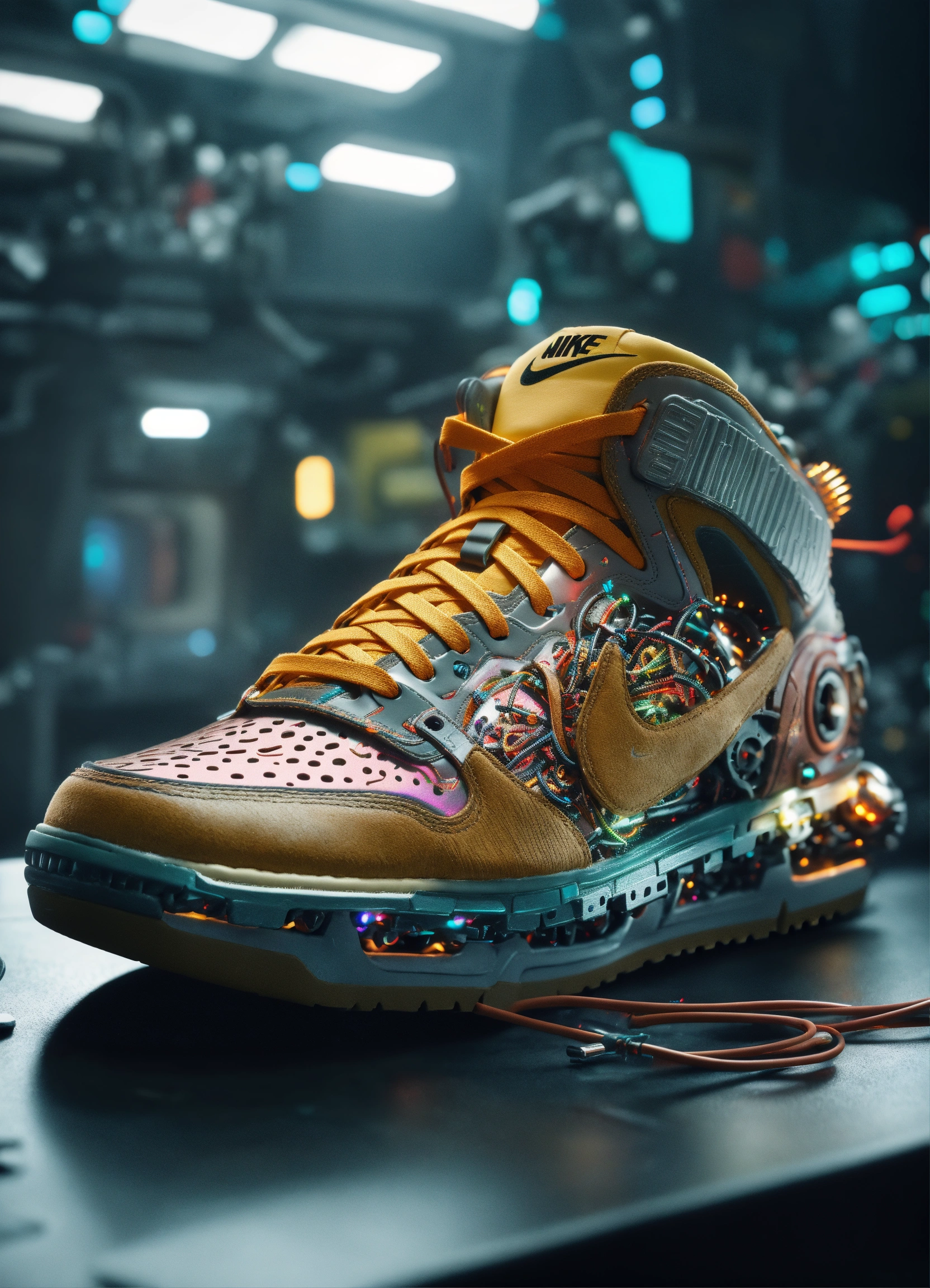 Nike sneakers made out (gears, wires, mechanical, electronics), pcb, hyper-realis, futurist, stunning unreal engine render, product photography 8k, hyper-realistic. surrealism
