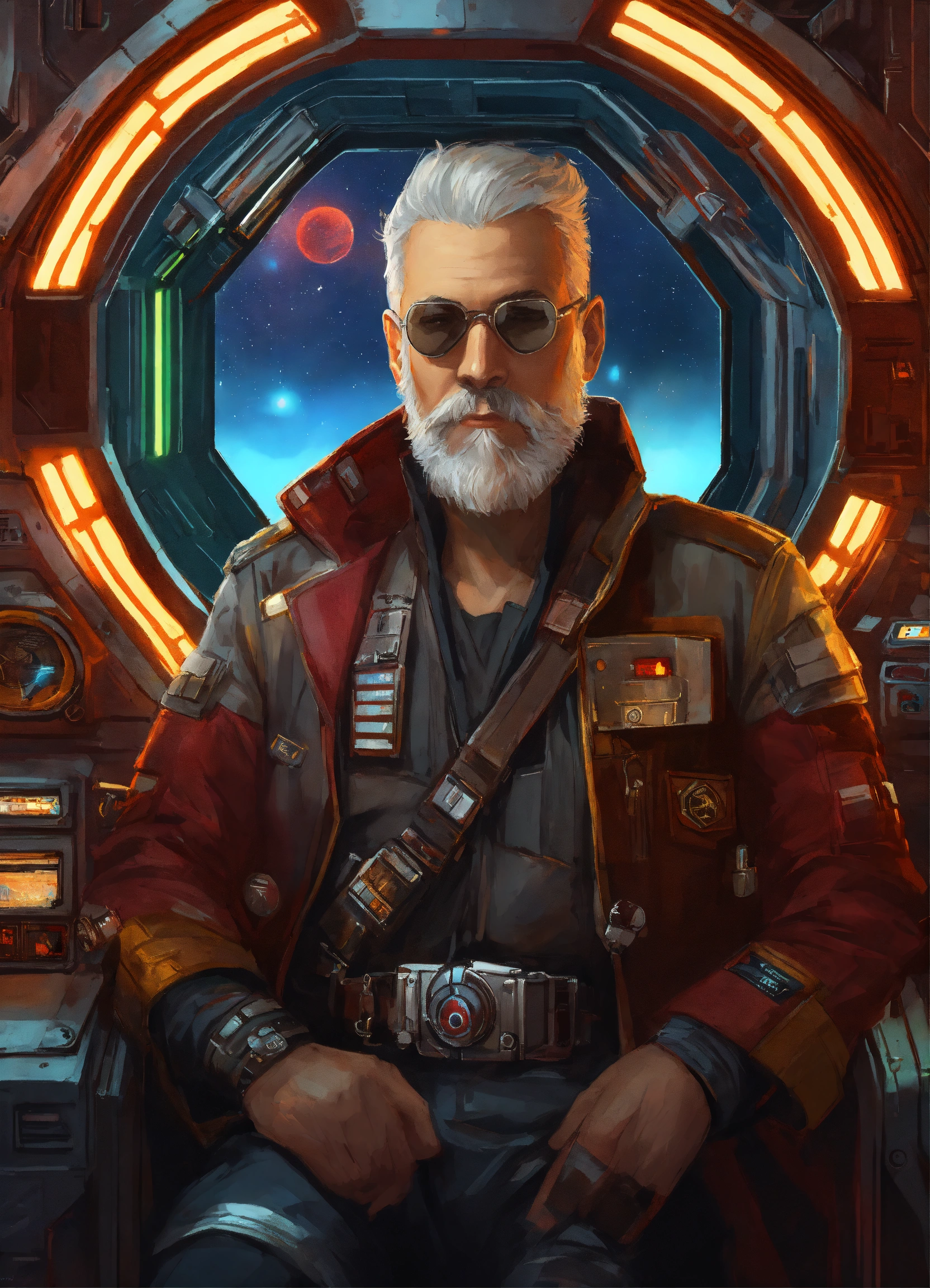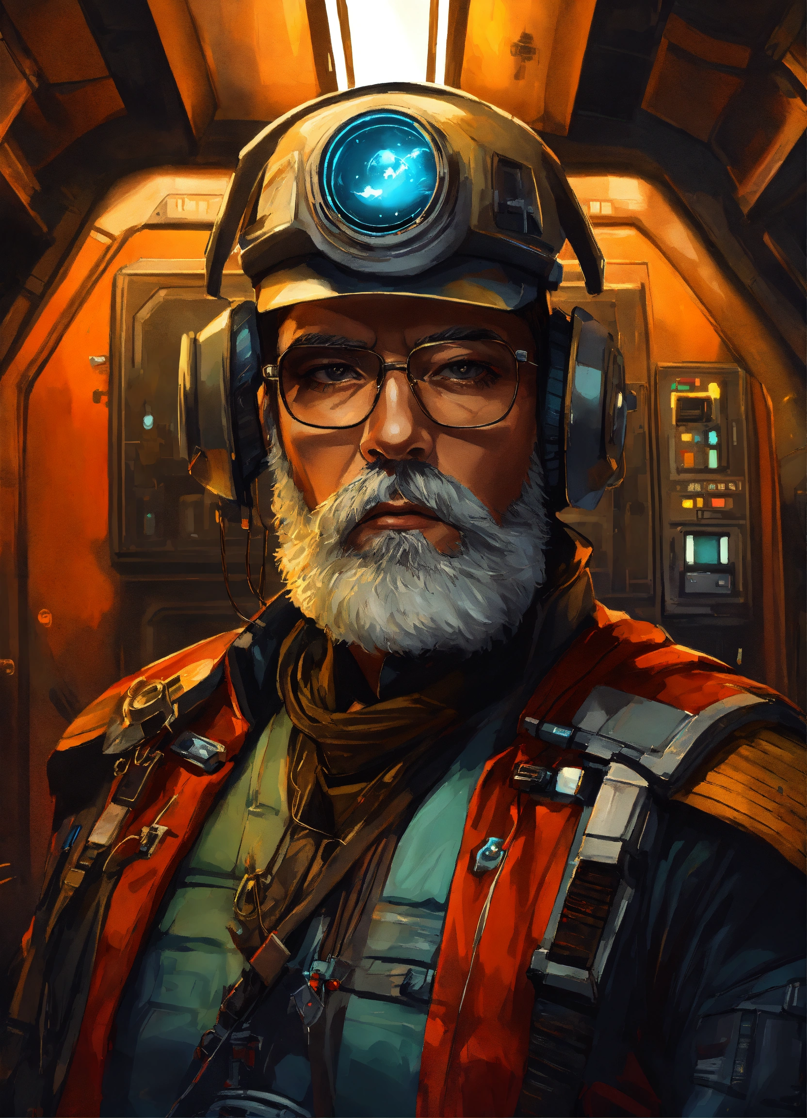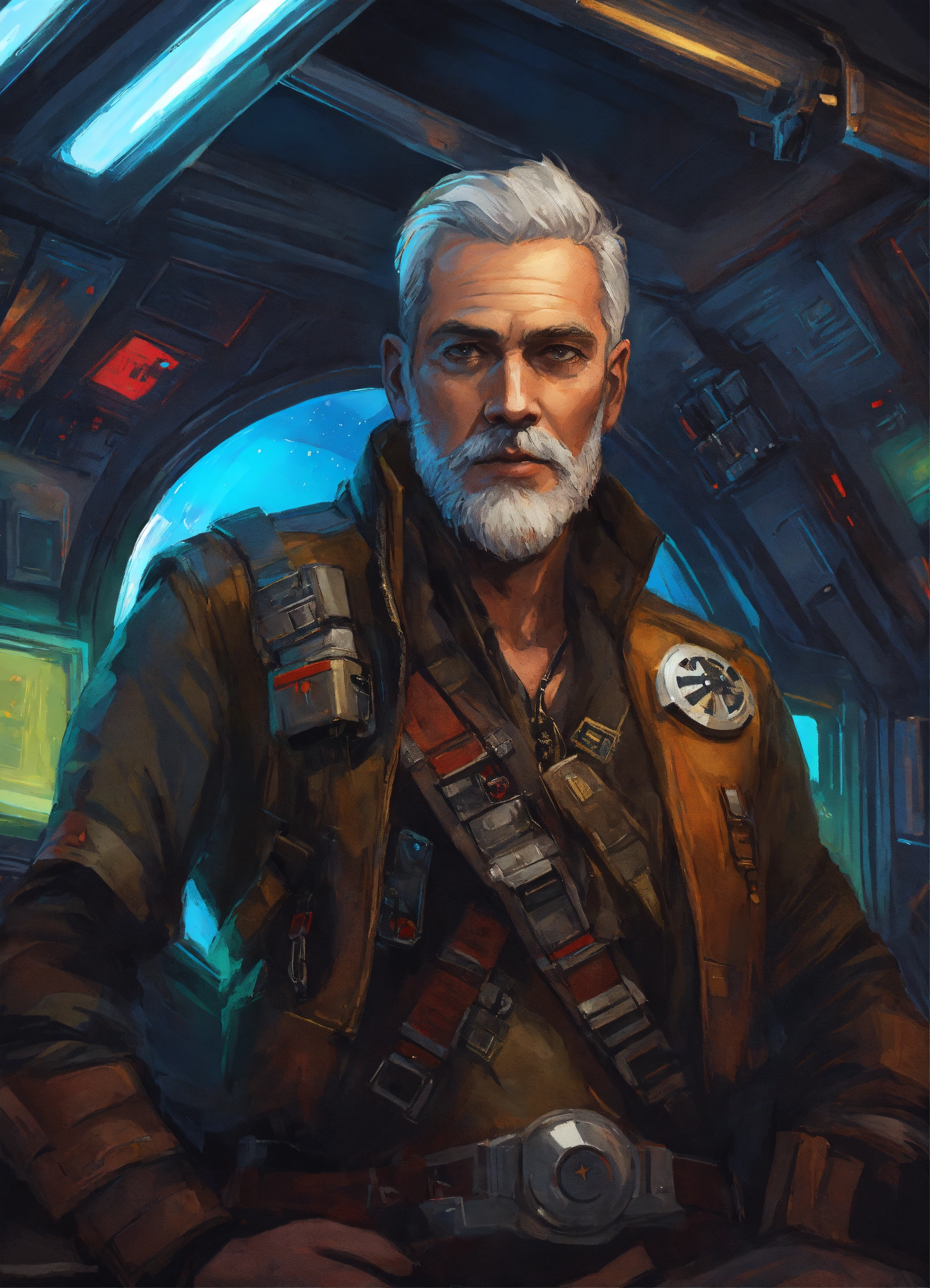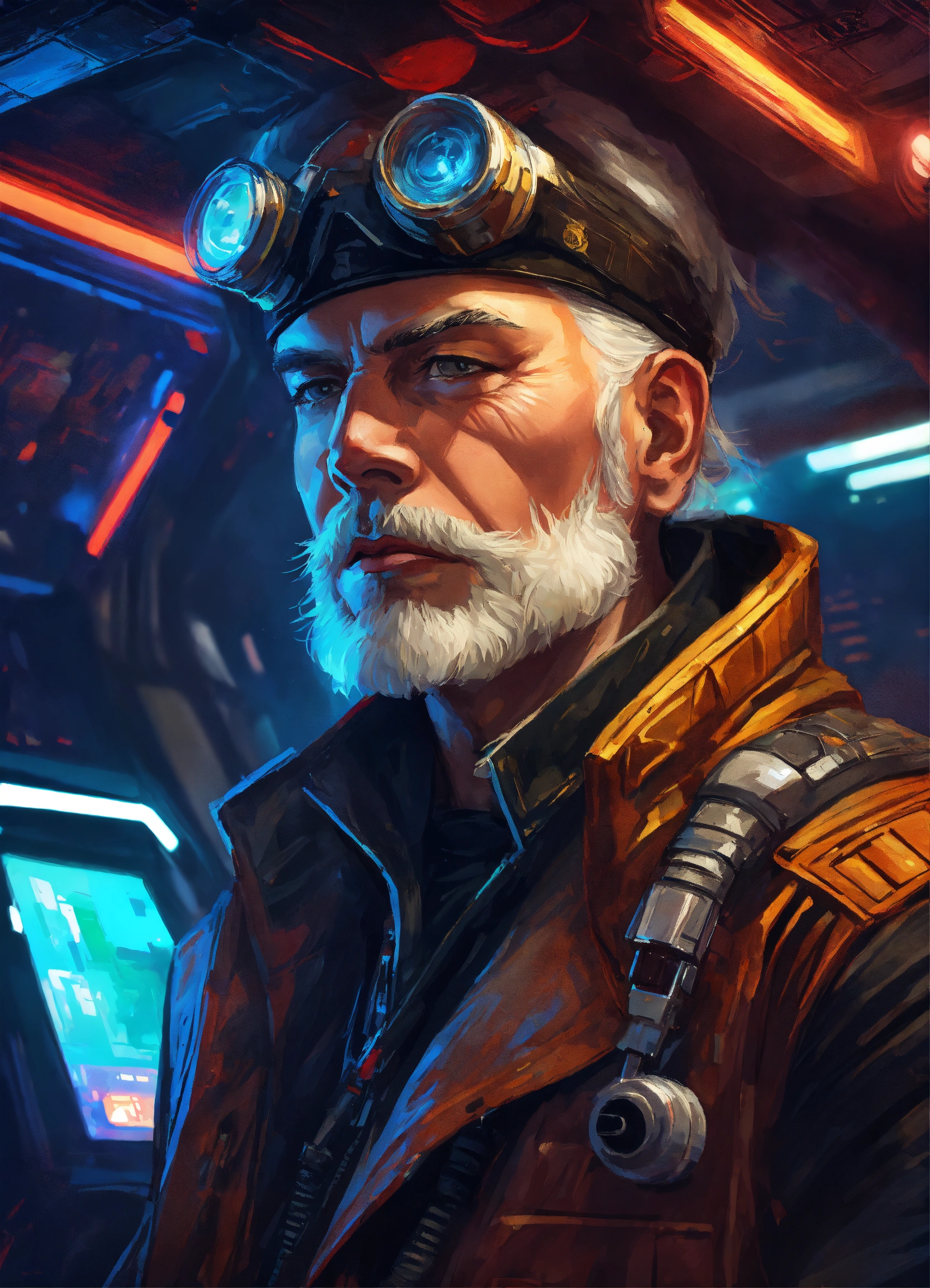 Digital art portrait of a graying cyberpunk pirate captain in a star wars spaceship displayed on a wall