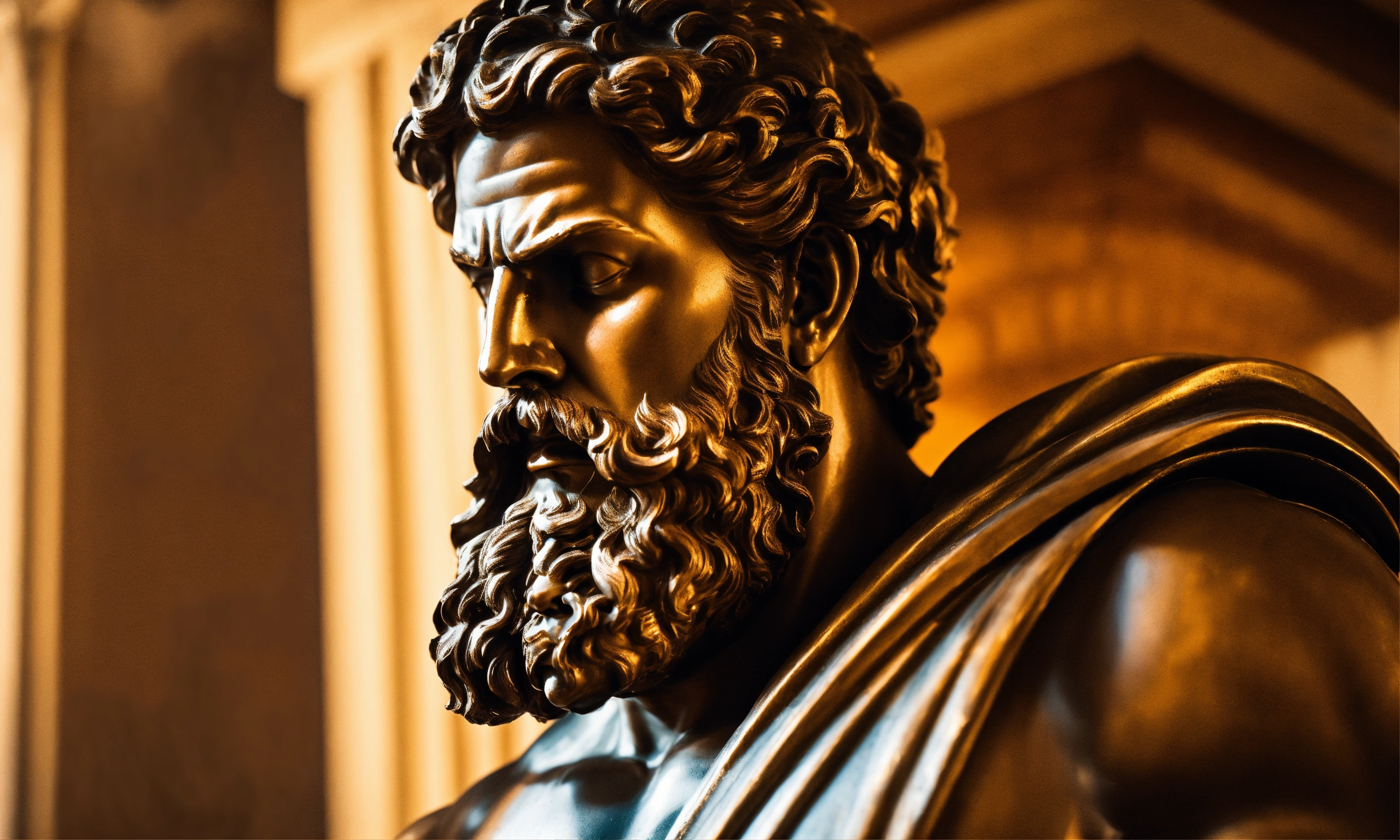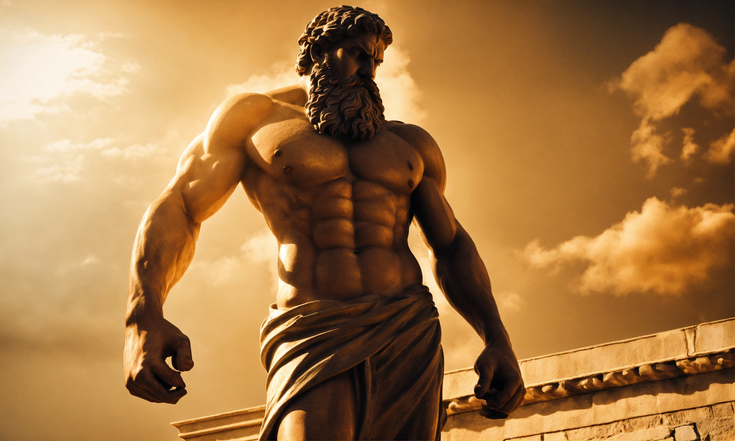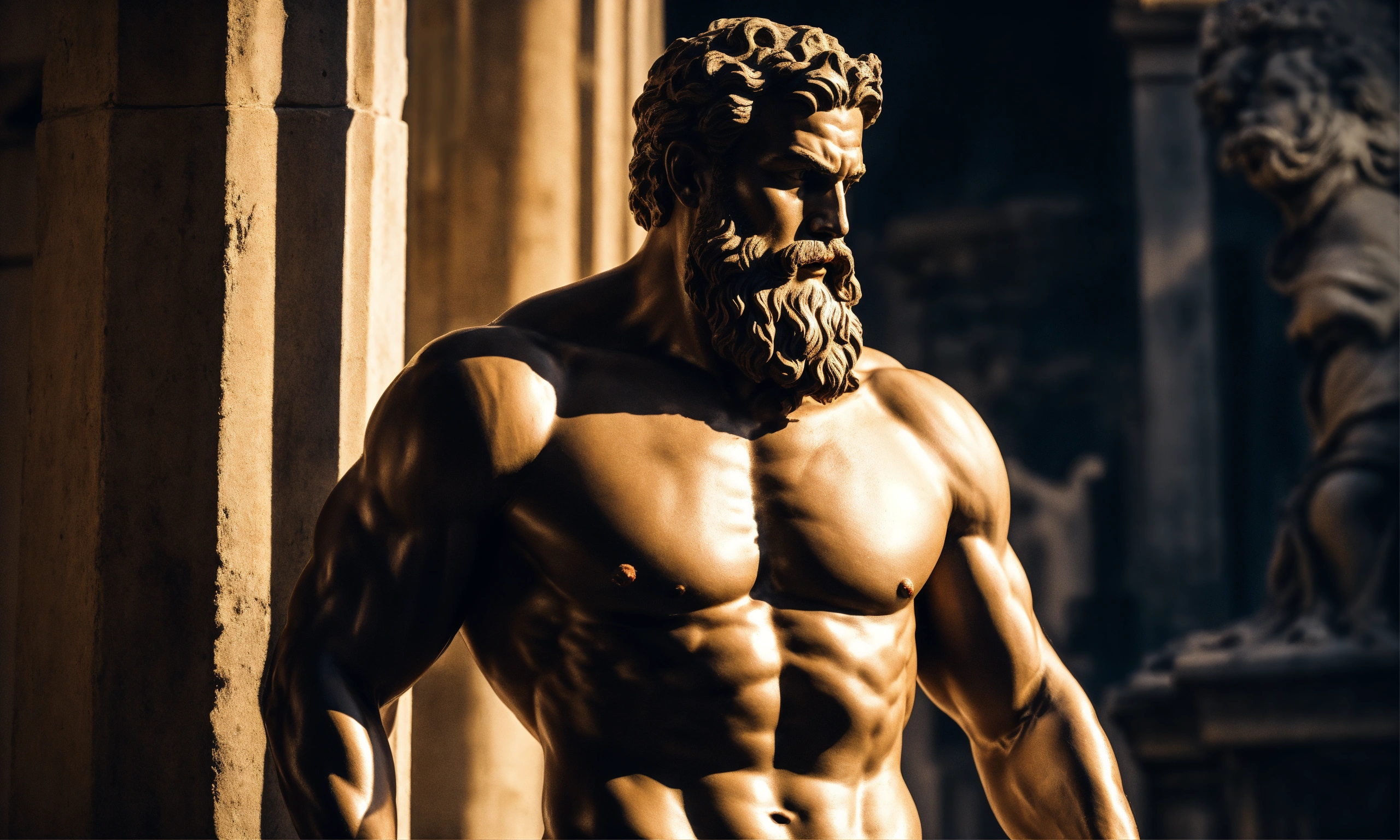 Greek statue strong man standing with aggressive beard expression sideways, casting a striking shadow.