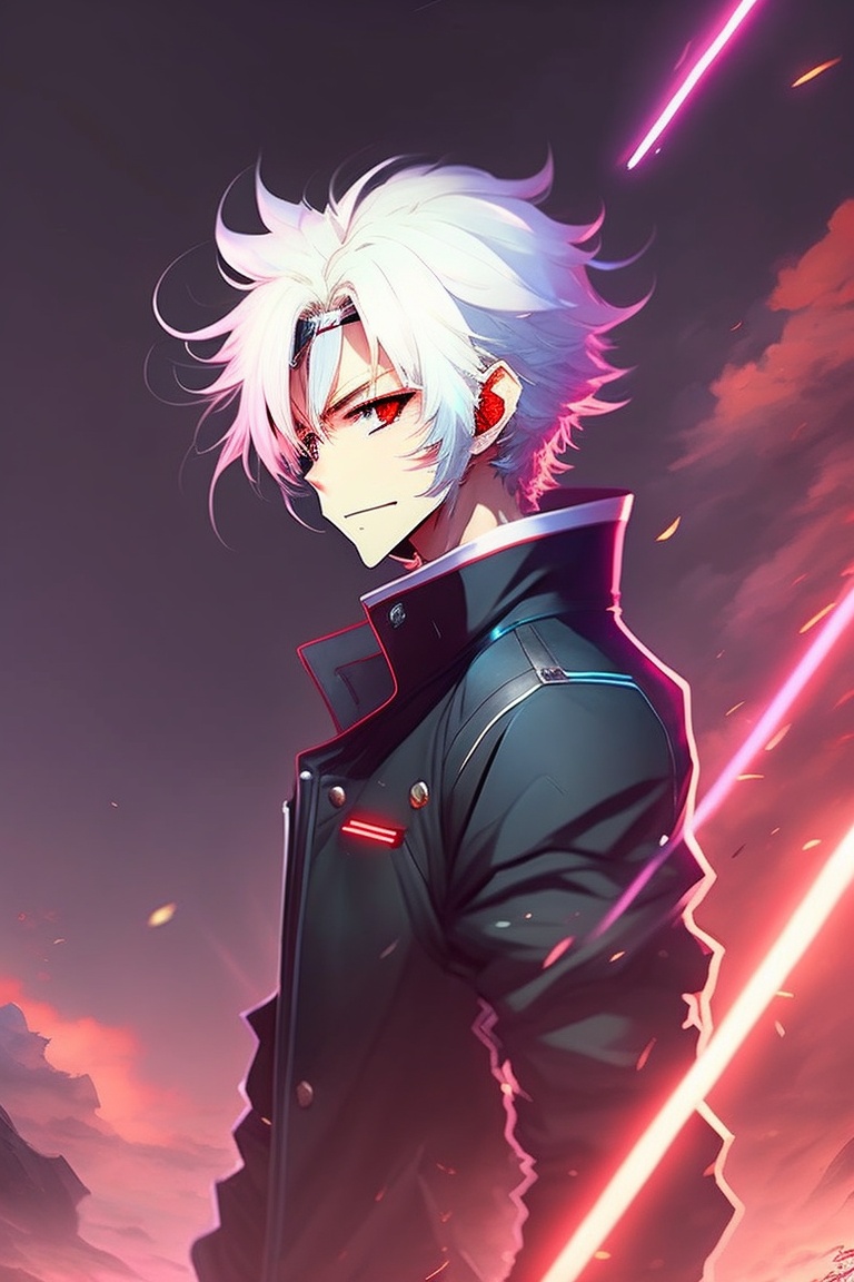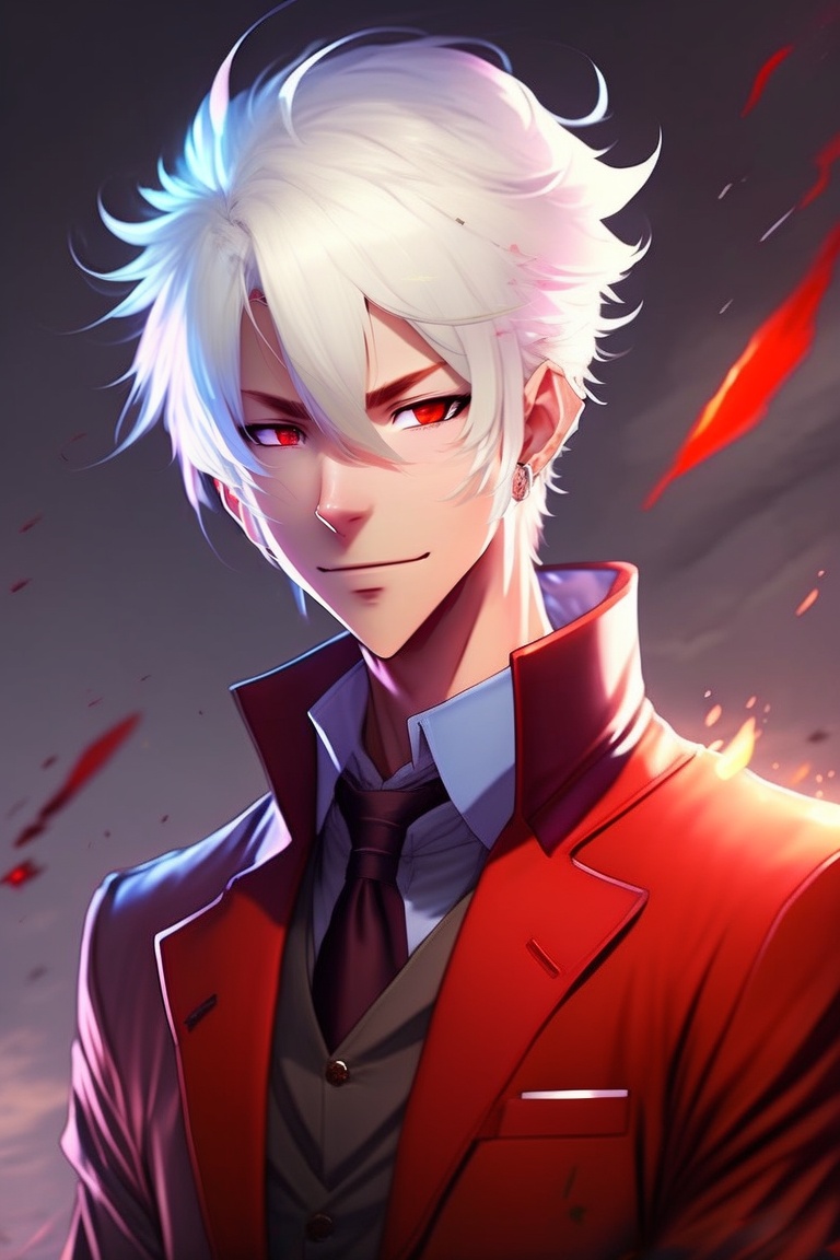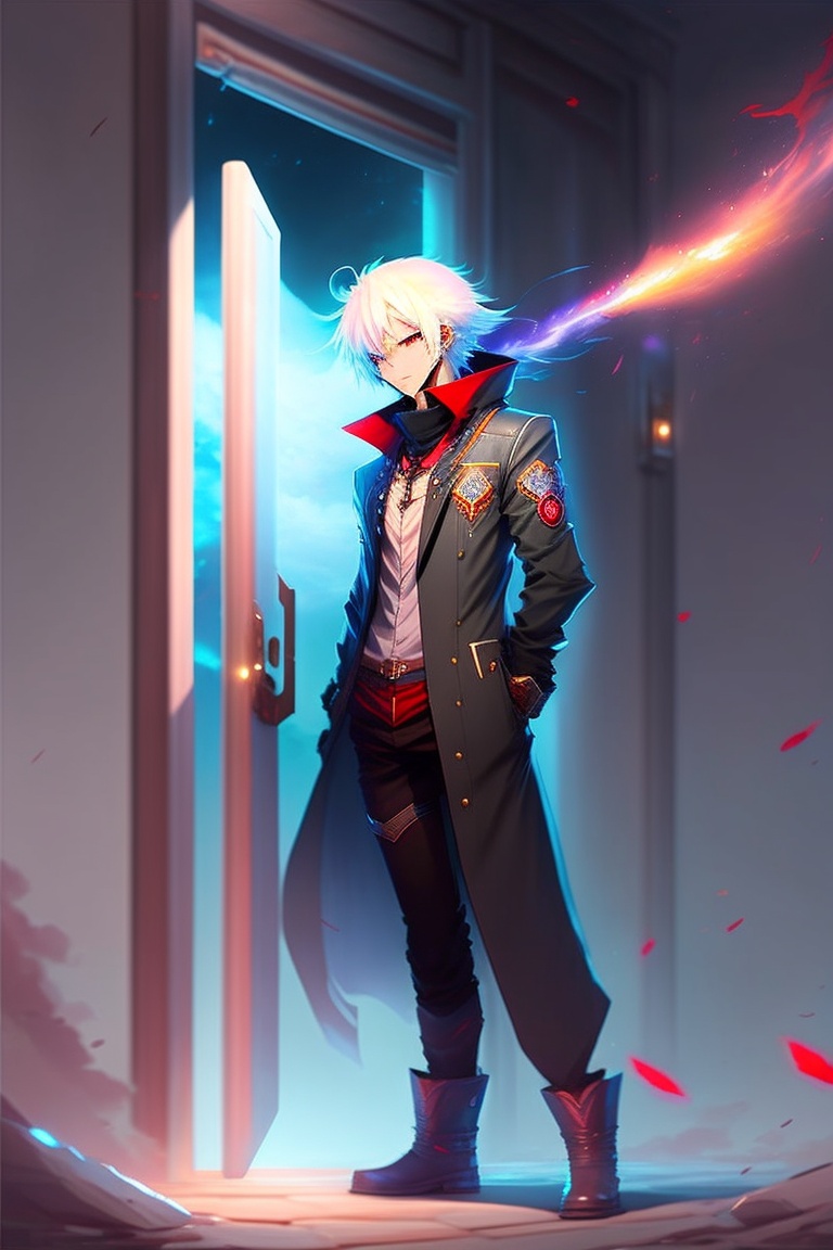 Anime::10 a psychopath with white hair and red eyes and a creepy smile breaks down the door with his foot, brush strokes::10