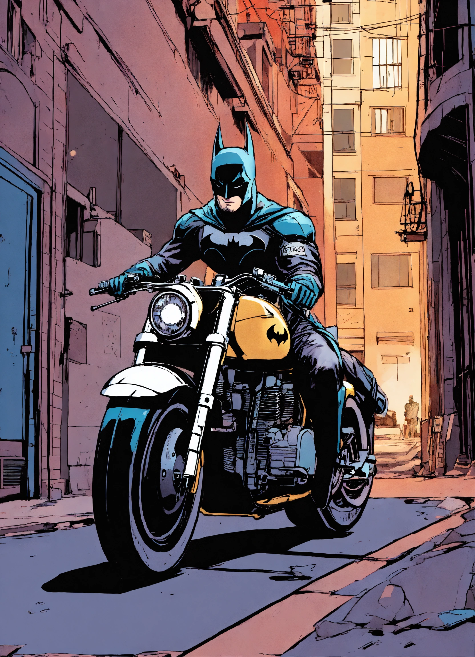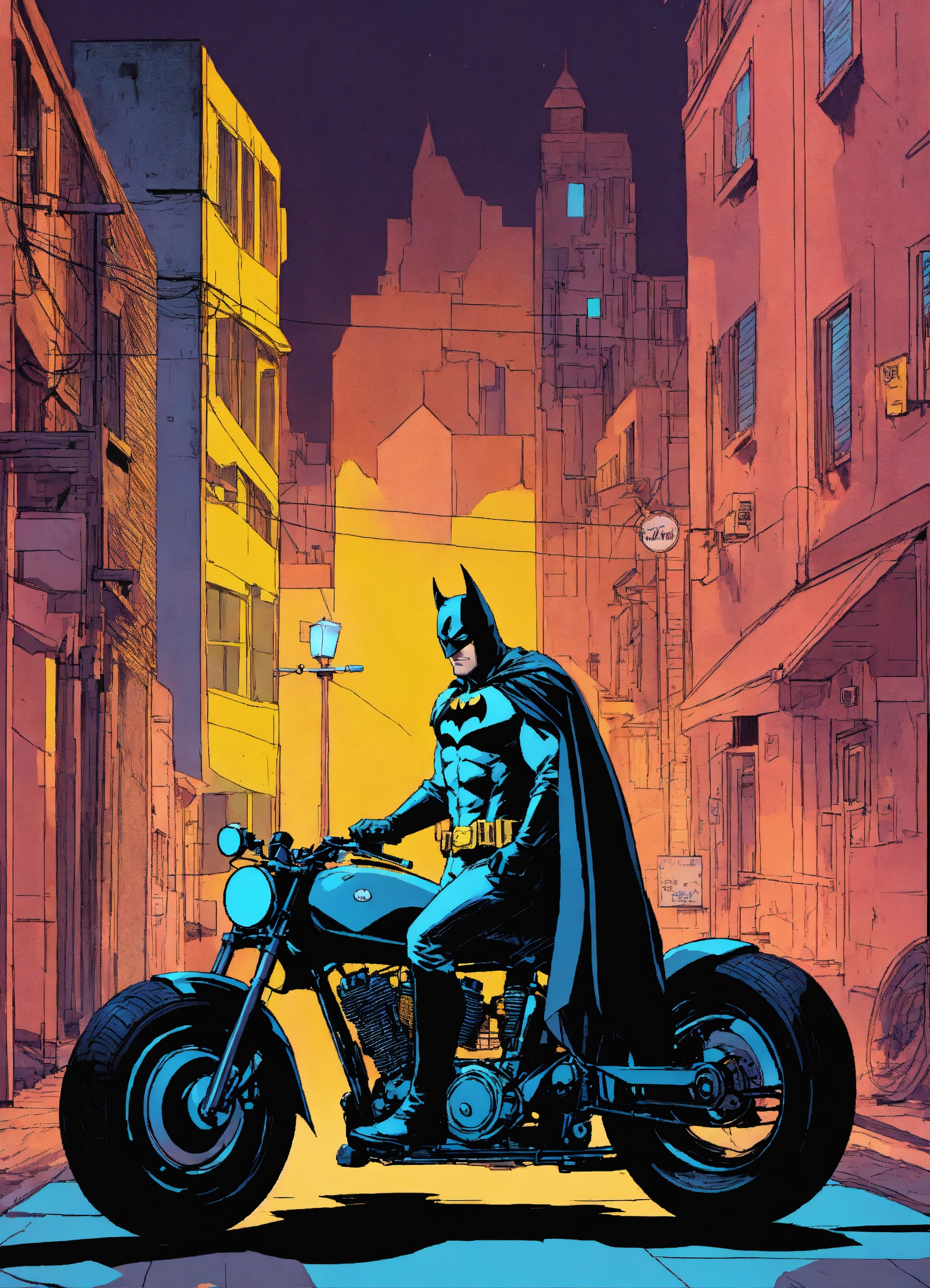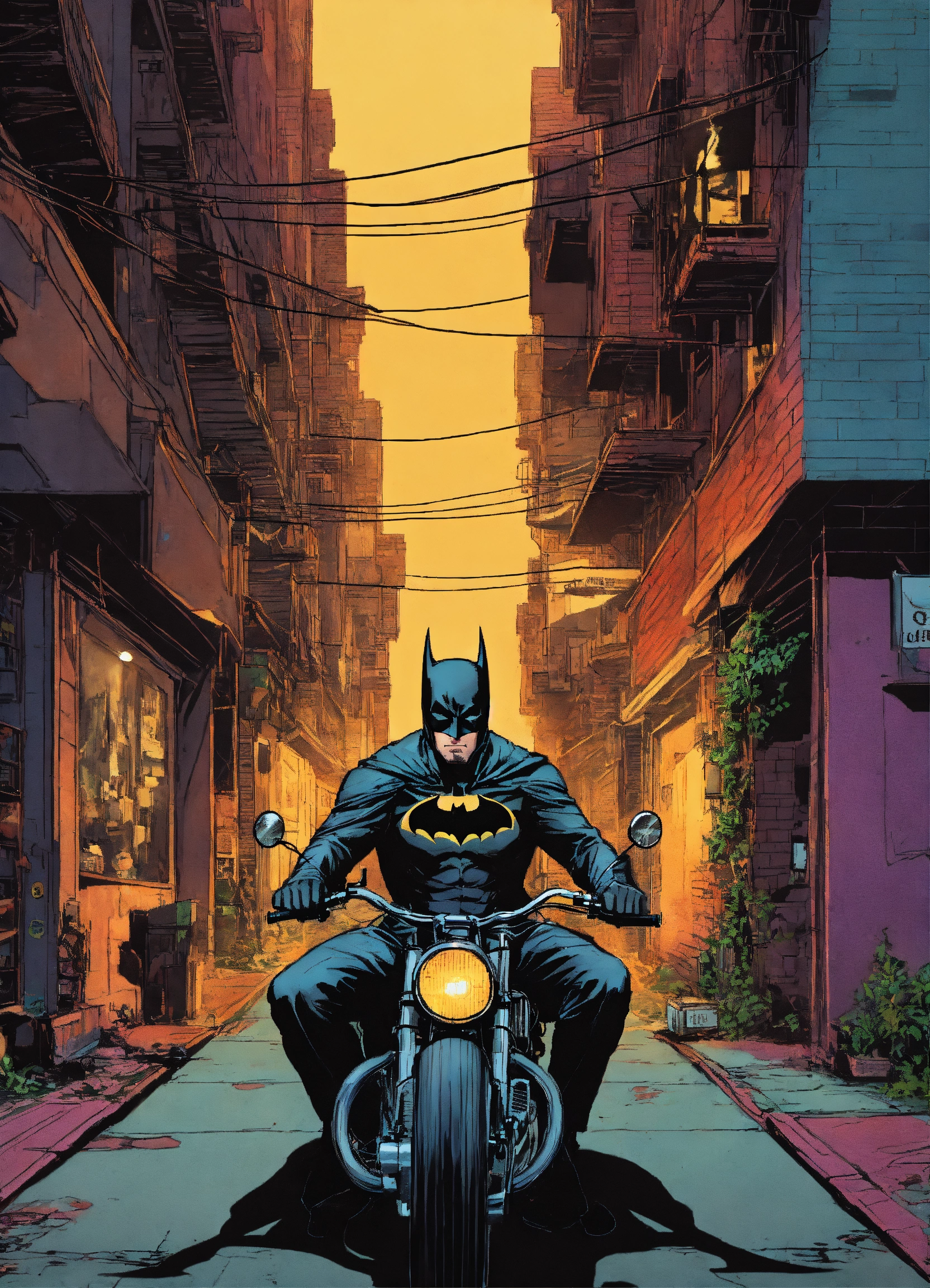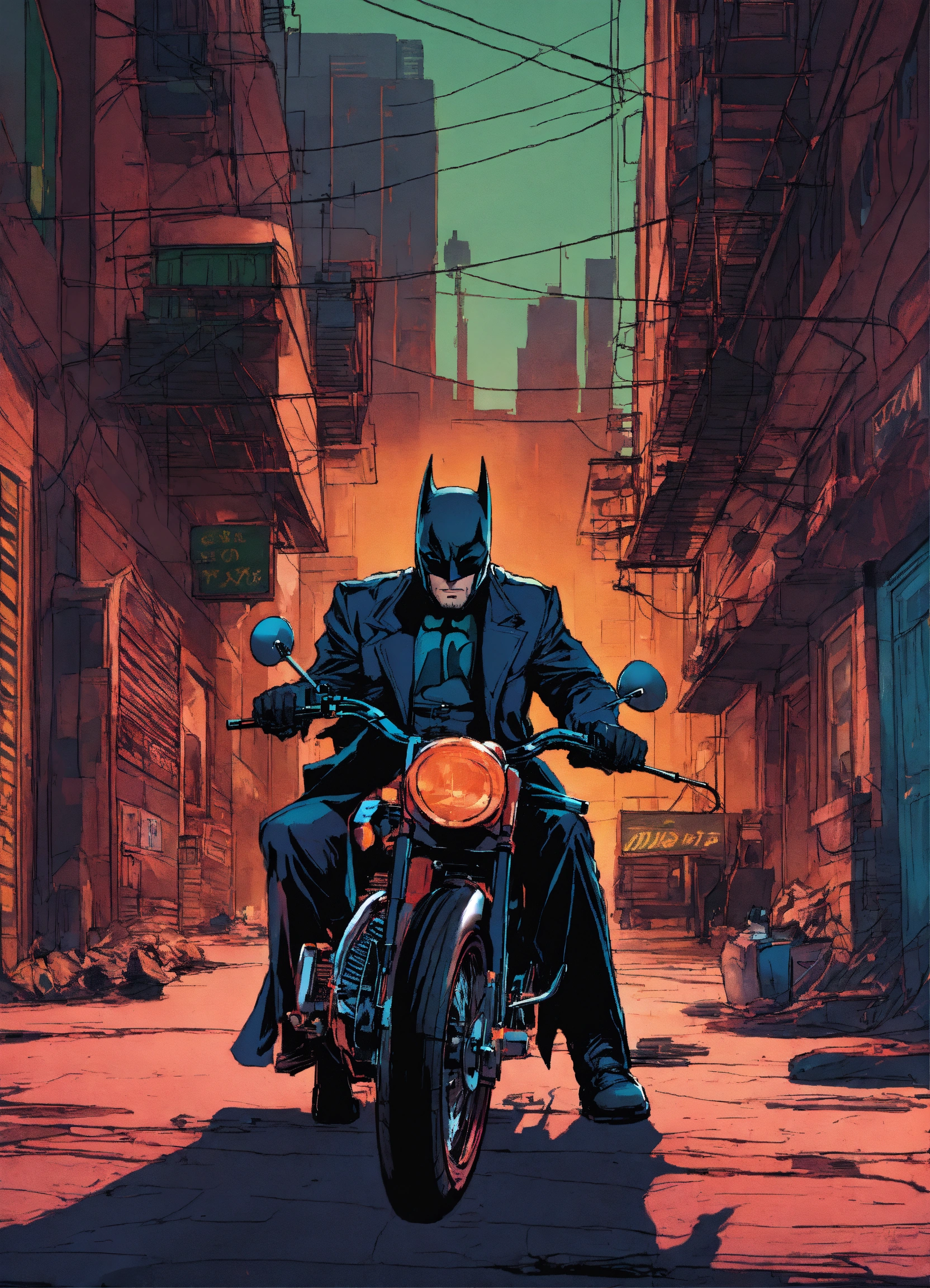 A neo-noir batman with his motorcycle alleyway
