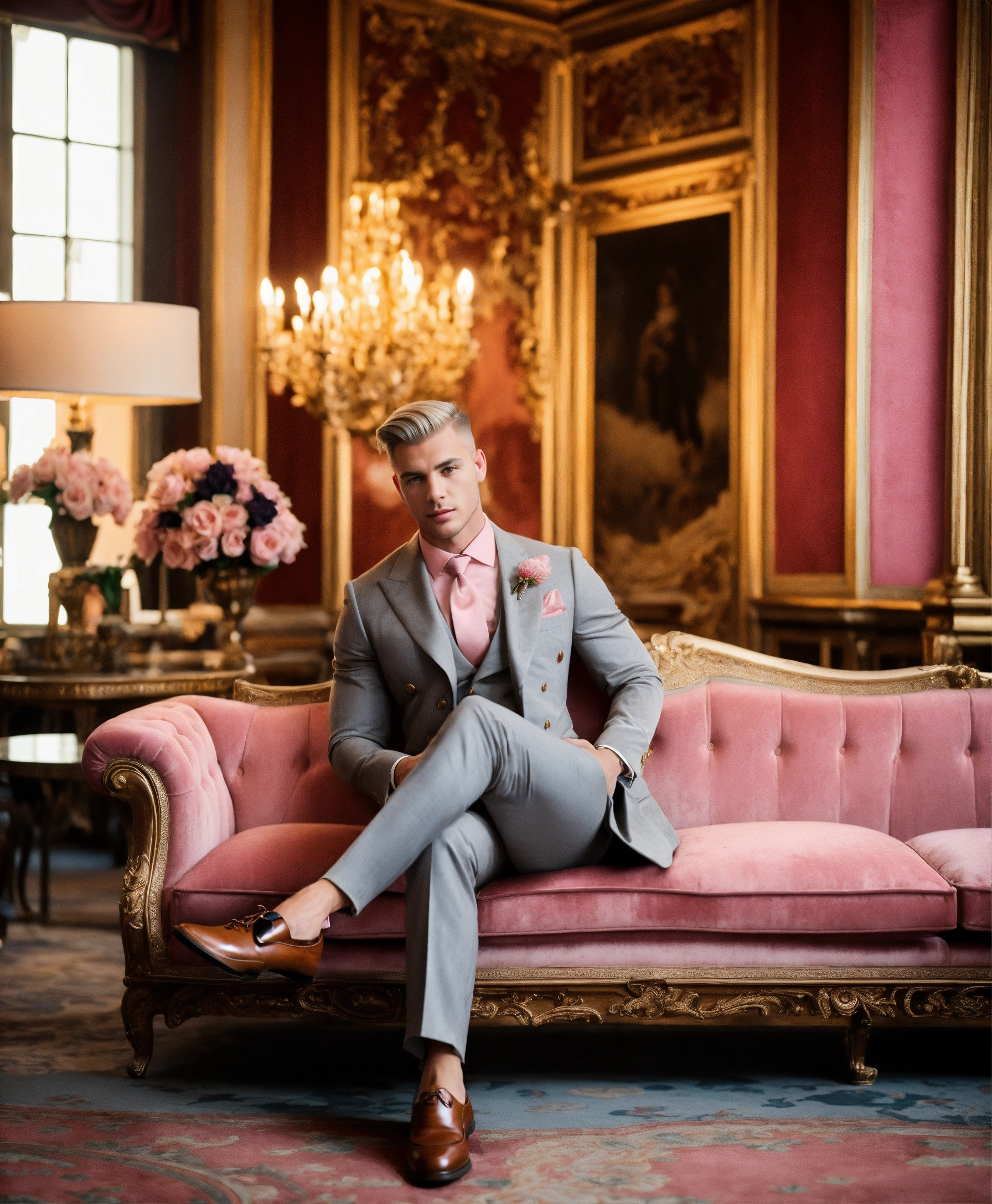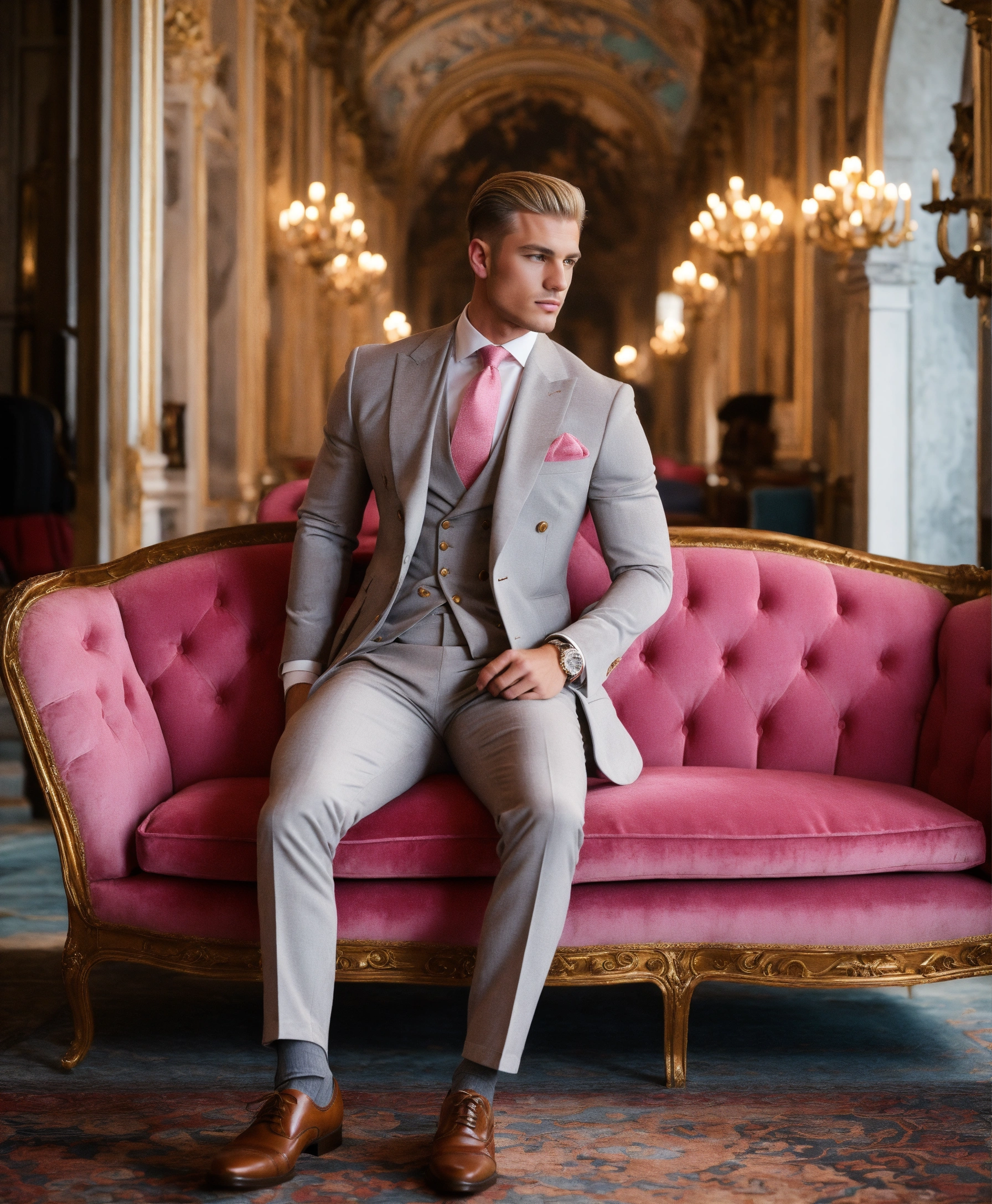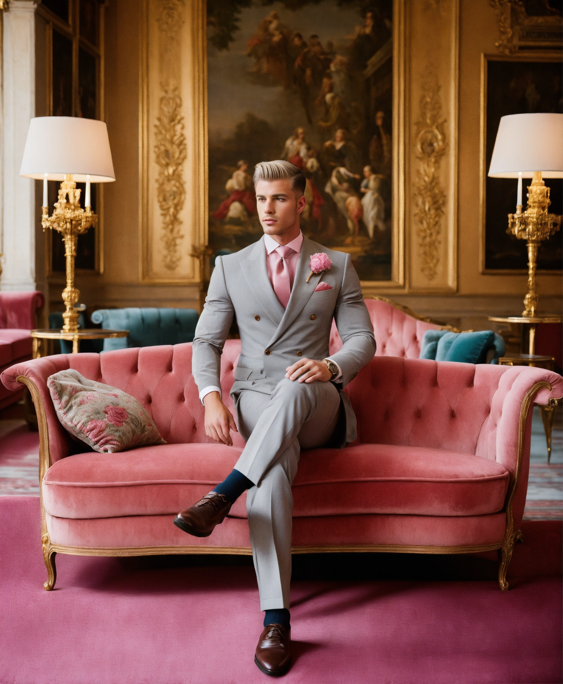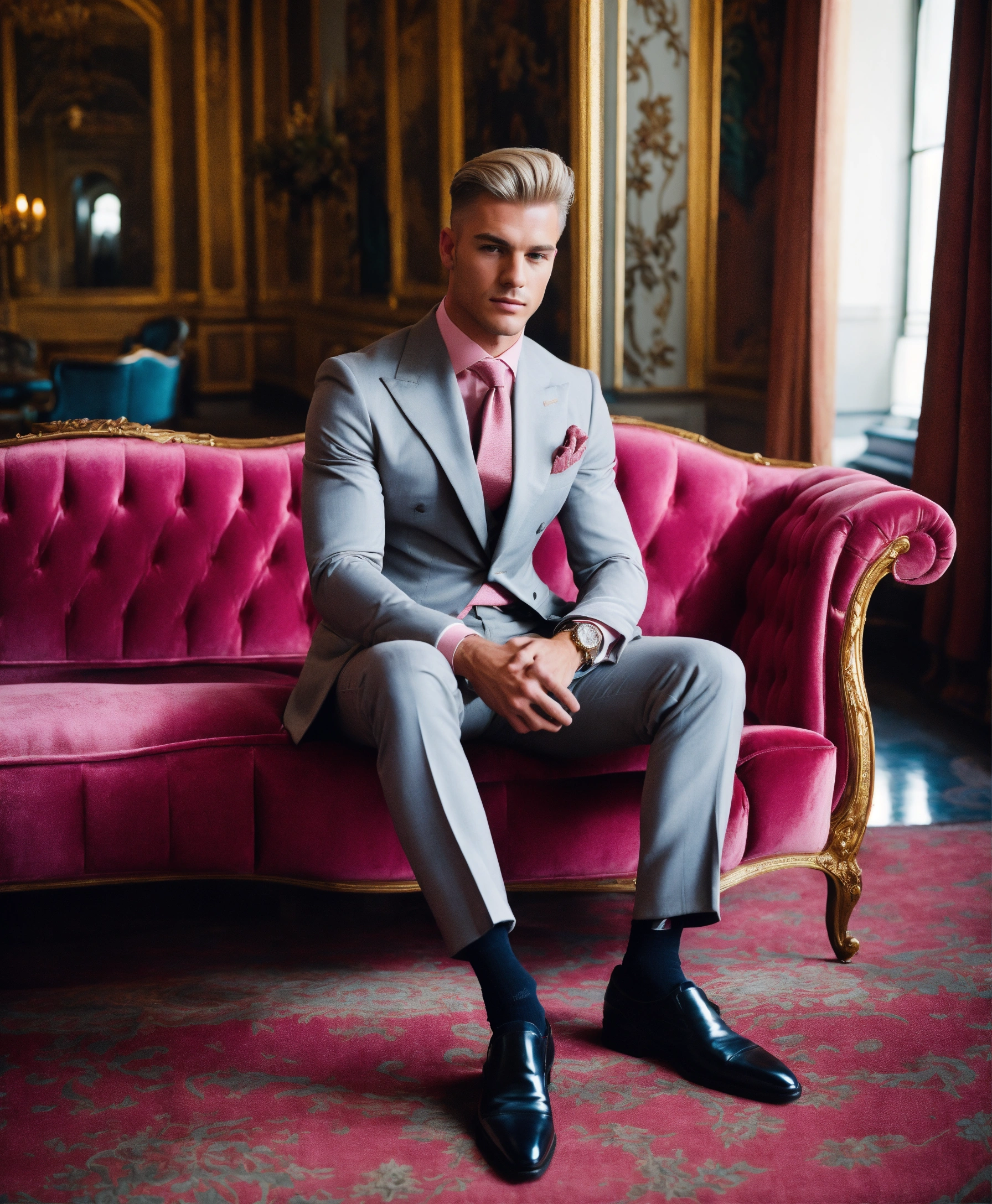 A blonde muscled gentleman, pompadour haircut, in light grey double breasted suit, club tie, light brown shoes, seating on a velvet pink sofa in a venetian palace