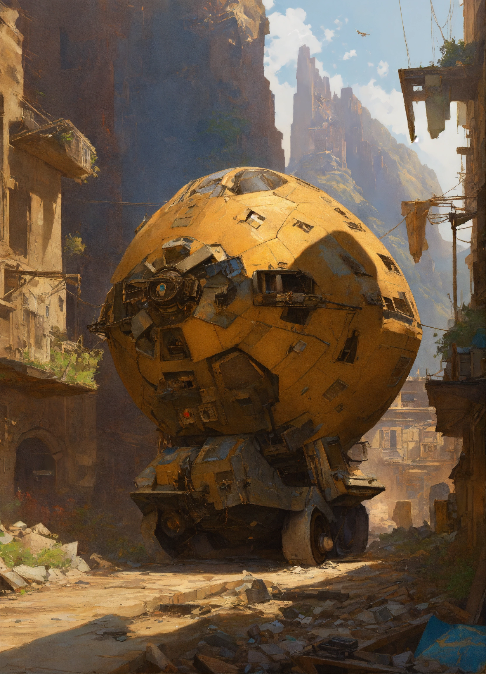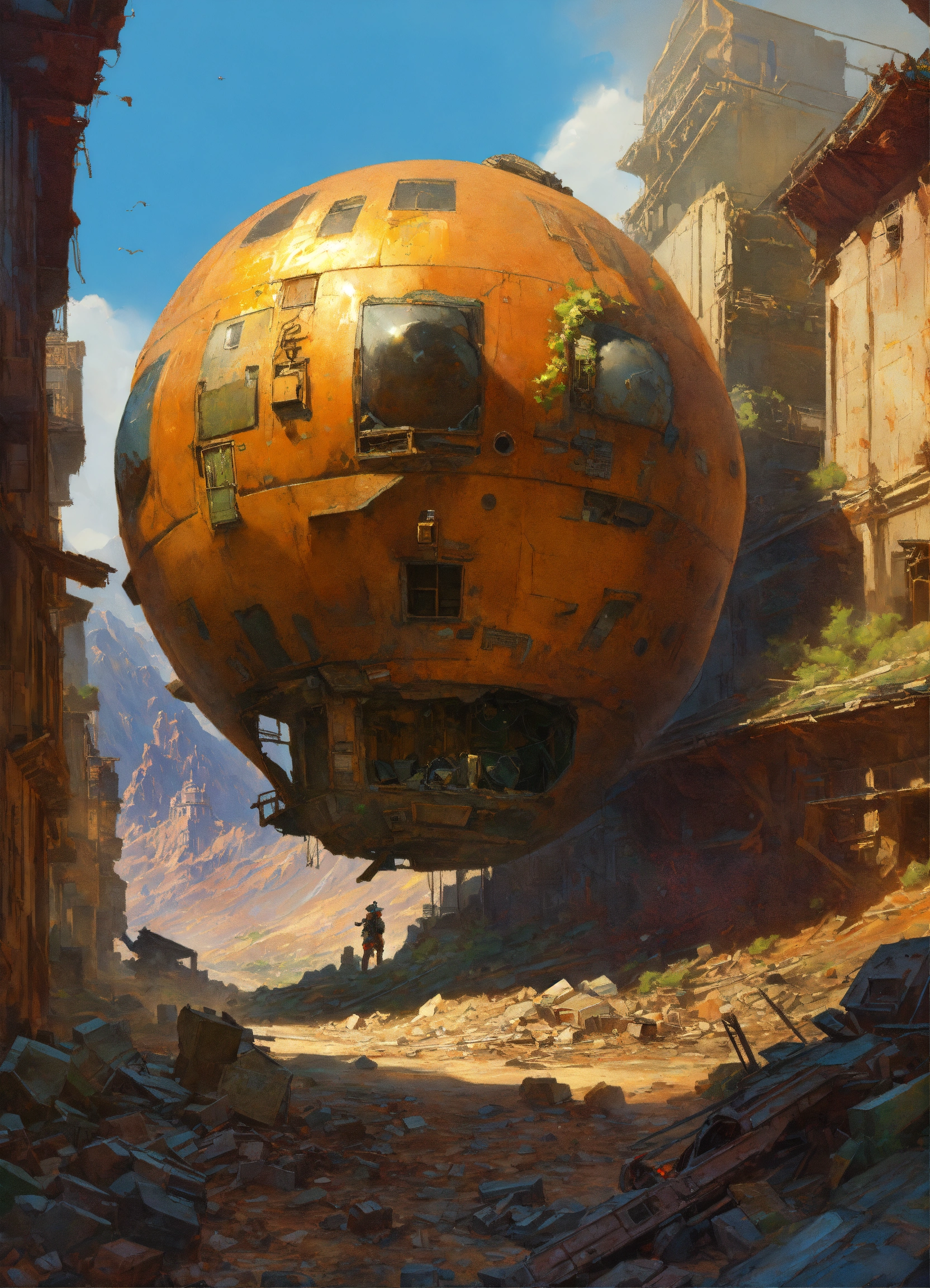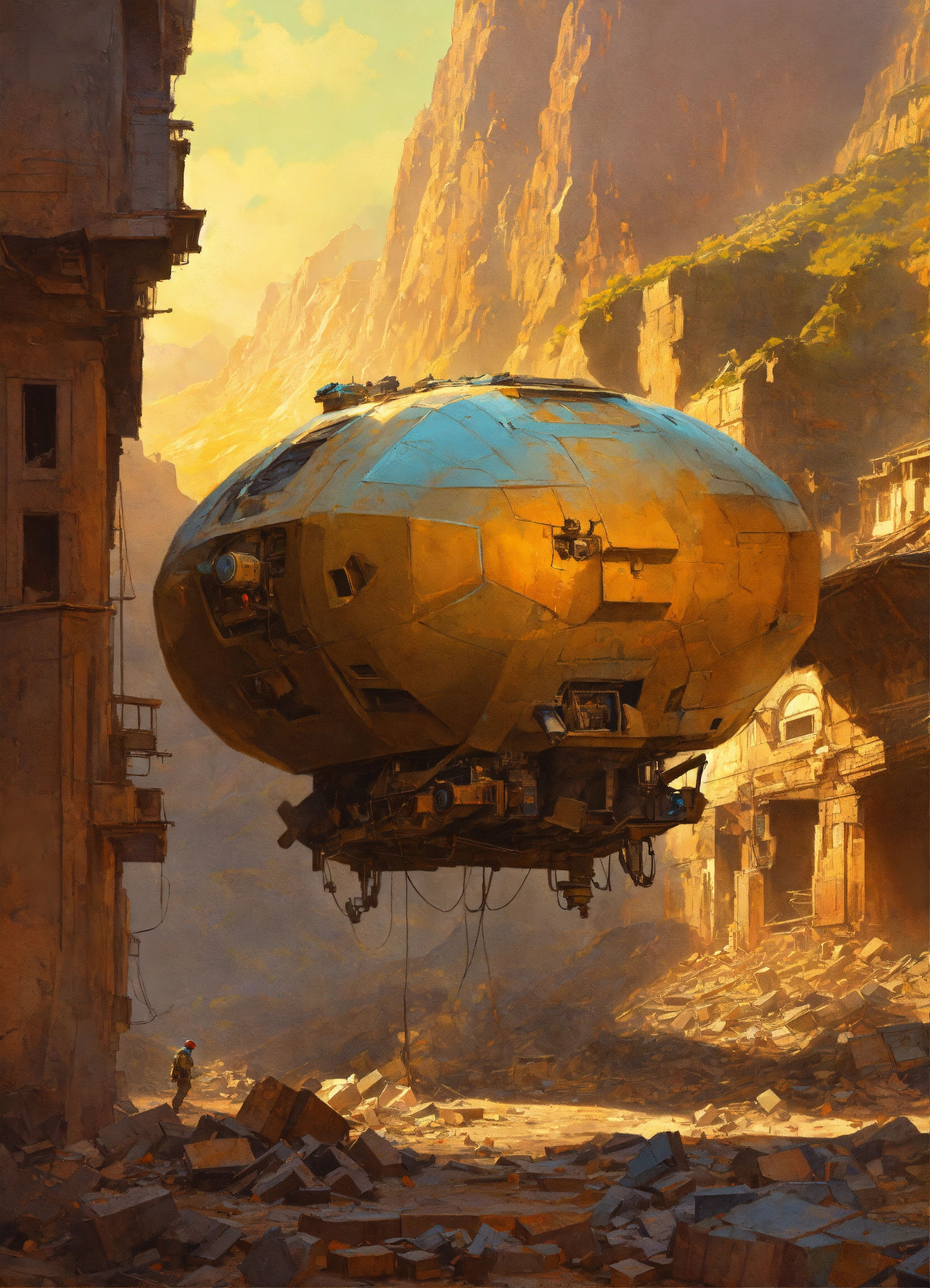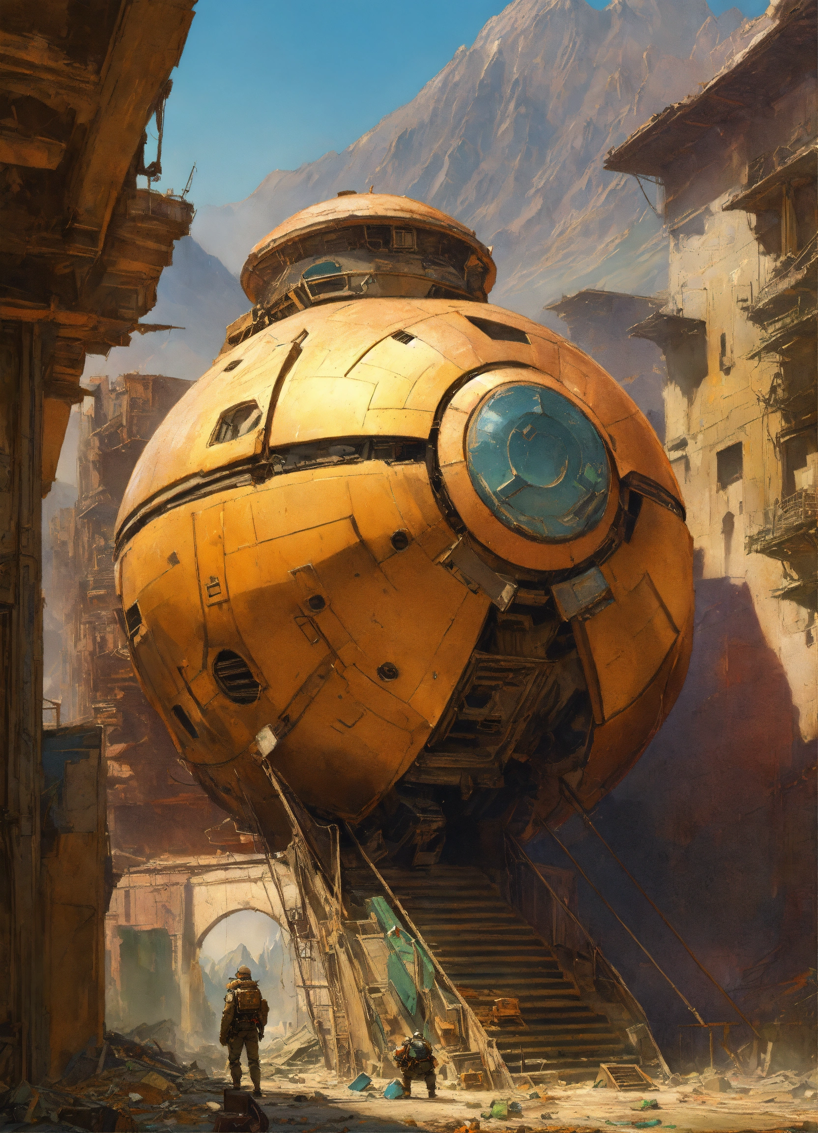Crushed small escape pod, among abandoned buildings and mountains, by gaston bussiere, craig mullins, j.c. leyendecker, high detail, digital painting, high resolution 8k, realistic style