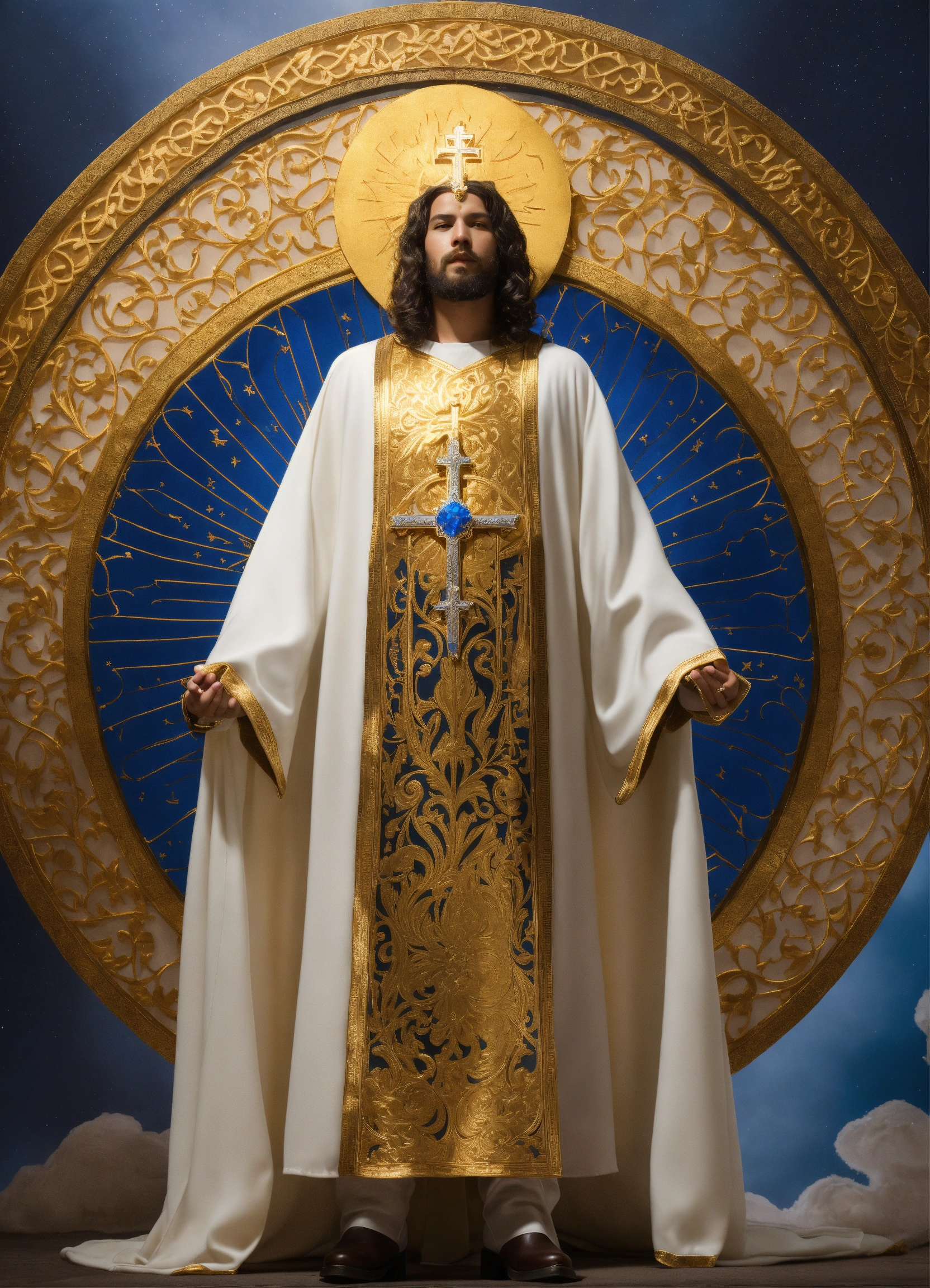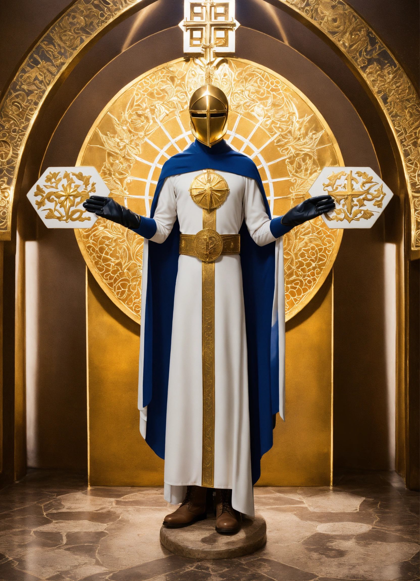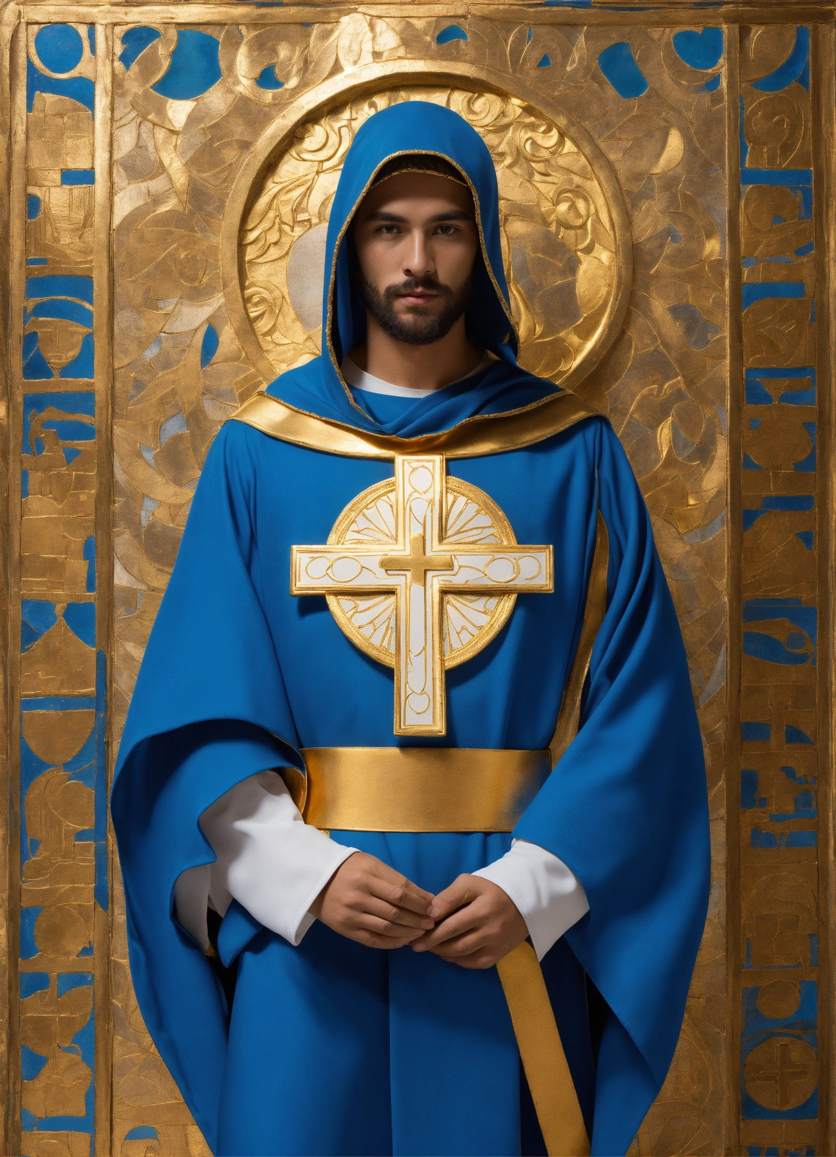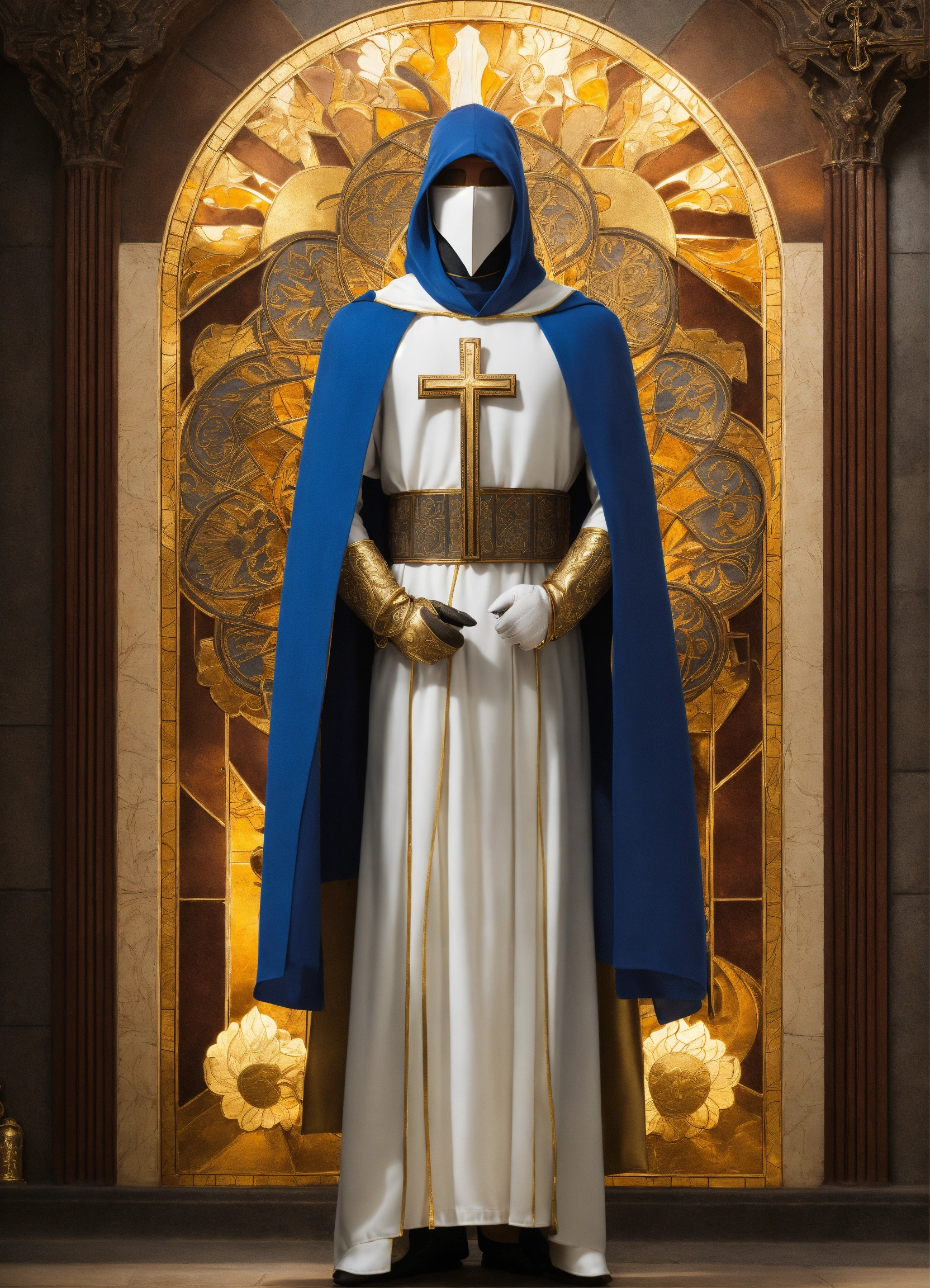 Create super hero costume mask the costume features a sleek, white mask that covers the upper half of luke's face. it symbolizes purity and the clarity of his mission. tunic the tunic is a deep blue, representing faith and depth of character. it is adorned with intricate golden patterns, reminiscent of stained glass windows found in cathedrals. cape a flowing white cape billows behind him, symbolizing the divine guidance and protection he offers to those in need. gloves white gloves with golden cuffs provide a touch of elegance and grace to his ensemble. boots knee-high, sturdy boots allow for agility and stability during his missions. belt a golden belt cinches the tunic, bearing a cross-shaped buckle as a reminder of his unwavering faith. symbol the costume features a unique emblem on the chest—a radiant sun encircled by a stylized pair of praying hands. this emblem represents the light of faith and the power of intercession. accessories pendant around neck of a crucifix