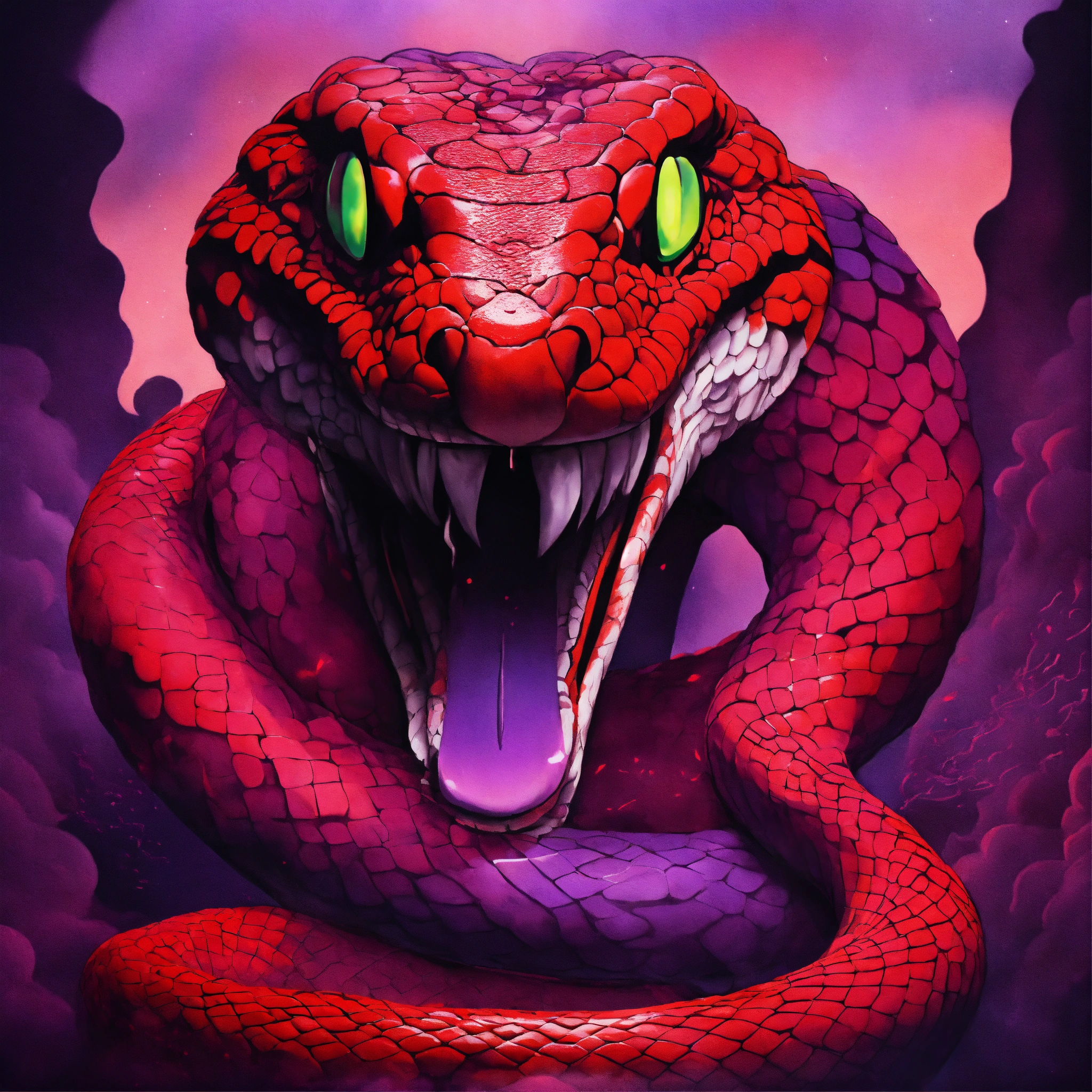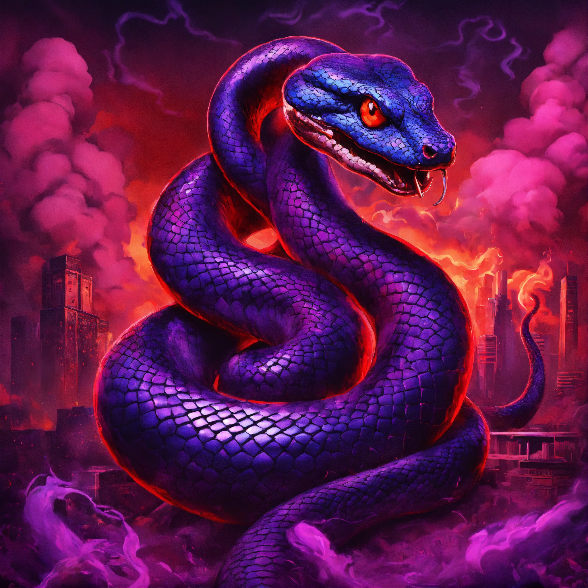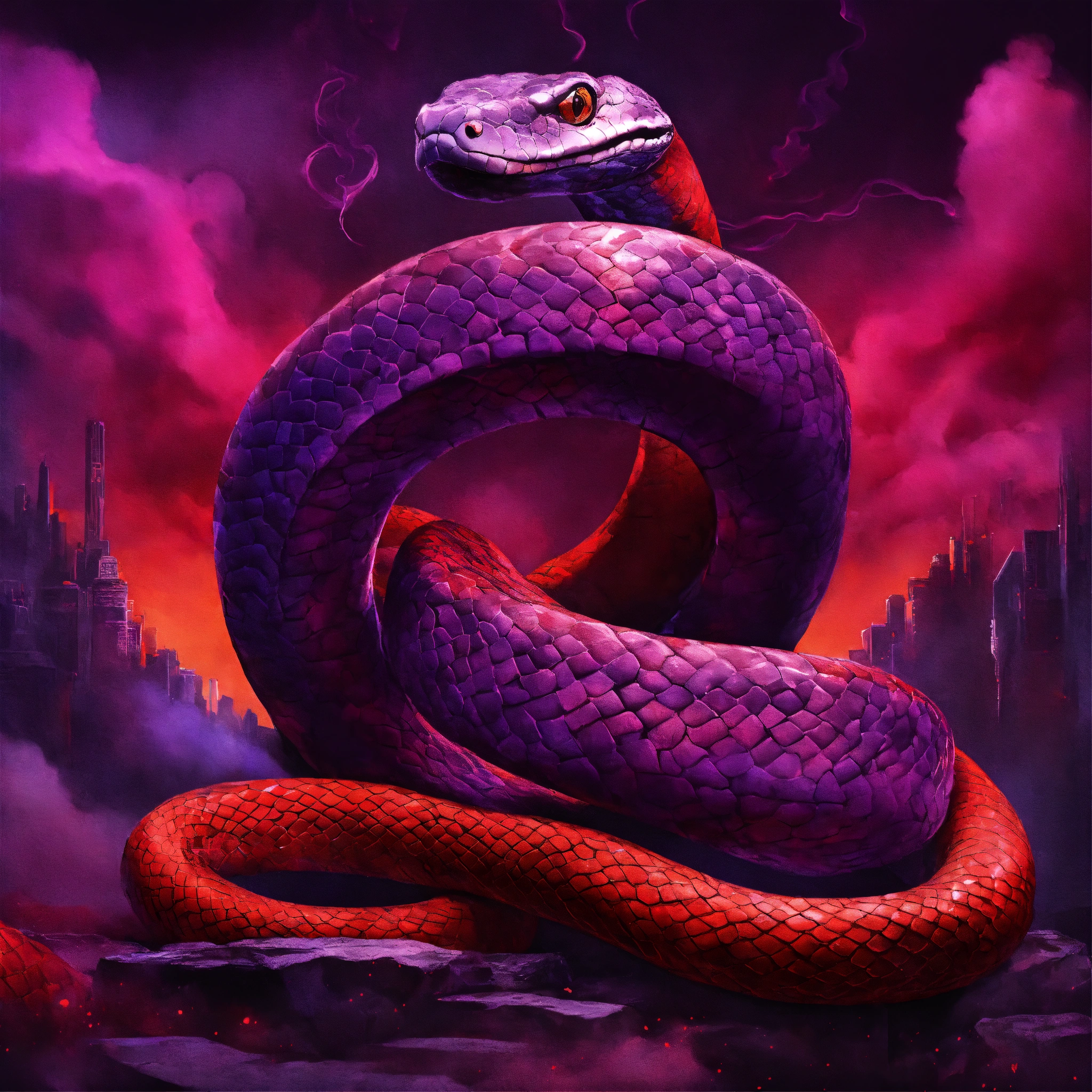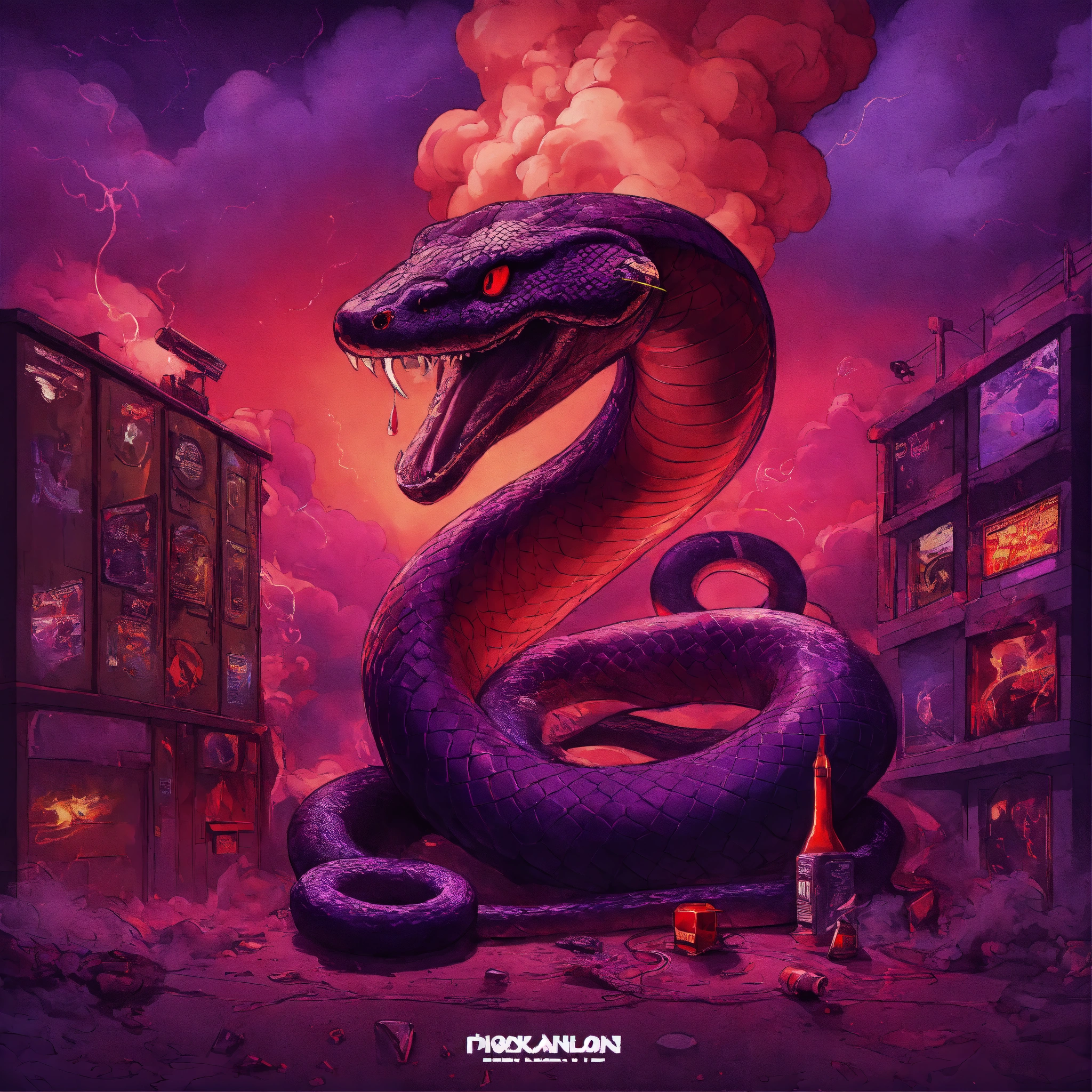 Album cover art, dark colors, dominant purple, red smoke in the background, metallic texture, hip hop, toons, snake.