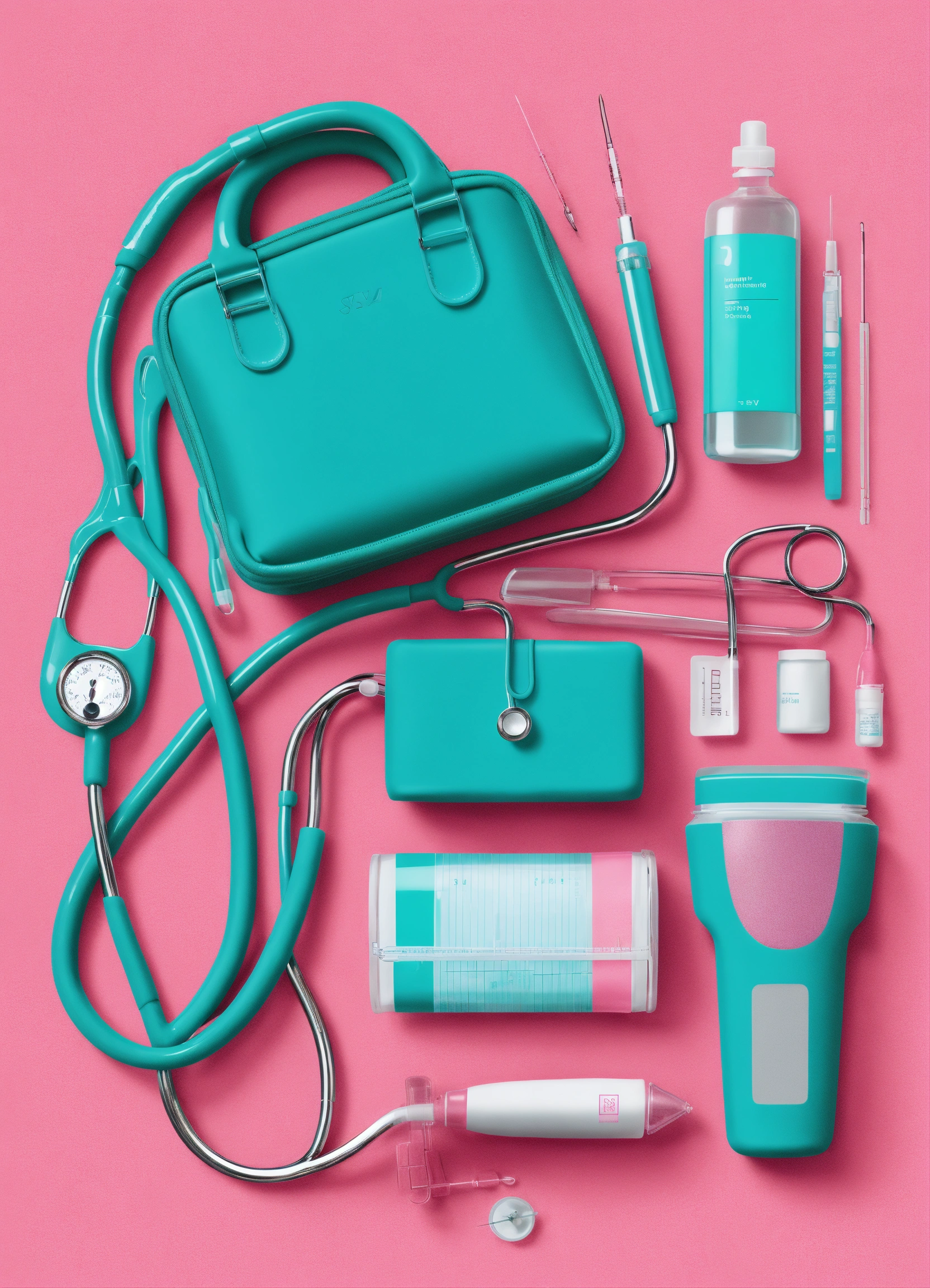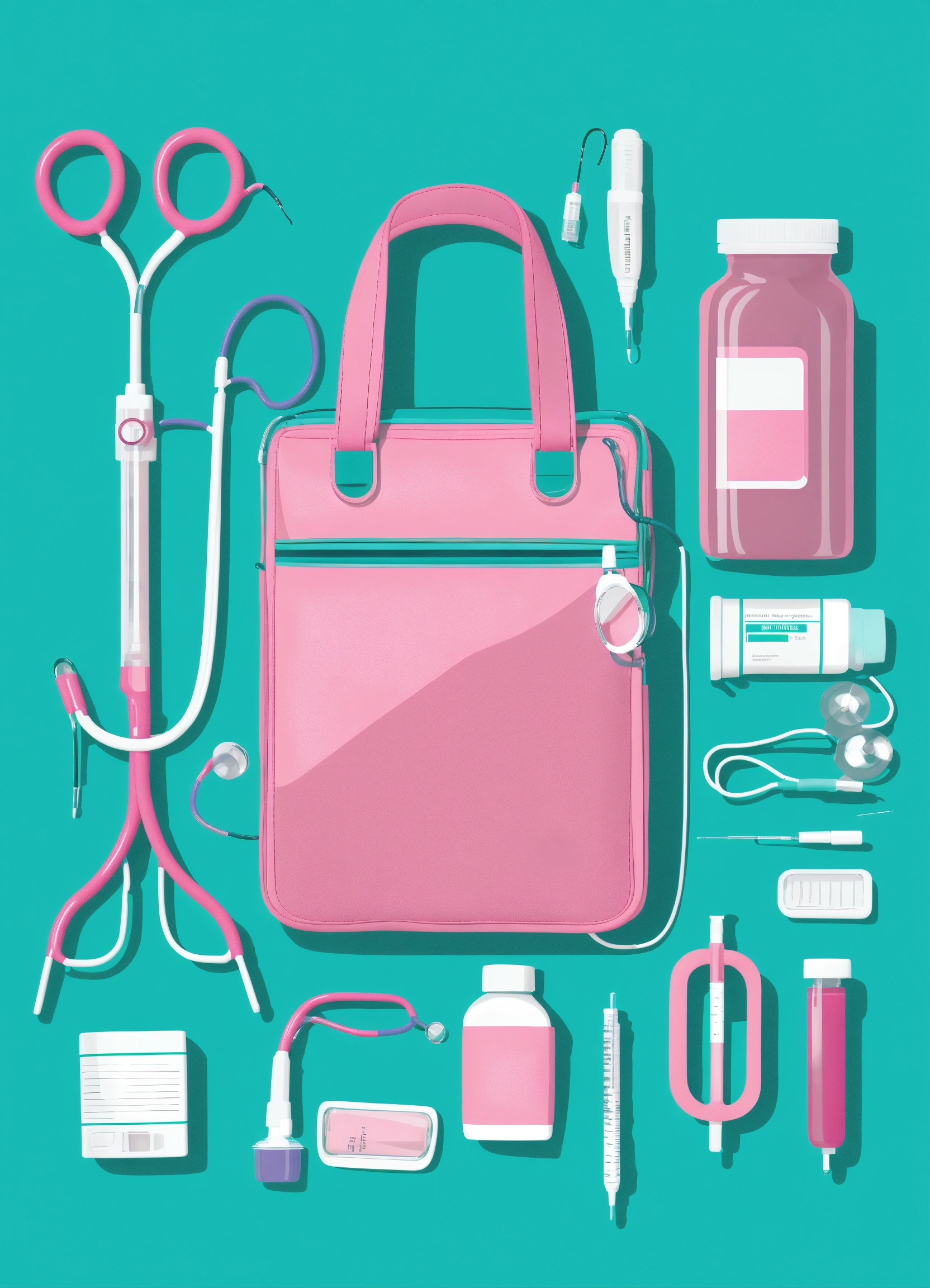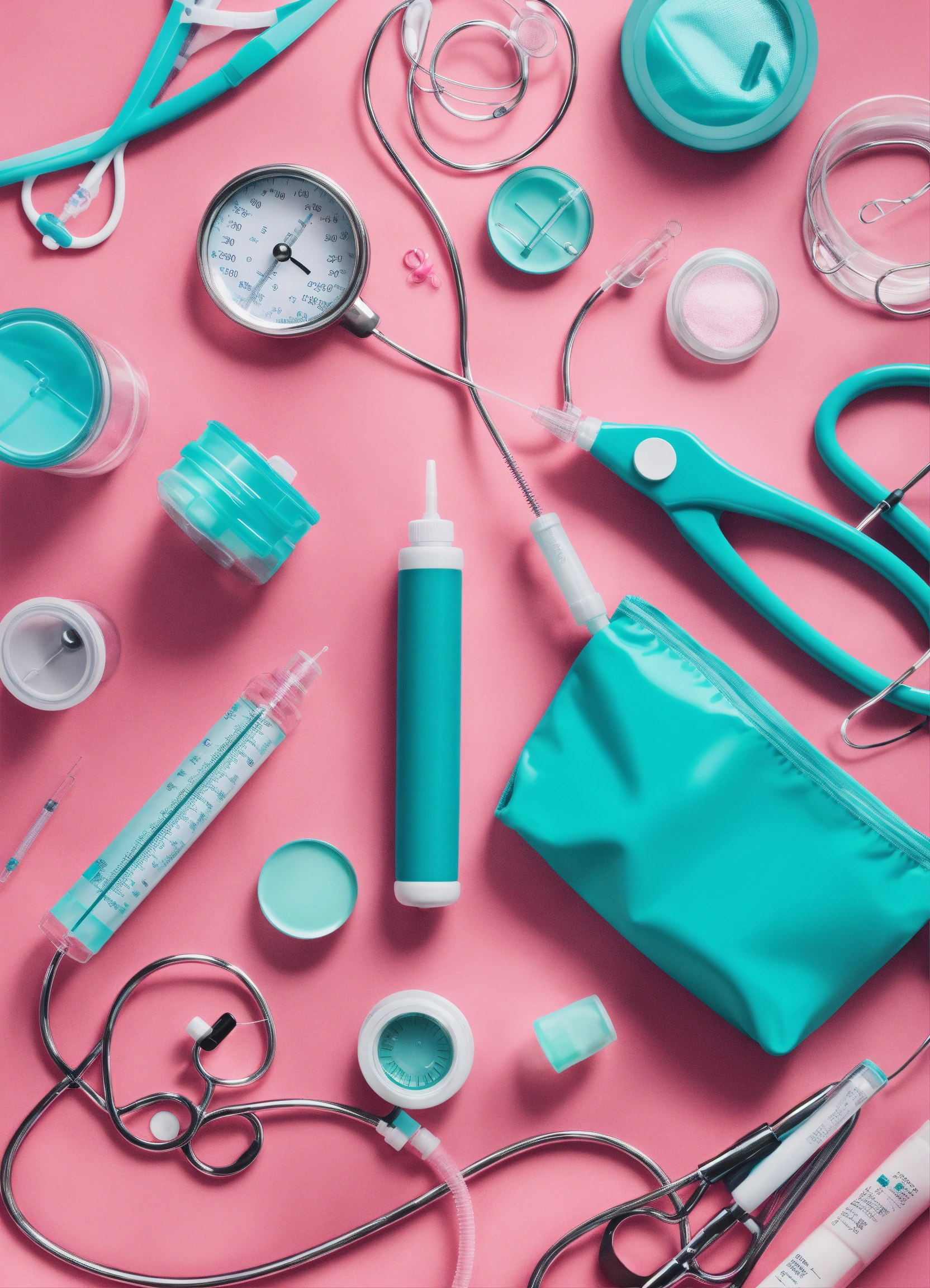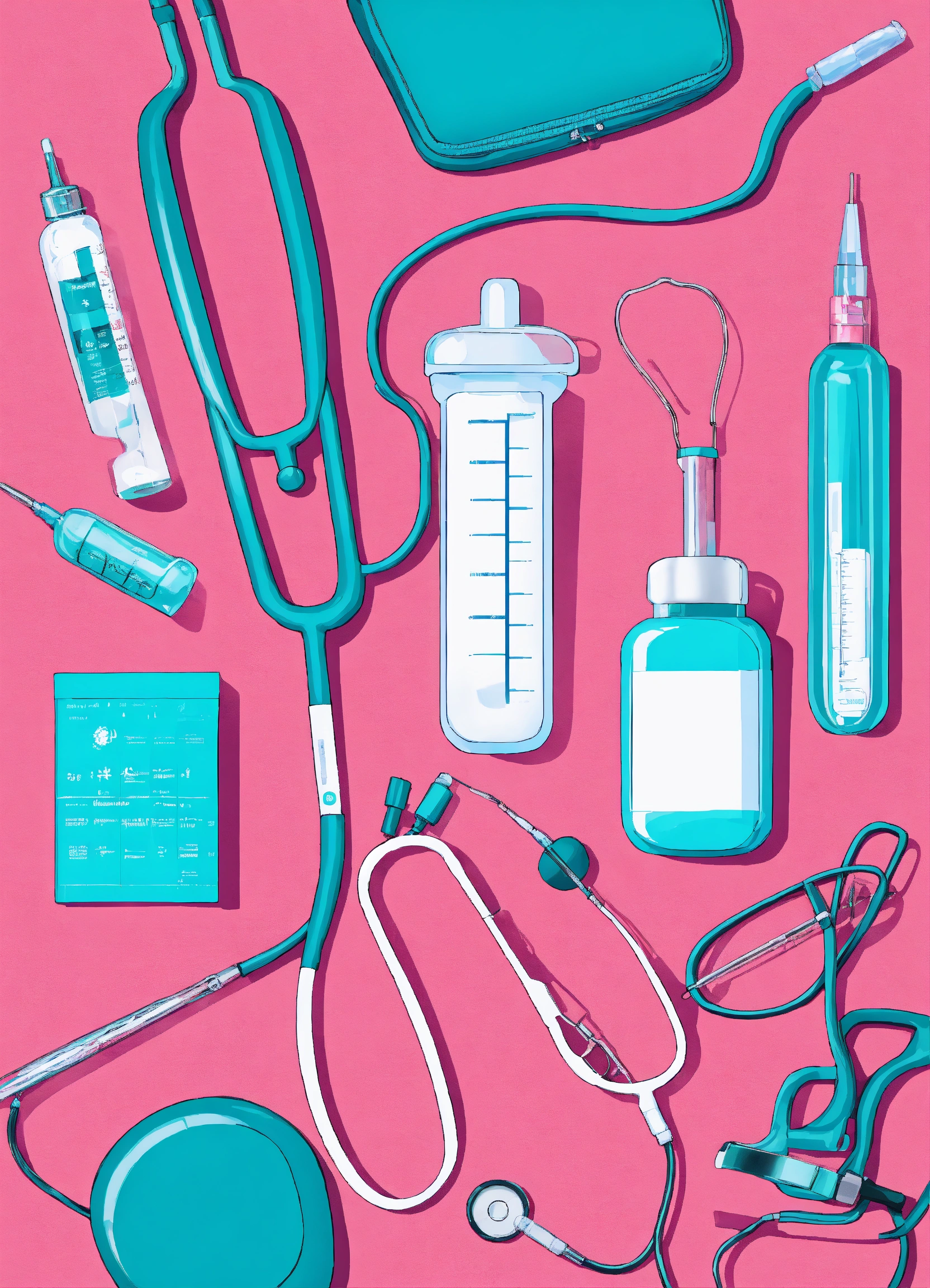 Digital illustration, pink and turquoise, with minimalistic stethoscope, scalpel, iv bag, needle, syringe, nursing supplies.