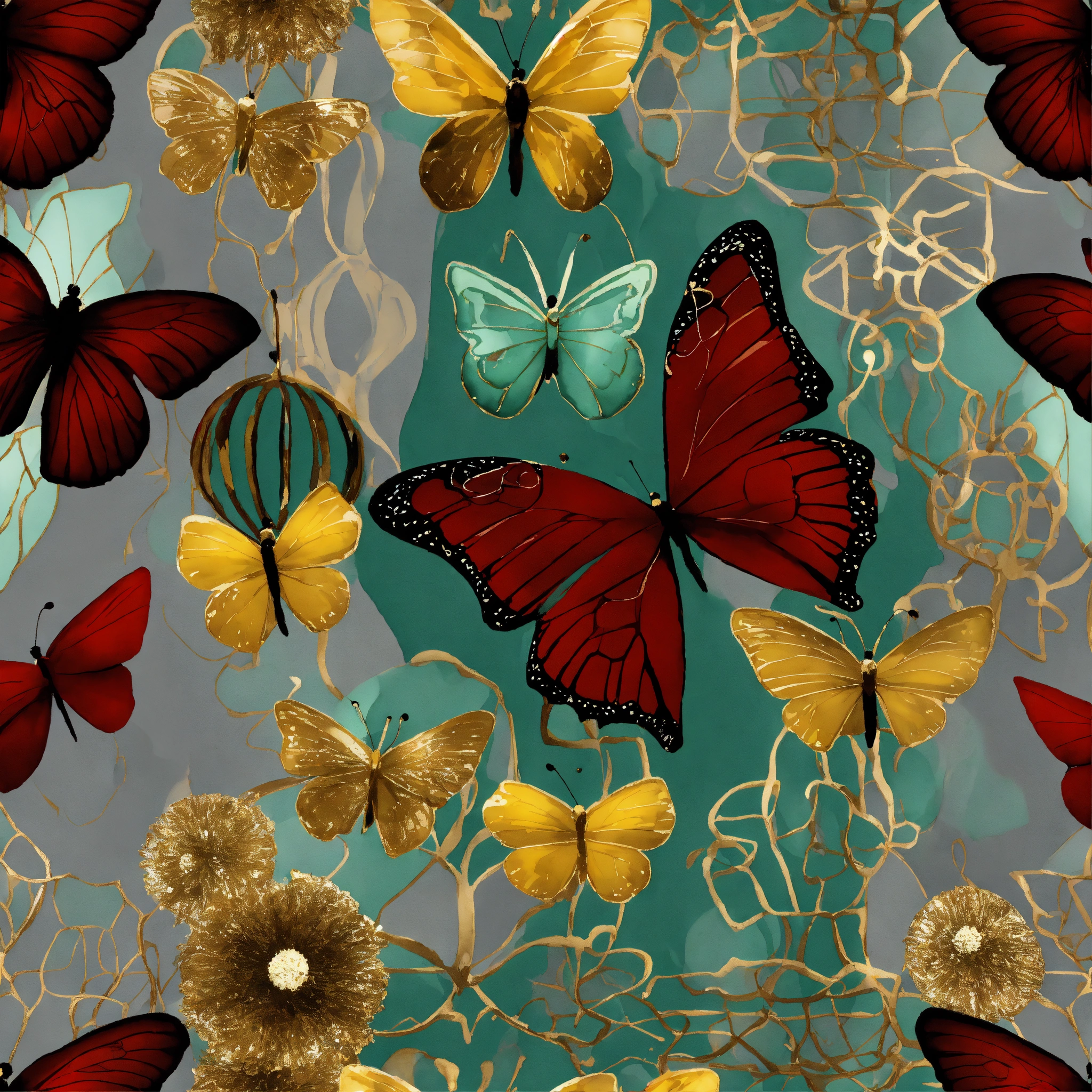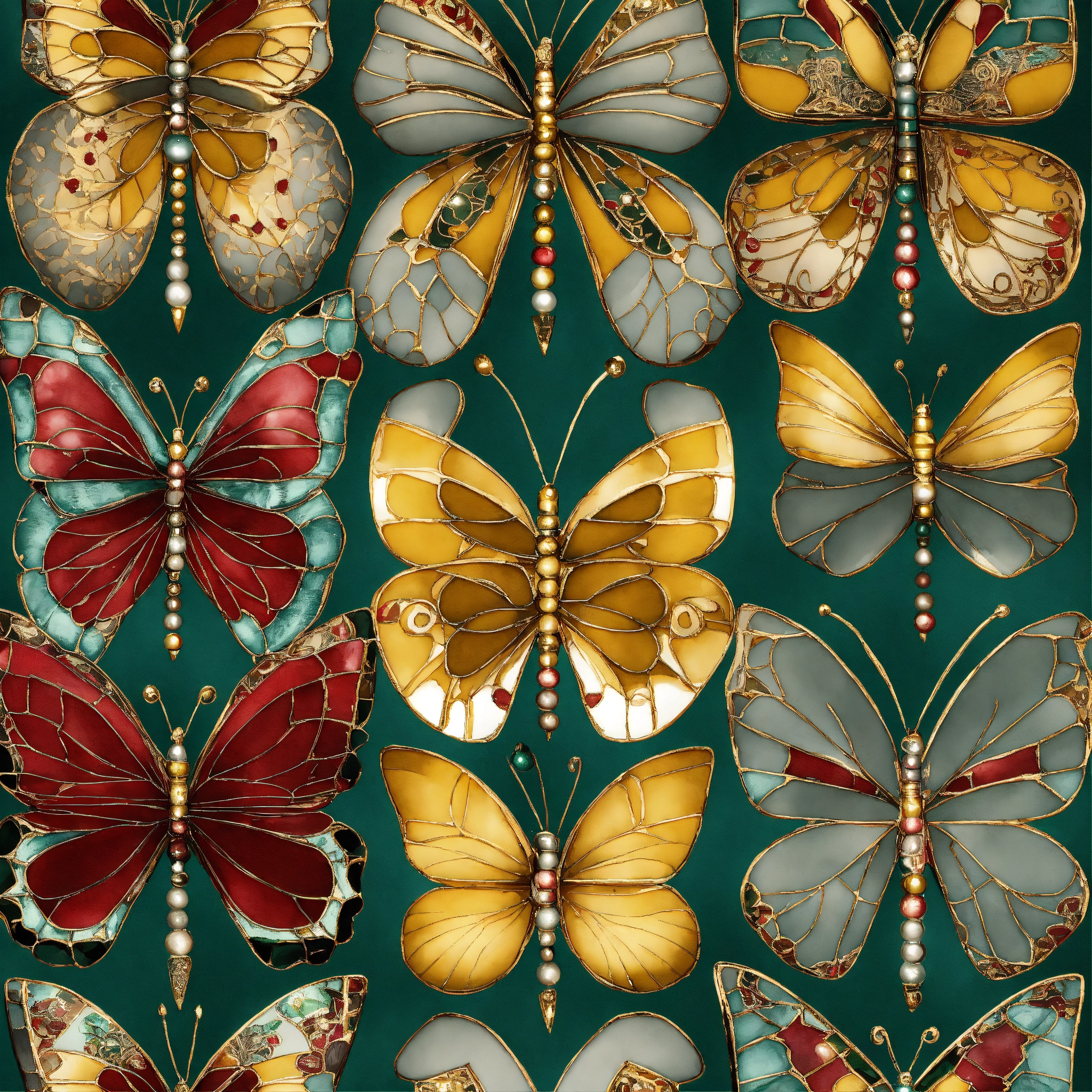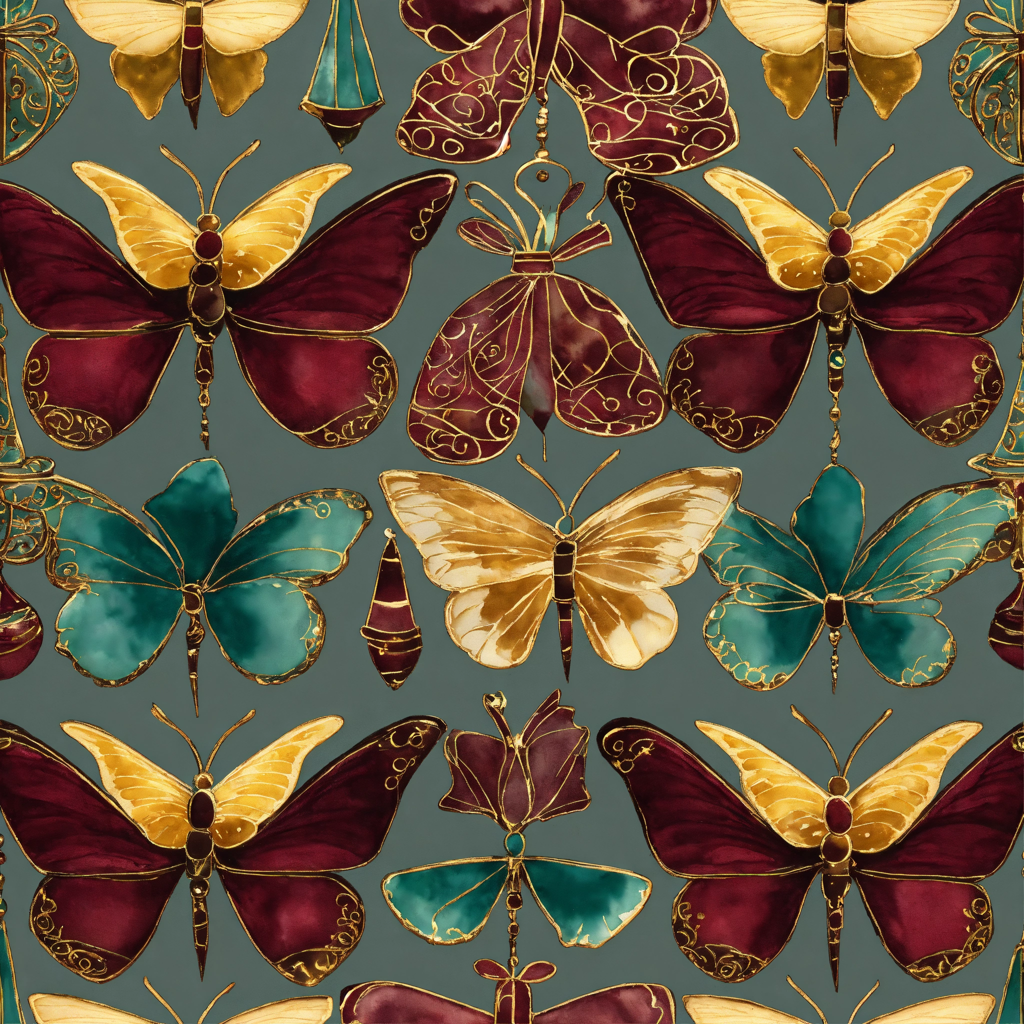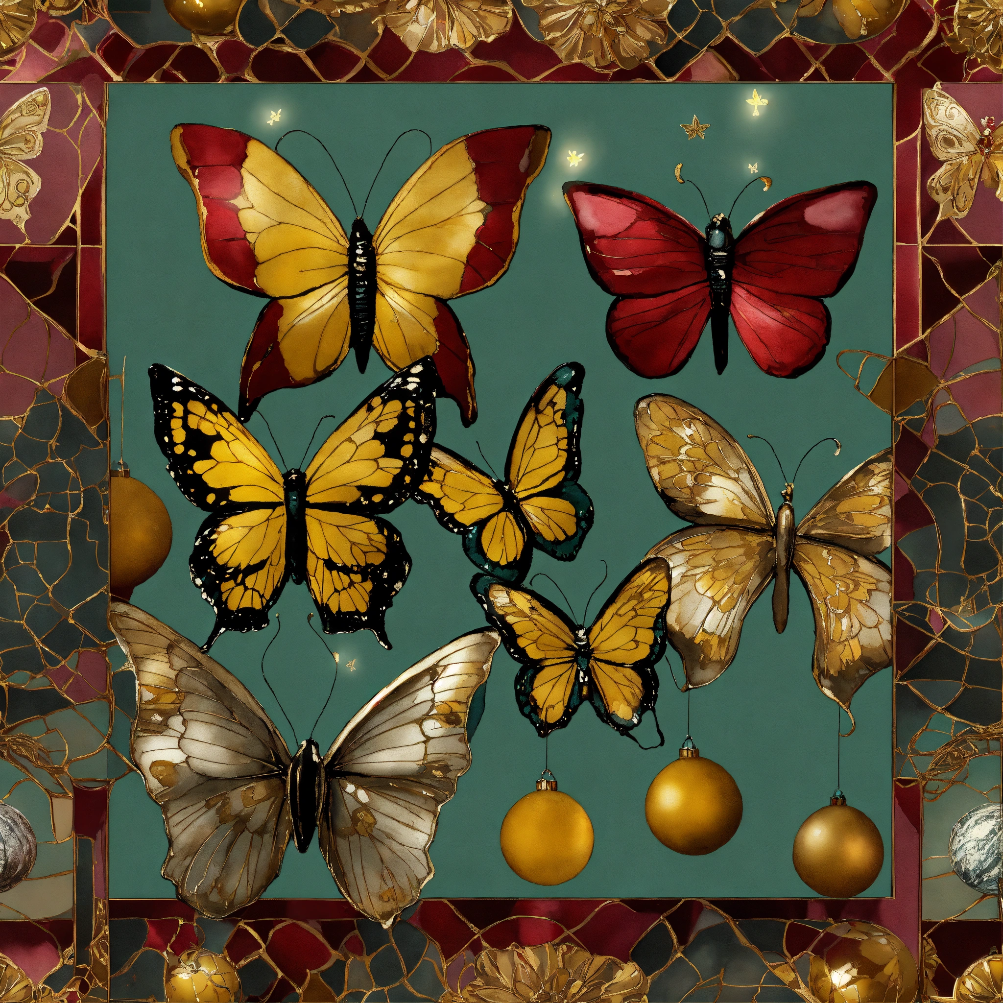 Seamless repeating pattern; afrocentric christmas butterflies, vintage christmas ornaments, christmas trees, water globes, filigree, stain glass, grey, mustard, burgundy, verdigris color palette. art deco. porcelain sculptures, watercolor