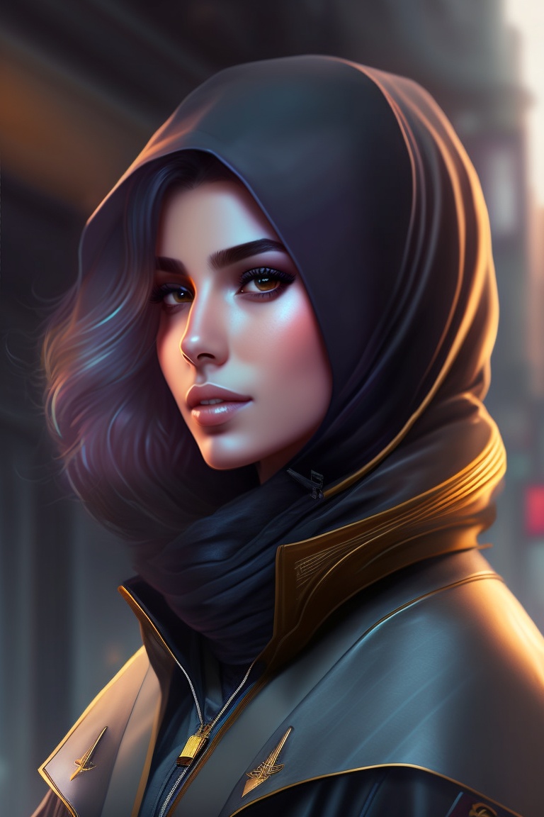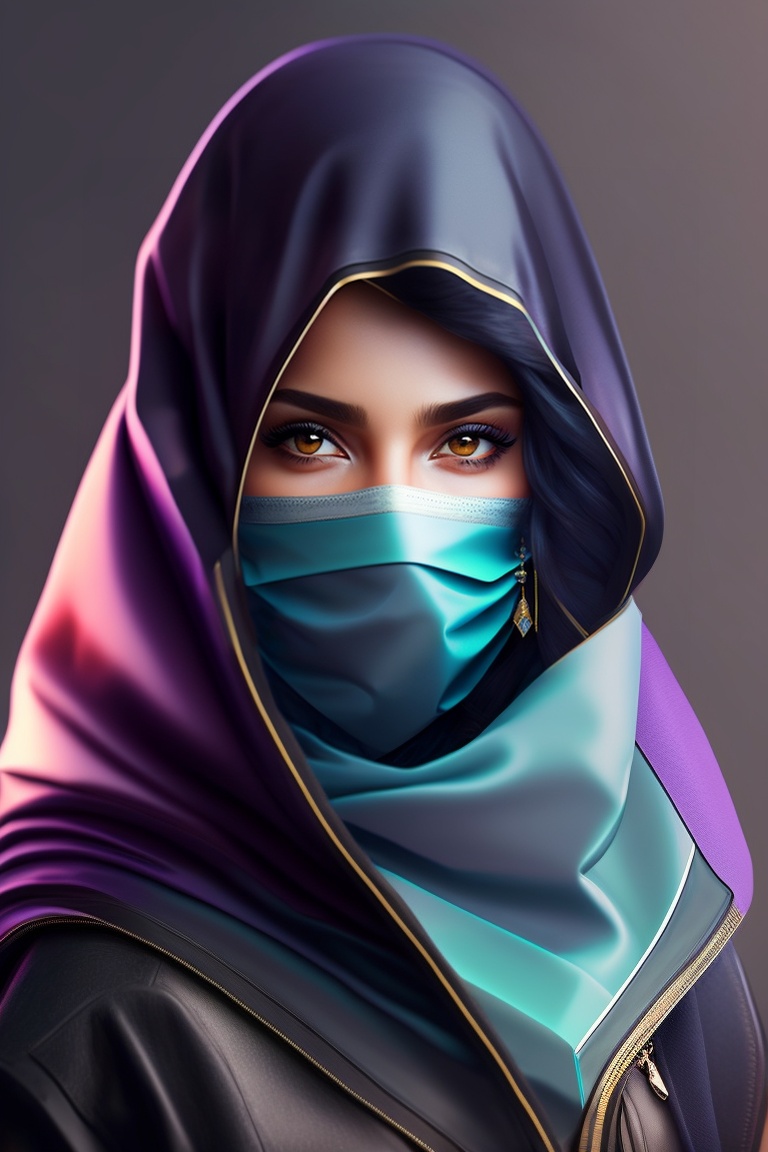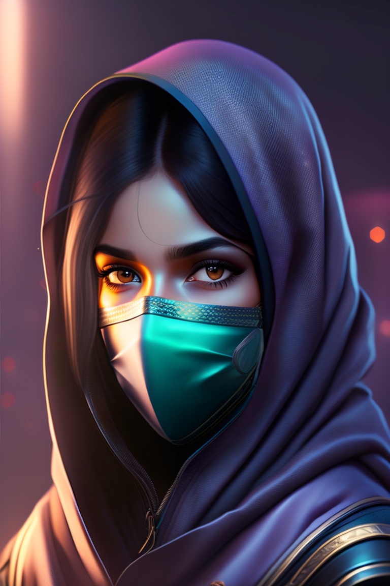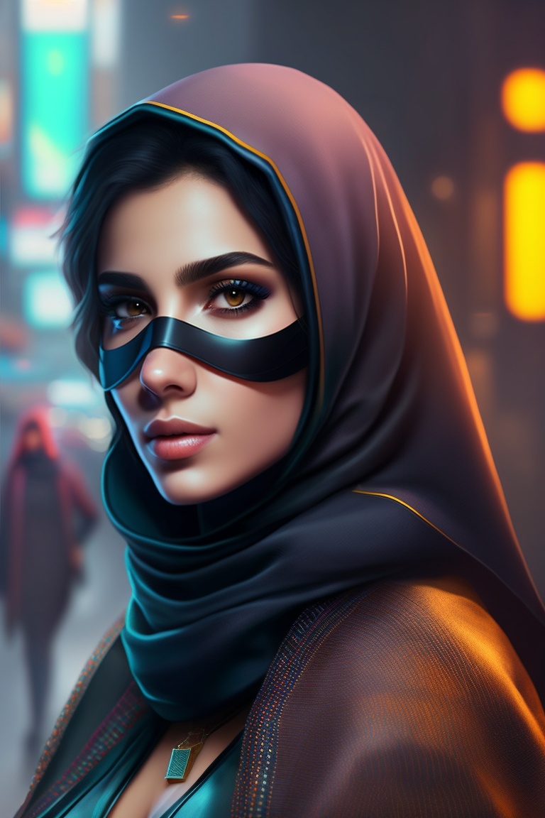 Cyberpunk. a young arab dark-haired female doctor, with a half-covered face, wrapped in a niqab. magic.