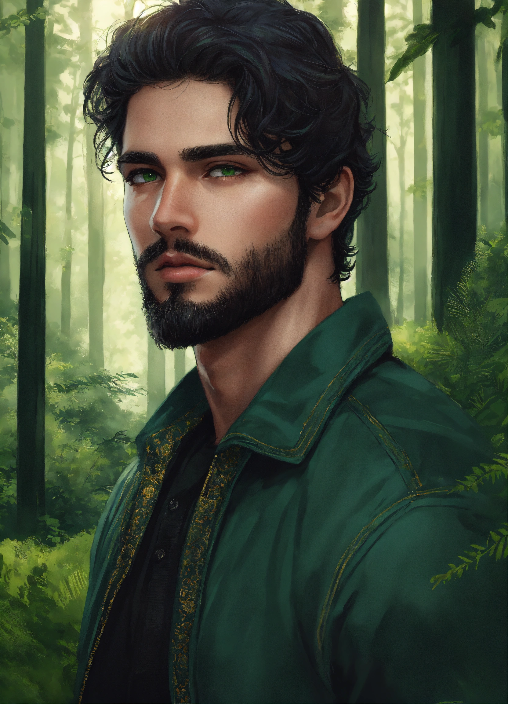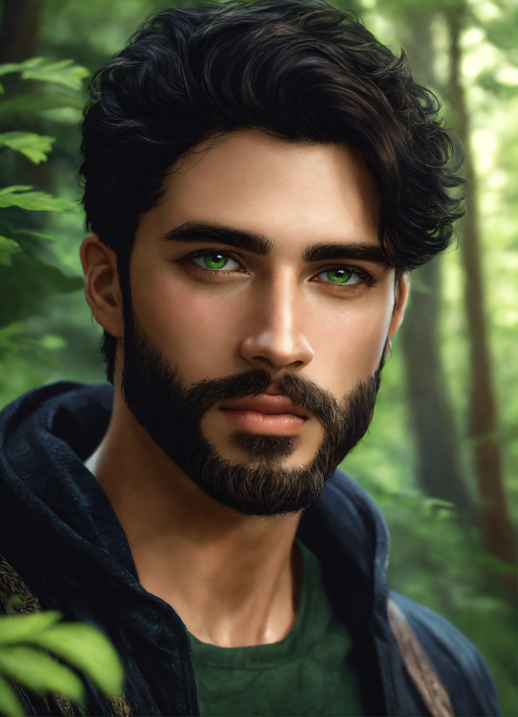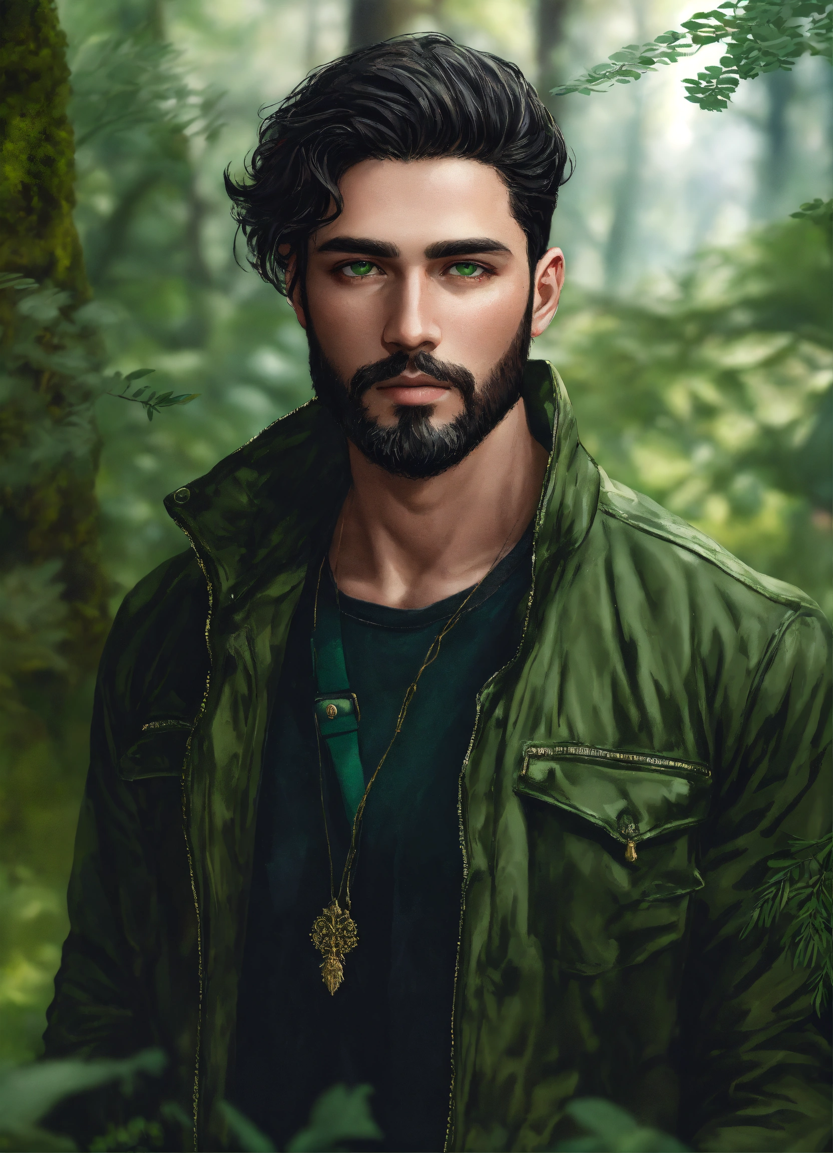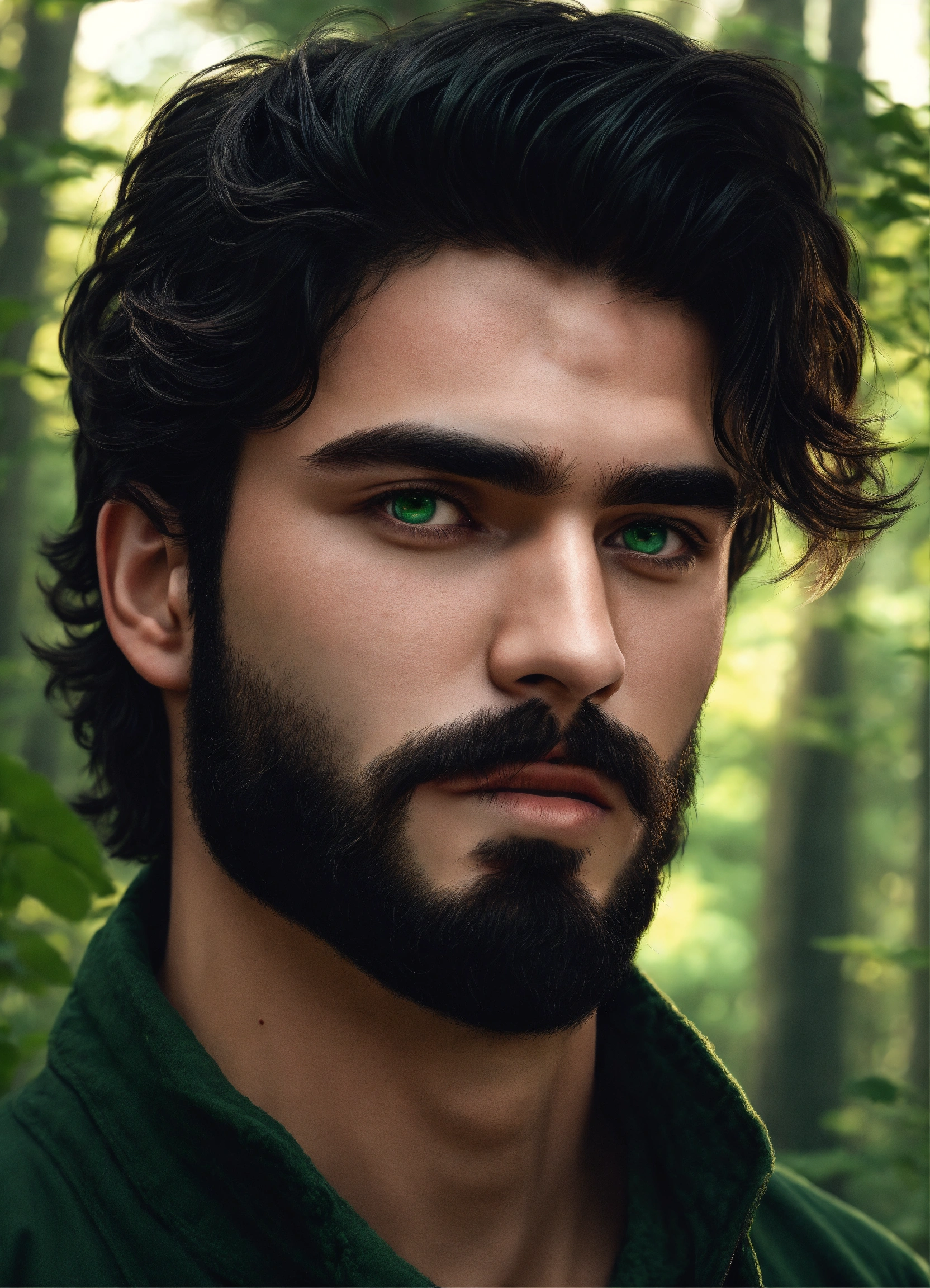 Beautiful photorealistic illustration, intricate details, forest in the background. black hair. green eyes. attractive. beard. black clothes. k.j. apa. 25 years old.