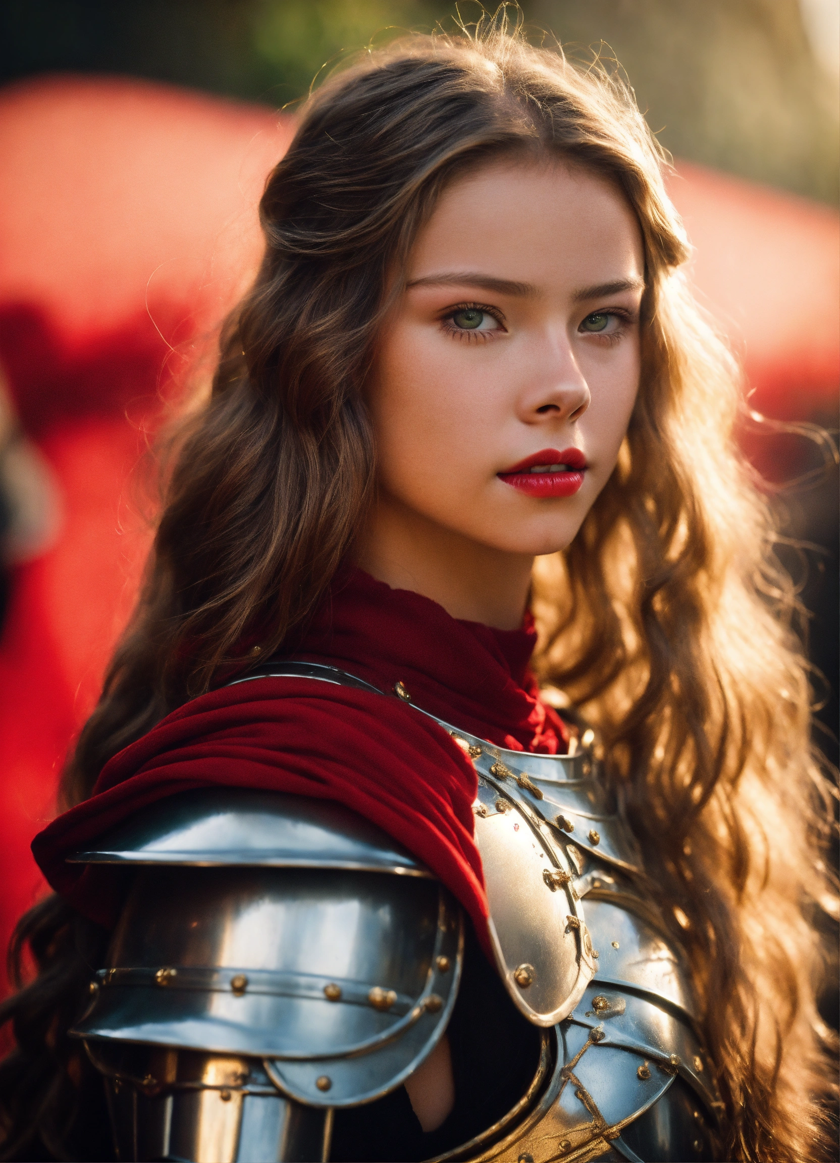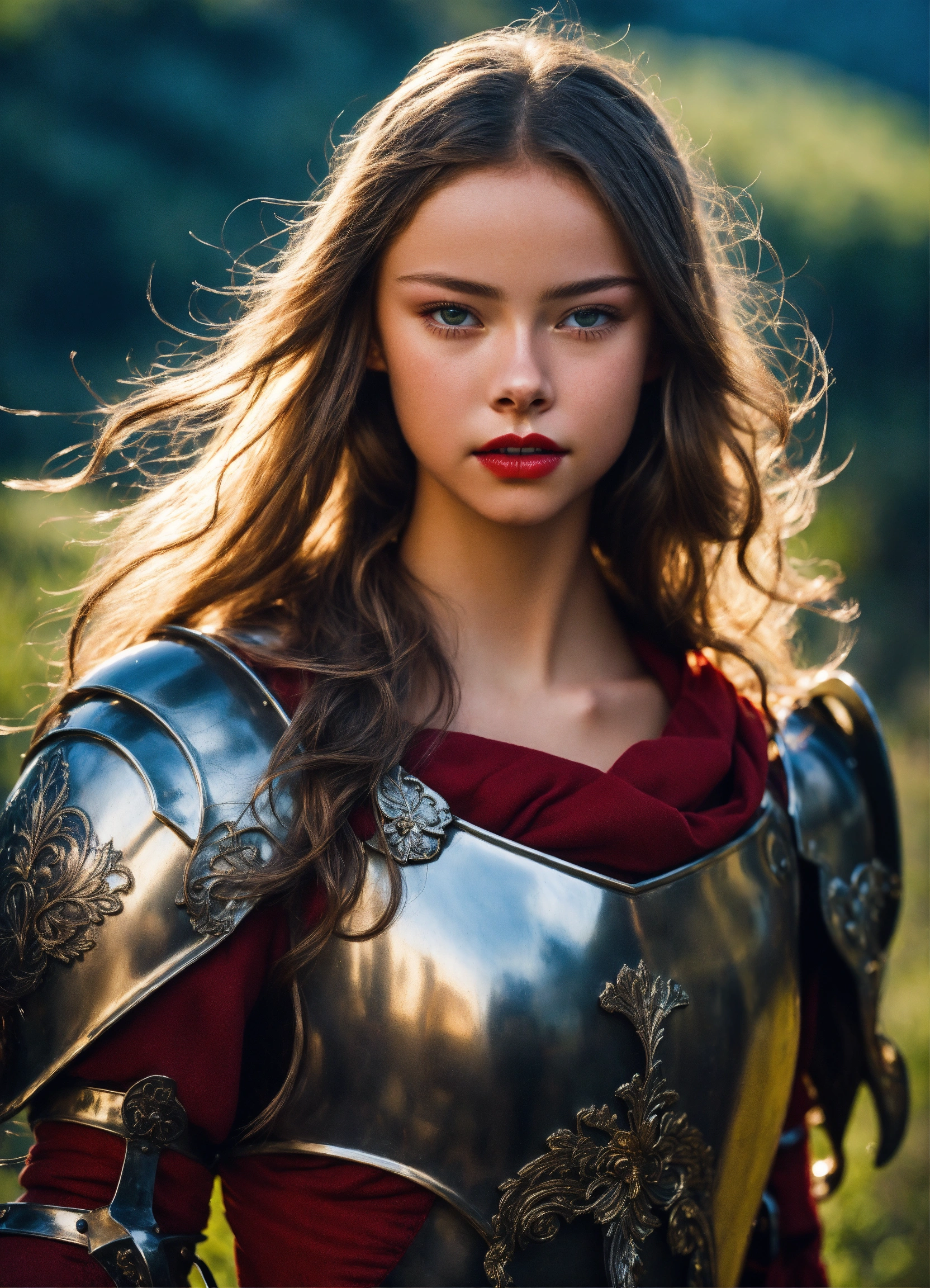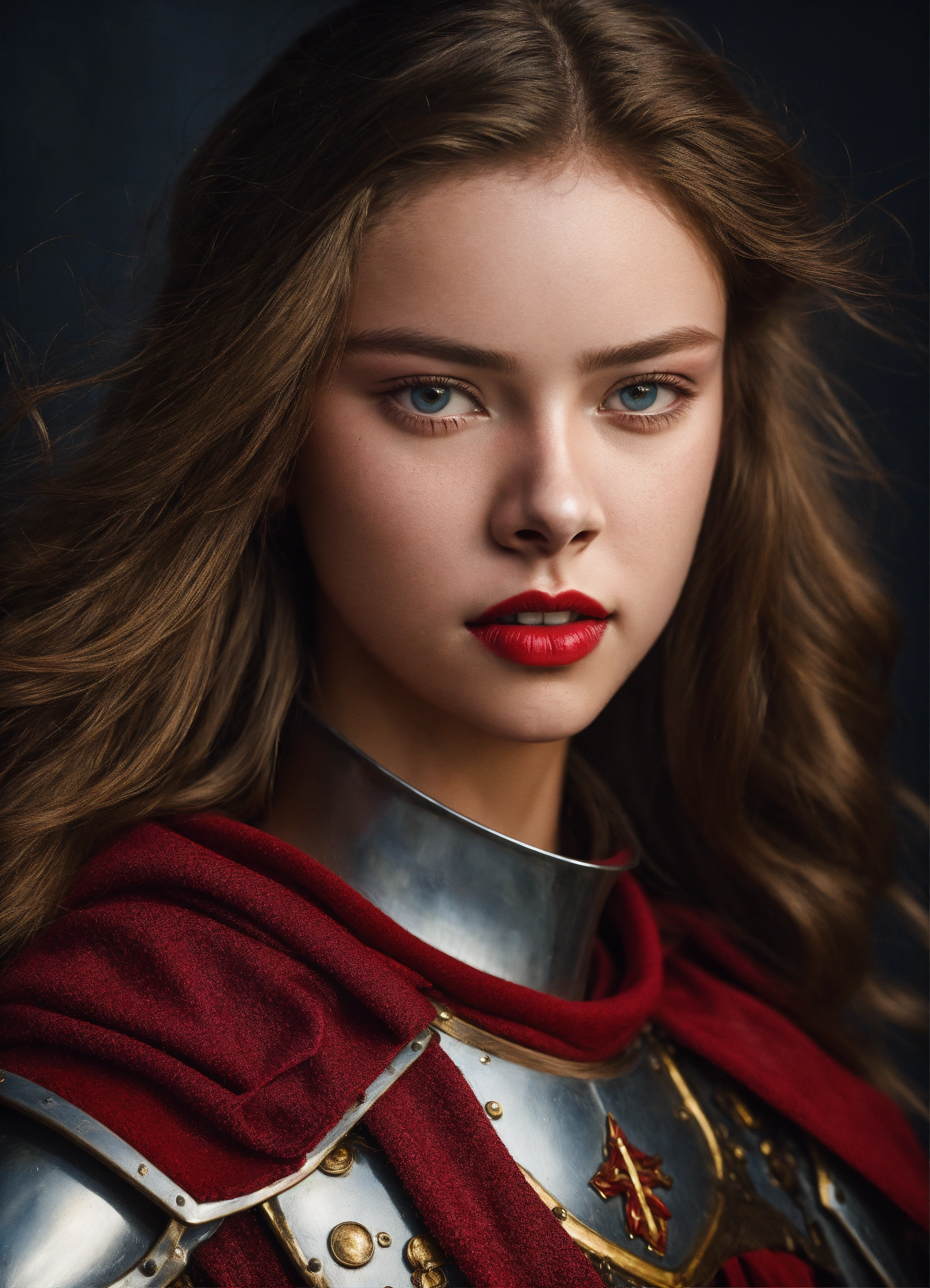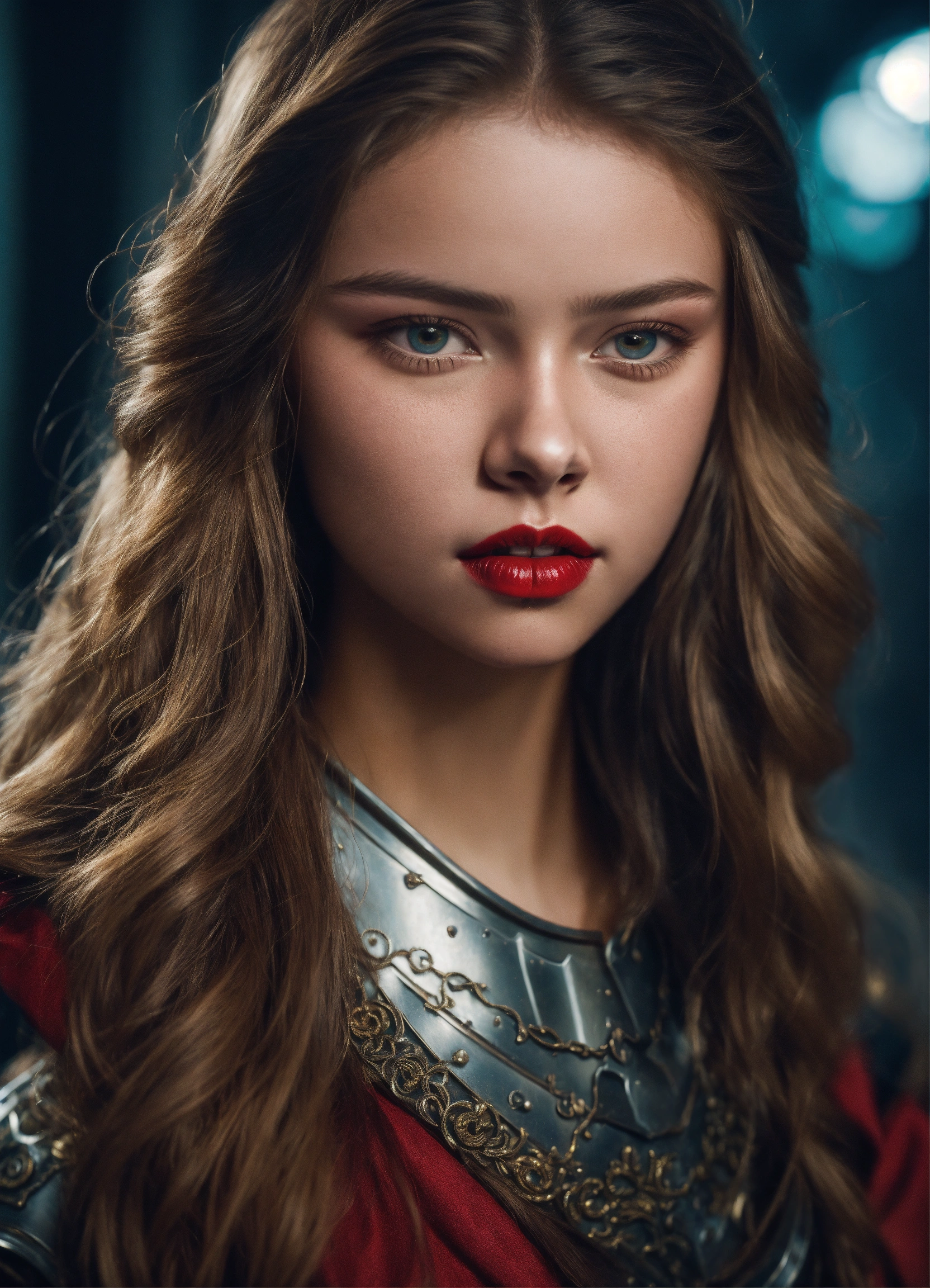 Photo quality color portrait of young beautiful meika woollard as a heroine knight in armor with flowing hair and red lips and stern expression