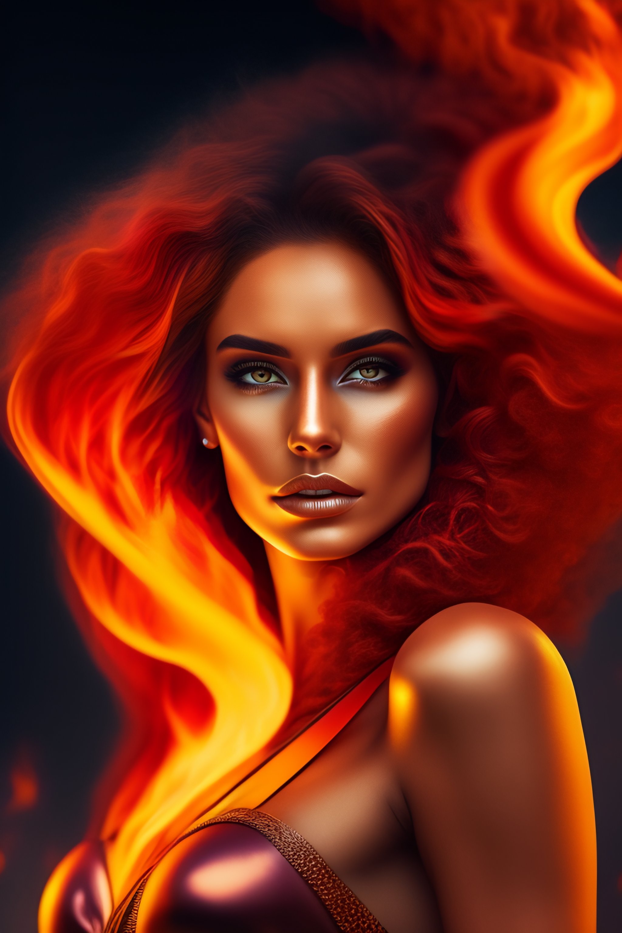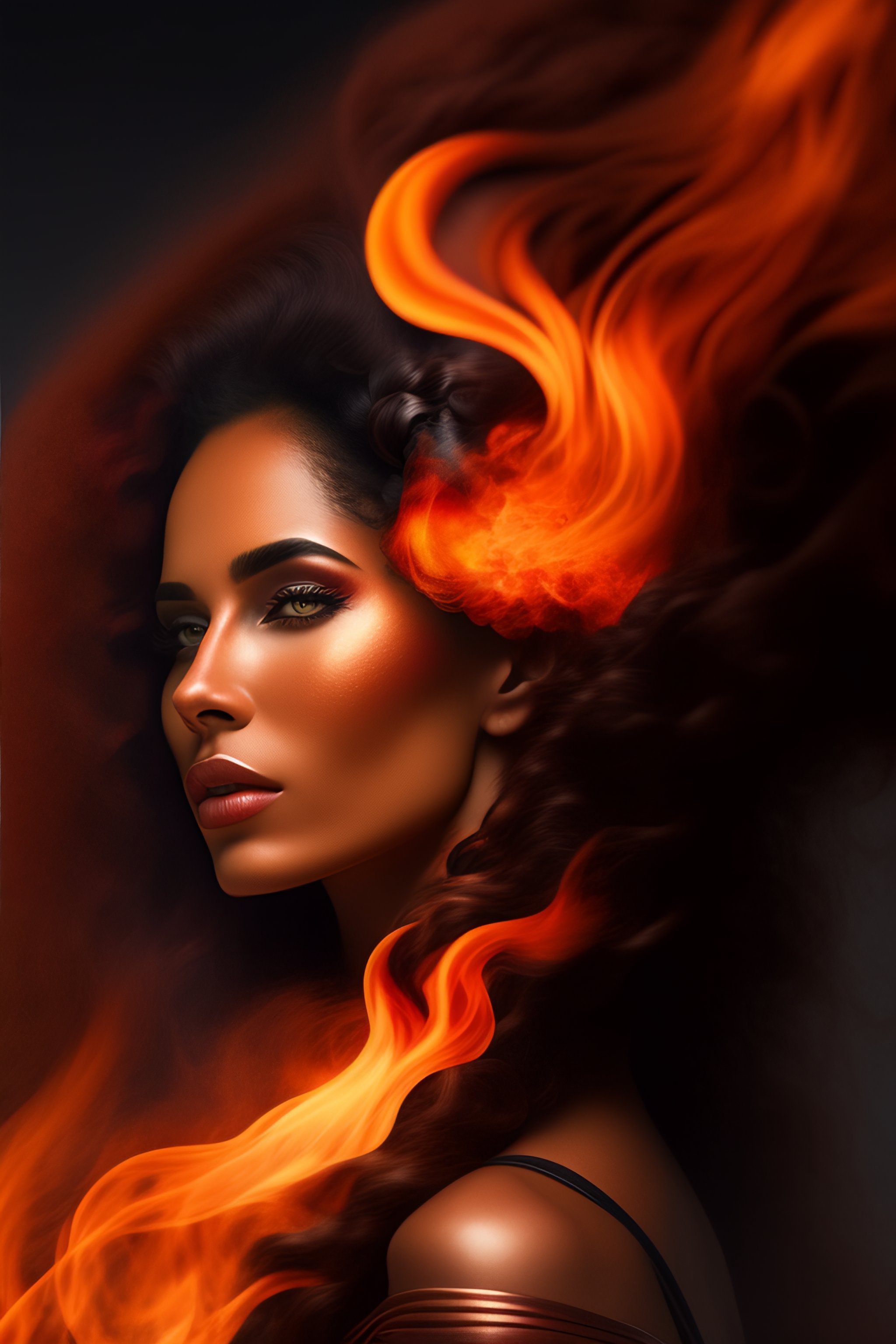 A woman made out of fire and she has hair made of flames embracing a man made of copper, dark, magical, fantasy, digital art.