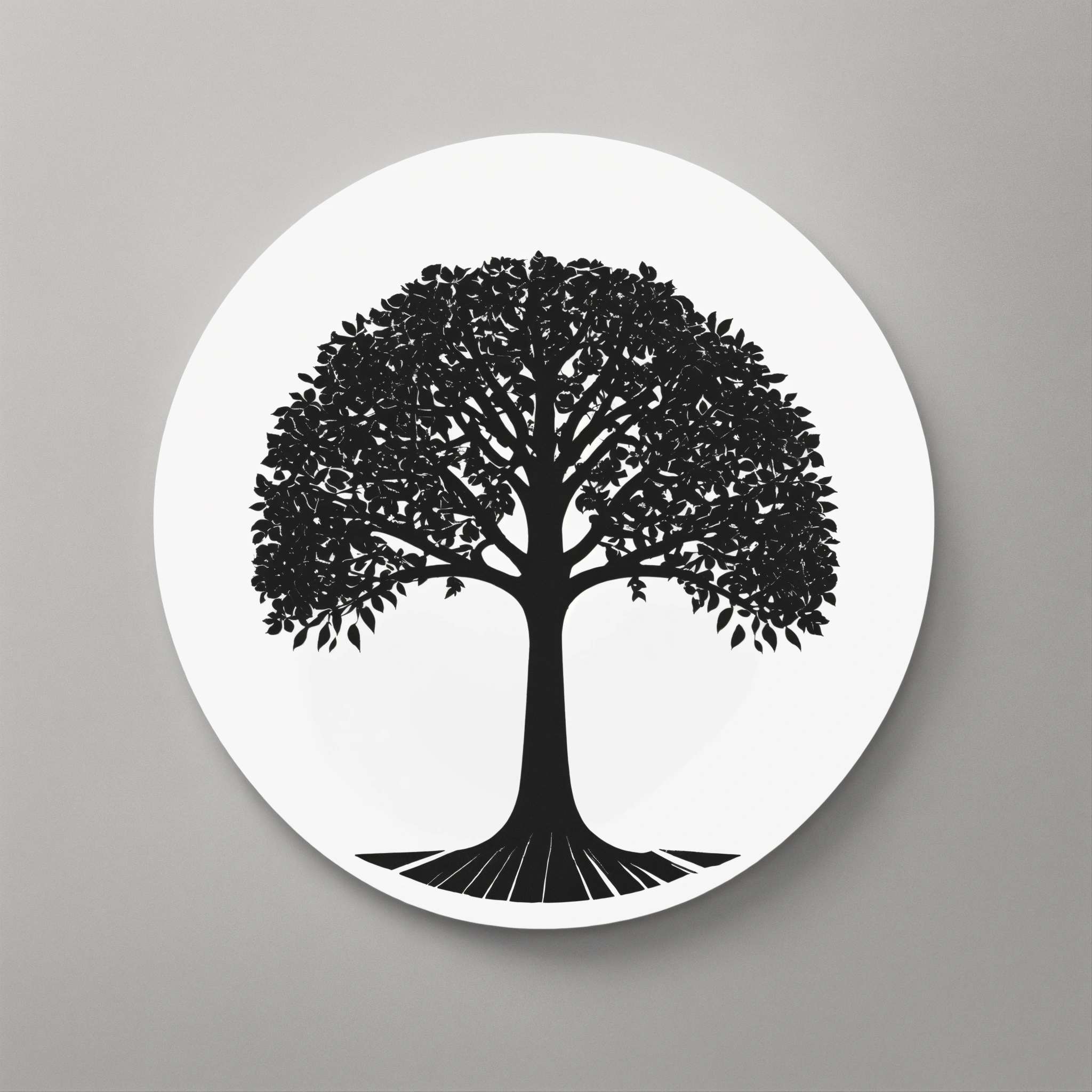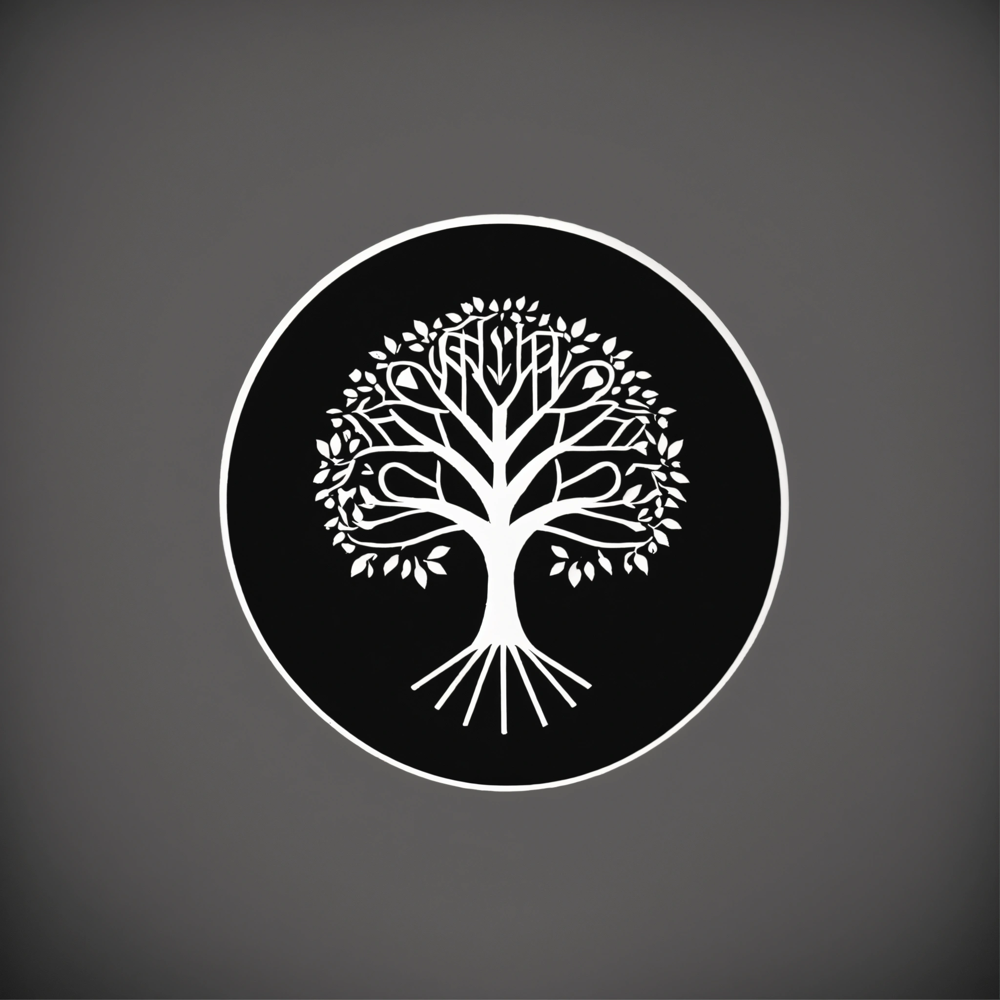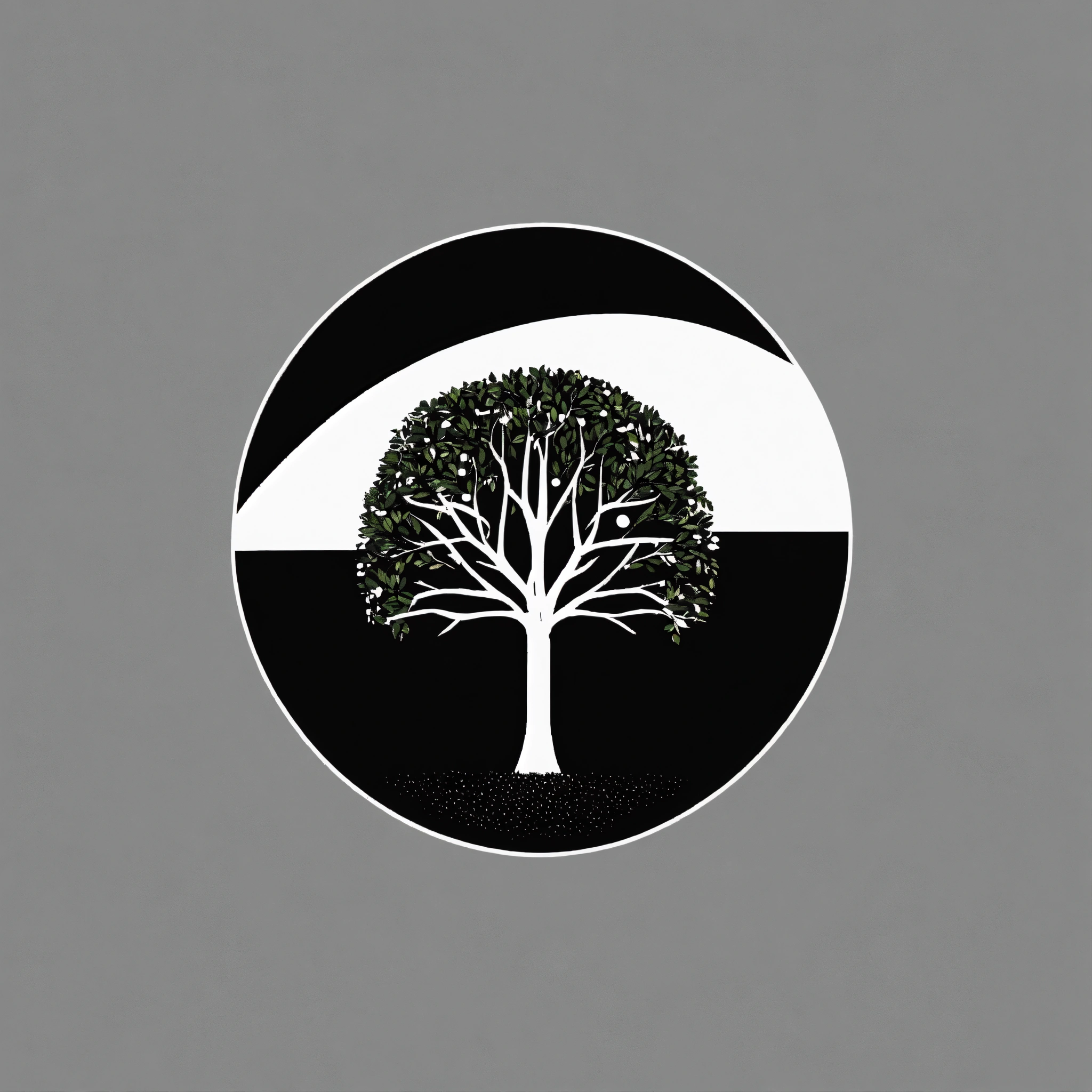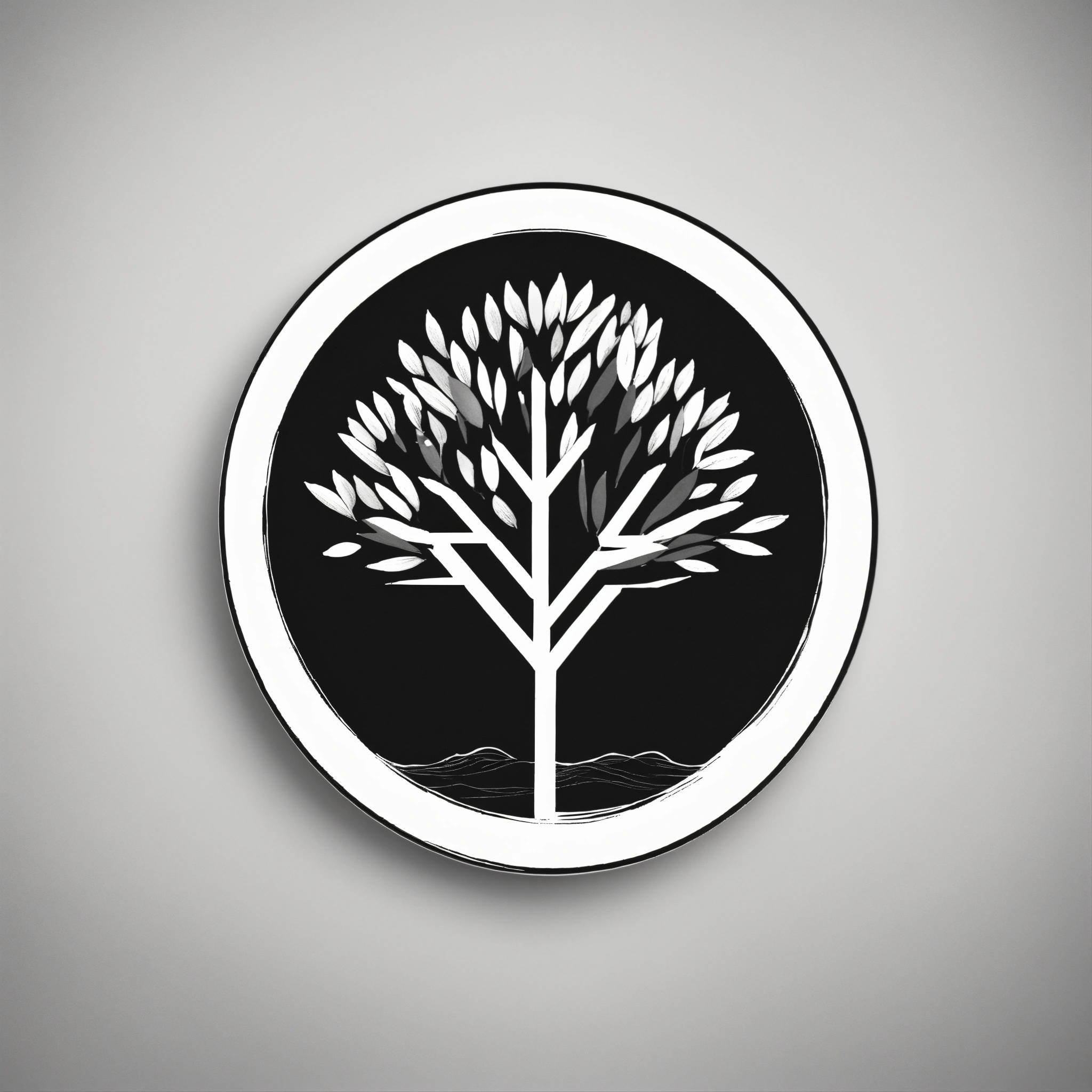 A minimalist black and white circular logo of a pencil with the shape of a tree