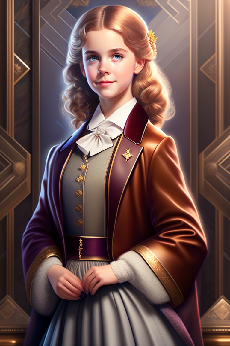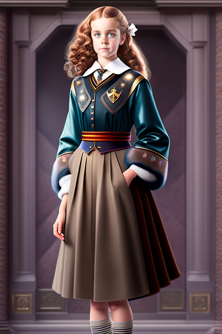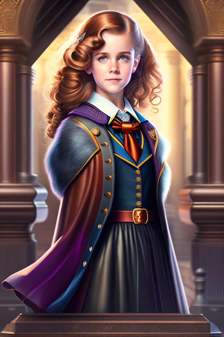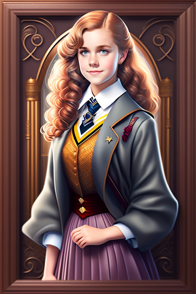 Photo of young hermione granger from harry potter in the style of art deco, full length shot, full body, highly detailed, natural light, photorealistic