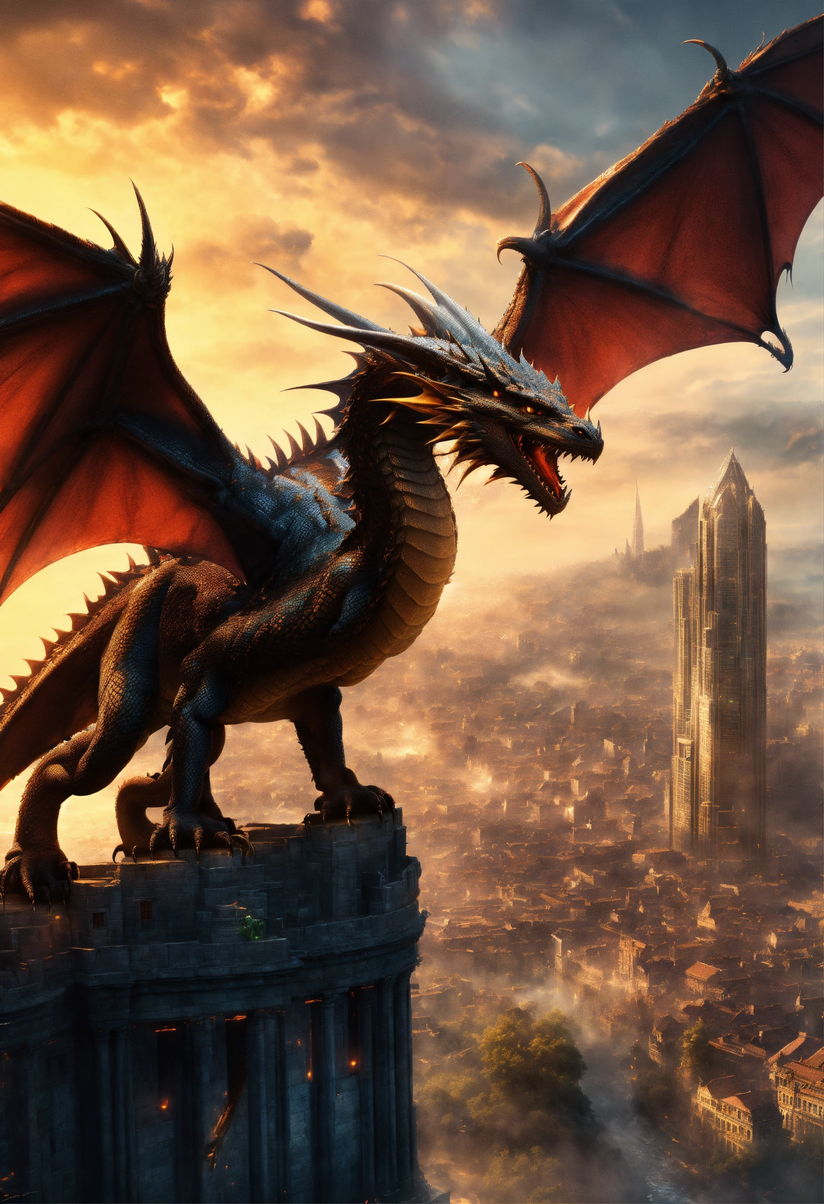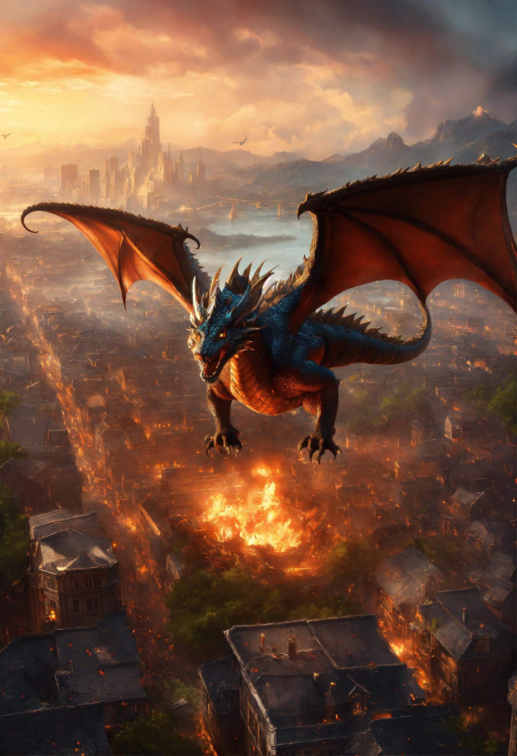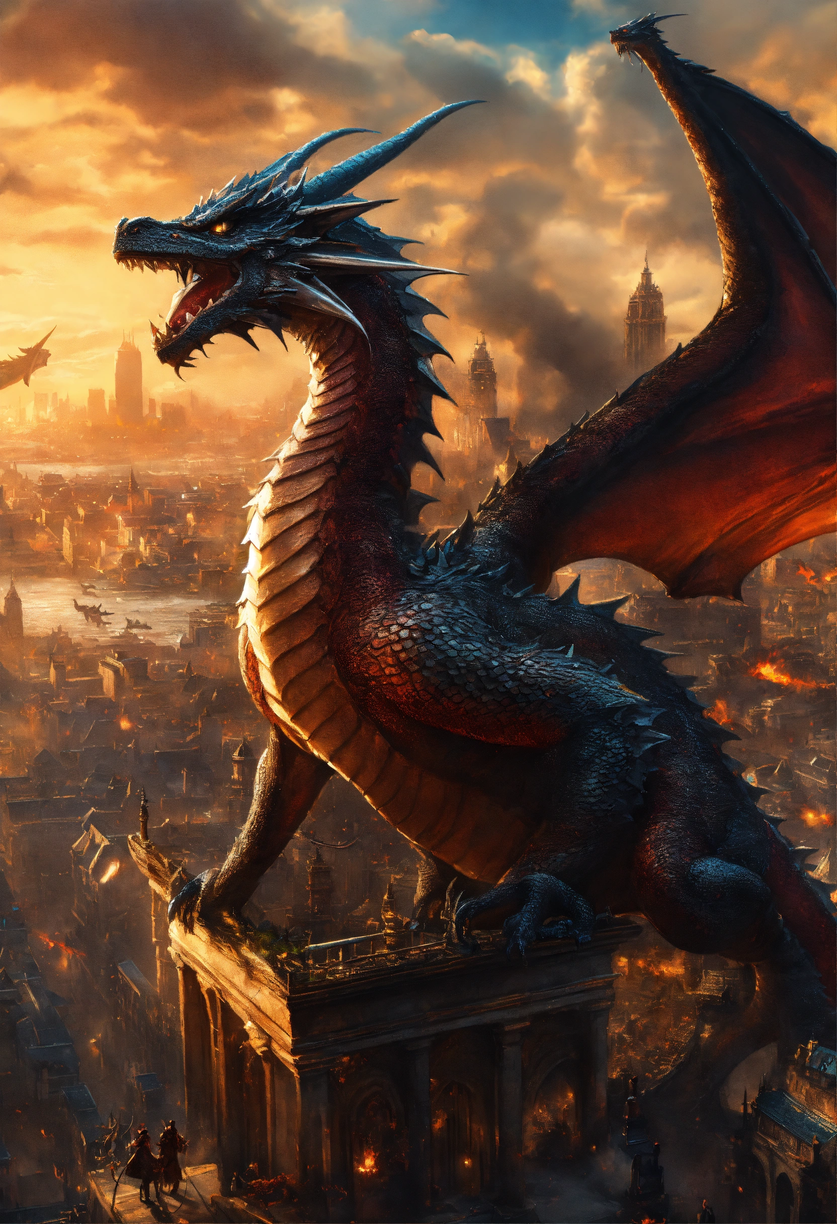 Dragon attacked city, fantasy, high detail, realistic photo, high detail, digital painting, cinematic, stunning, hyper-realistic, sharp focus, high resolution 8k, insanely detailed