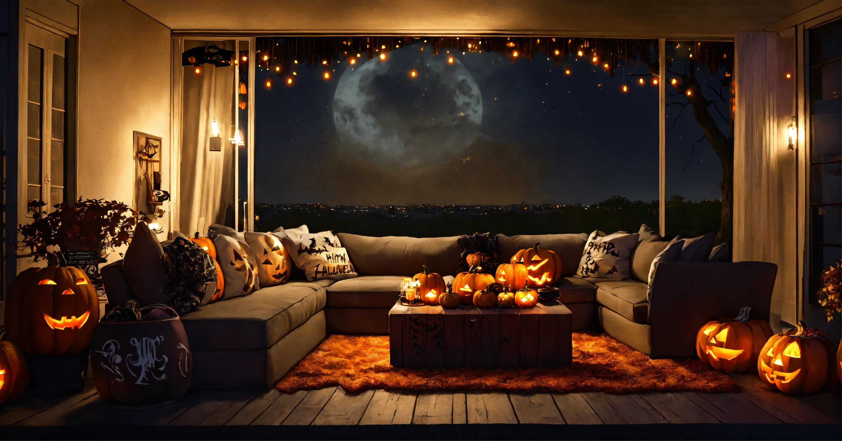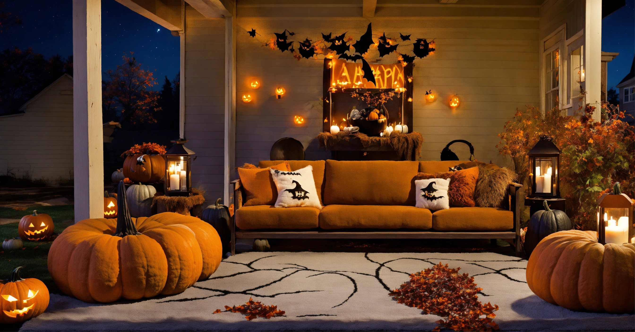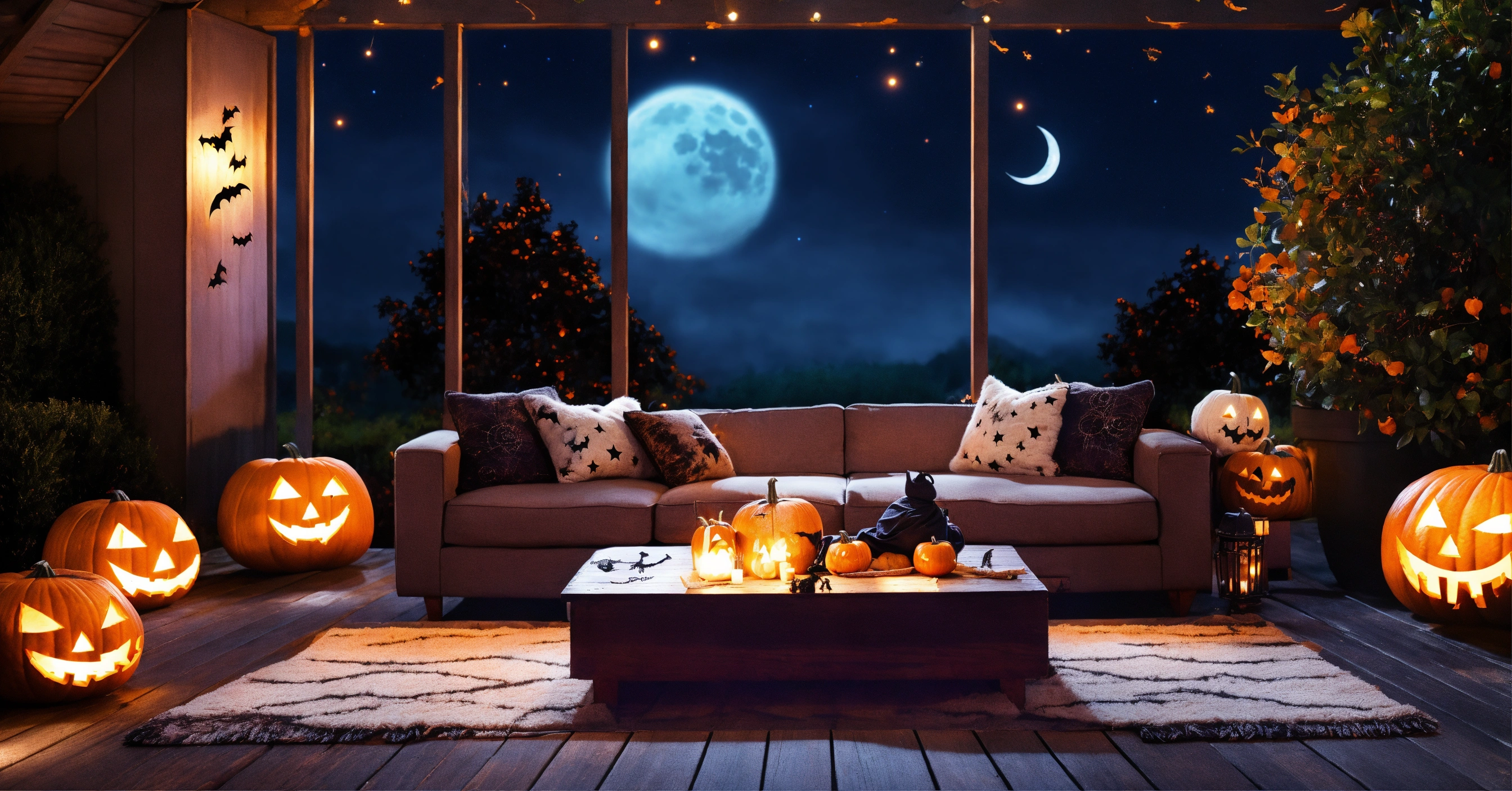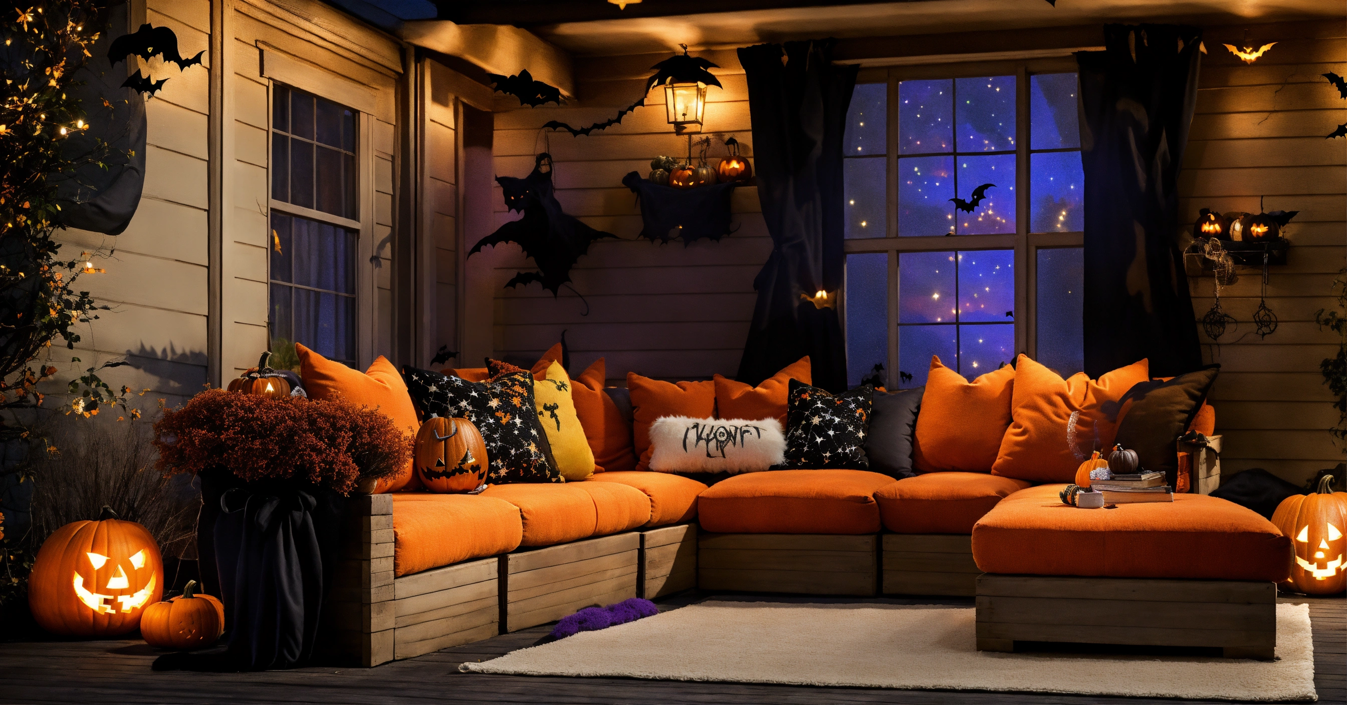 Outdoor halloween living room, fluffy rug, big comfy couch, night stars moon, halloween fall grafitti, dark wood, fluffy couch pillows