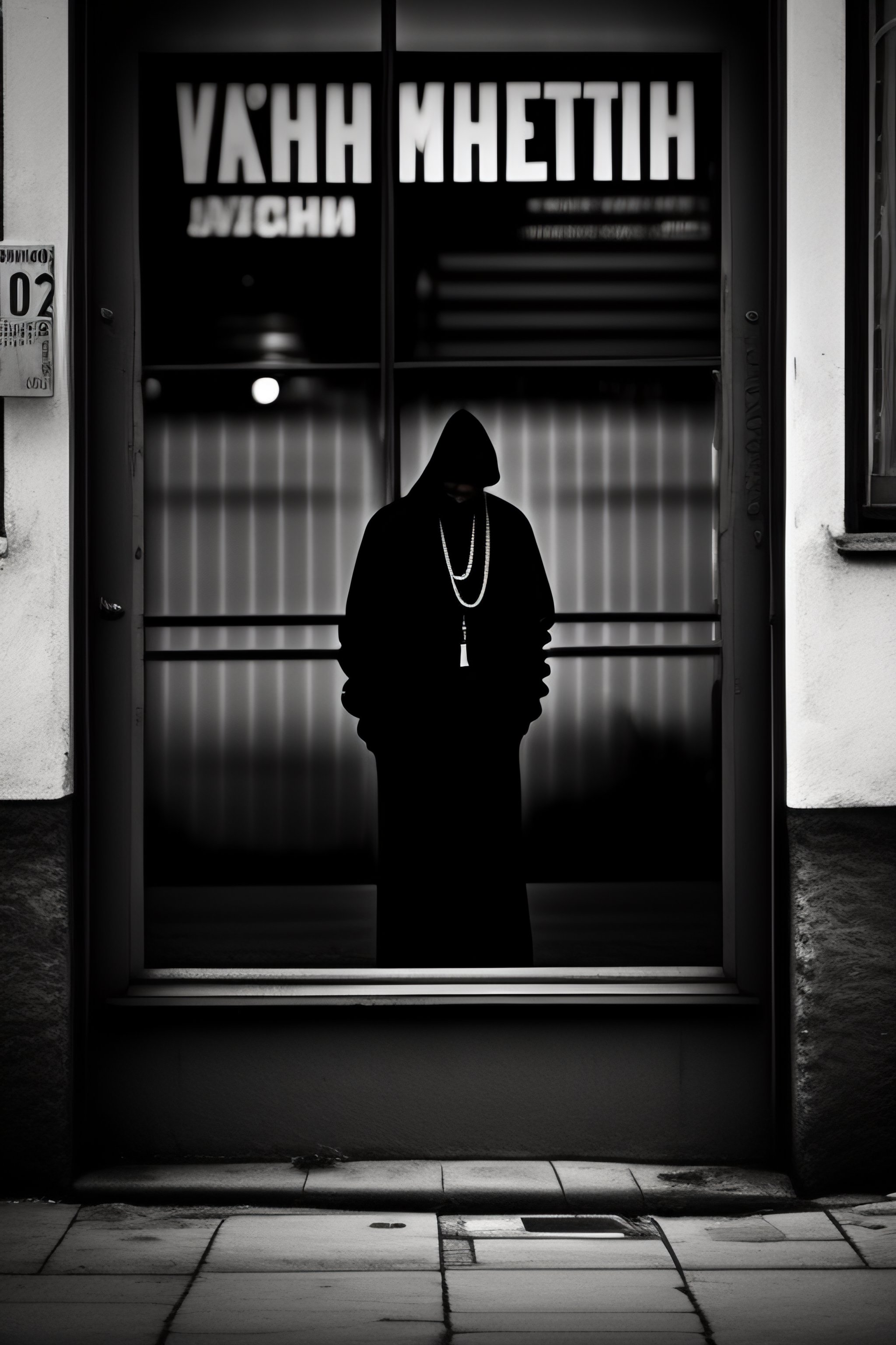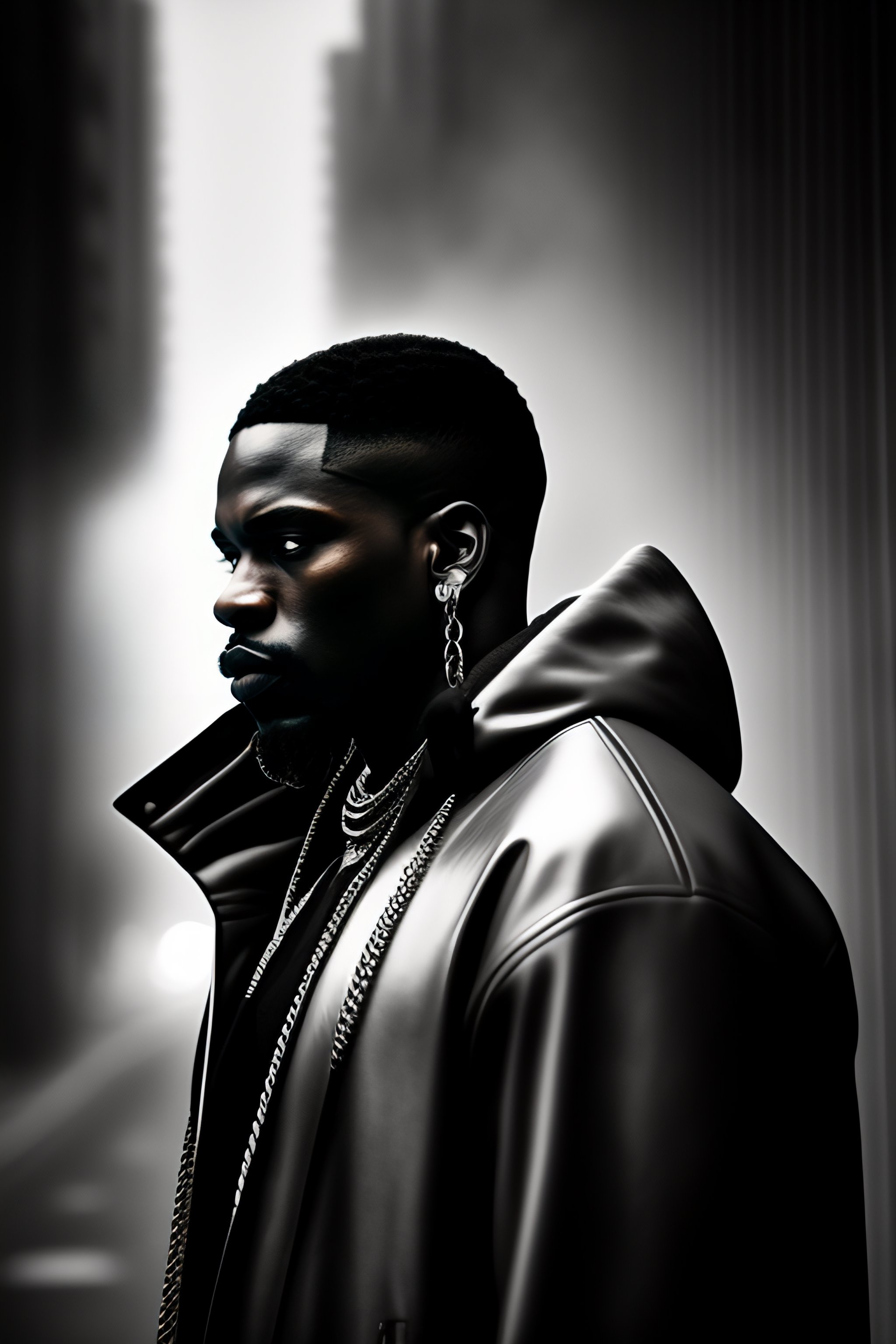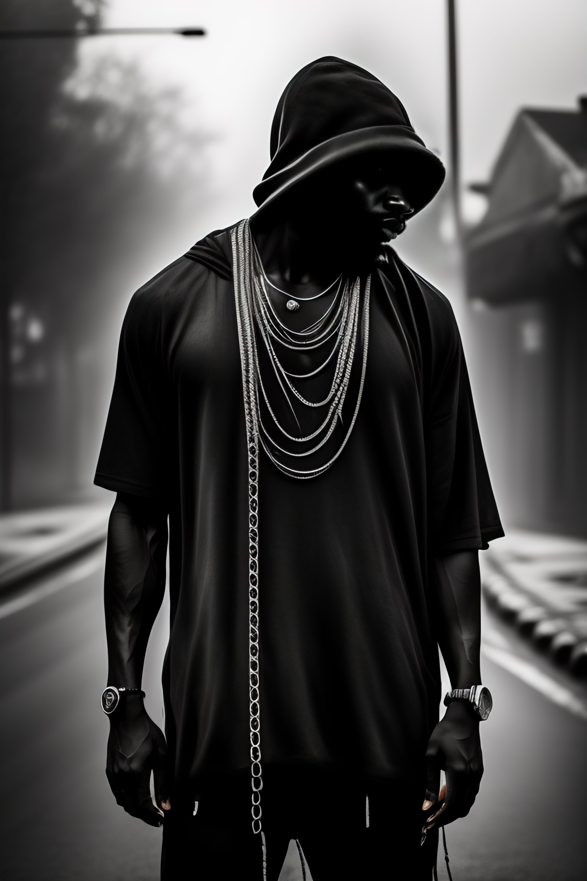Rap album cover, dirty streets, black man with chains, not a visible face, bold shapes, black and white, foggy, depressed atmosphere, poverty