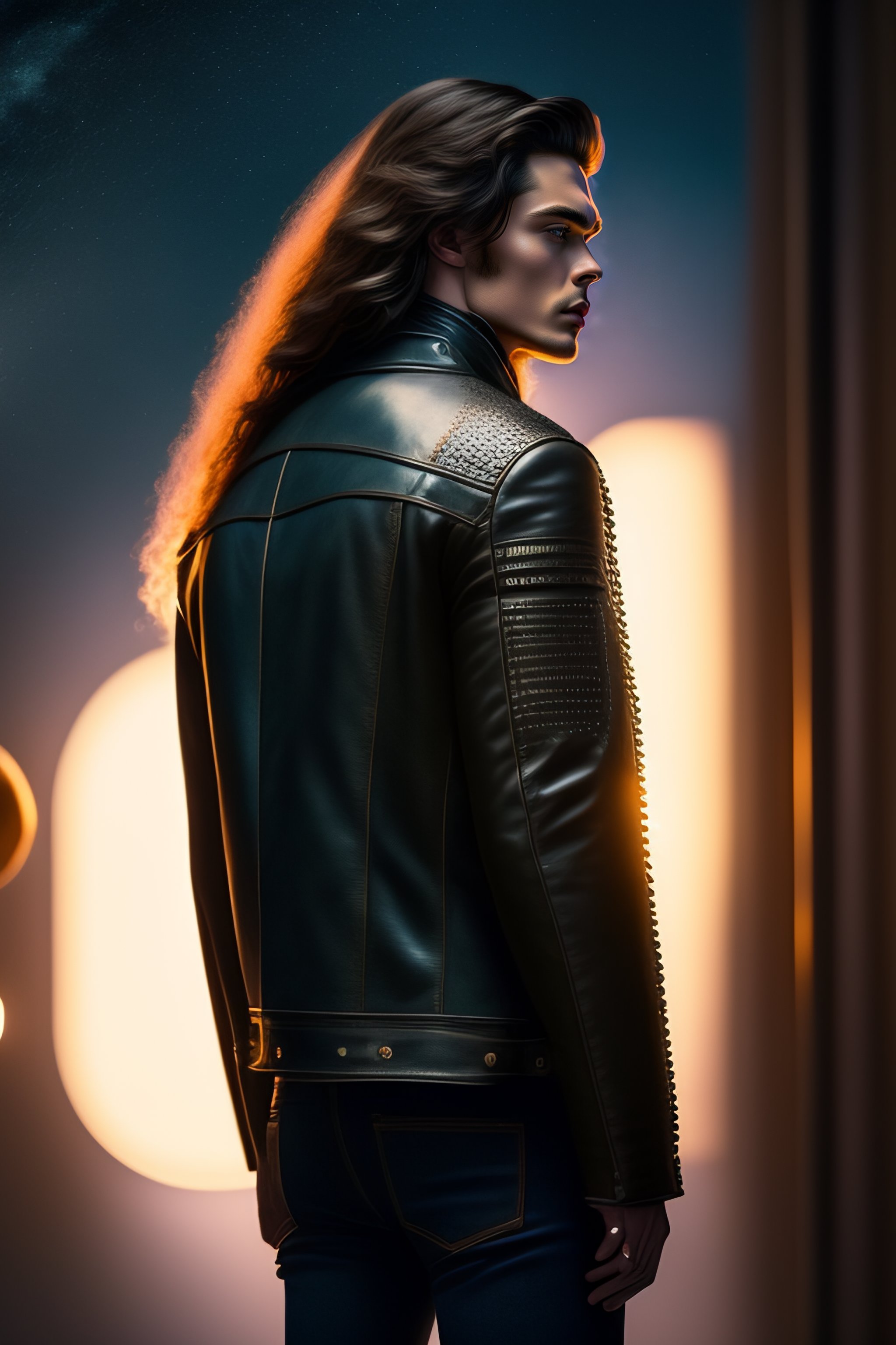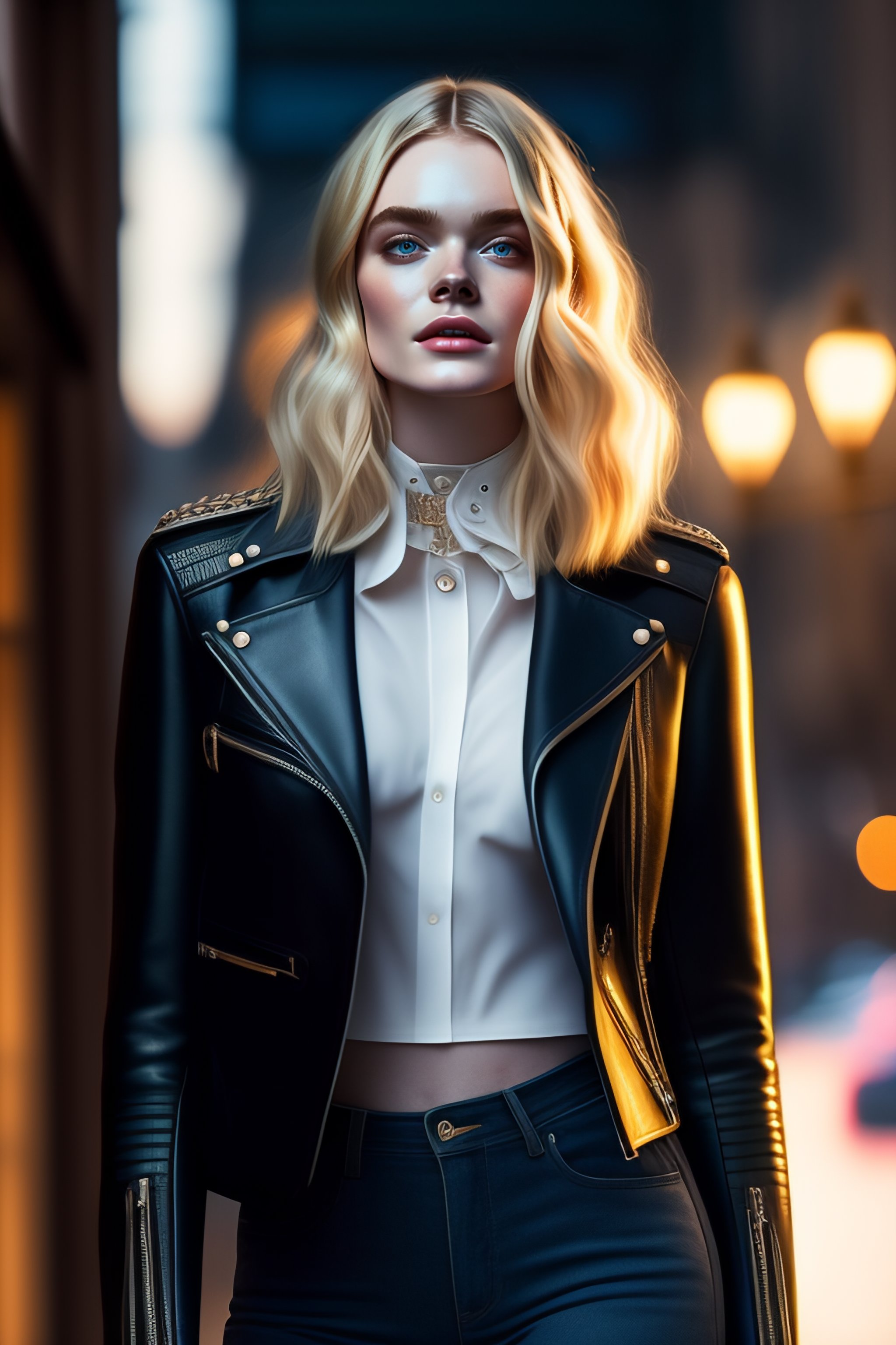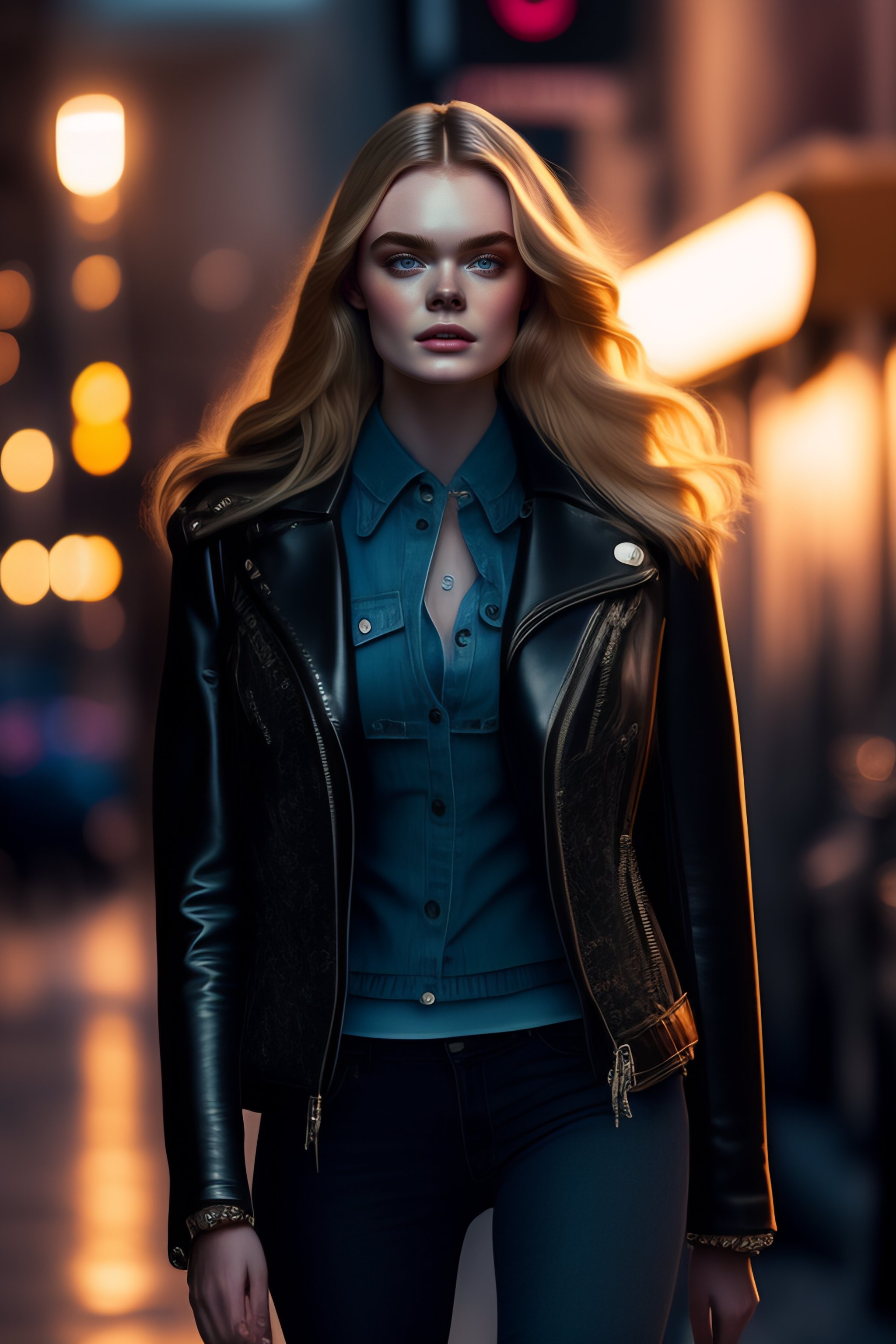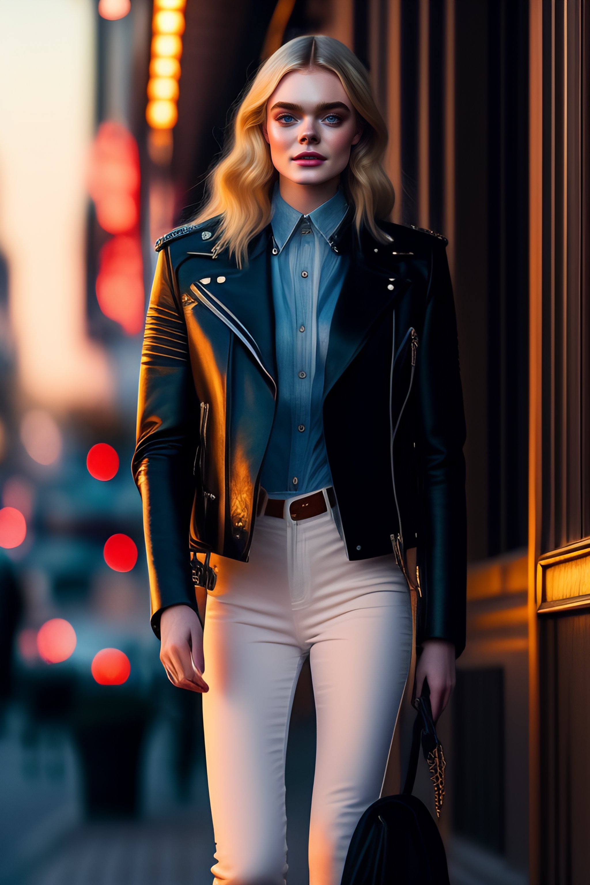 Elle fanning's highly detailed full body in jeans and leather jacket, global lighting, radiant light, night city, long hair, man standing with his back