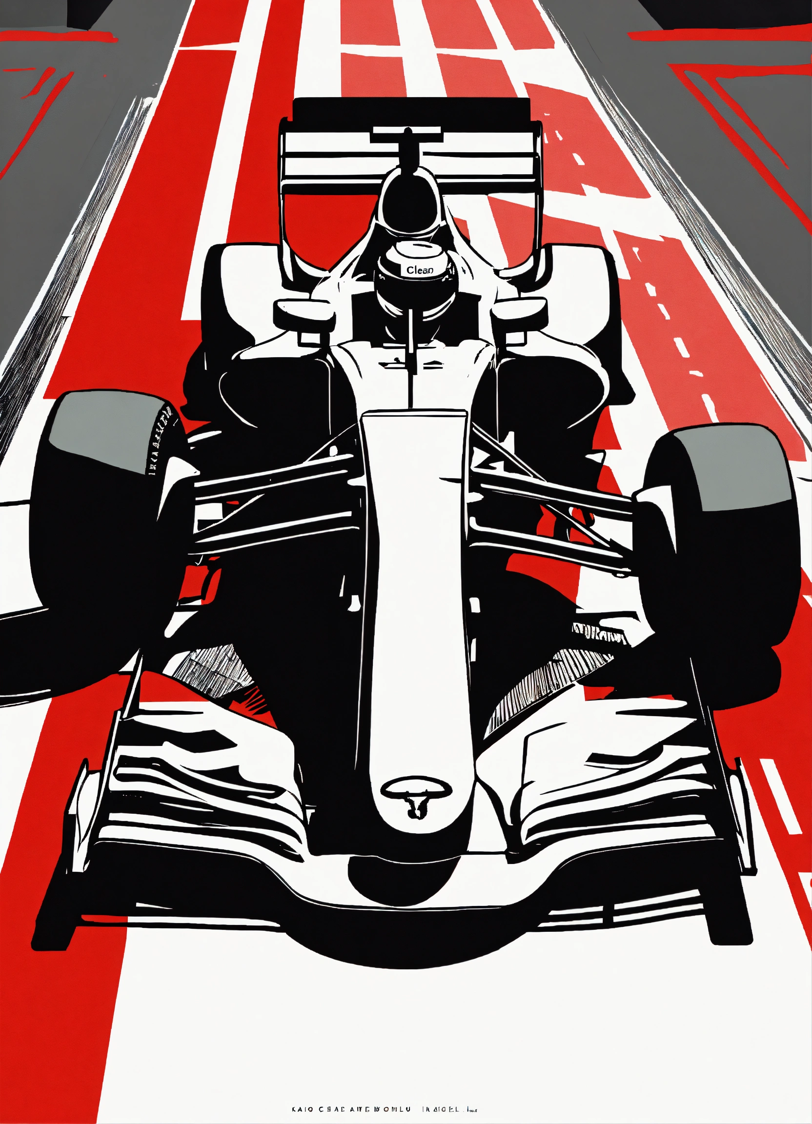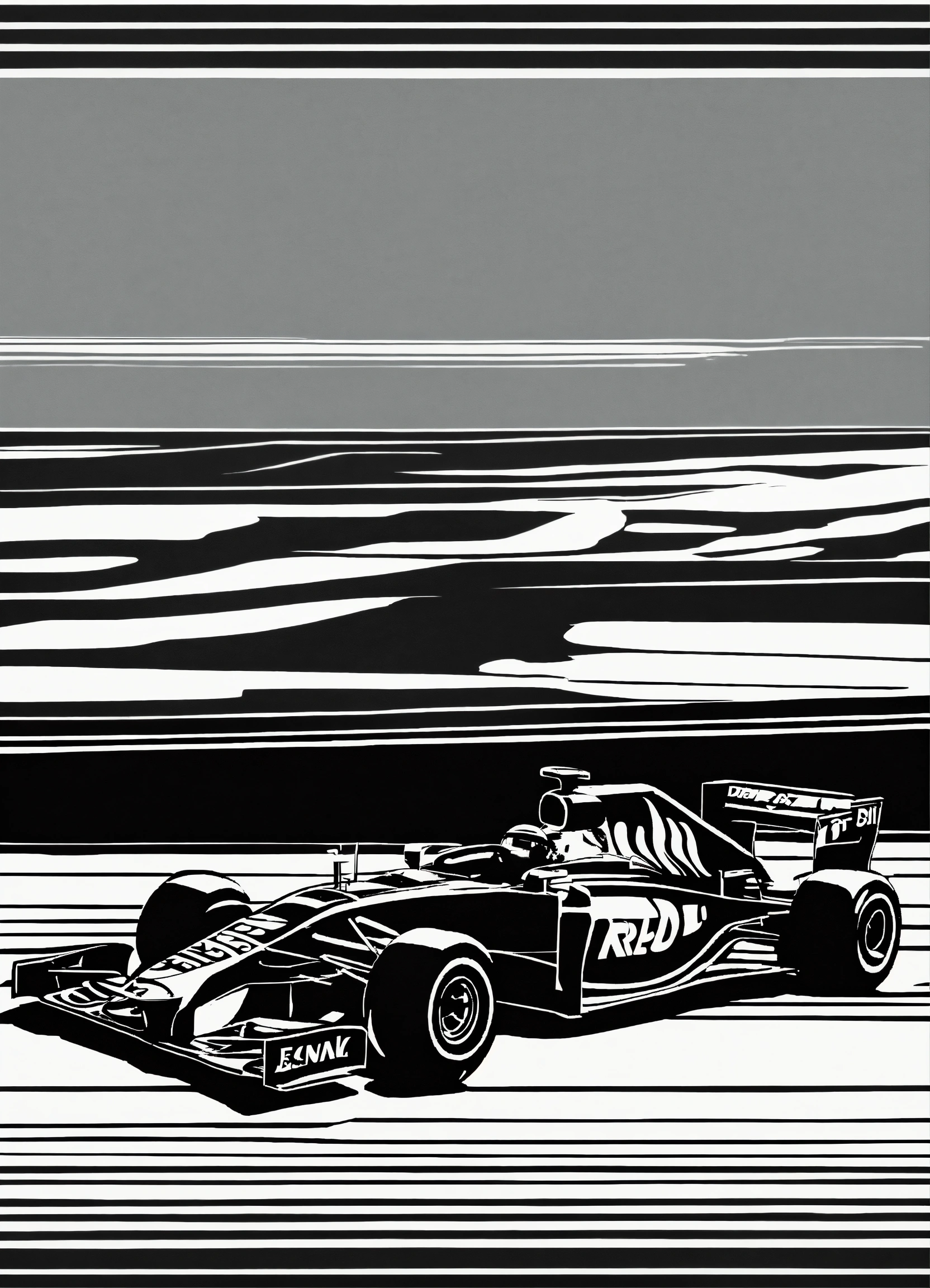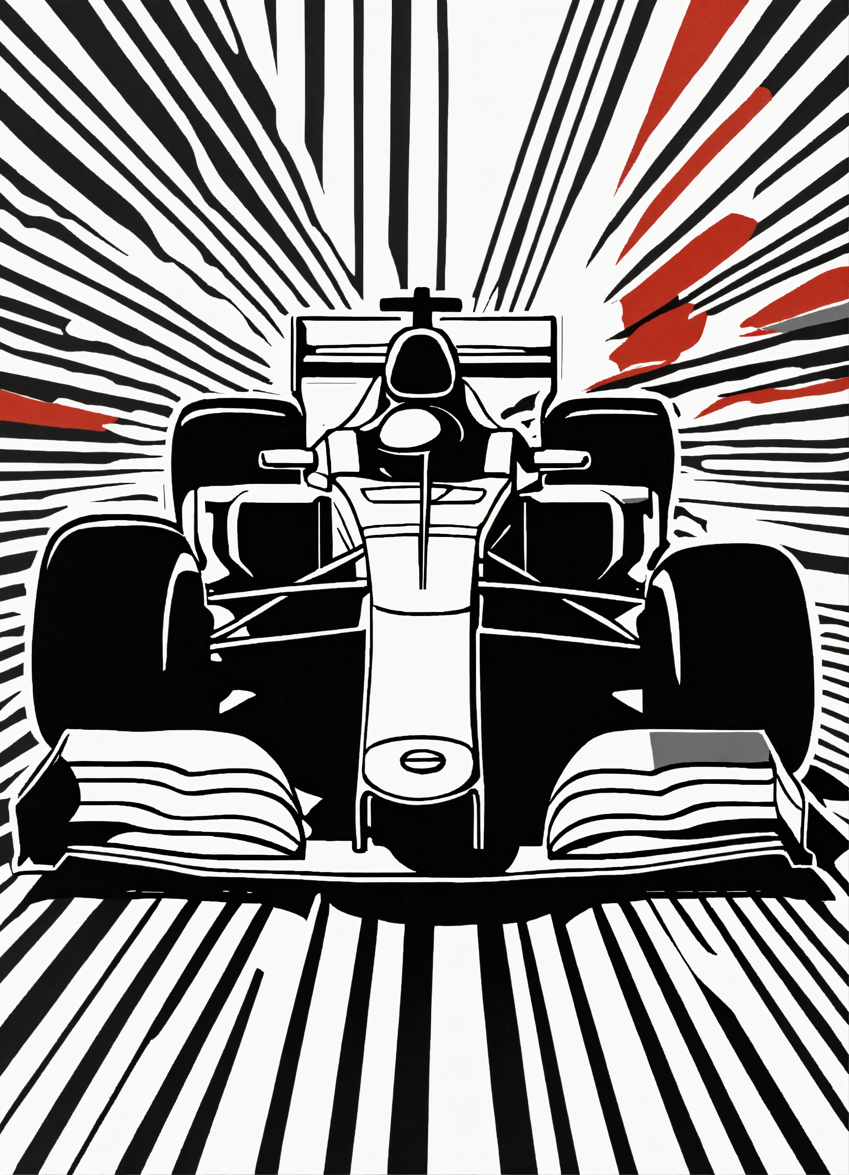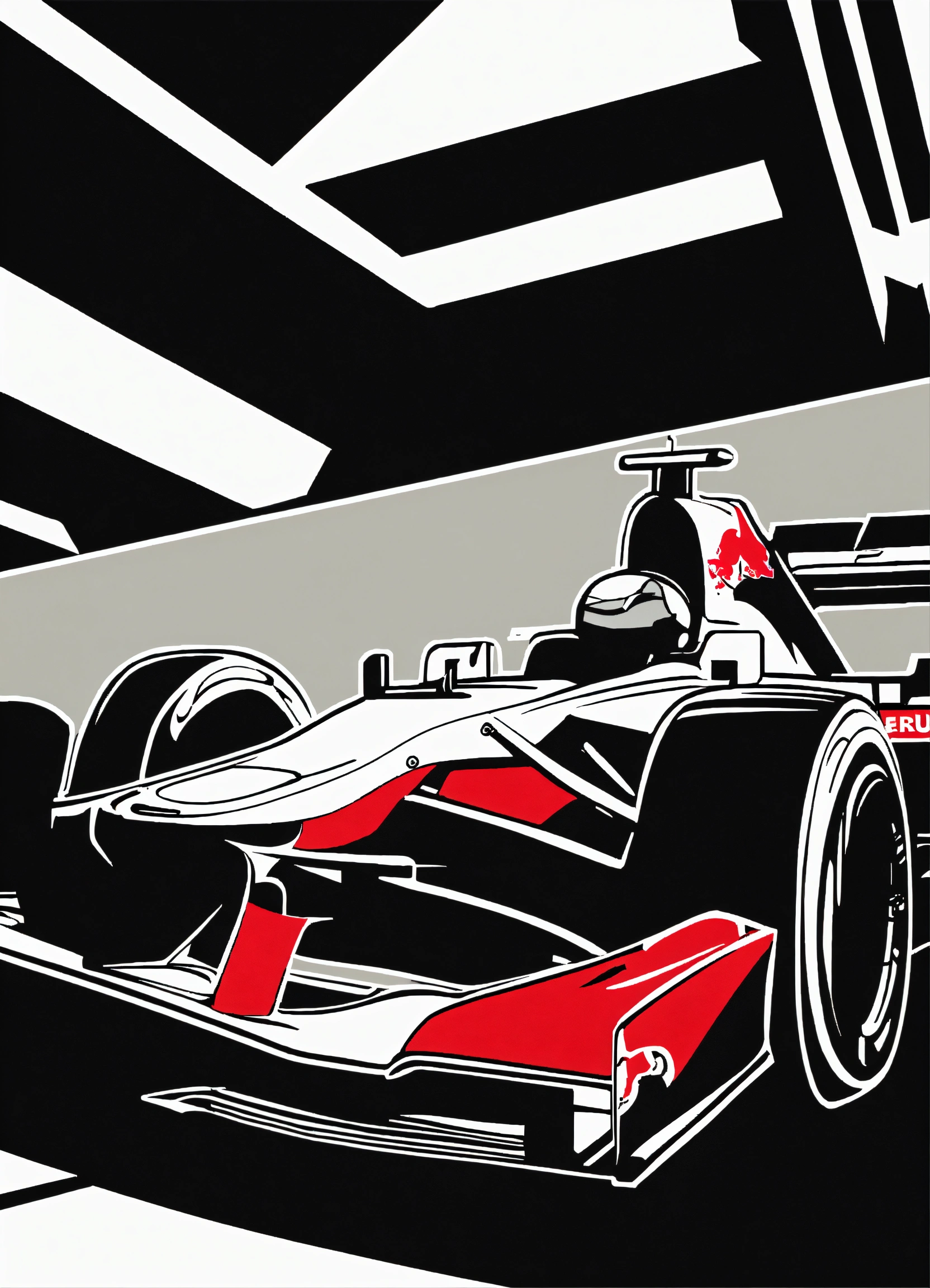 Minimal small linocut of a “red bull” f1 car, black and white, vector, white background, style of kathleen neeley, clean background, simple, clean lines, cutting style, blank ink, unique, creative
