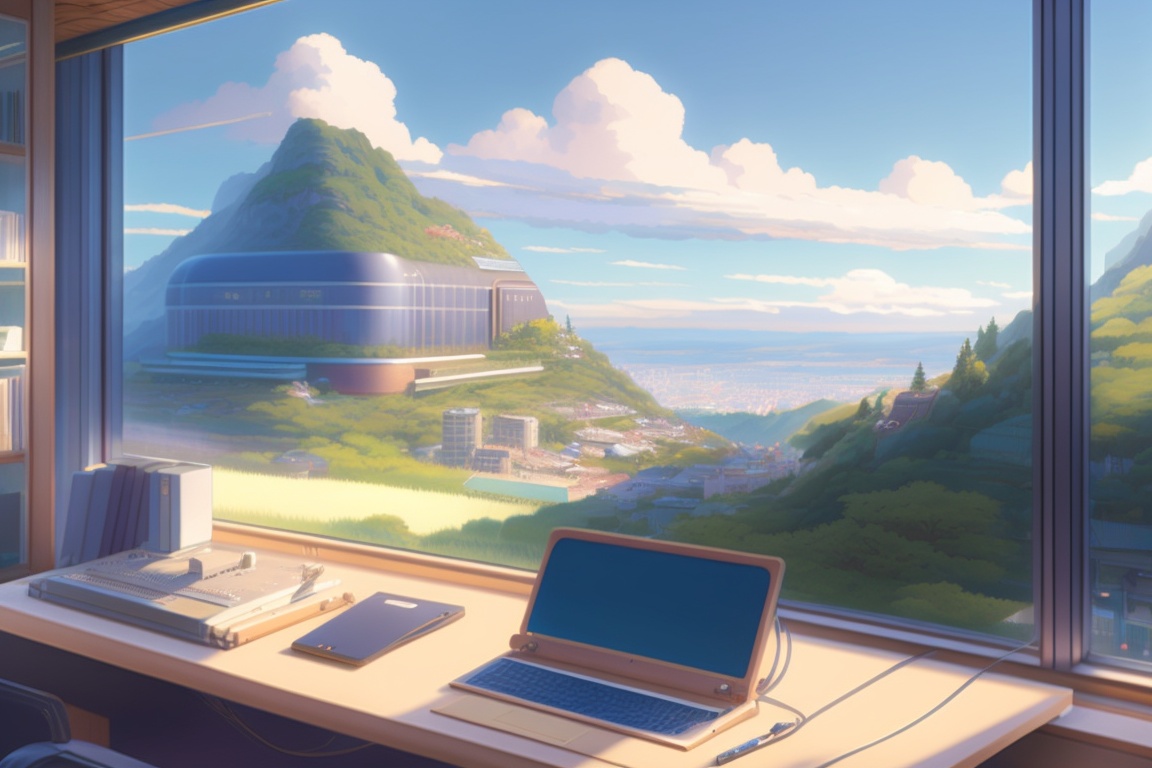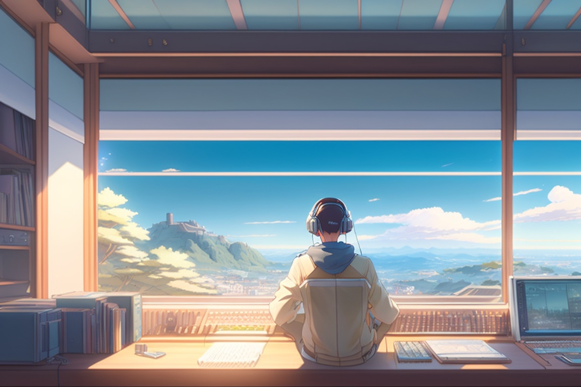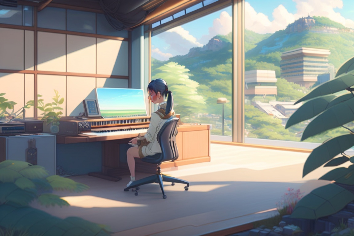 Background by greg rutkowski makoto shinkai kyoto female key art animation medium shot, a panoramic glass music studio in the background a valley with the city in the background . inside the studio on the left is a keyboard with an insense on top, on the floor a comfortable, leaning against the glass wall, an armchair and to the left of the armchair, a guibson guitar. also contains a notebook at a workstation and a record player and a collection of records