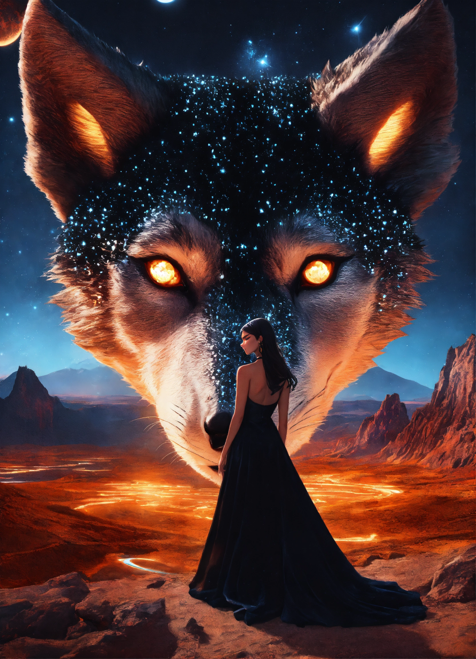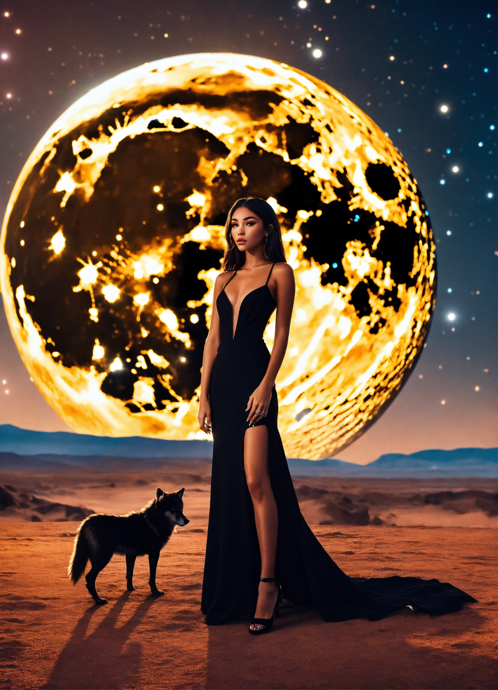 Madison beer in a beautiful sparkling black dress, in a futuristic landscape. a wolf with amber eyes watching her. two moons in the nightsky at nightfall