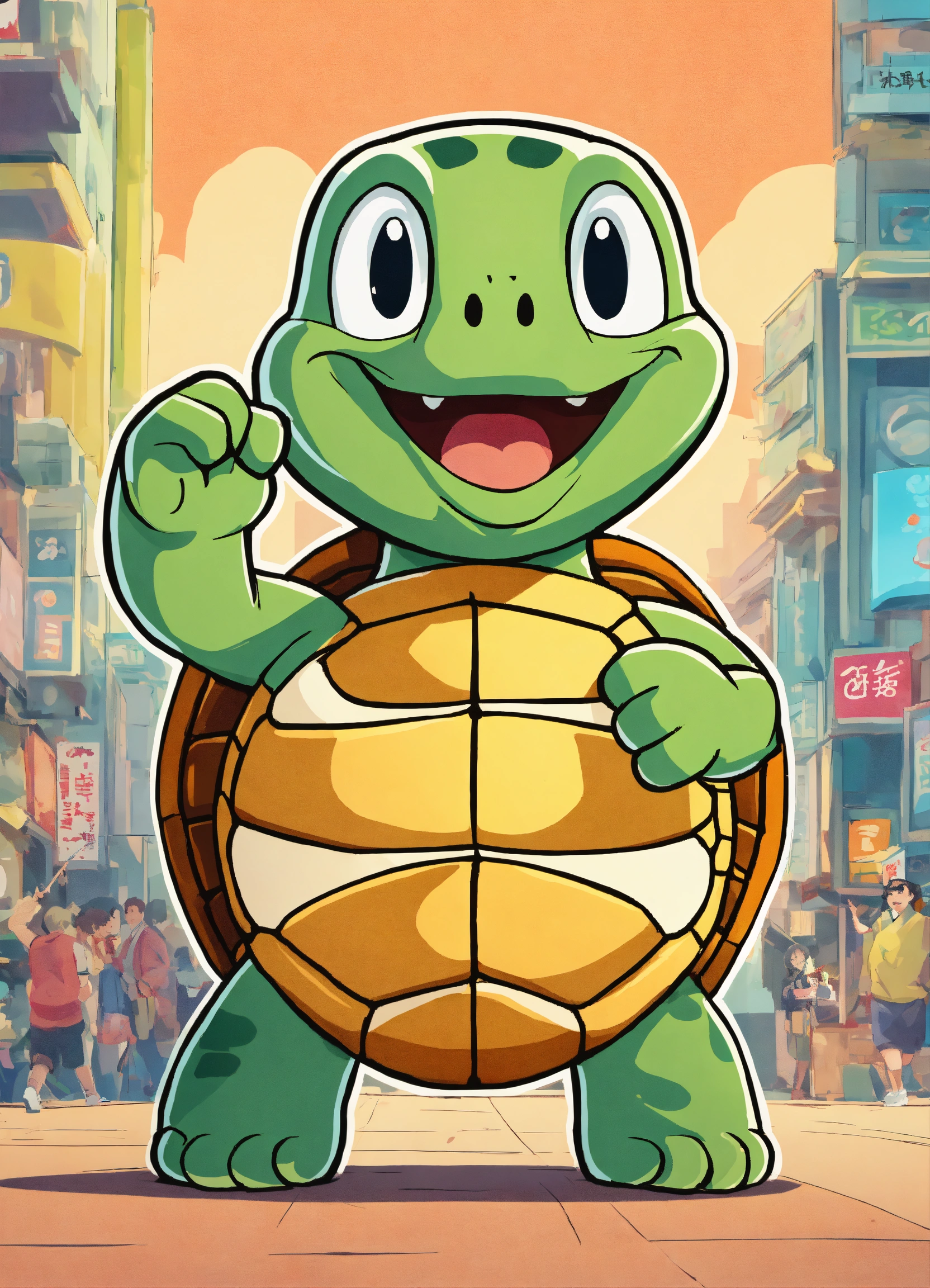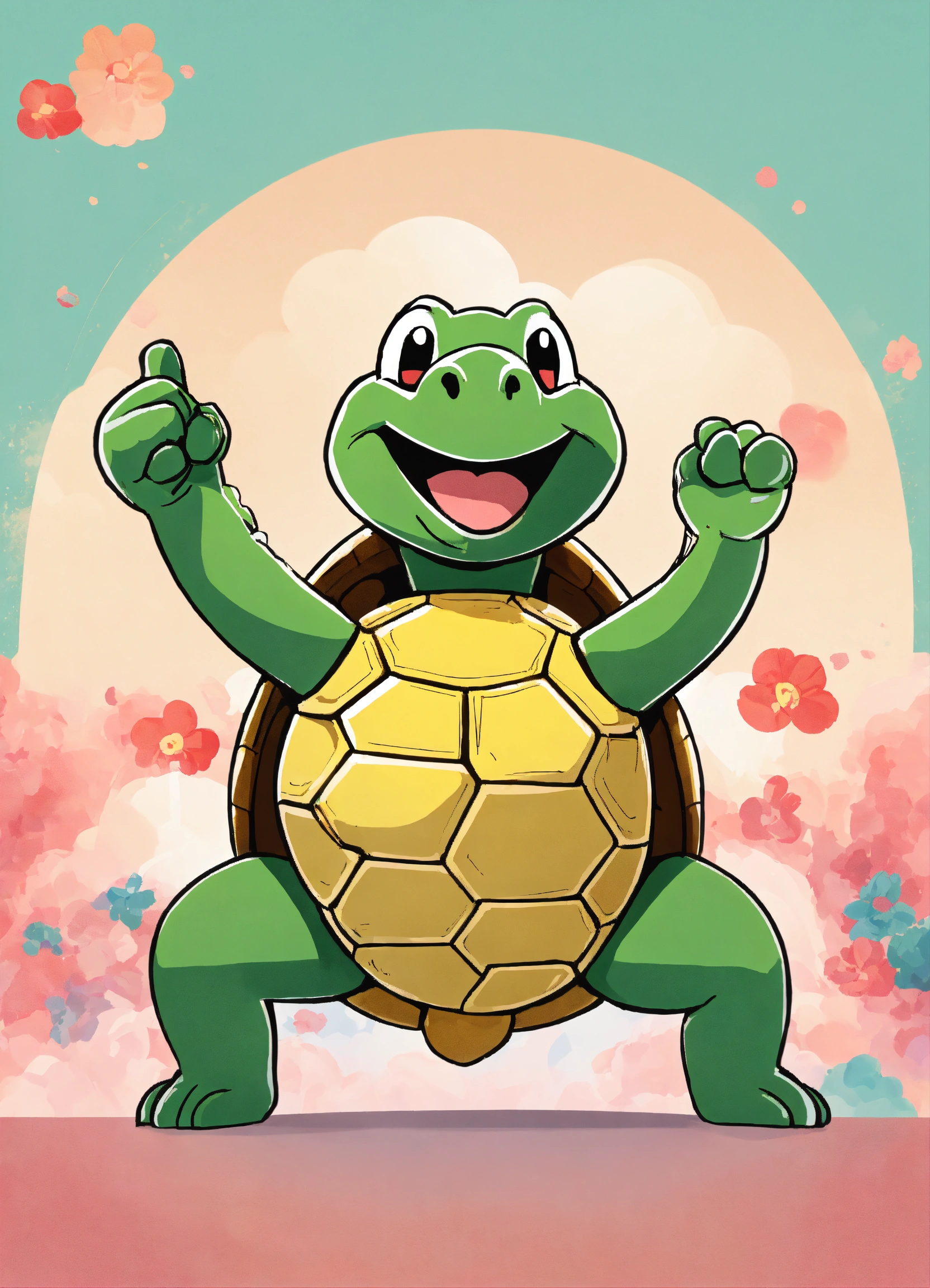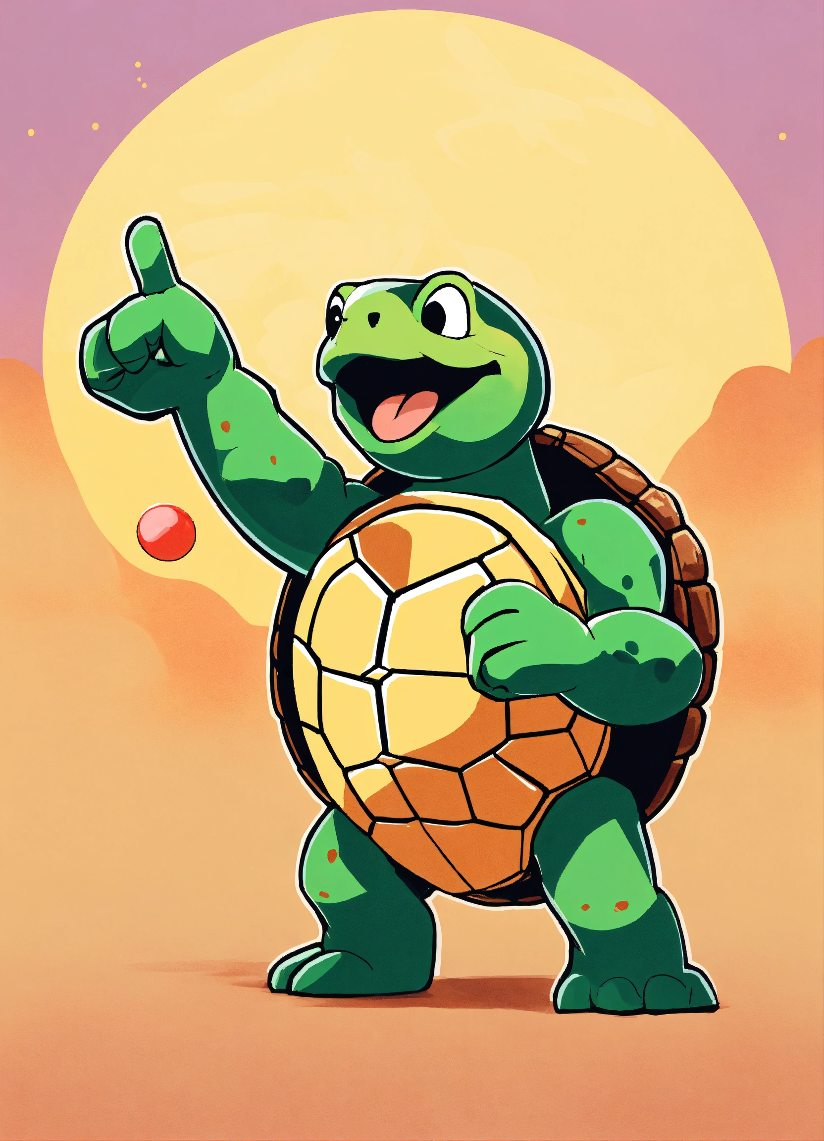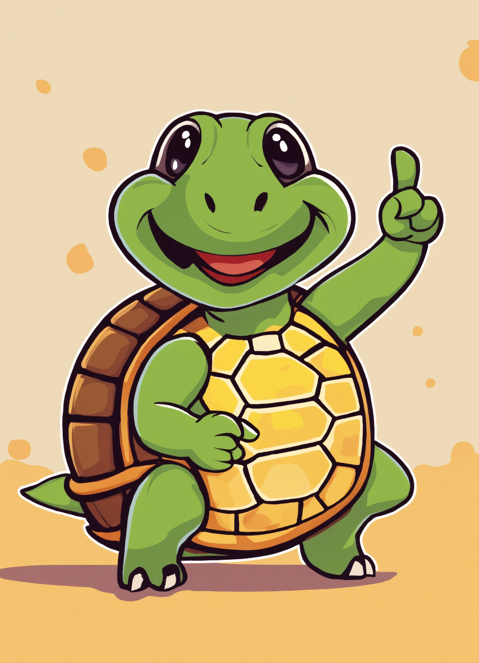 Minimalist, fun image of a turtle, expressive and happy emoji style in an "i told you" attitude, pointing with the finger towards the audience, japanese cartoon style, whit a bitcoin in its hand, very happy.