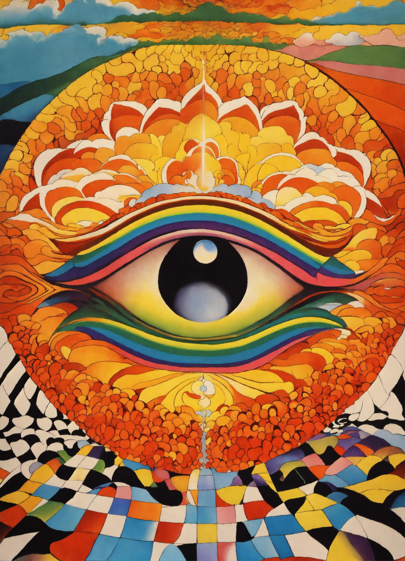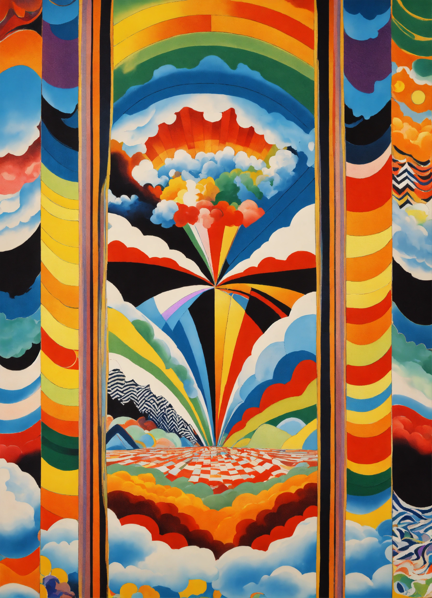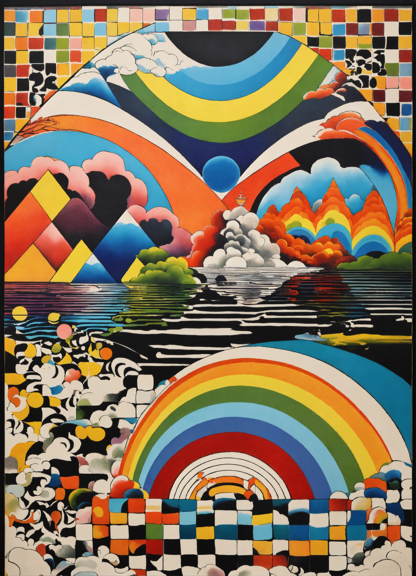 Japanese vintage poster, mind bending distortions, rainbow interlocking shapes, symmetrical patterns psychedelic clouds, black and white ying yang checkerboard tiles, chevron sun reflecting onto chevron water abstract cosmos merging into dream dimension by picasso