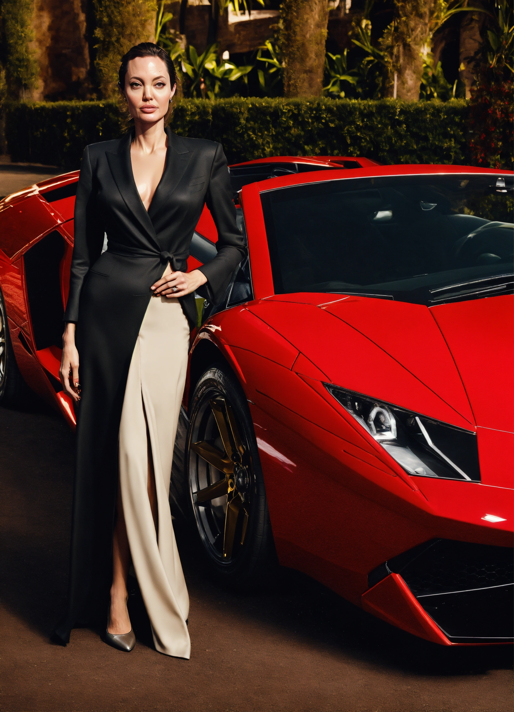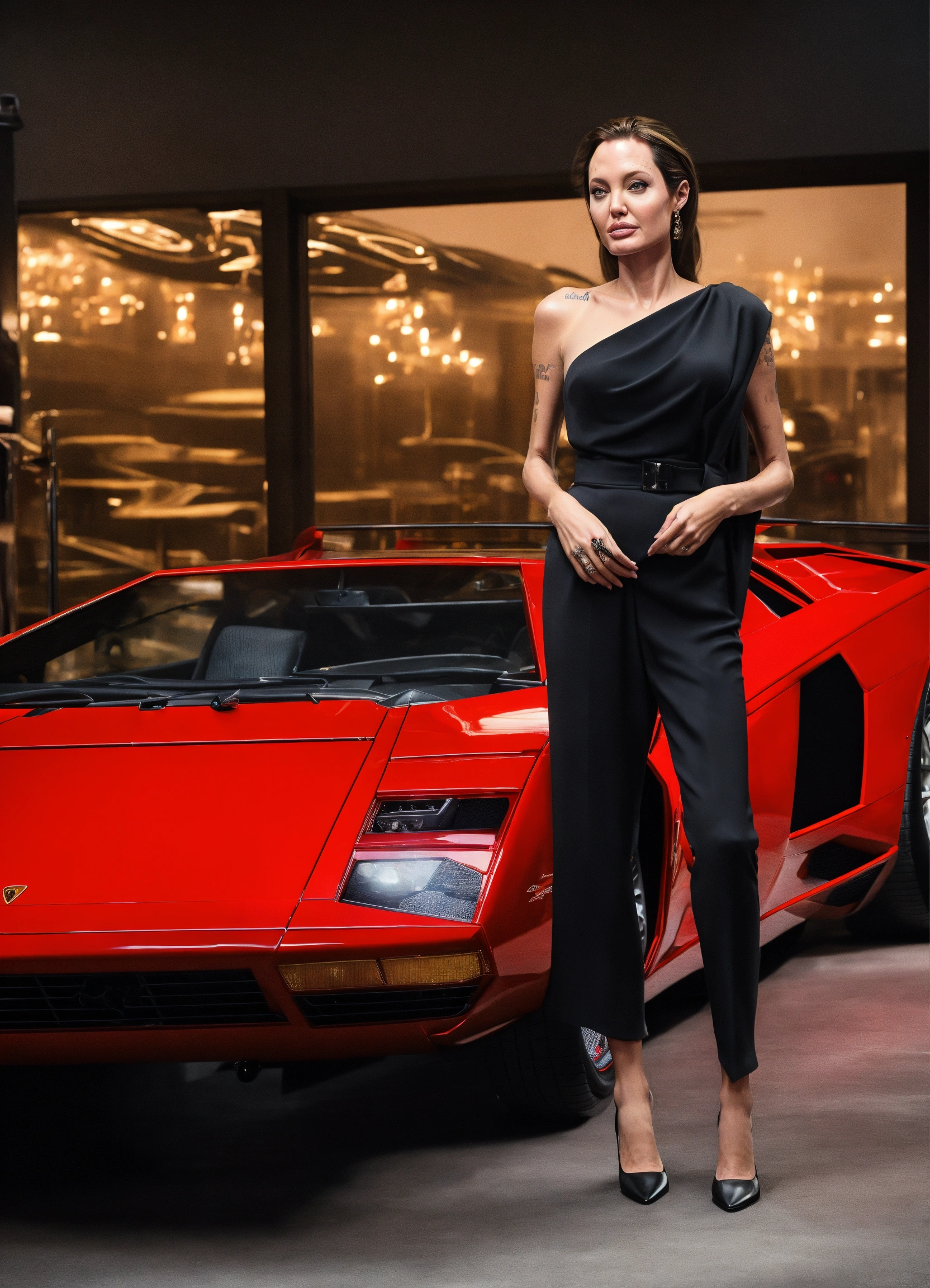 Angelina jolie standing next to a red lamborghini car