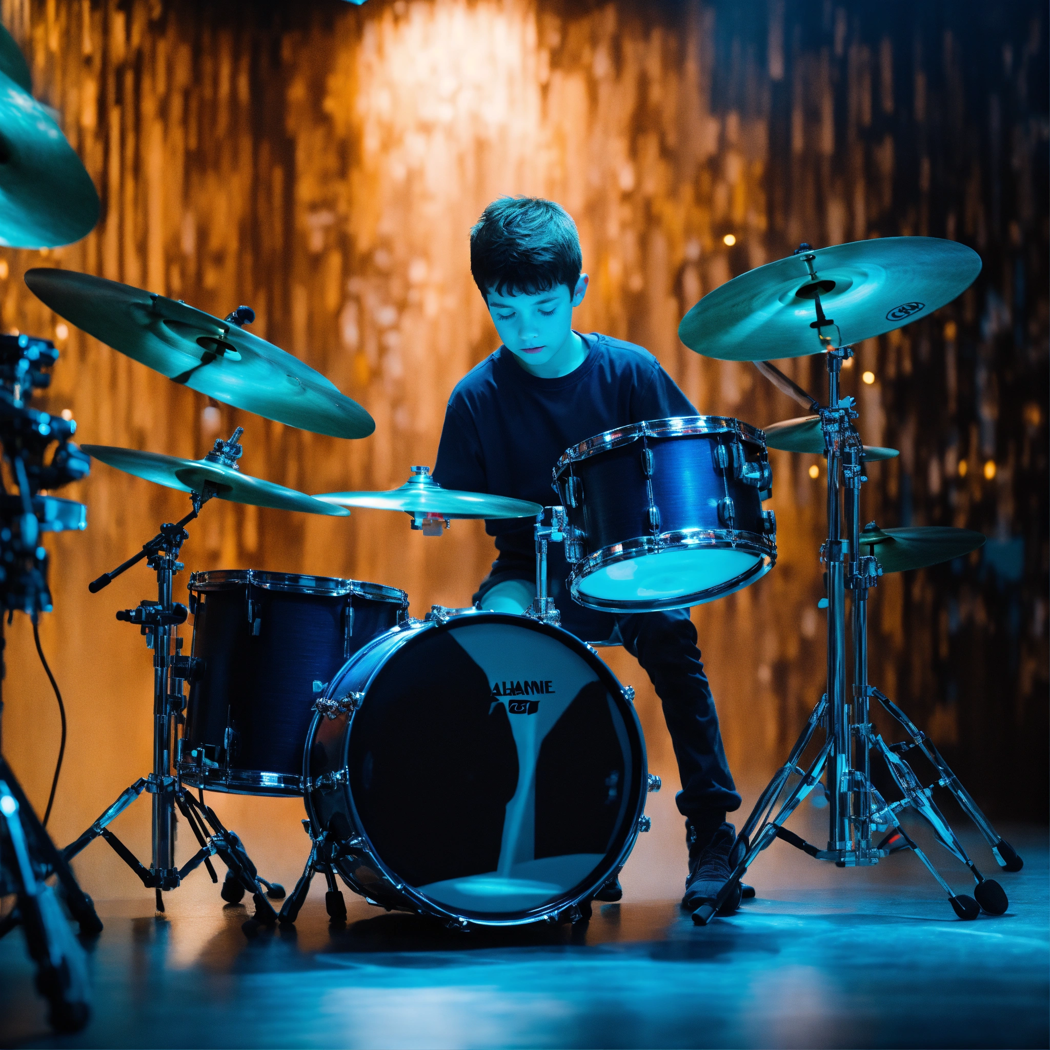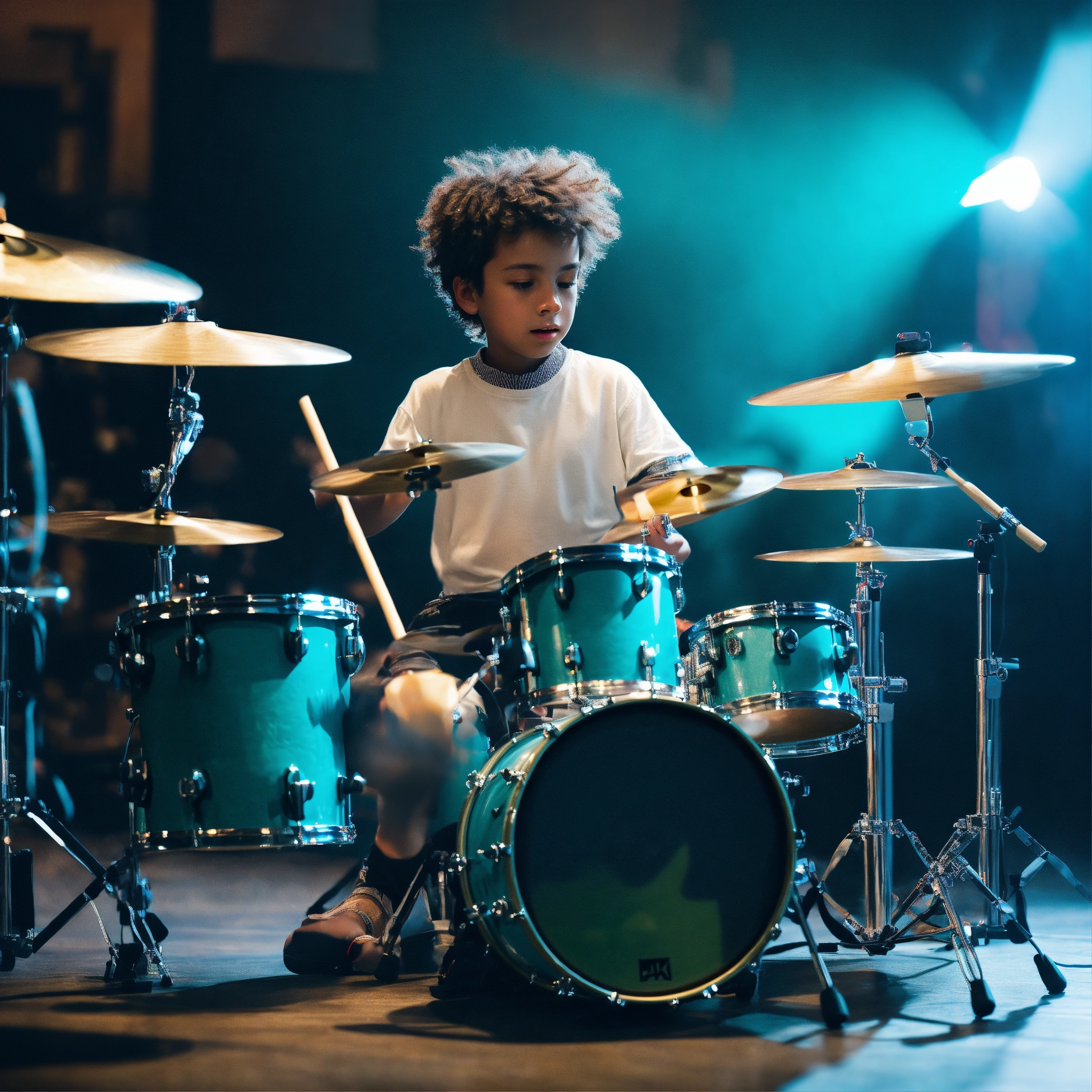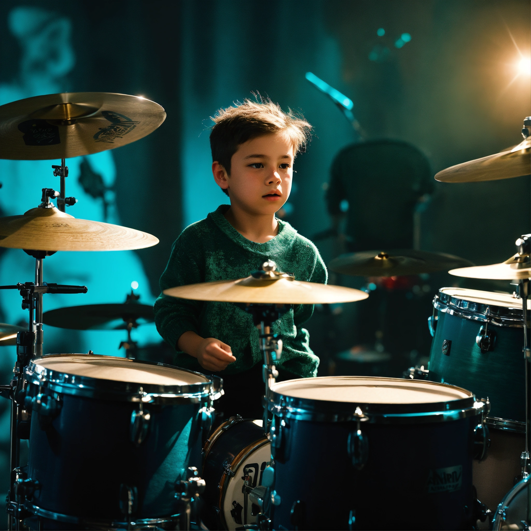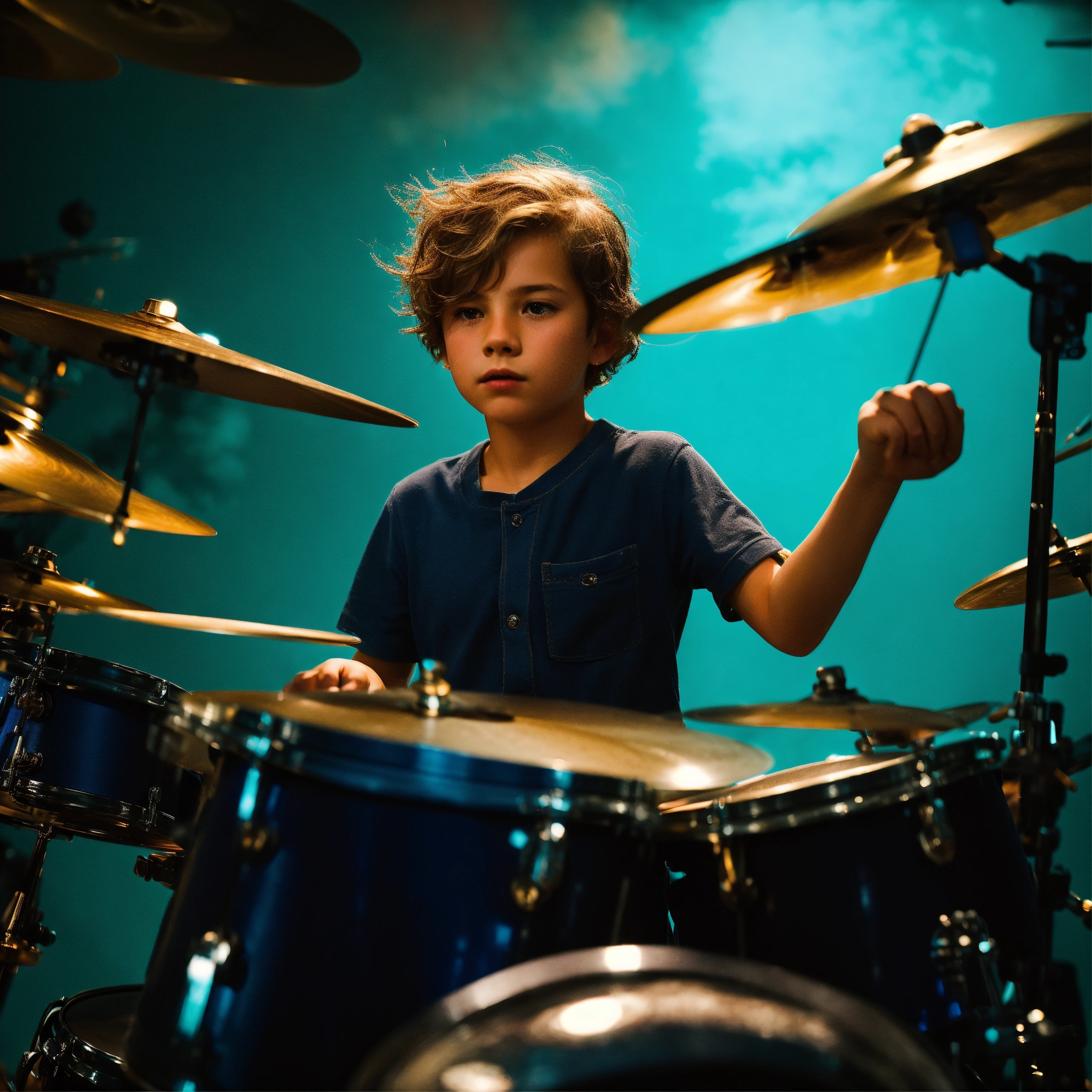 Photograph of a boy or girl playing drums, ai glitch, extremely detailed ambient lighting most beautiful image ever made hyper-realistic image of the_day sharp soft focus annie leibovitz dramatic light with turquoise background elegant 8k