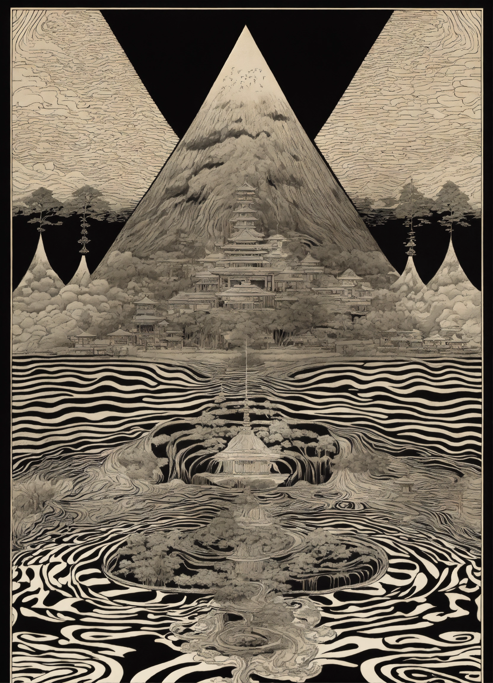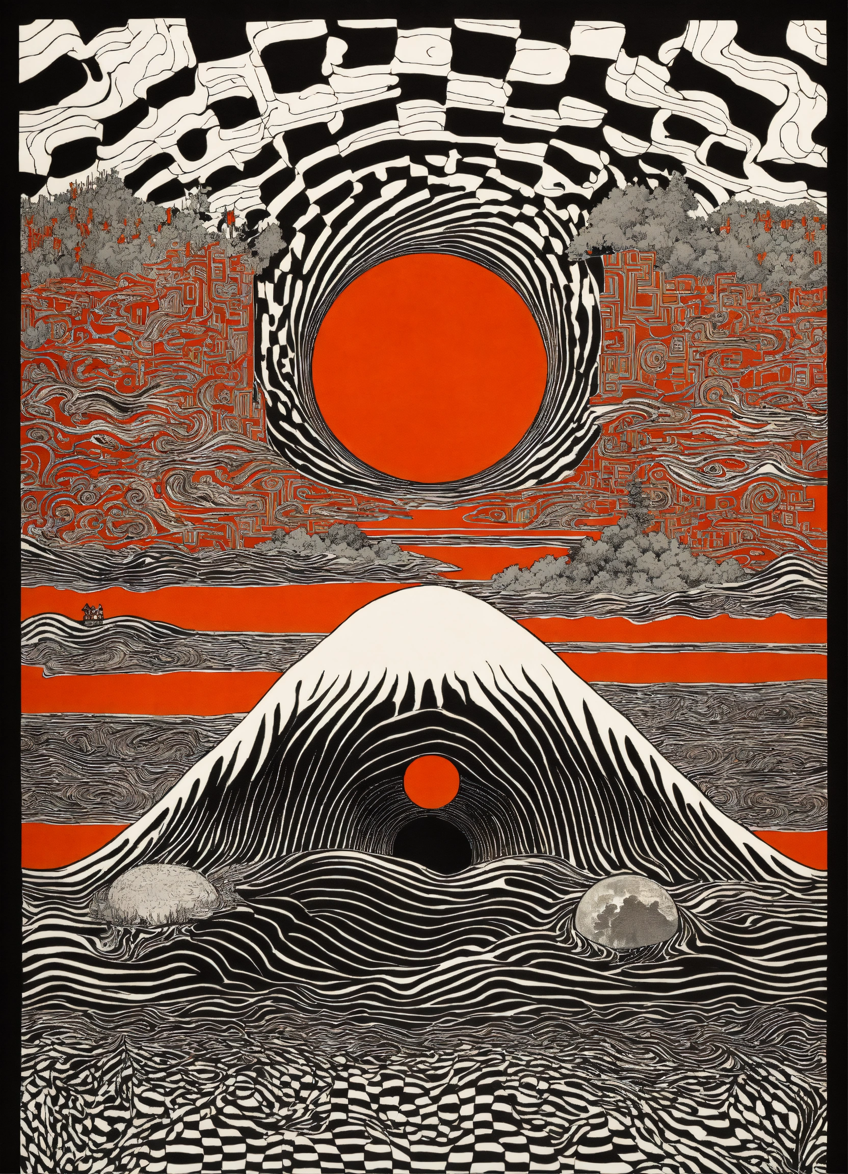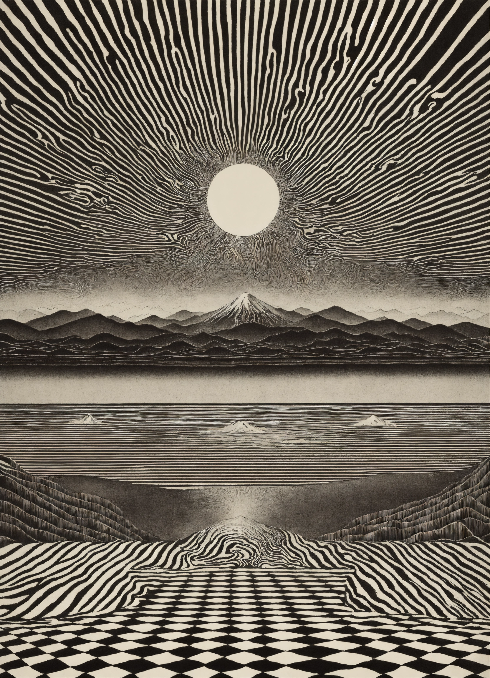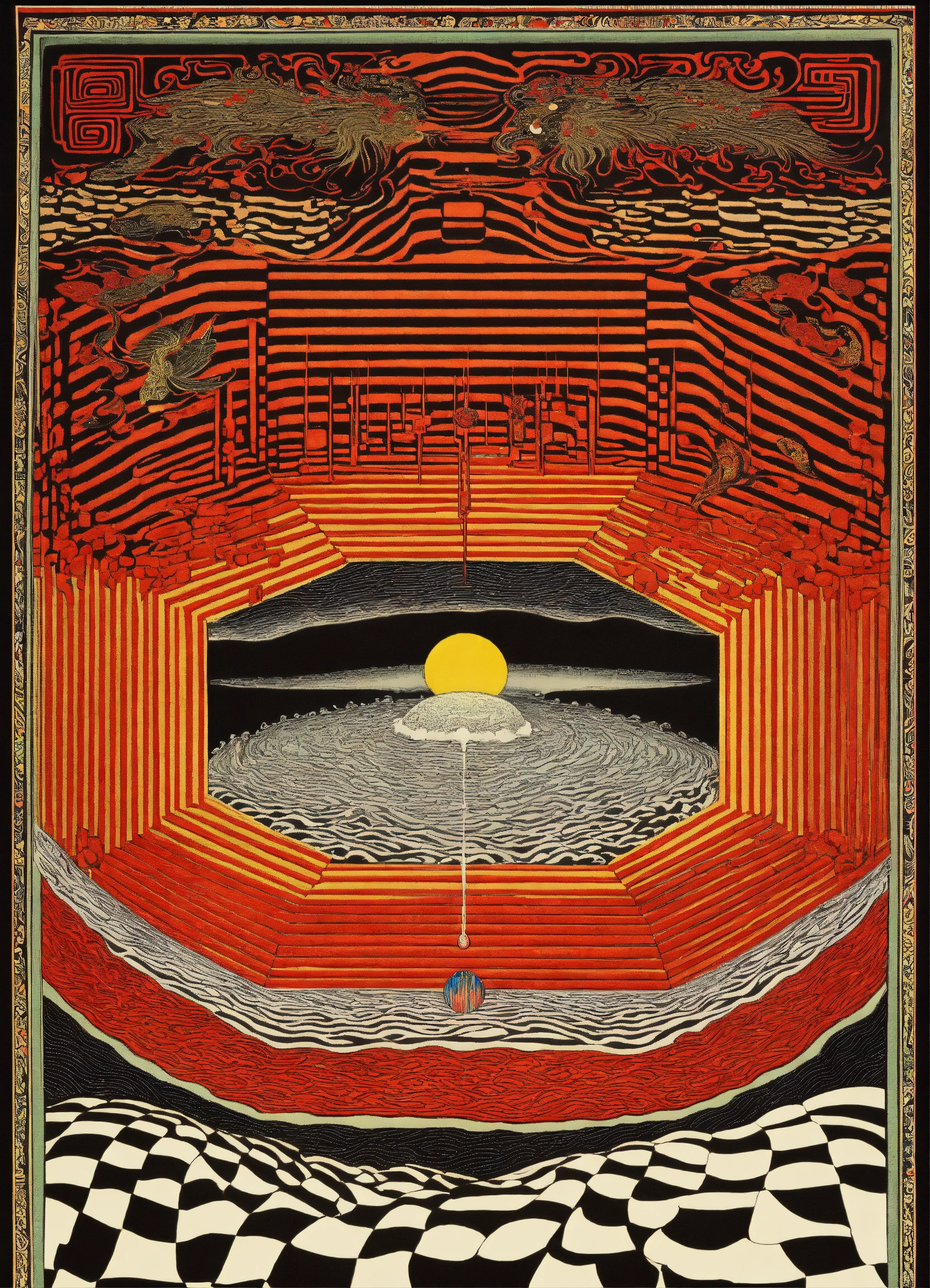 Japanese vintage poster, oriental, psychedelic realm, the four corners of the earth, wavy black and white checkerboard patterns dripping, by alex grey