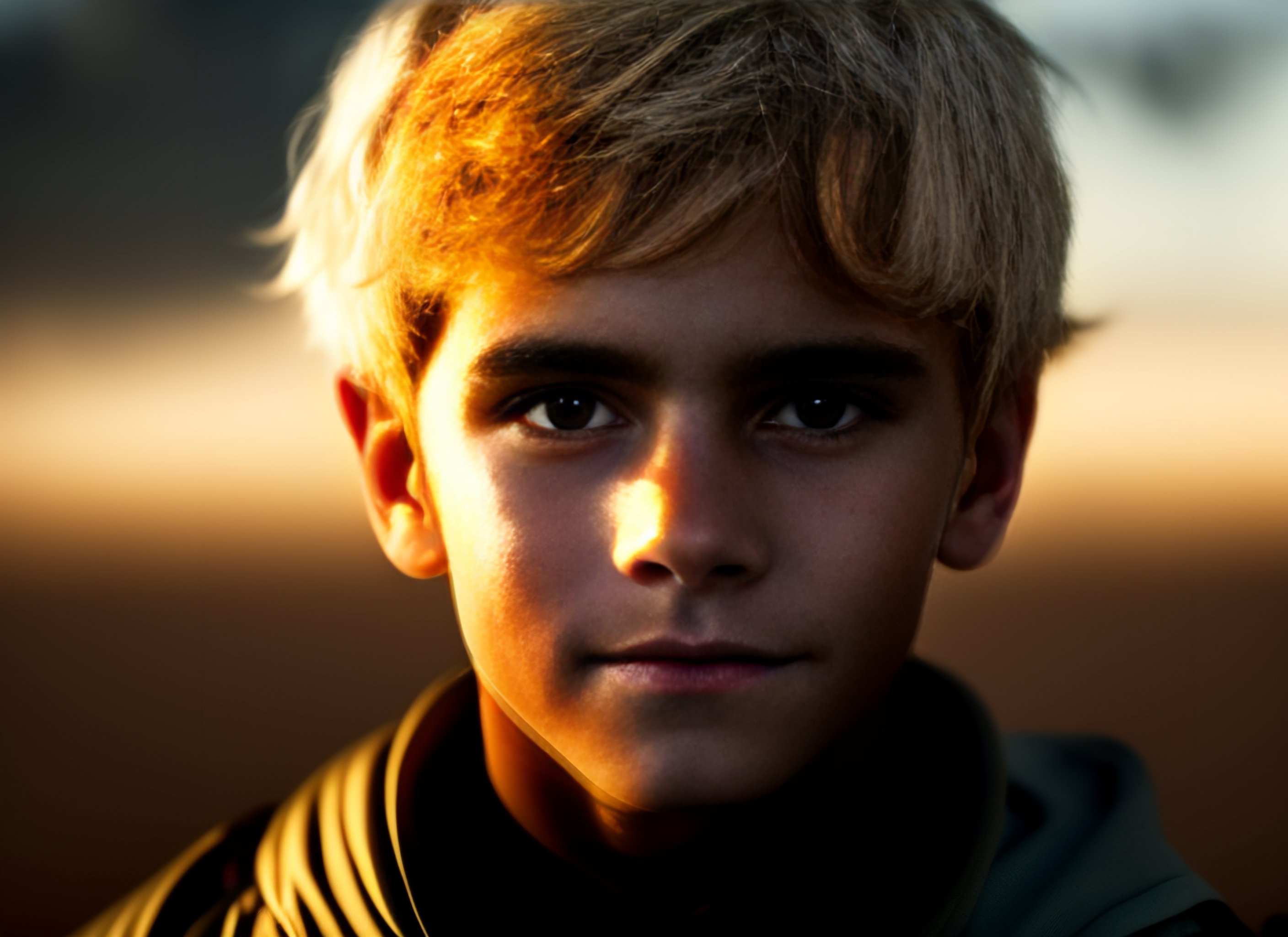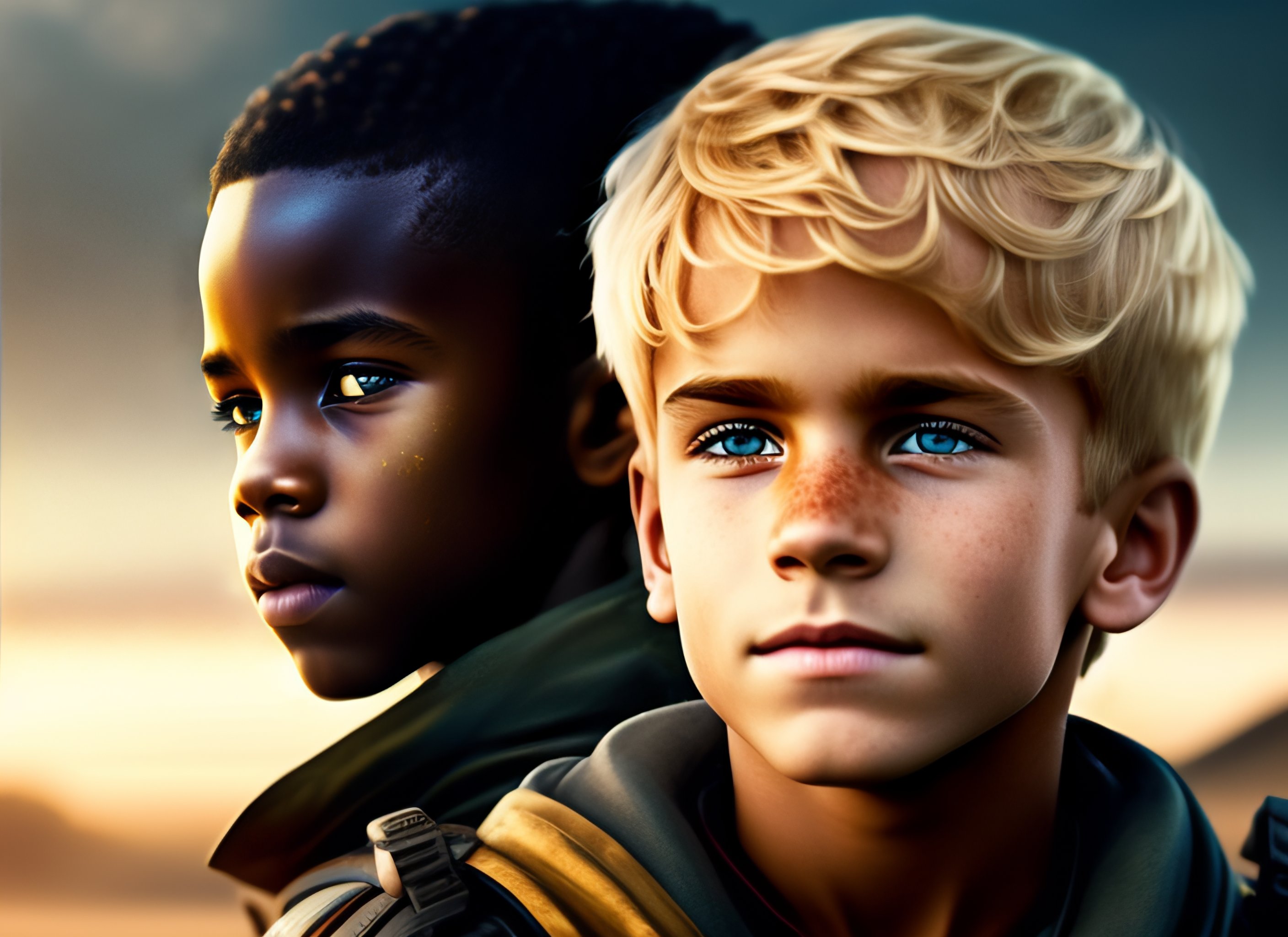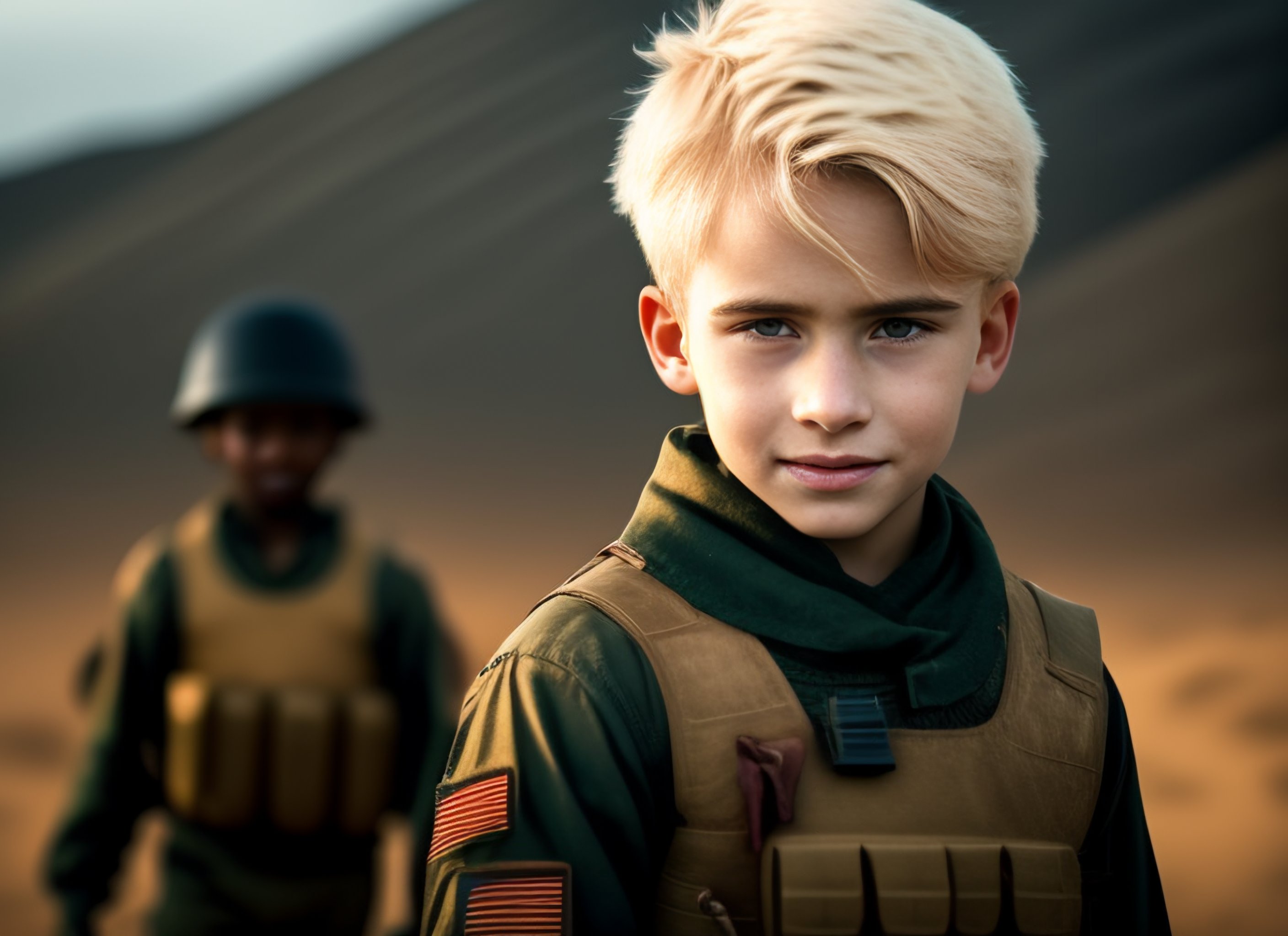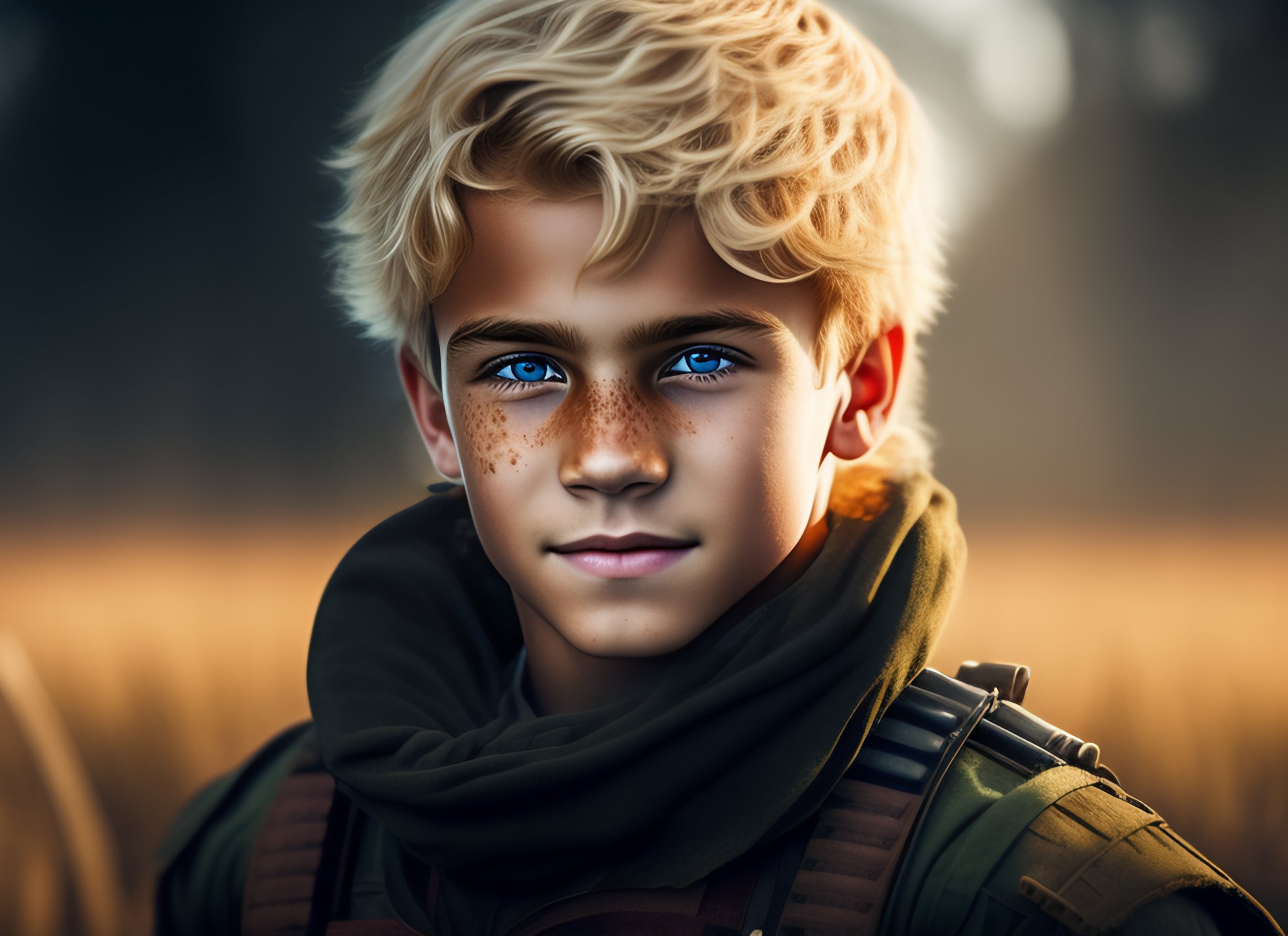 Boy with blond hair, golden eyes, dark skin and a creepy smile and in the background a battlefield full of wounded