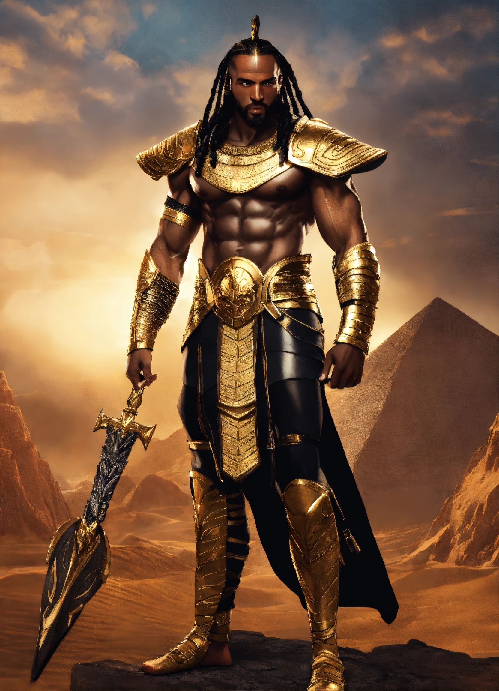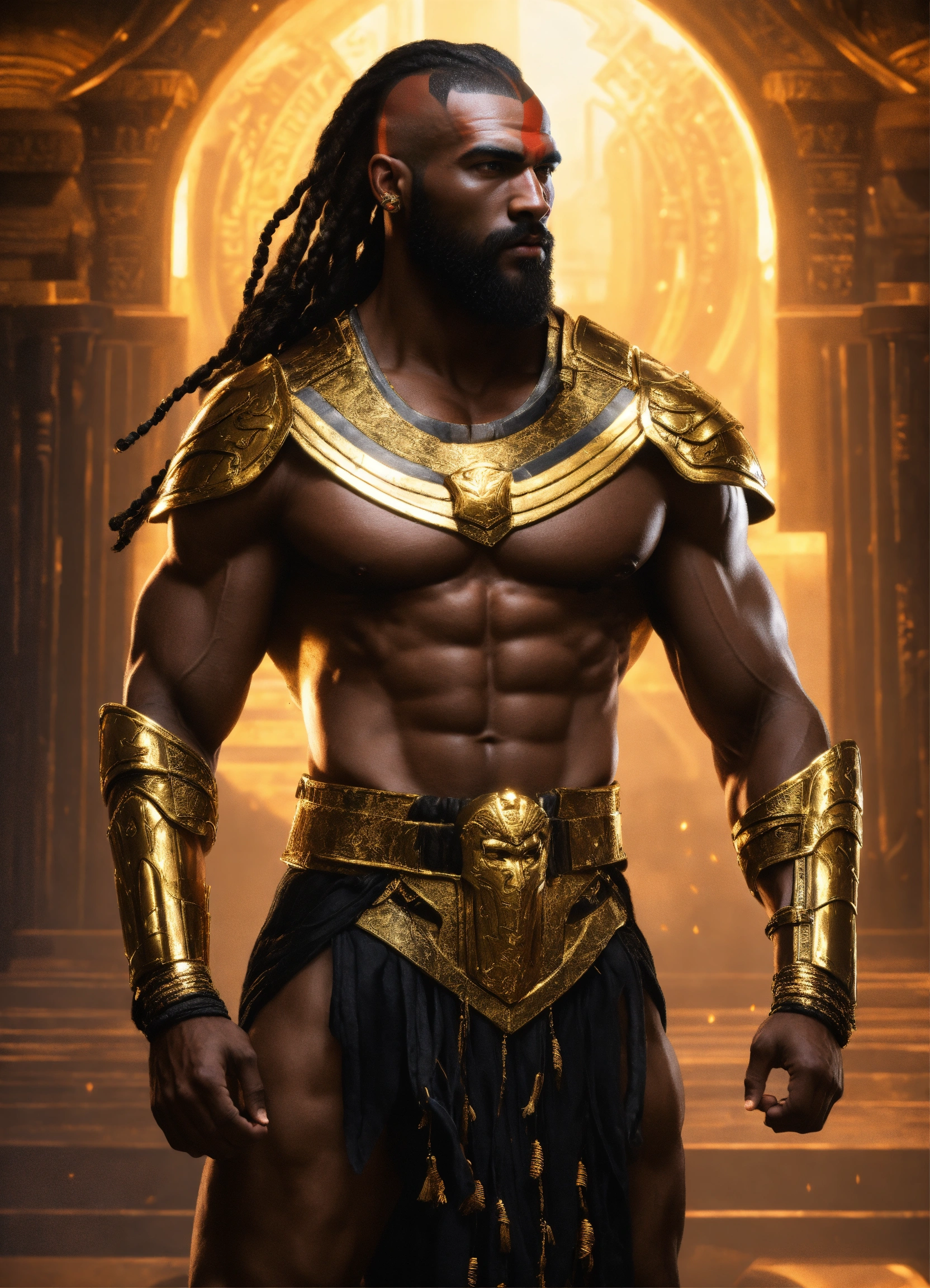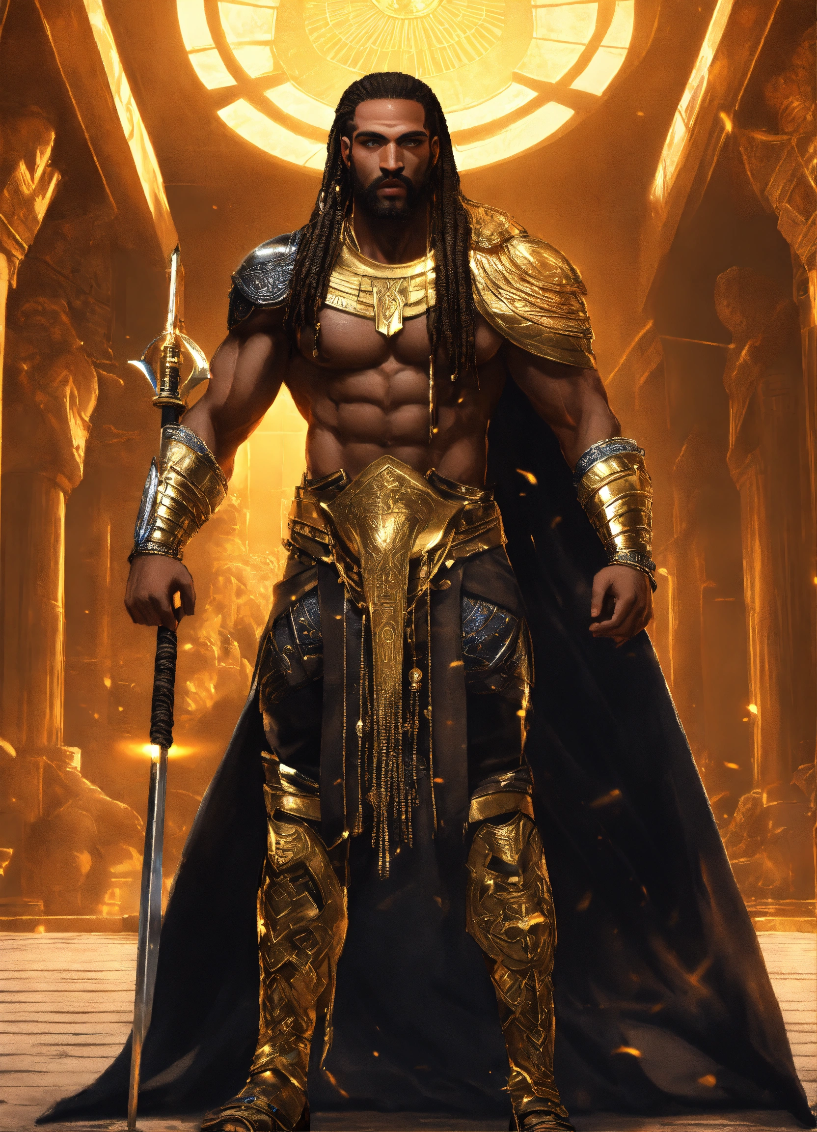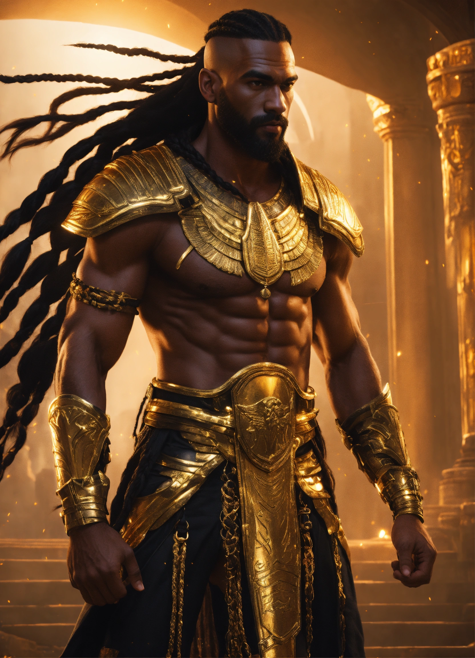 Full body, nubian god of war, handsome muscular black egyptian futuristic fantasy warrior man with gold and black armor, manly man, long braided hair