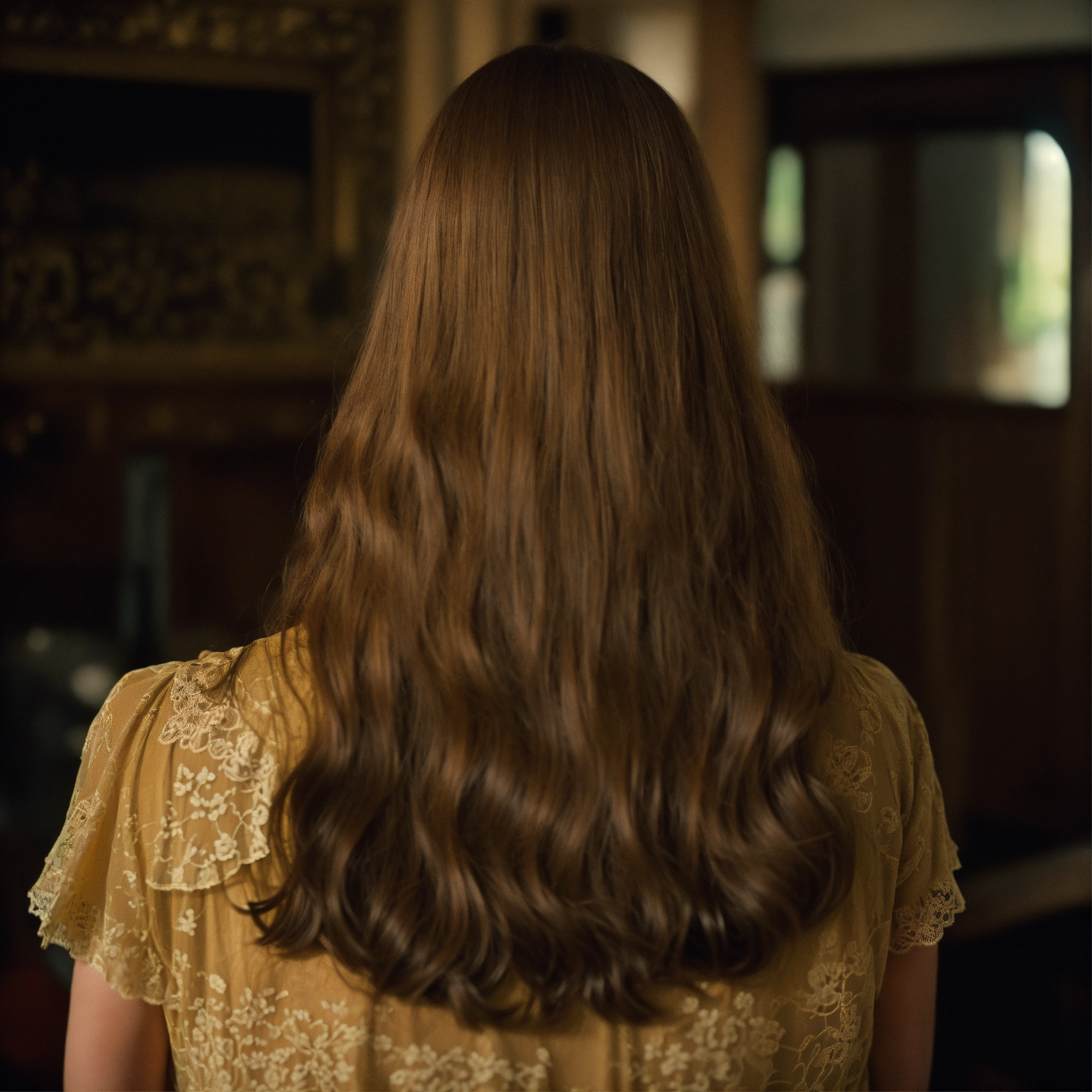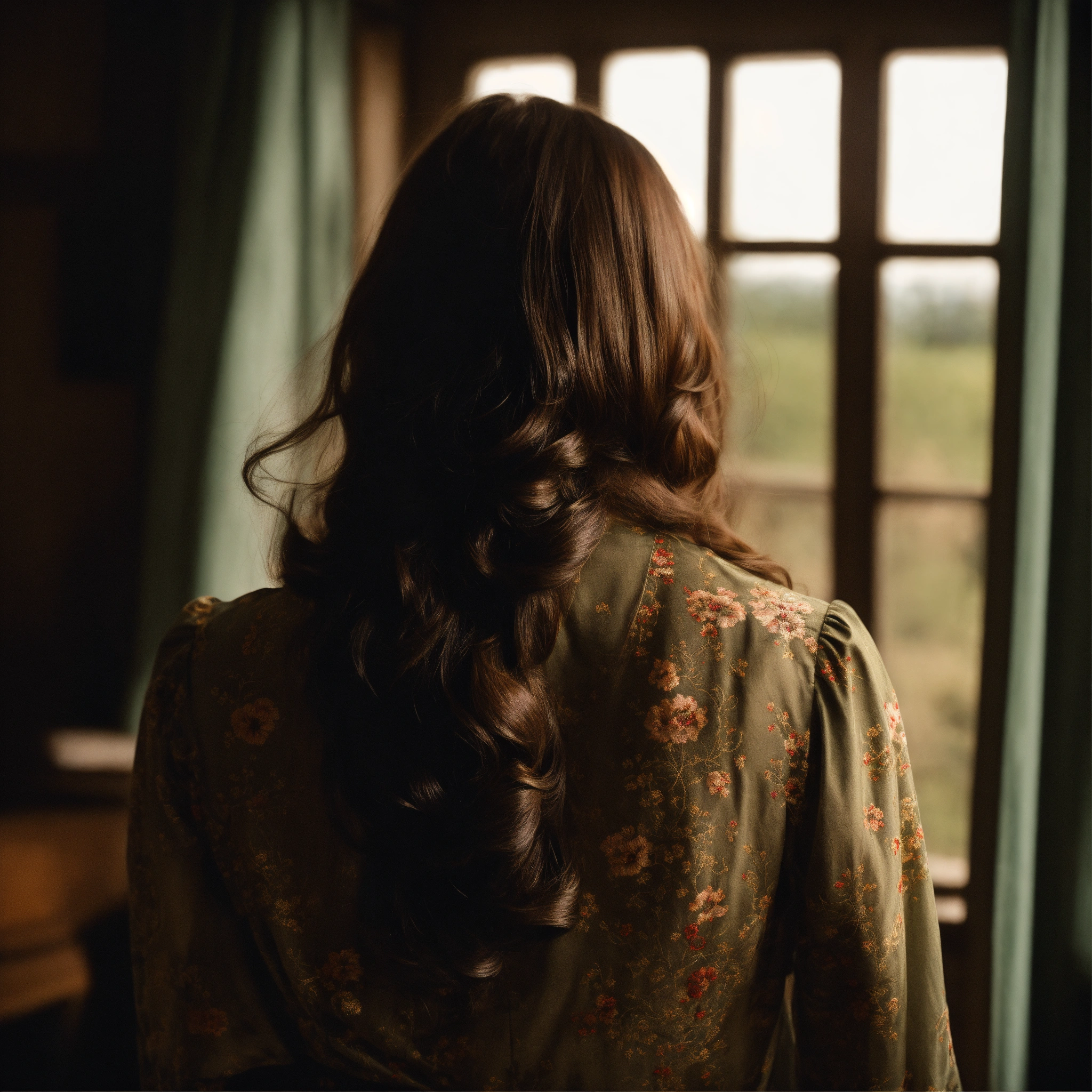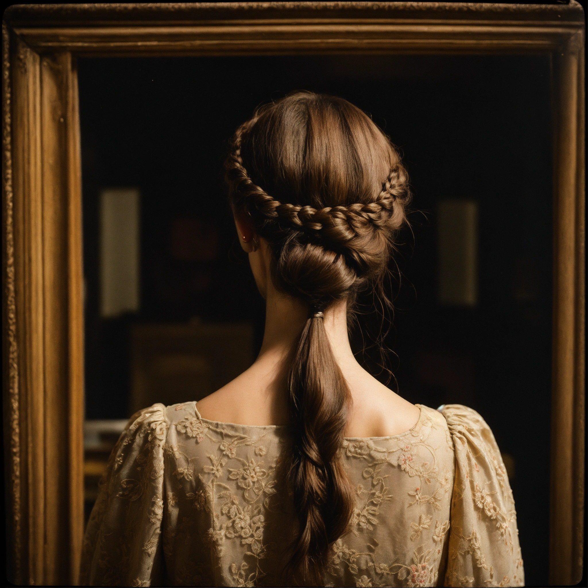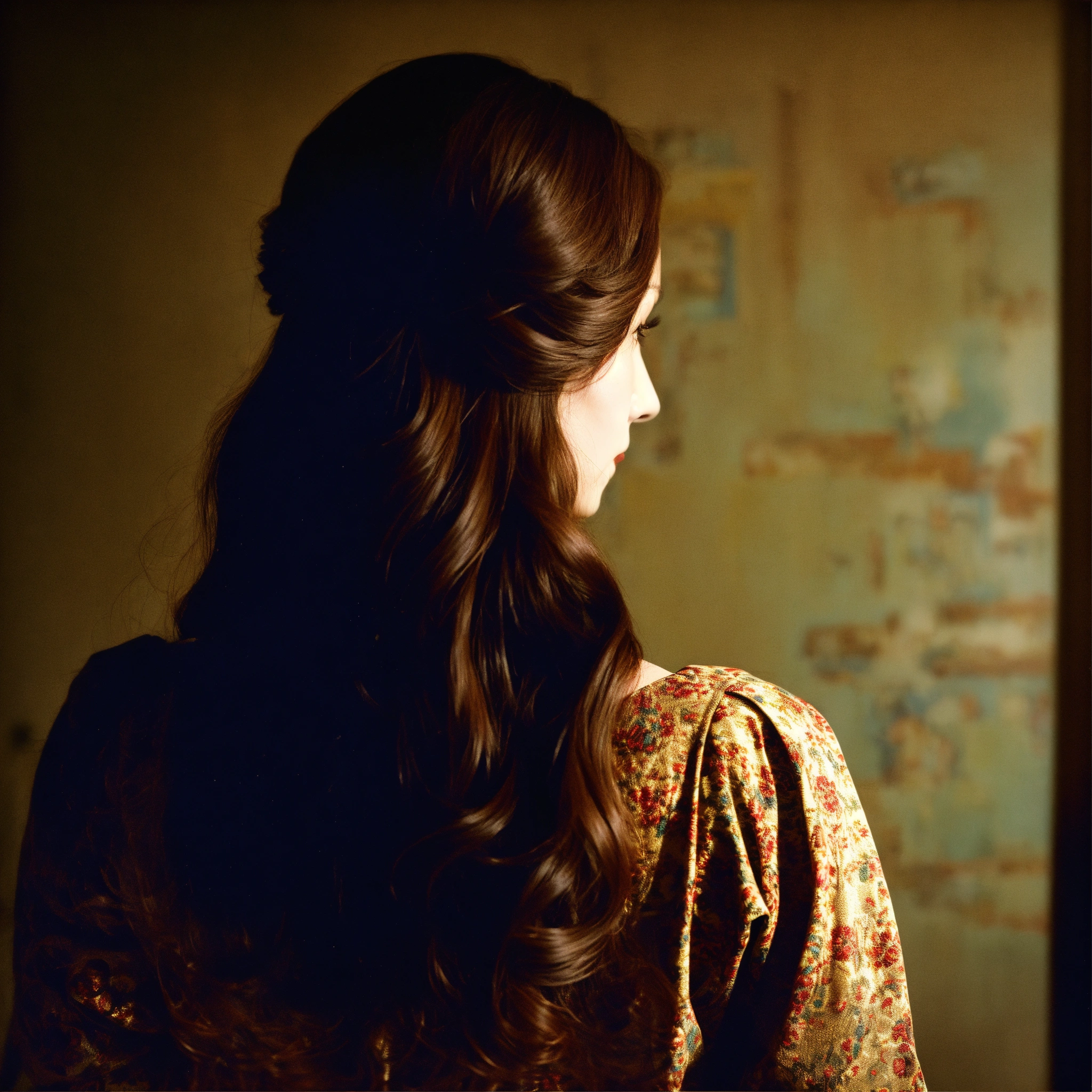 A low key vintage photograph of a woman with long brown hair, rear view of the back of head, looking into a vintage mirrir