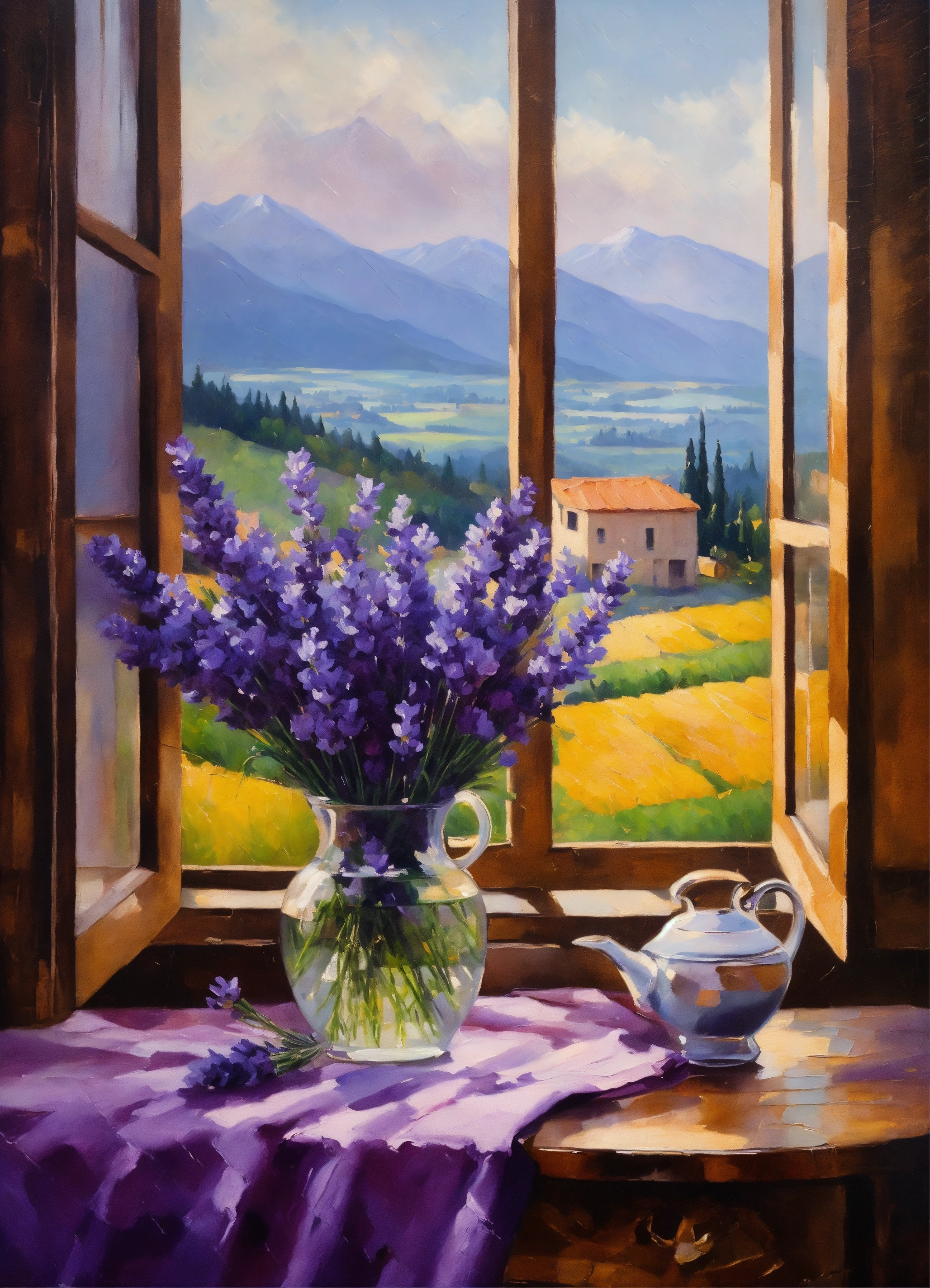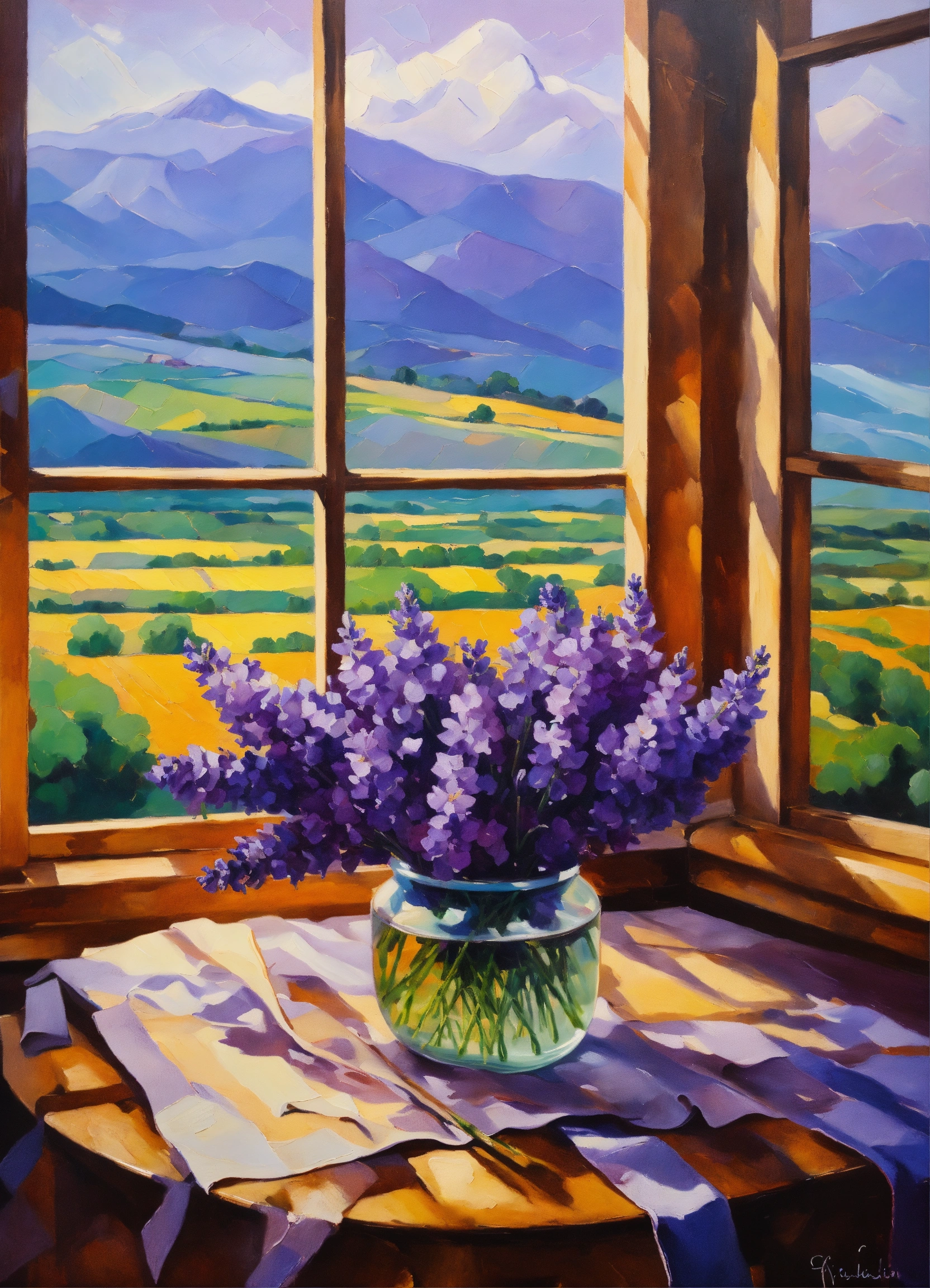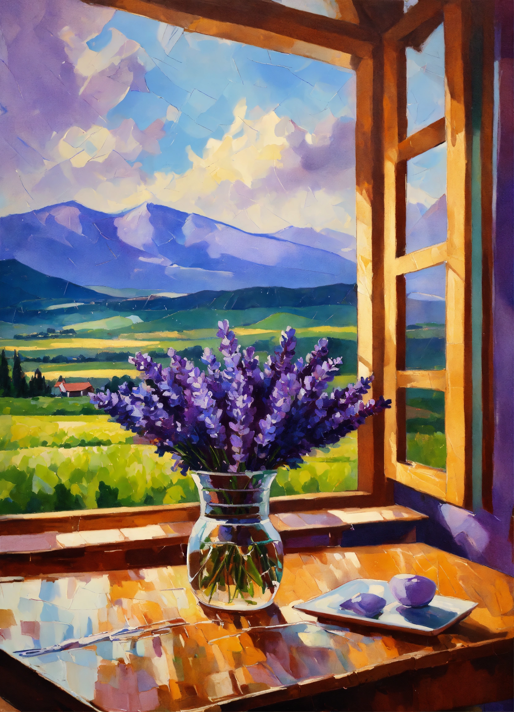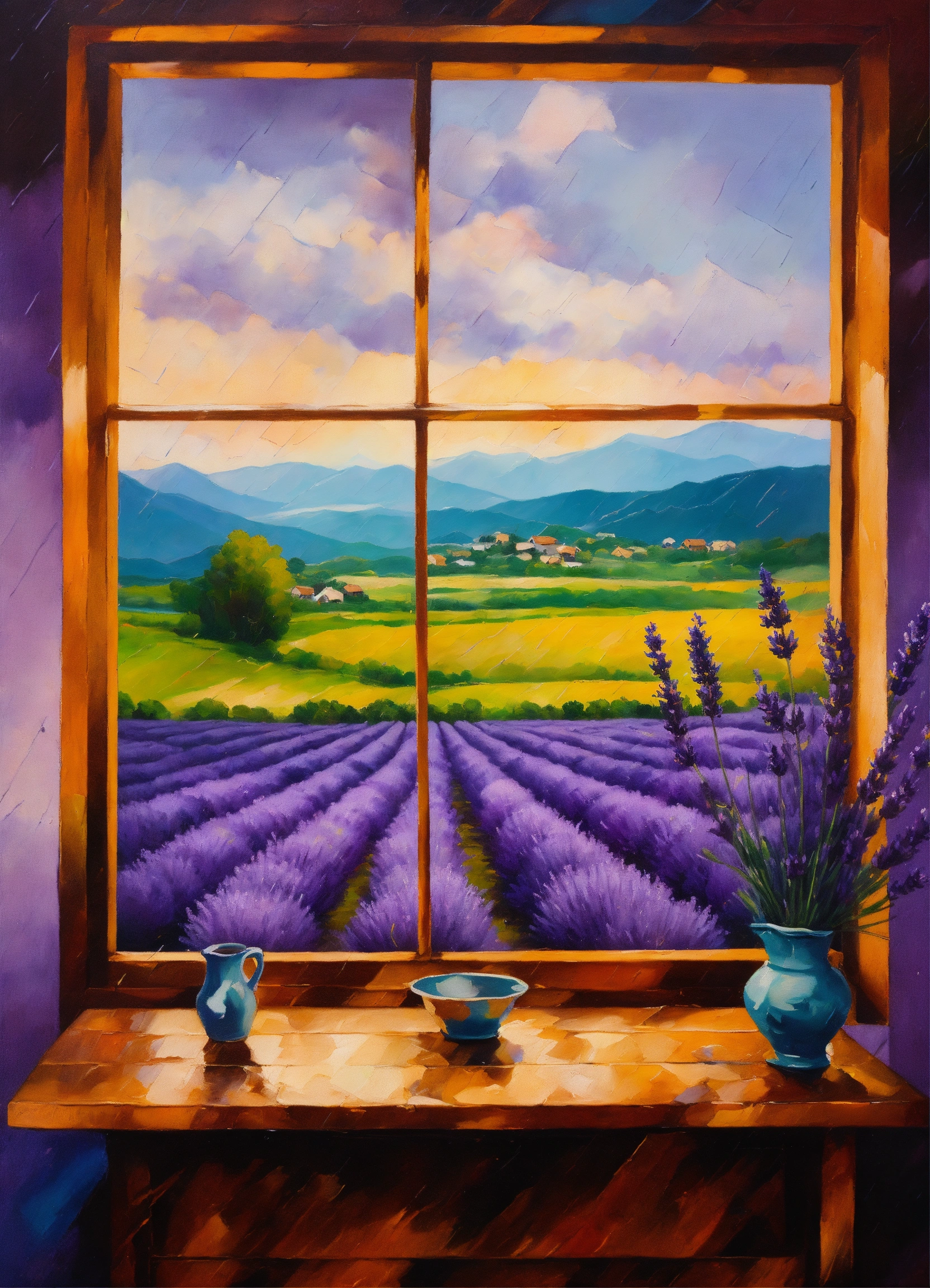 Modern art oil painting bouquet of lavender sitting on a table by a window, fields of lavender outside, mountains and trees in the distance, rainy day