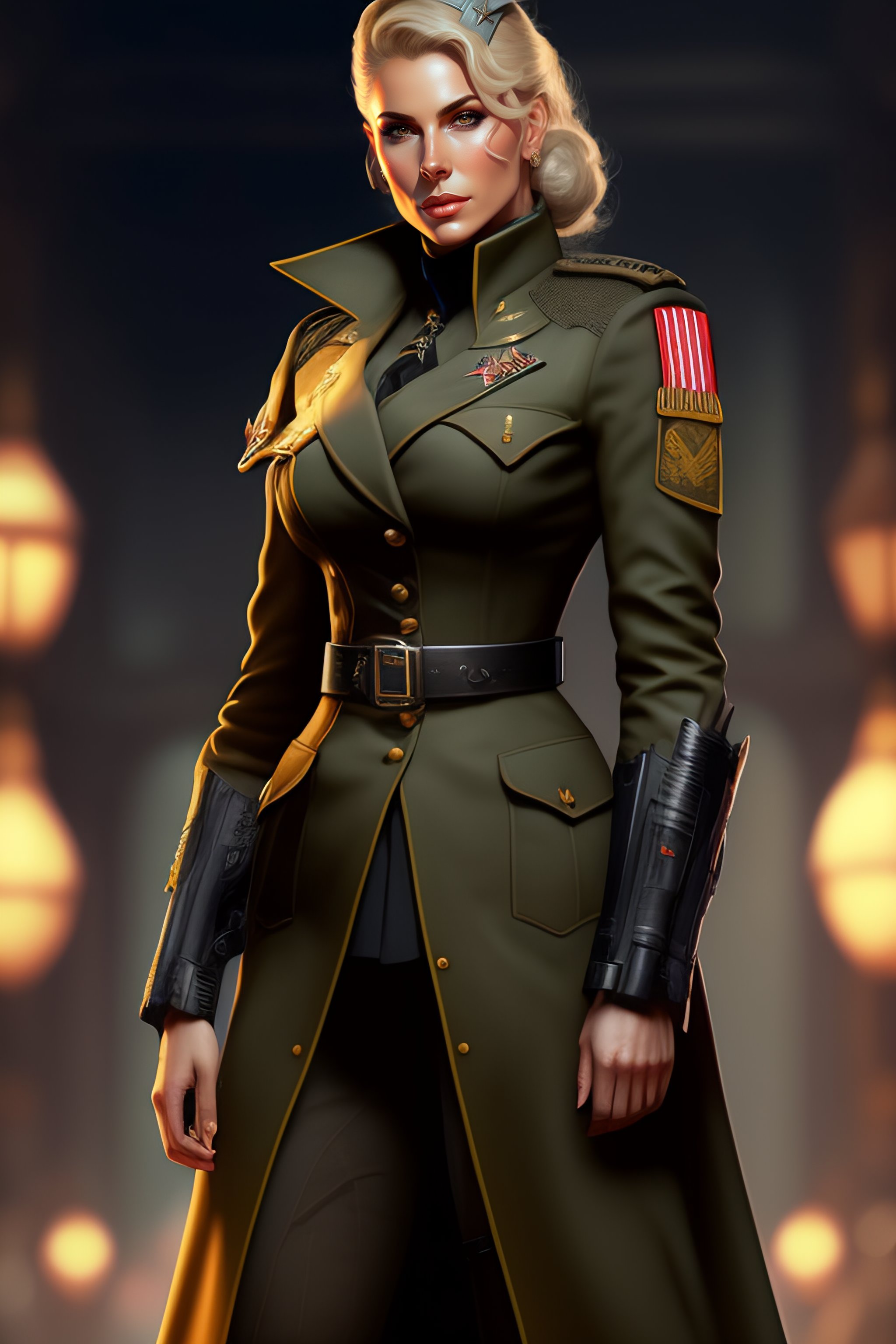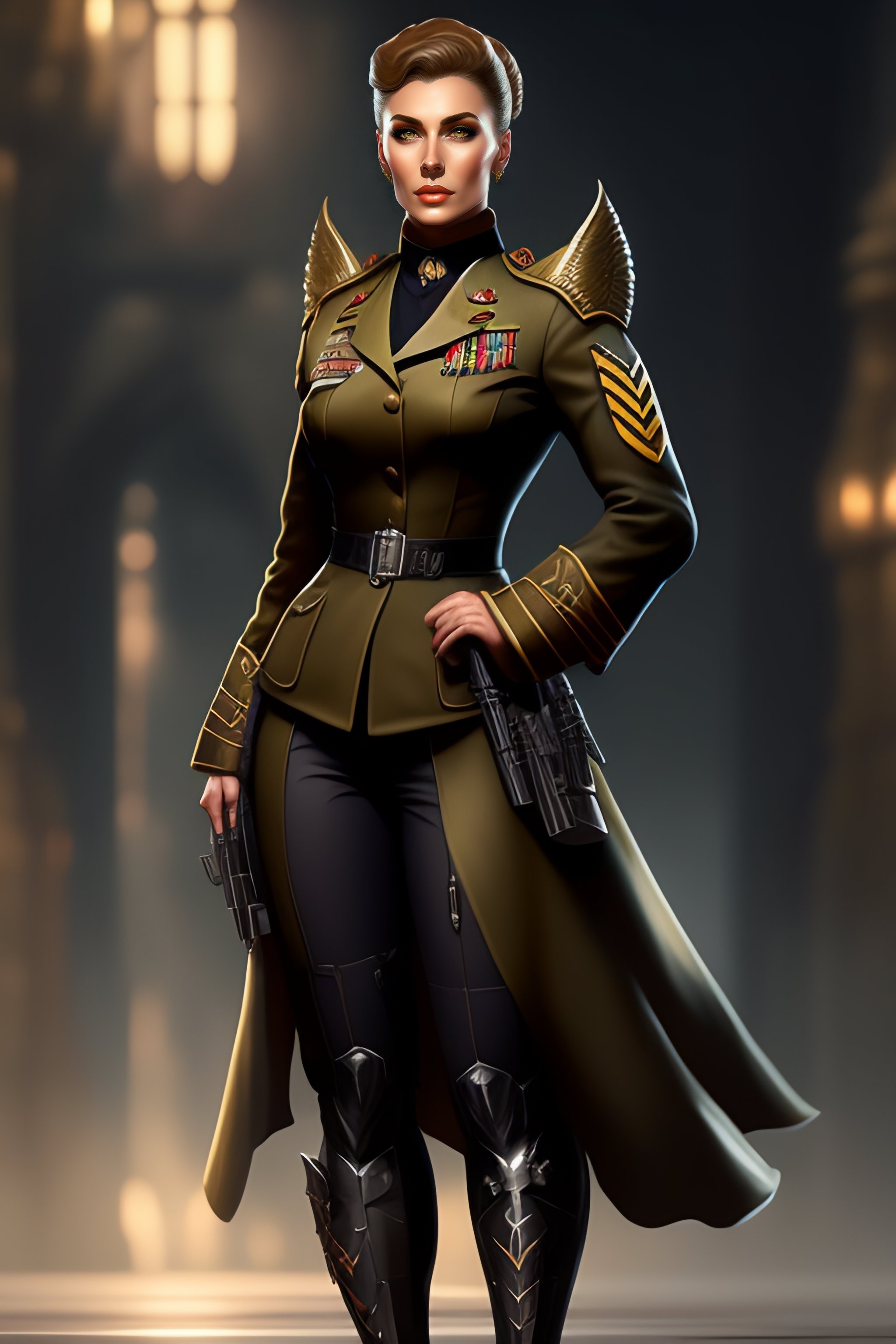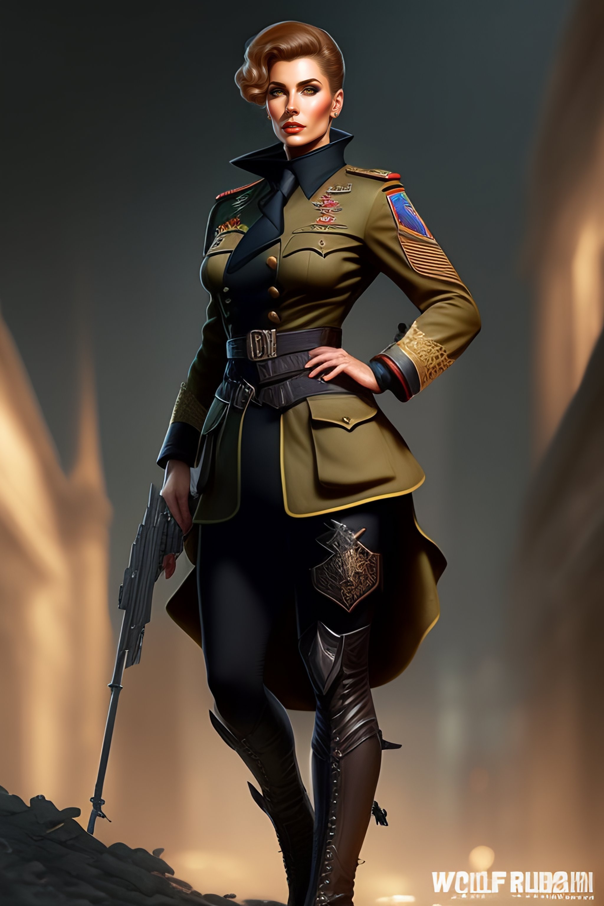Wolfenstein woman soldier gothic necromancer, military german wwii officer tight-fitting clothing, full body shot, d&d, fantasy, intricate, elegant, highly detailed, digital painting, artstation, concept art, matte, sharp focus, illustration, art by artgerm and greg rutkowski and alphonse mucha
