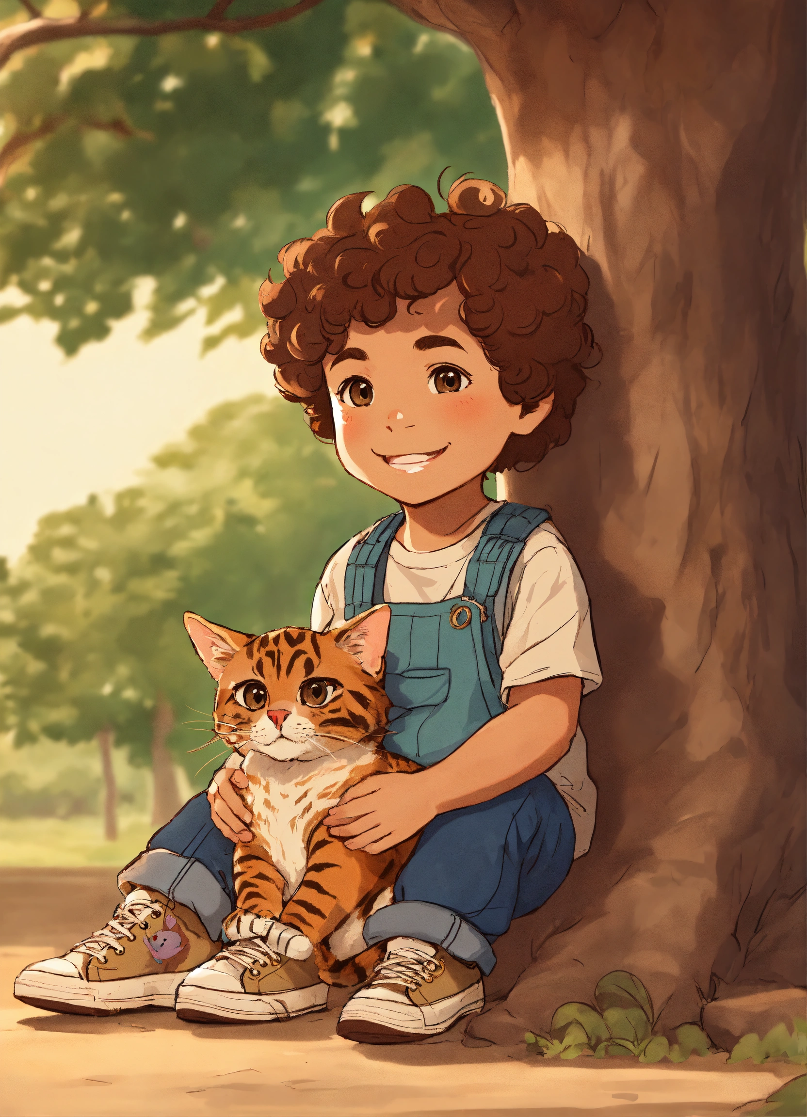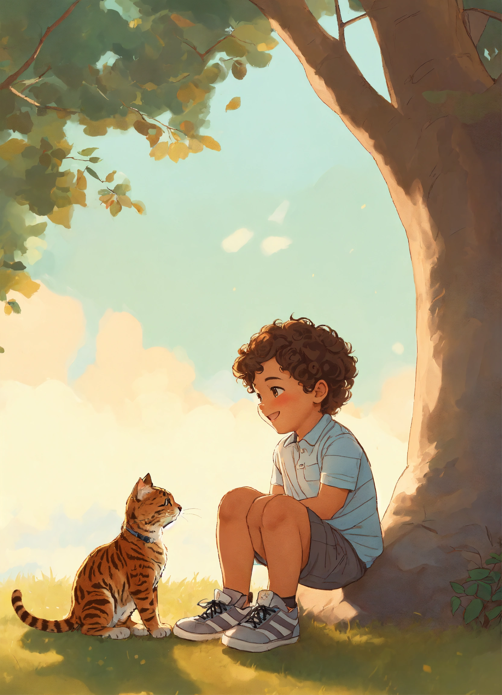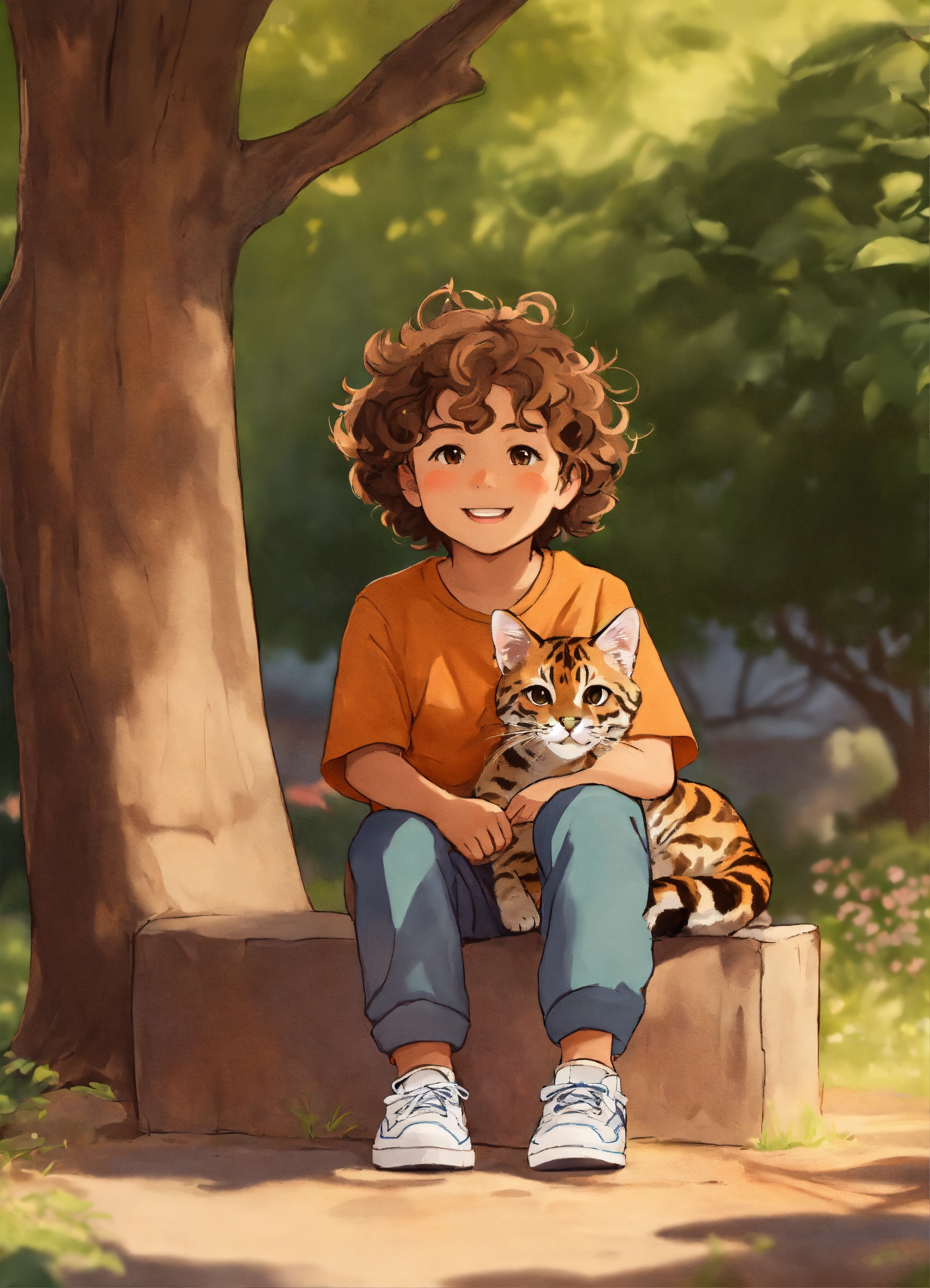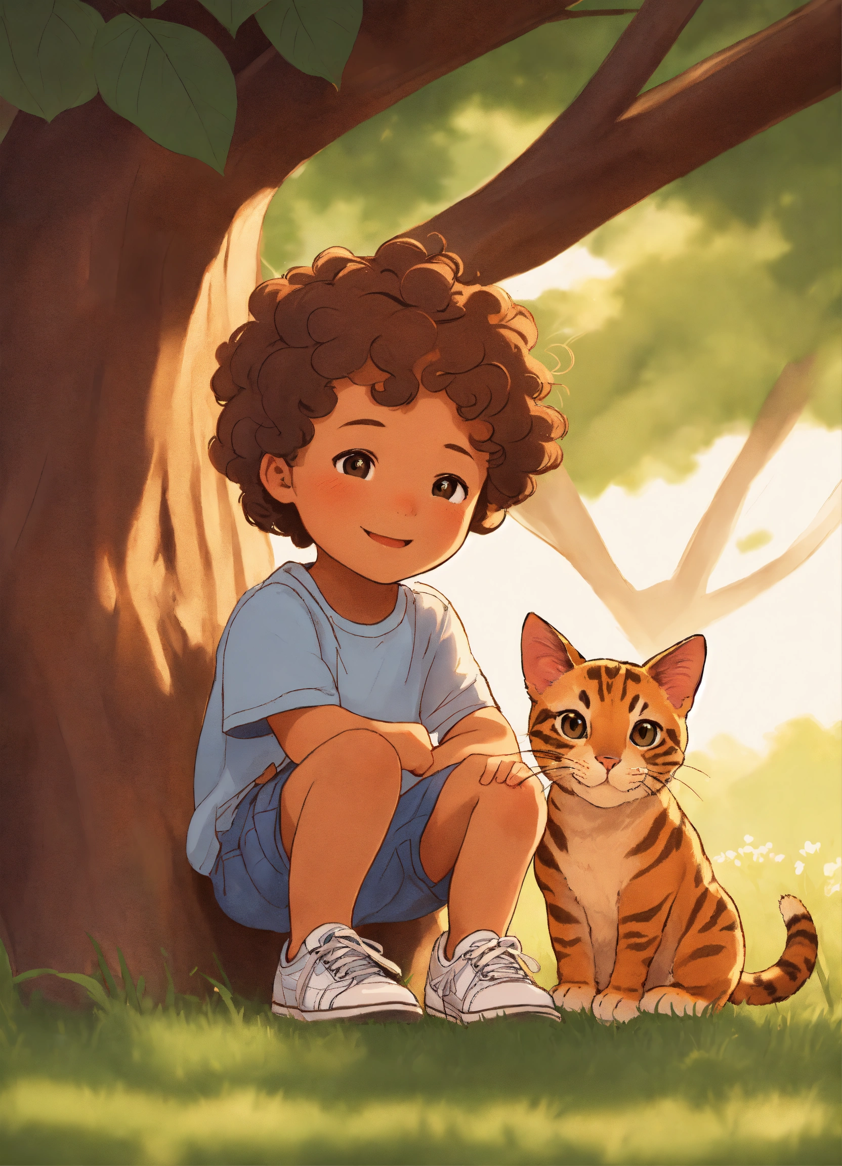 A happy little toddler boy with brown curly hair and light brown skin sitting outside under a tree with his pet bengal cat, wearing sneakers, simple art inspired by studio ghibli's visual style
