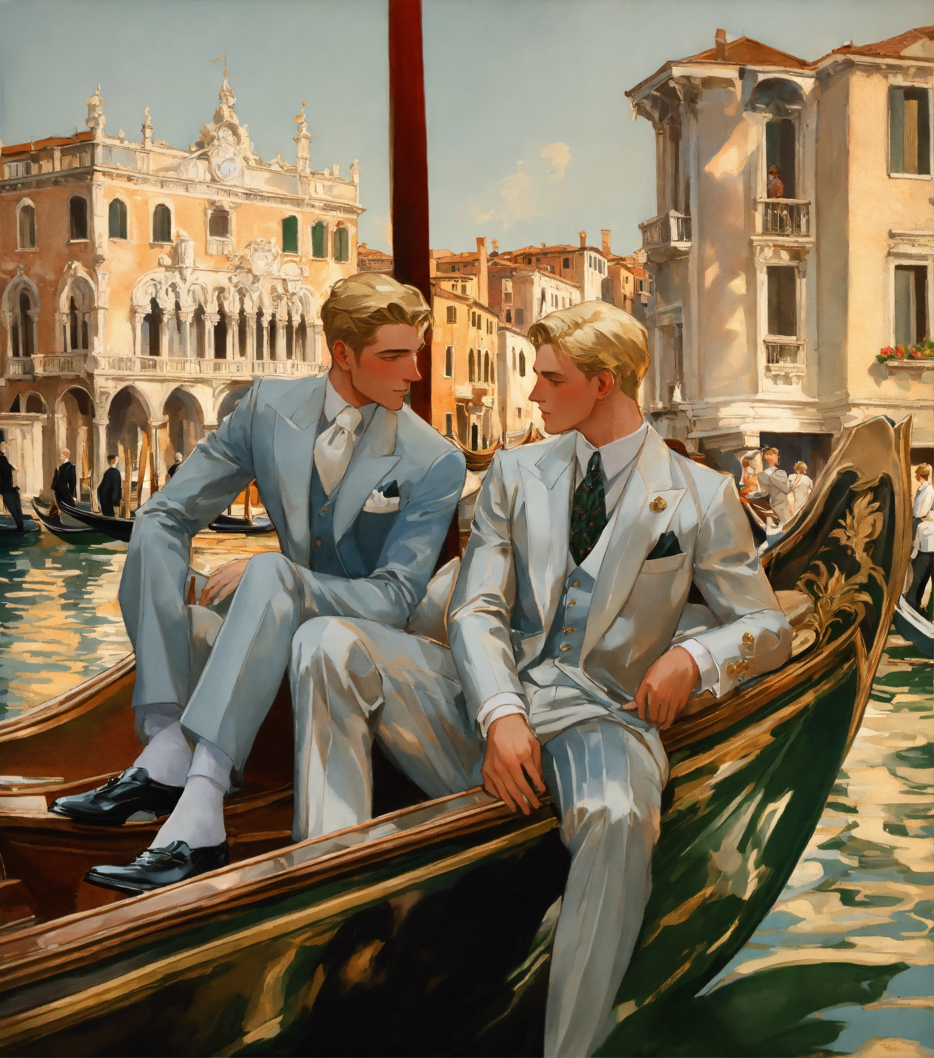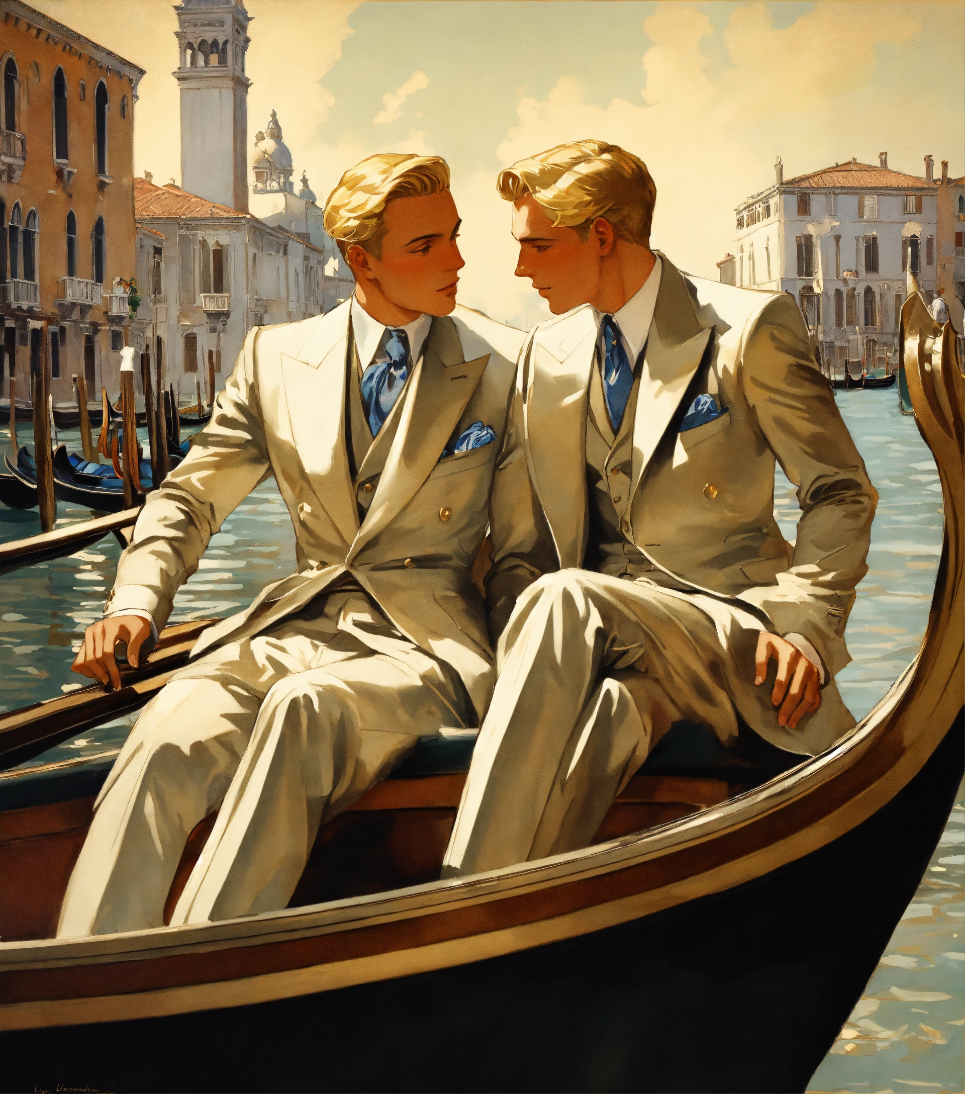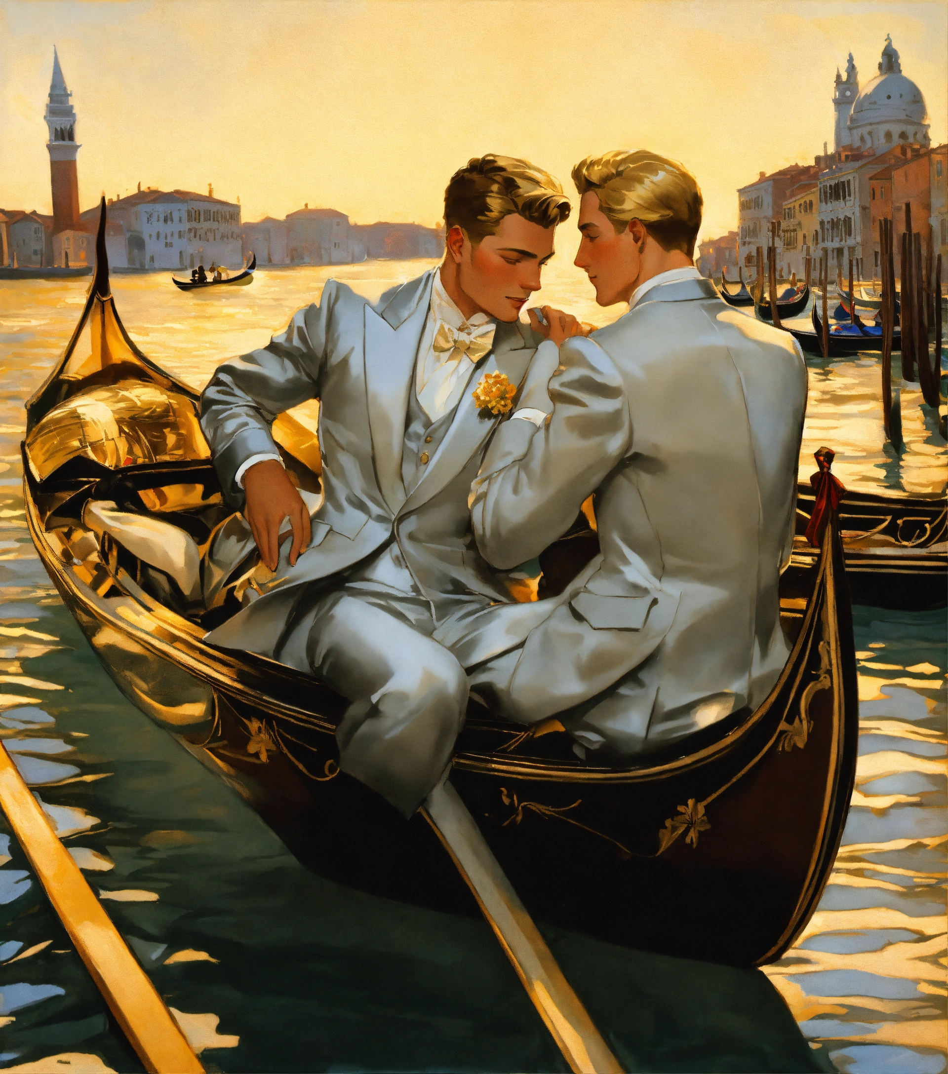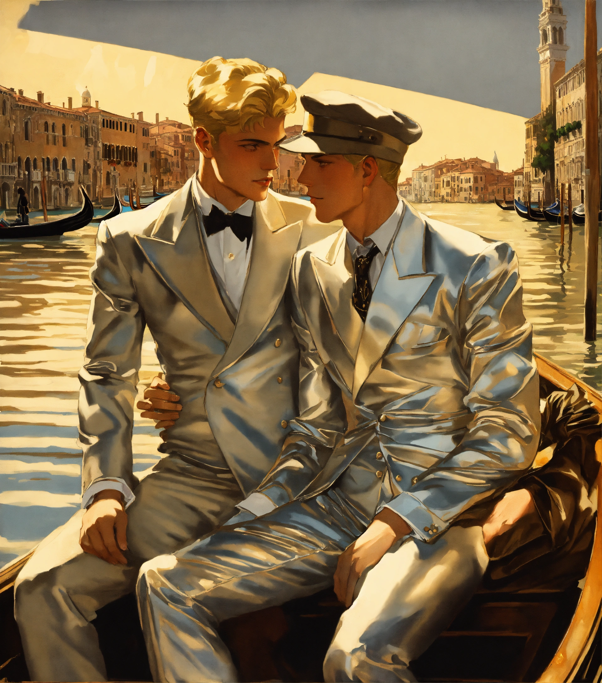 Two blonde gentlemen in silver suit embracing on a gondola in venice