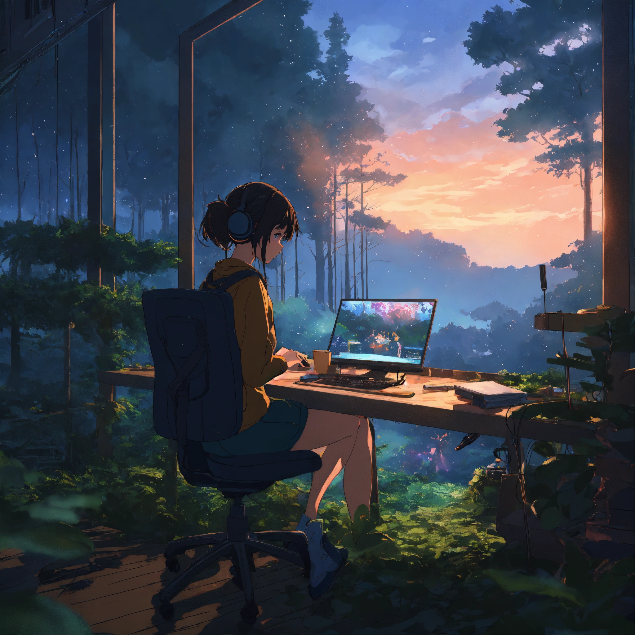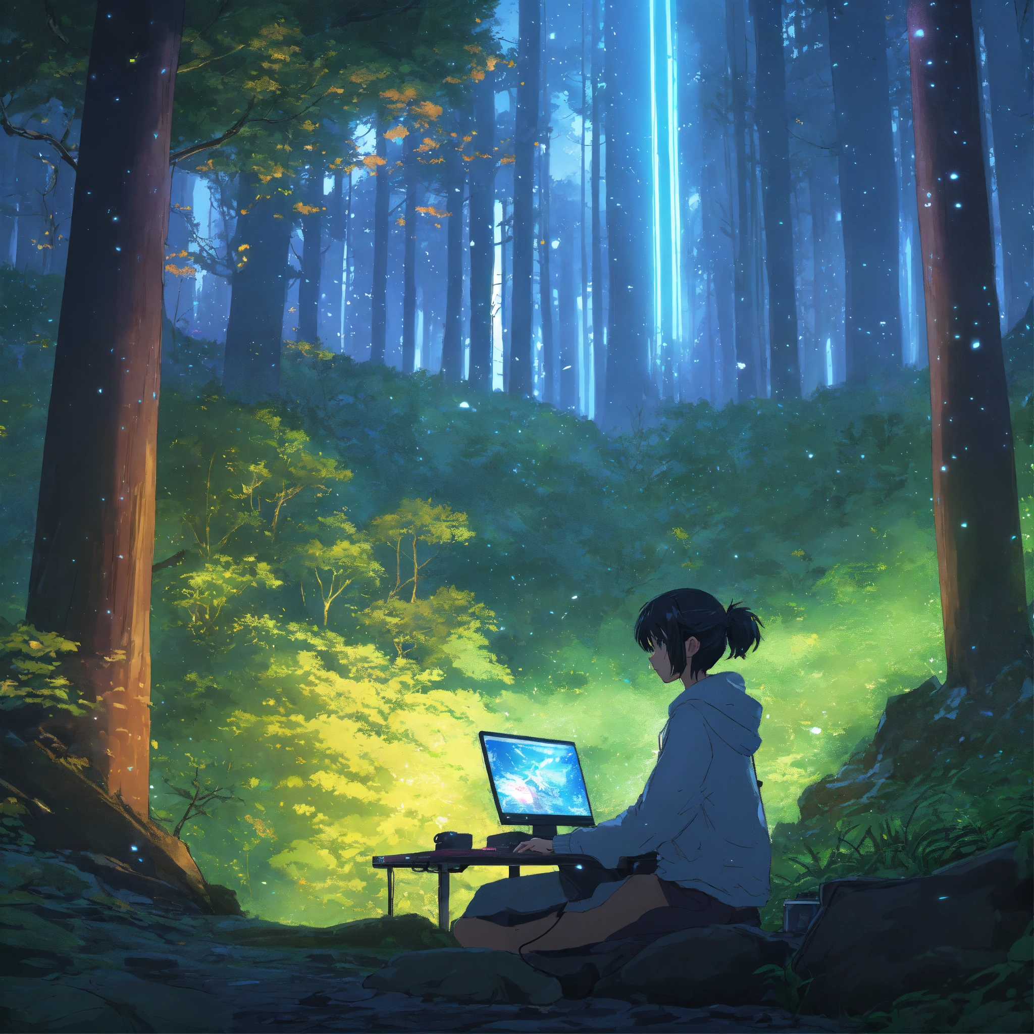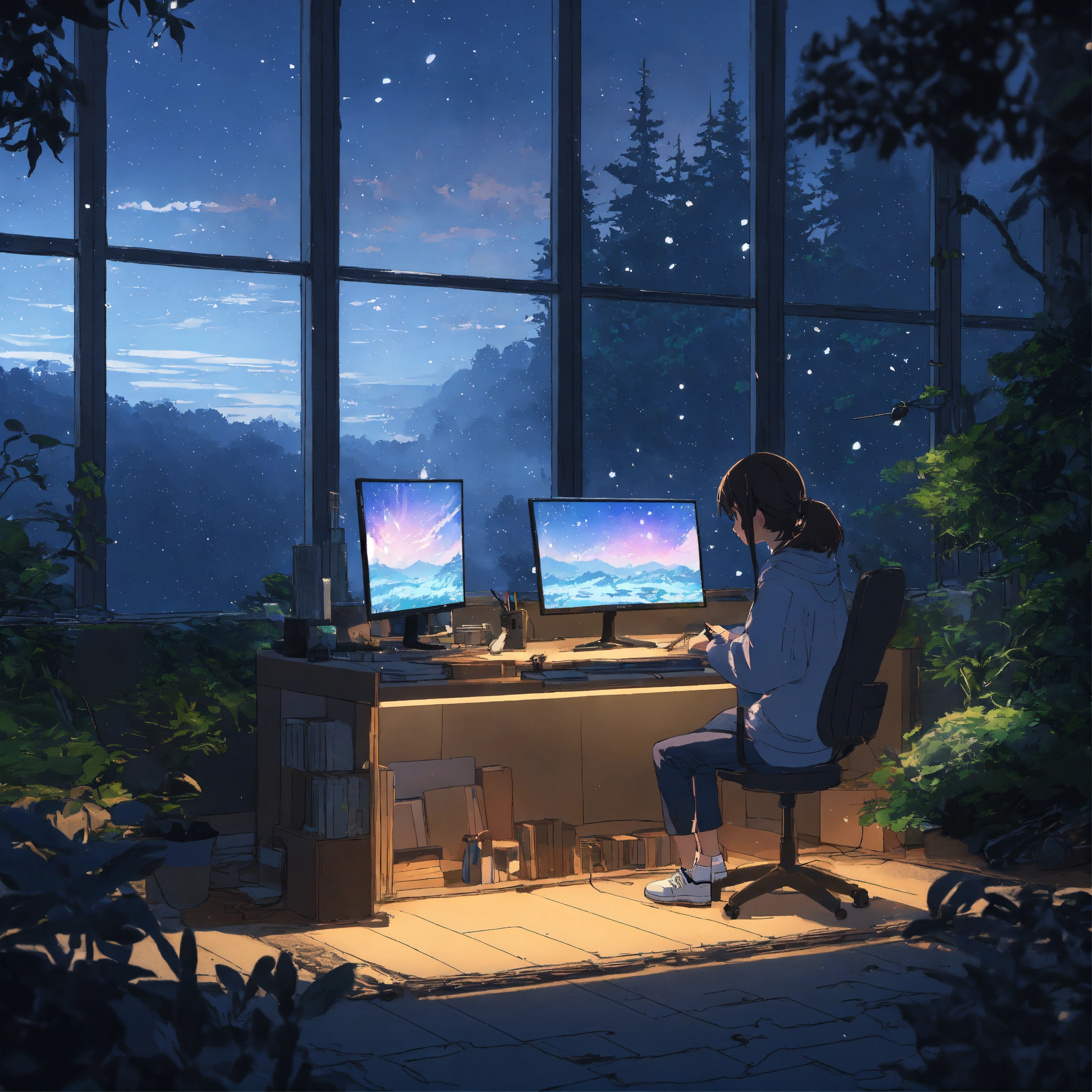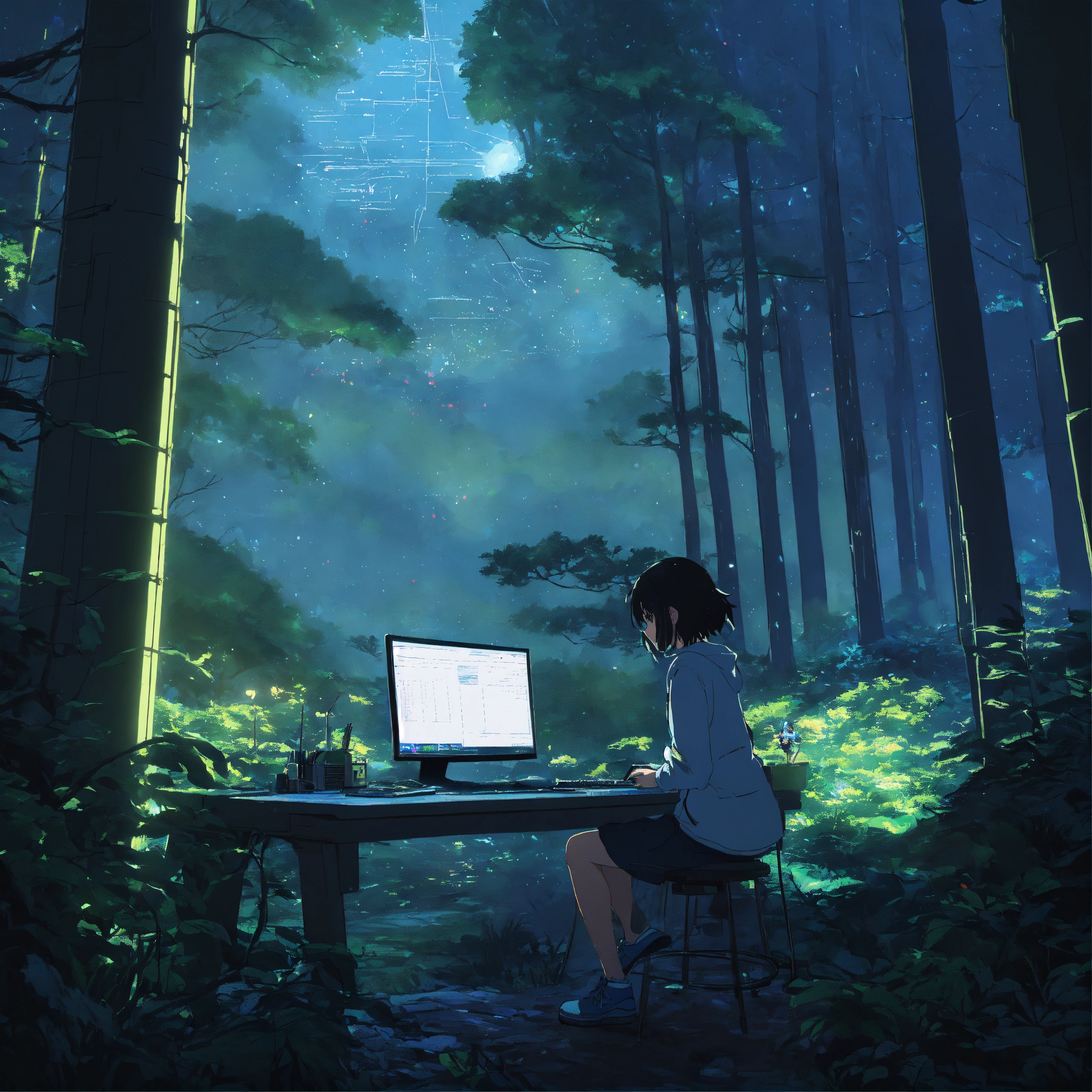 Create a high resolution artwork of lofi, anime girl is programming at a computer in a mystical forest, snown, artist, by makoto shinkai and ghibli studio, outlined silhouettes, dramatic lighting, highly detailed, incredible quality, trending on artstation, masterpiece, 8k, 2 monitors, book and a pen.
