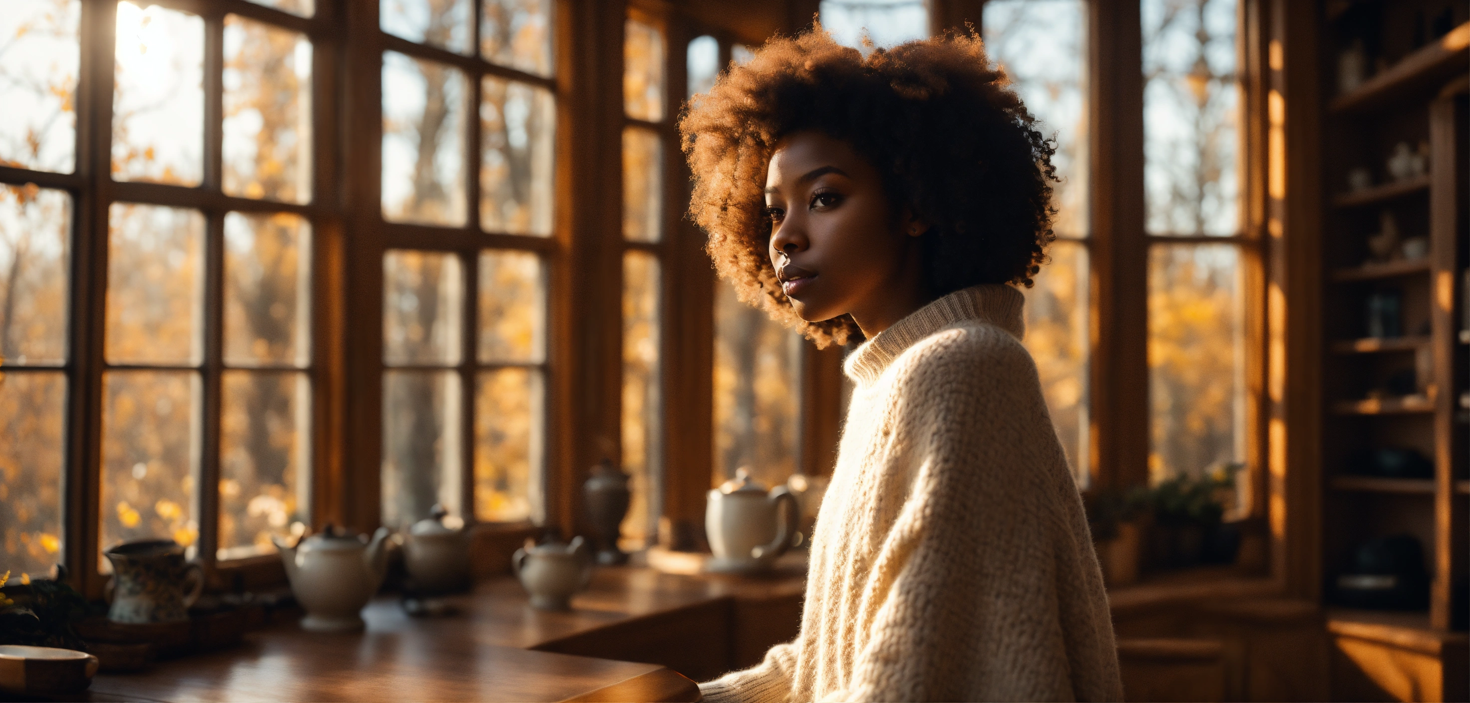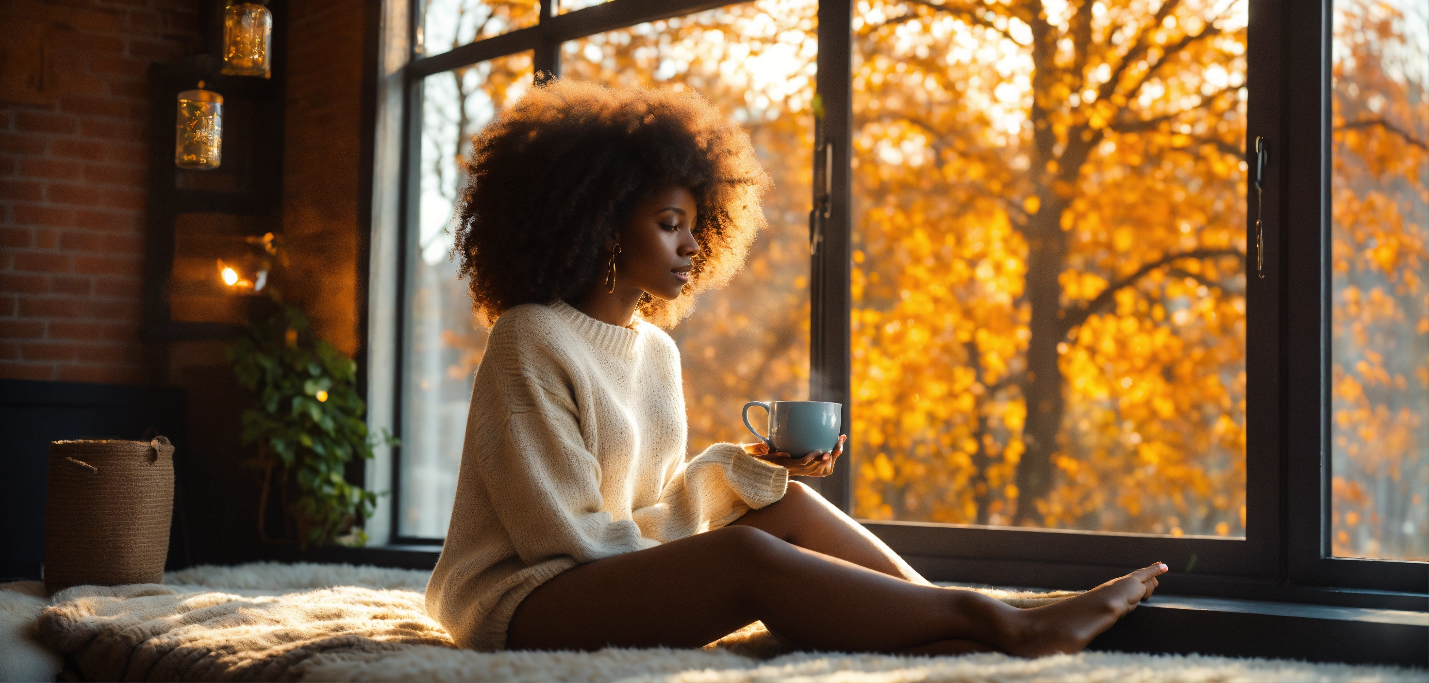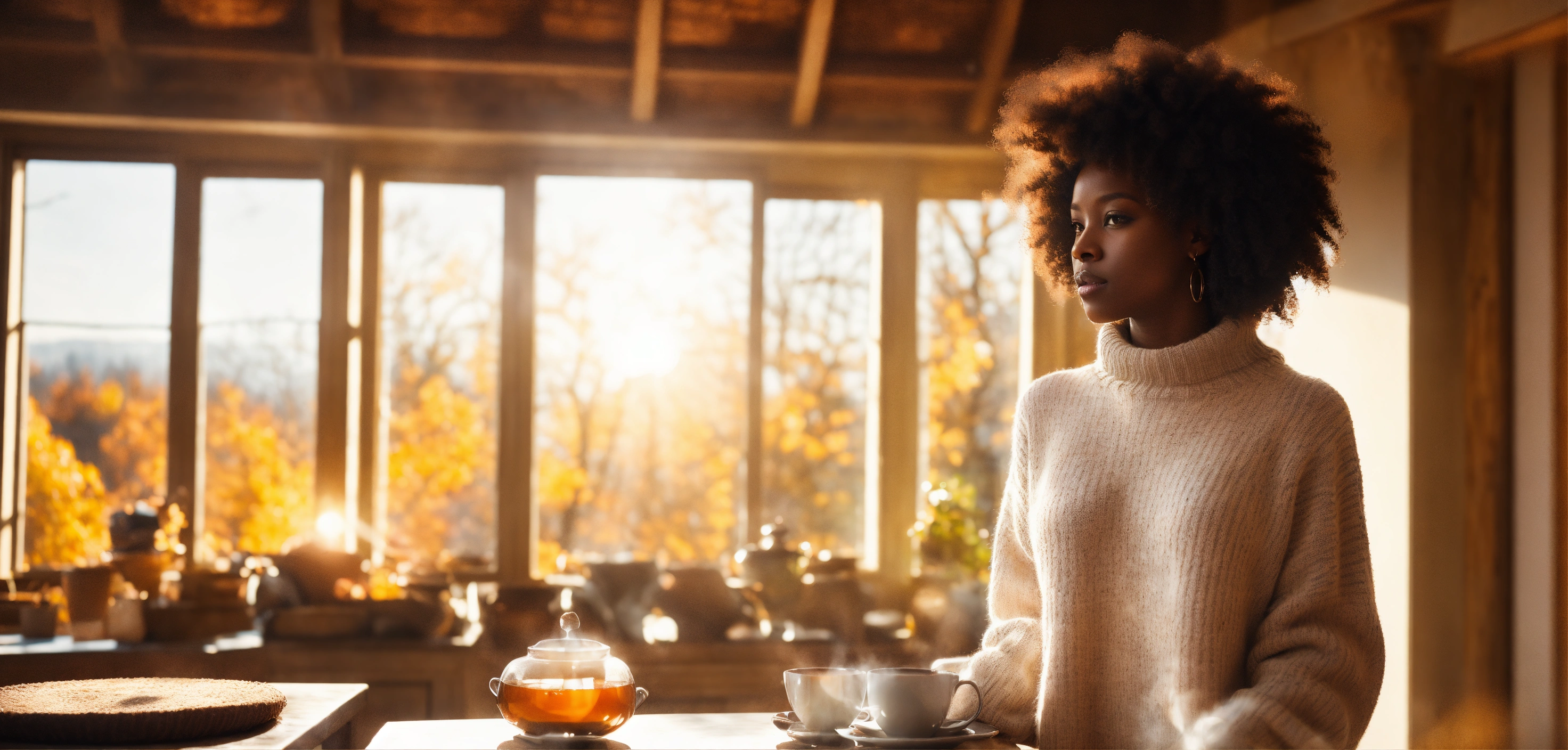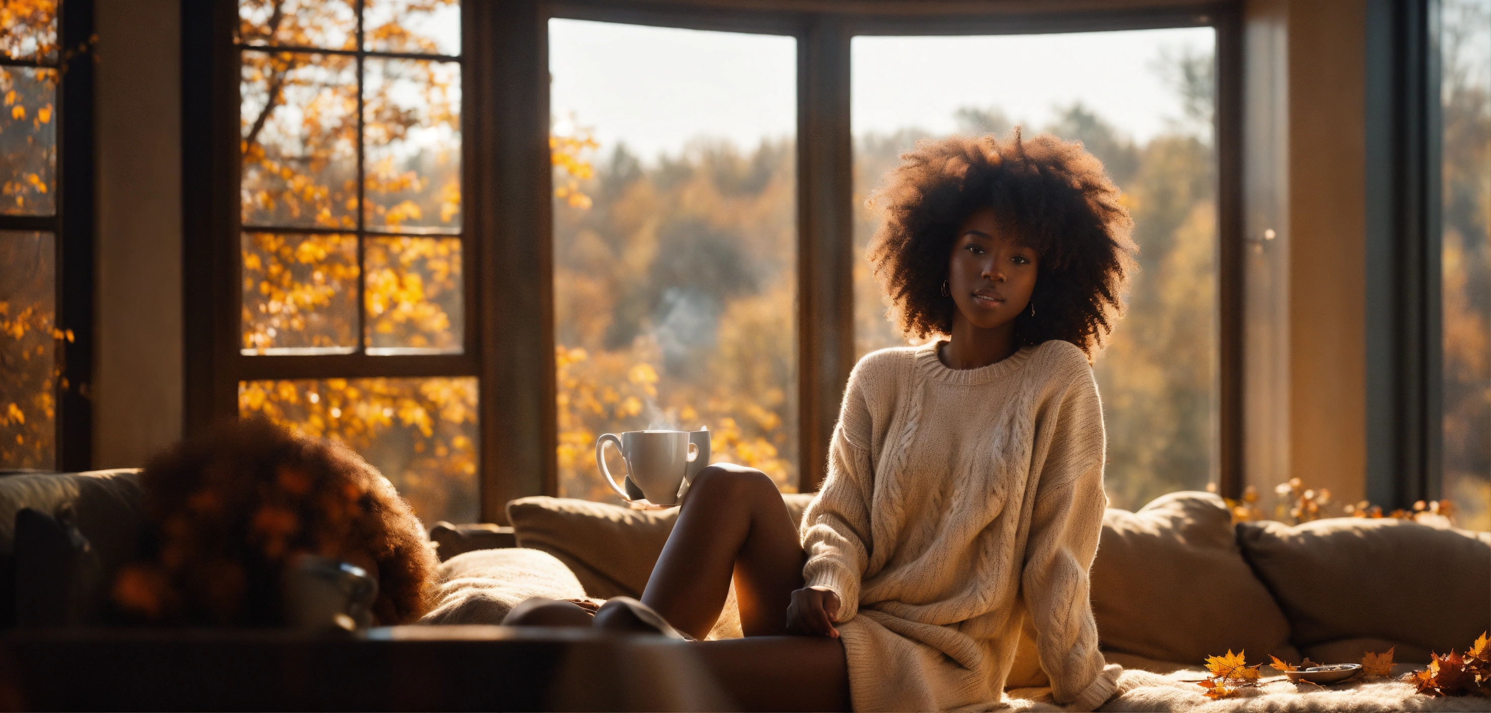 Wide-angle shot, beautiful melanated woman, dark skinned, white irish sweater, bright, with afro hair with loose curls. the sun, the autumn trees, massive loft window, fall, cozy feminine living room, steaming tea, fantastic beauty. curls. ultra-detailed dreamlike, photography 8k resolution image, translucent and ethereal.