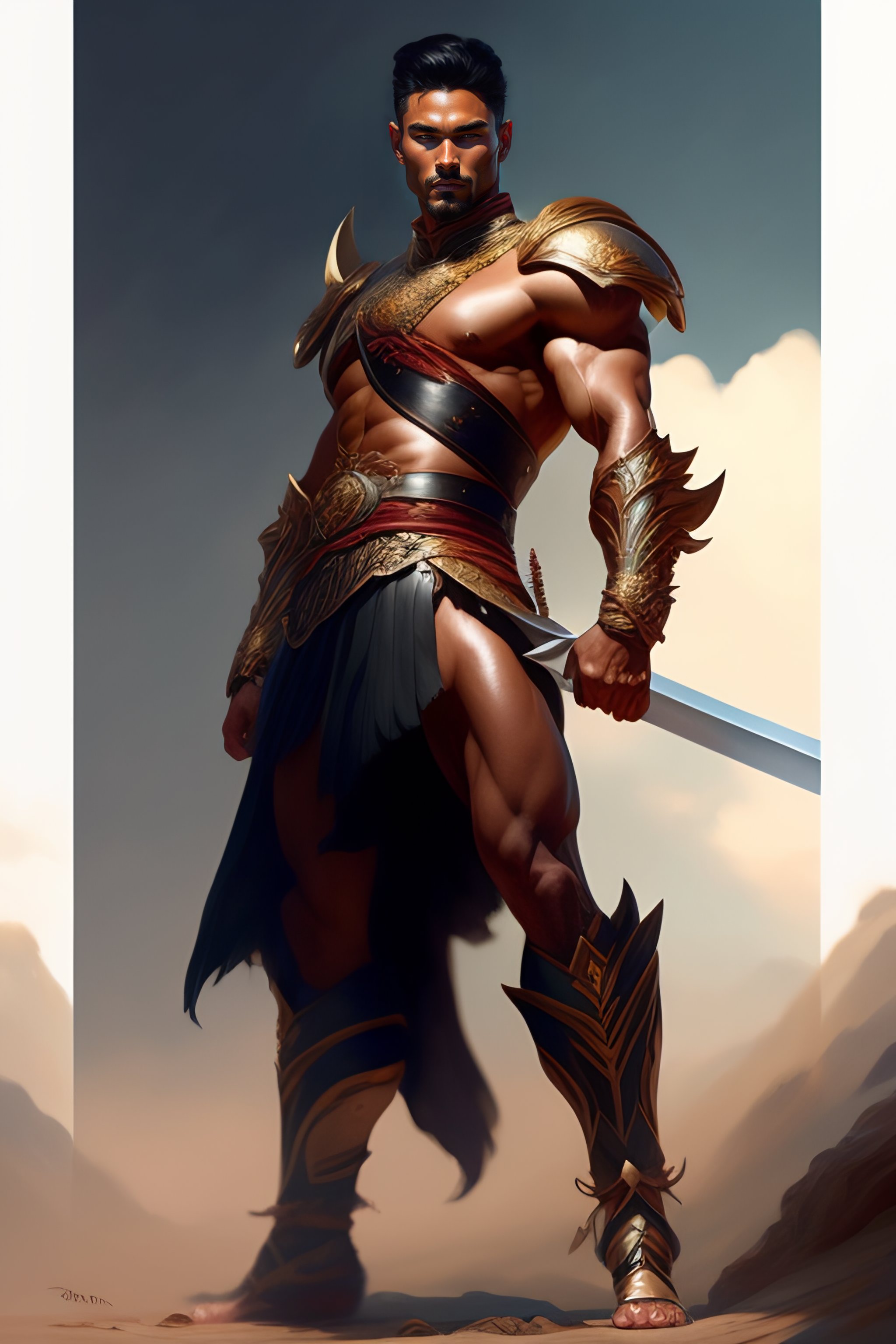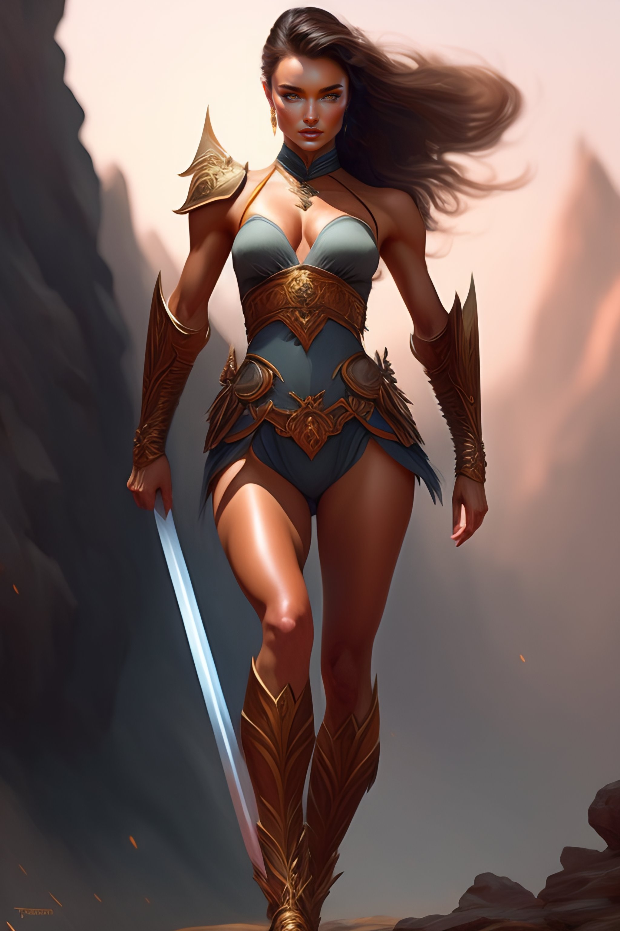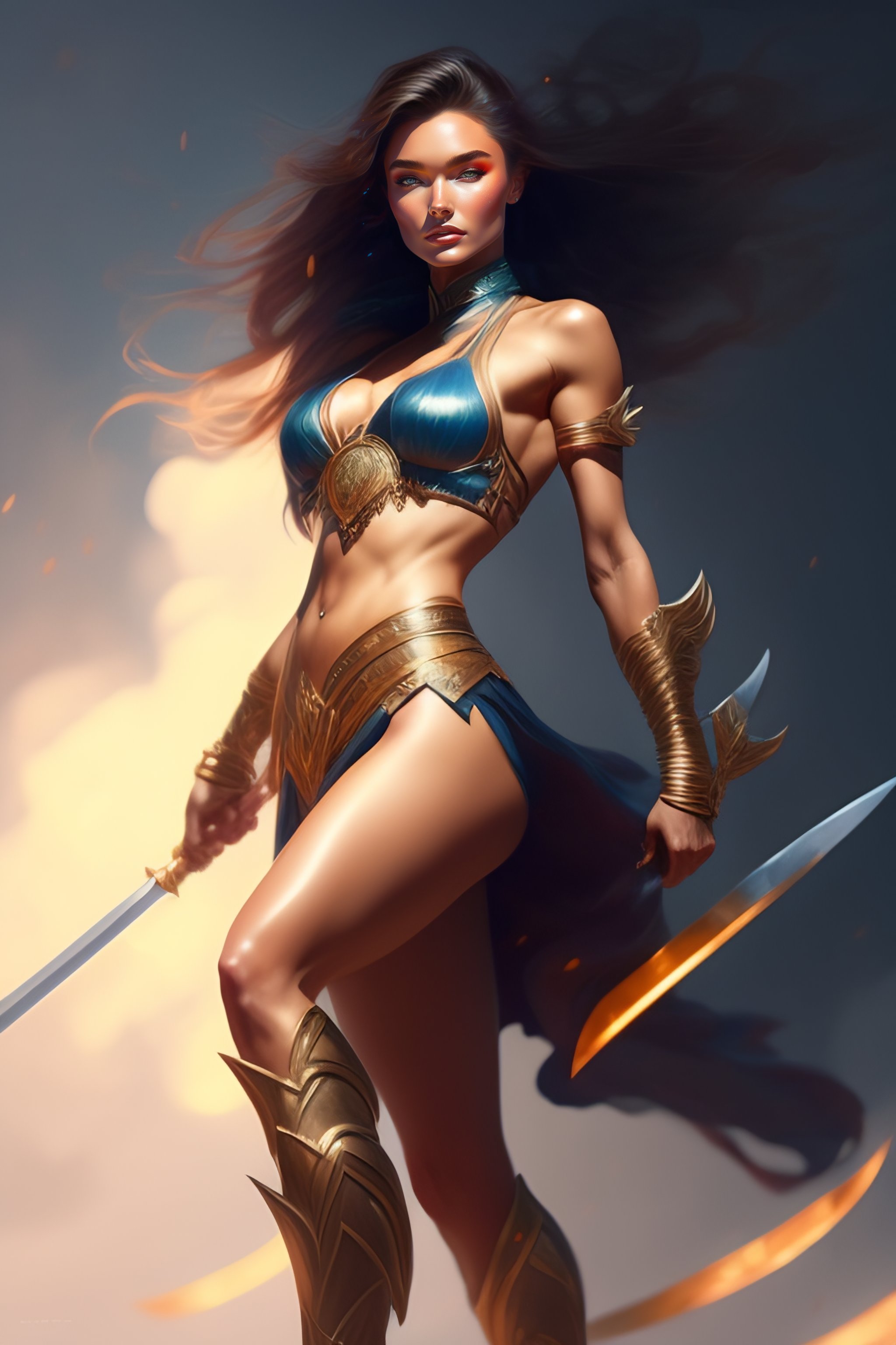 Full body potrait of muscular miranda kerr as rugged warrior sparying sword in air, muscular legs and six abs, highly detailed, digital painting, artstation, concept art, smooth, sharp focus, illustration, art by tian zi and wlop and alphonse mucha