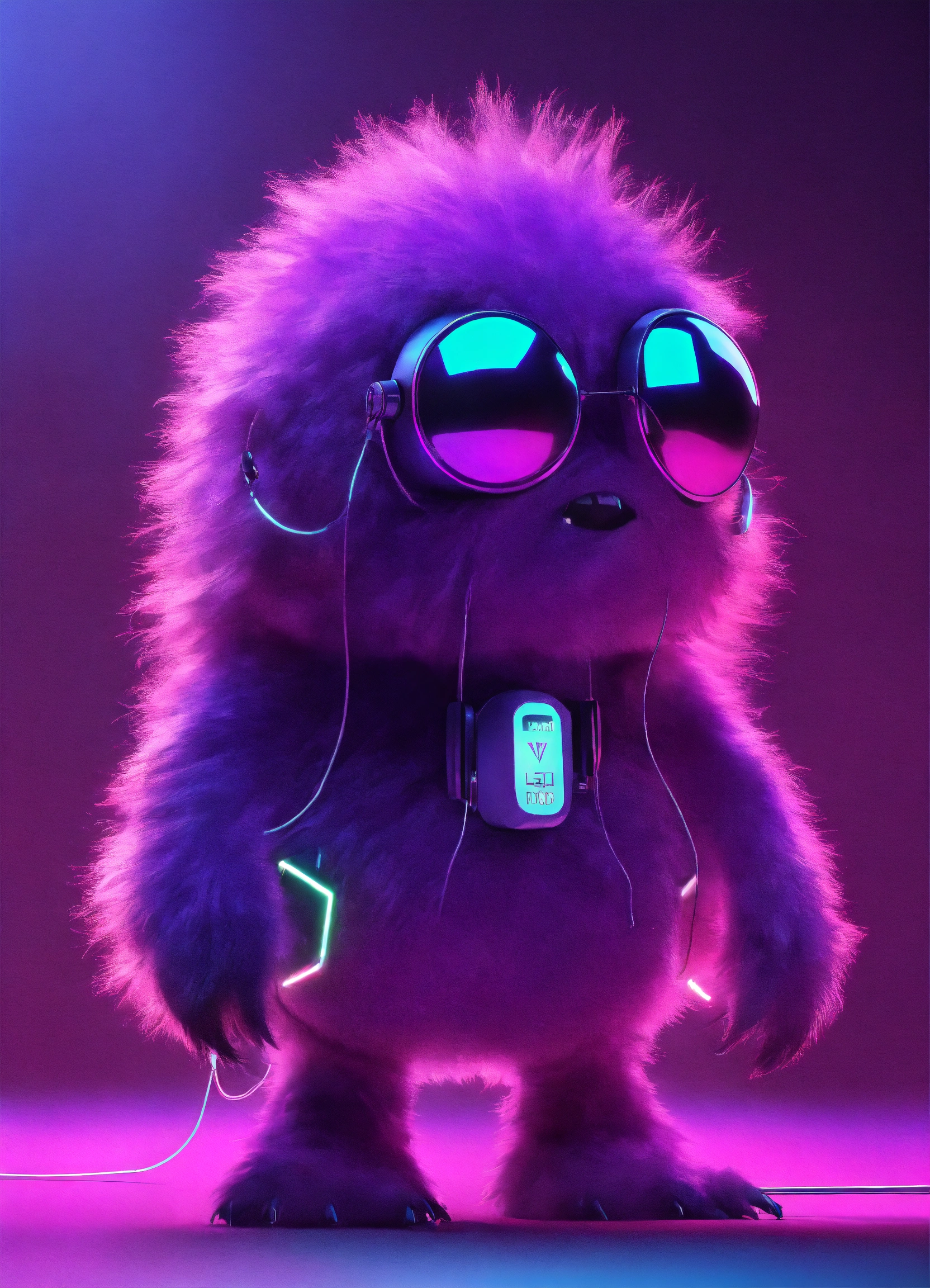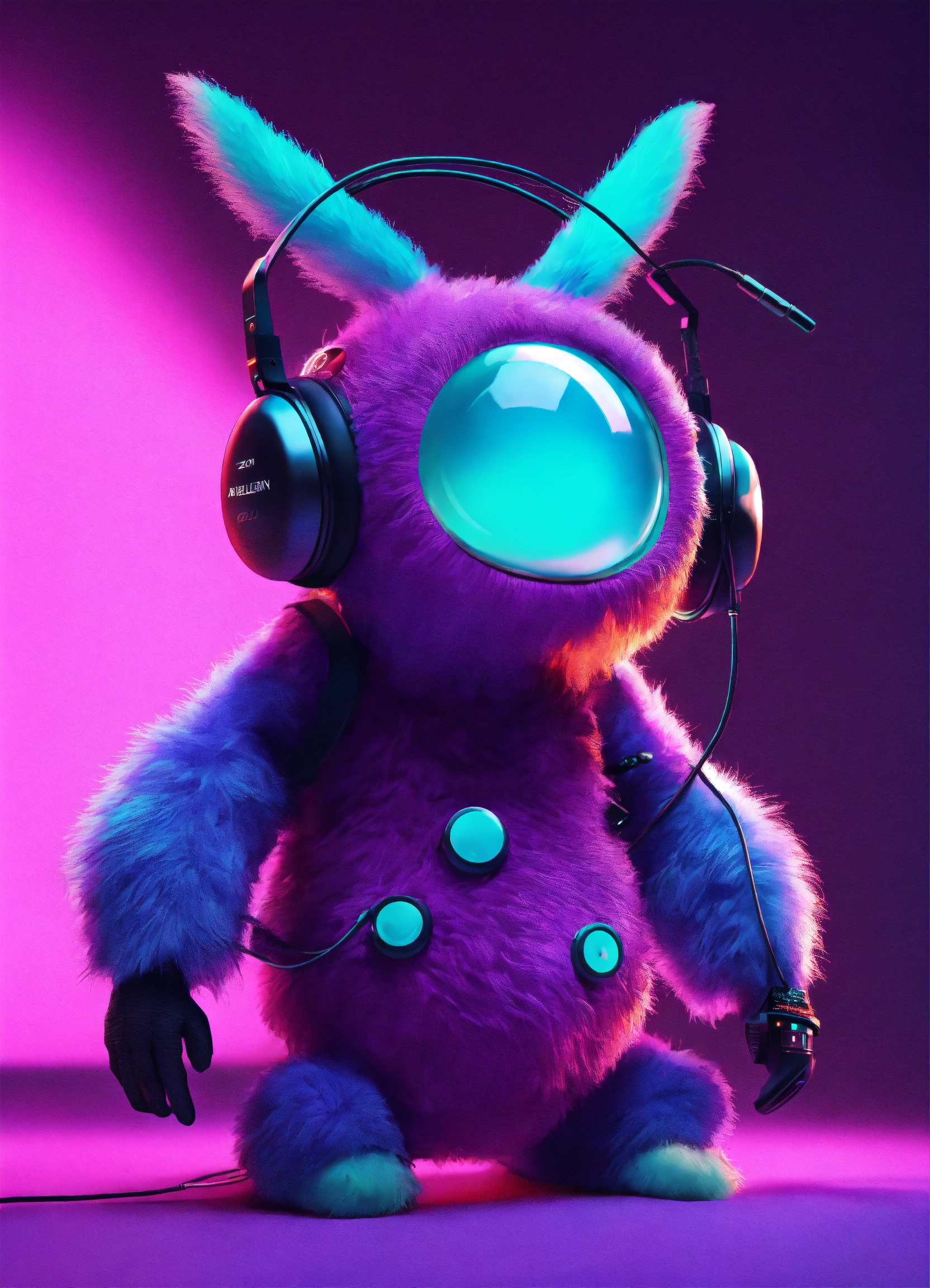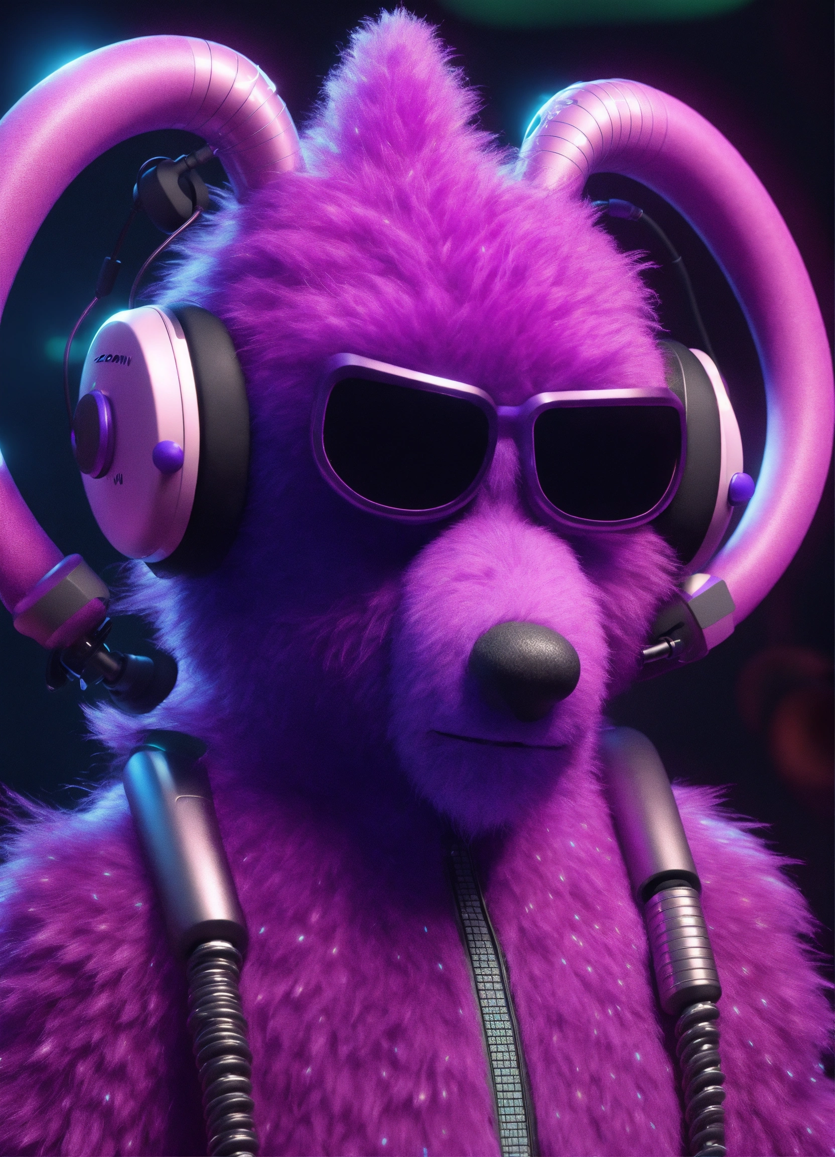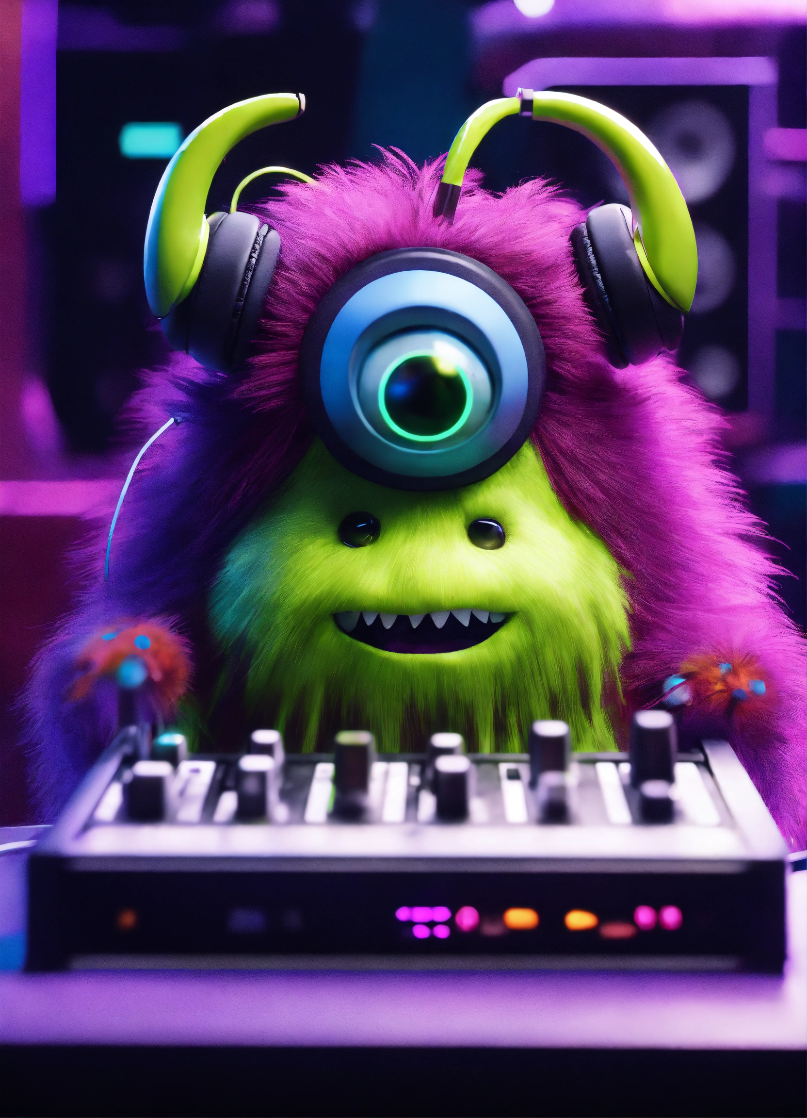 Zoom out on a tall pear shape oversize lovable friendly violet colored hairy monster with futuristic earphone antennas, playing a alien modular analog synthesizer, pixar, unreal engine, 8k.