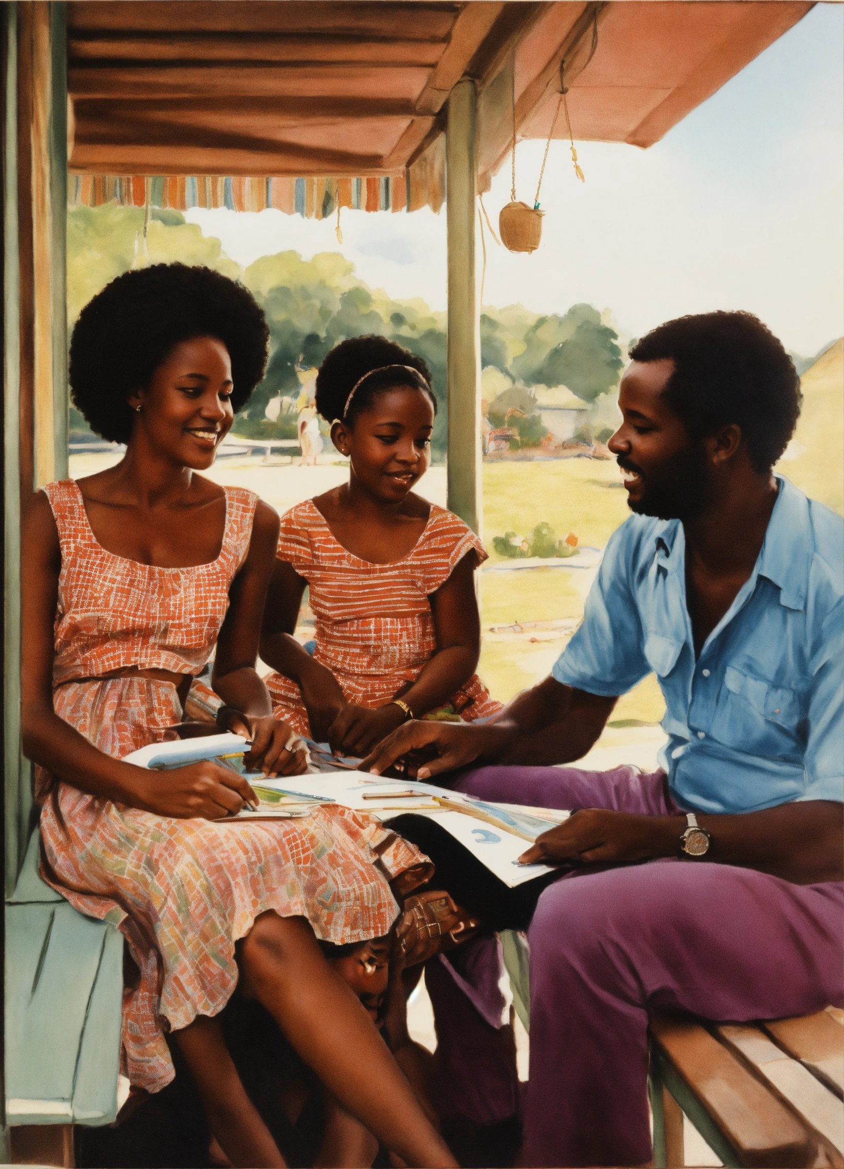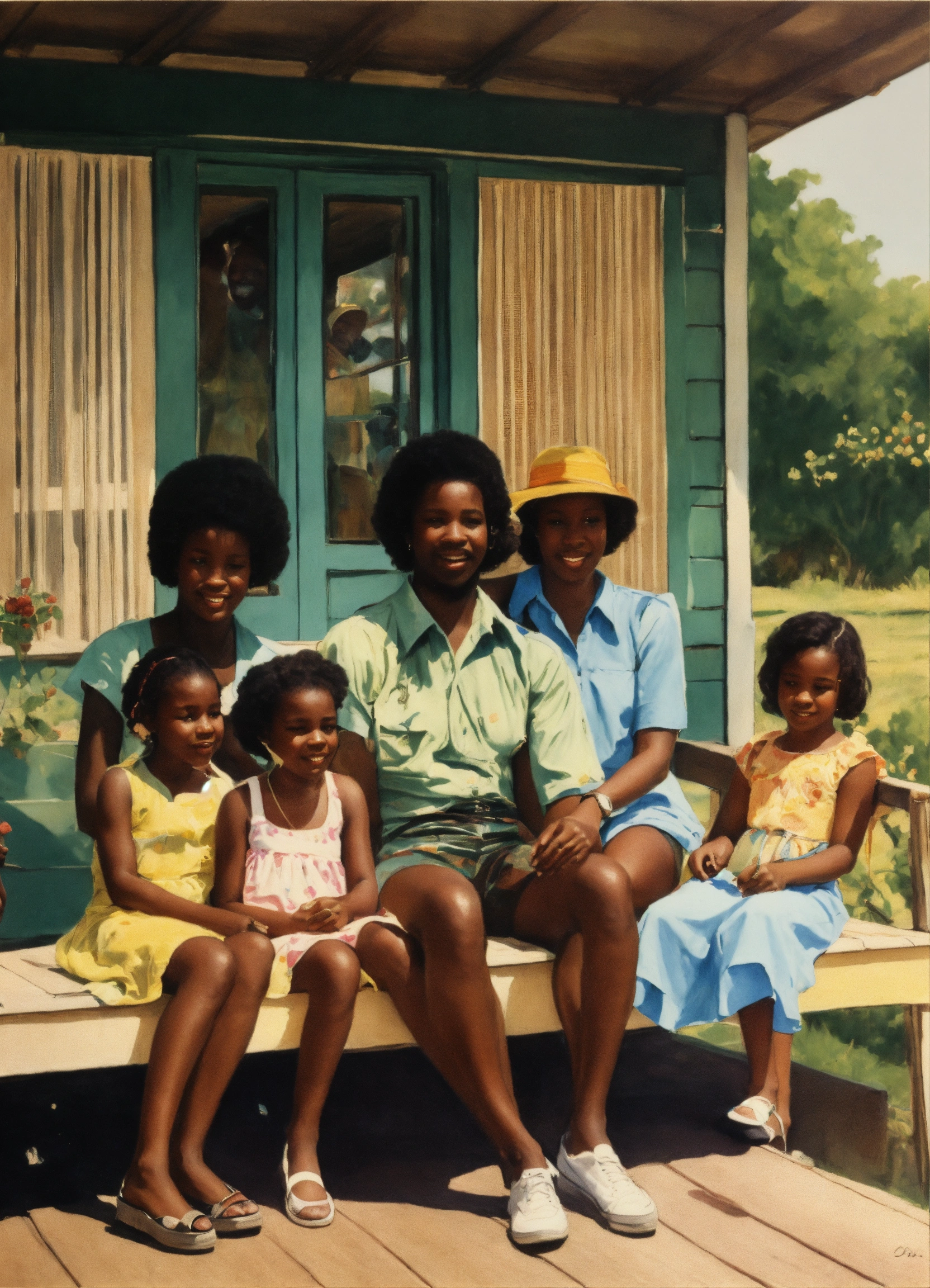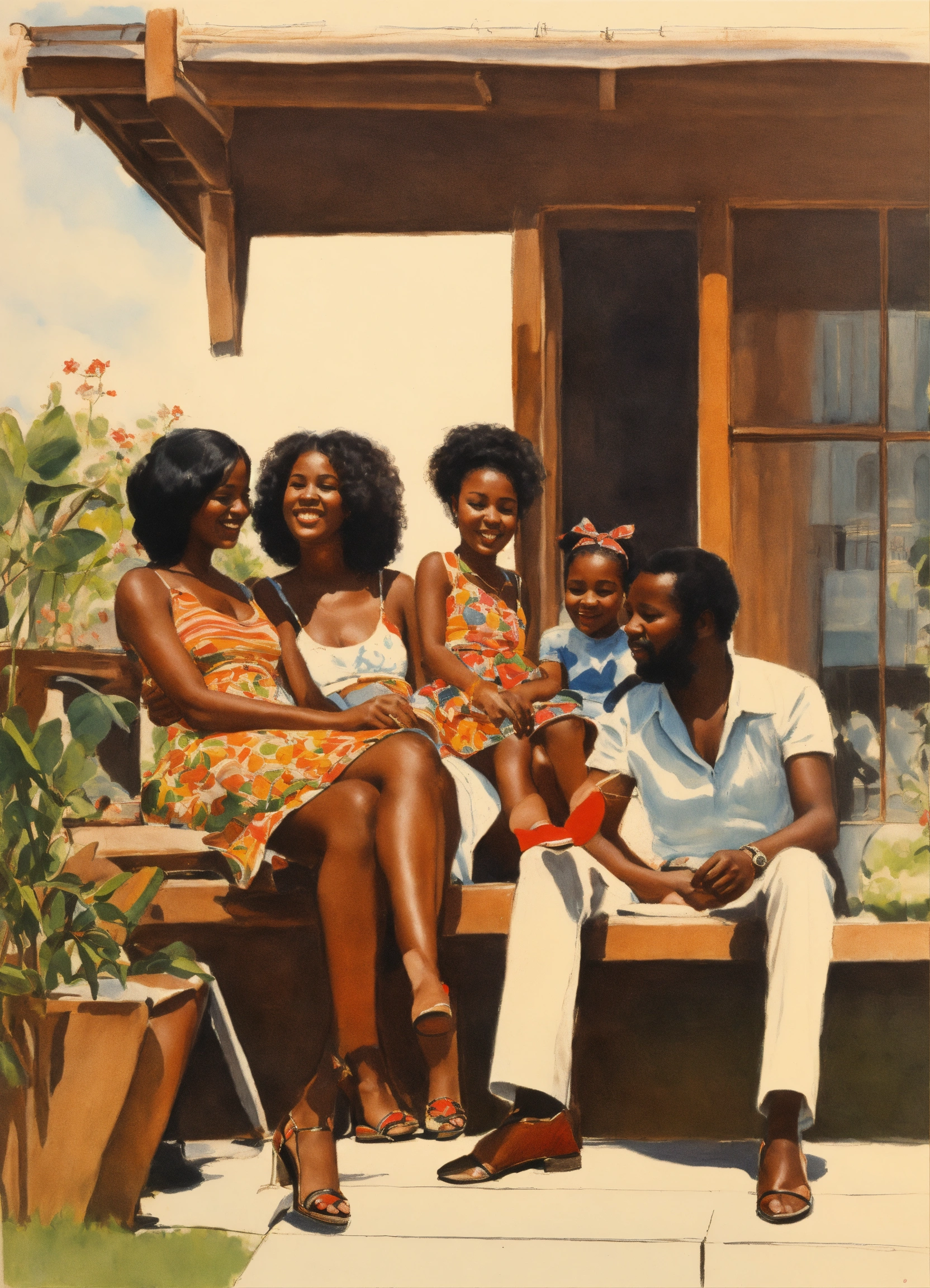 black dad and three young daughters relaxing on the varanda in the 1970s