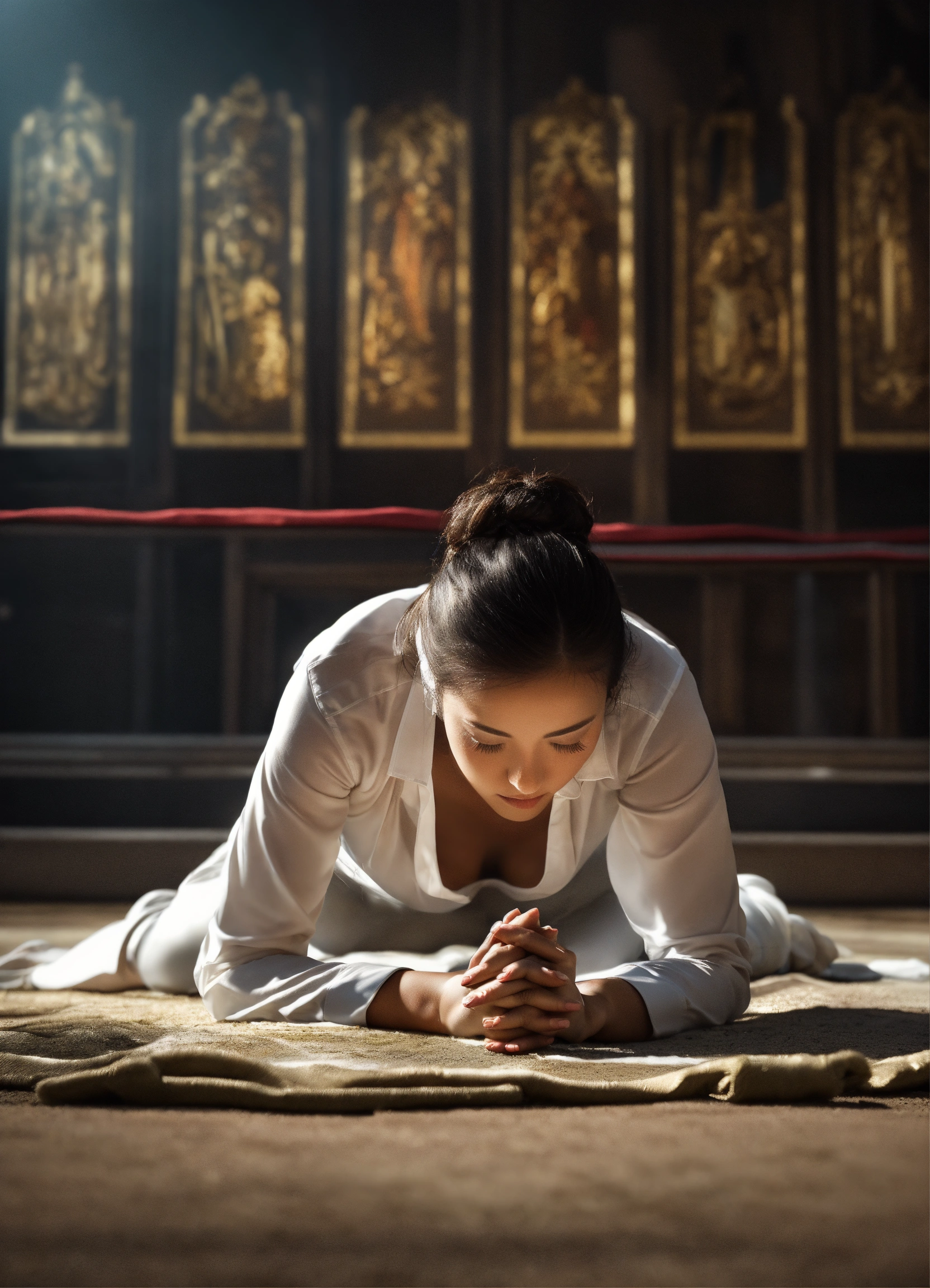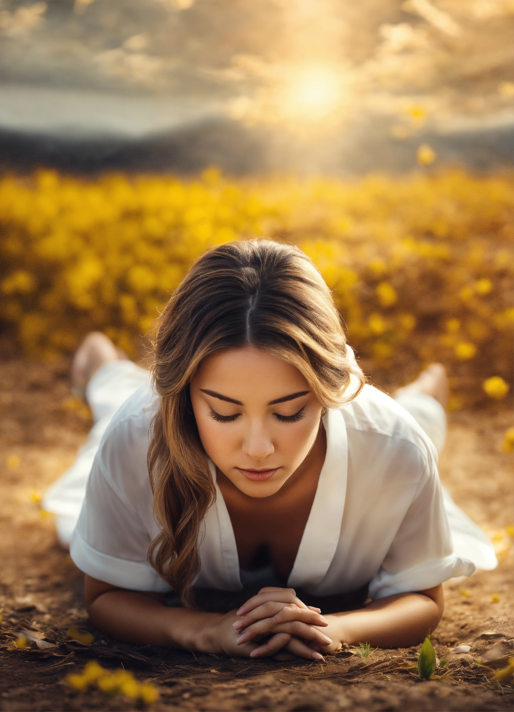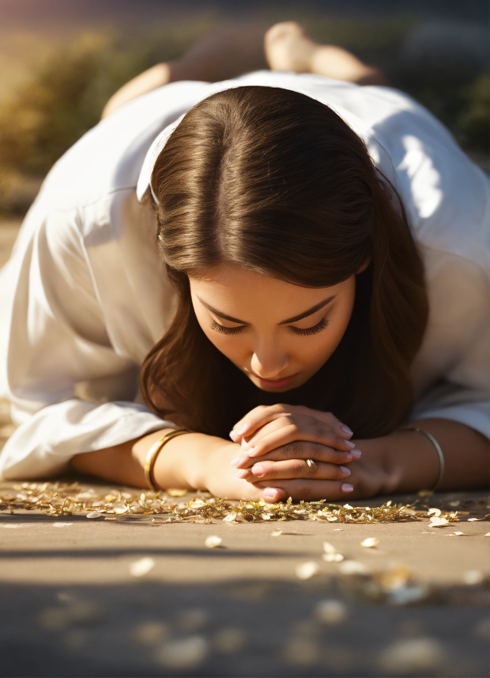 Create a captivating design that conveys the theme of god's glory, photorealistic, front view, facing front, a woman lying down bowing her head down to the ground praying, modern woman, captivating background, facing in the camera, face down below to the ground, lying down praying bow down to the ground, heads down to the ground, wearing white shirt, pray
