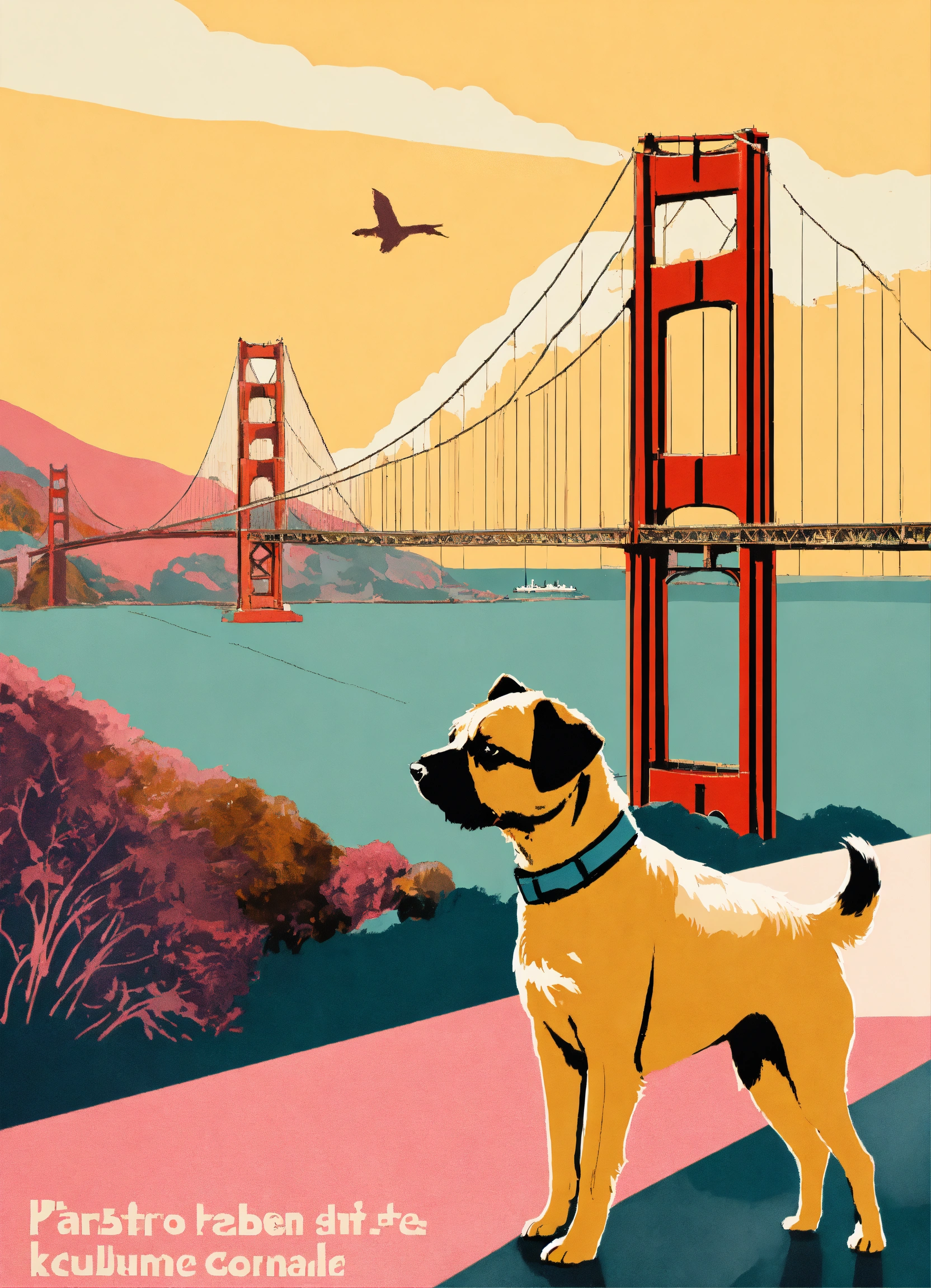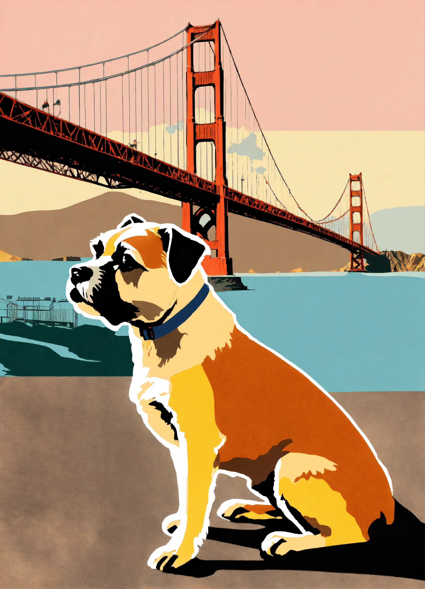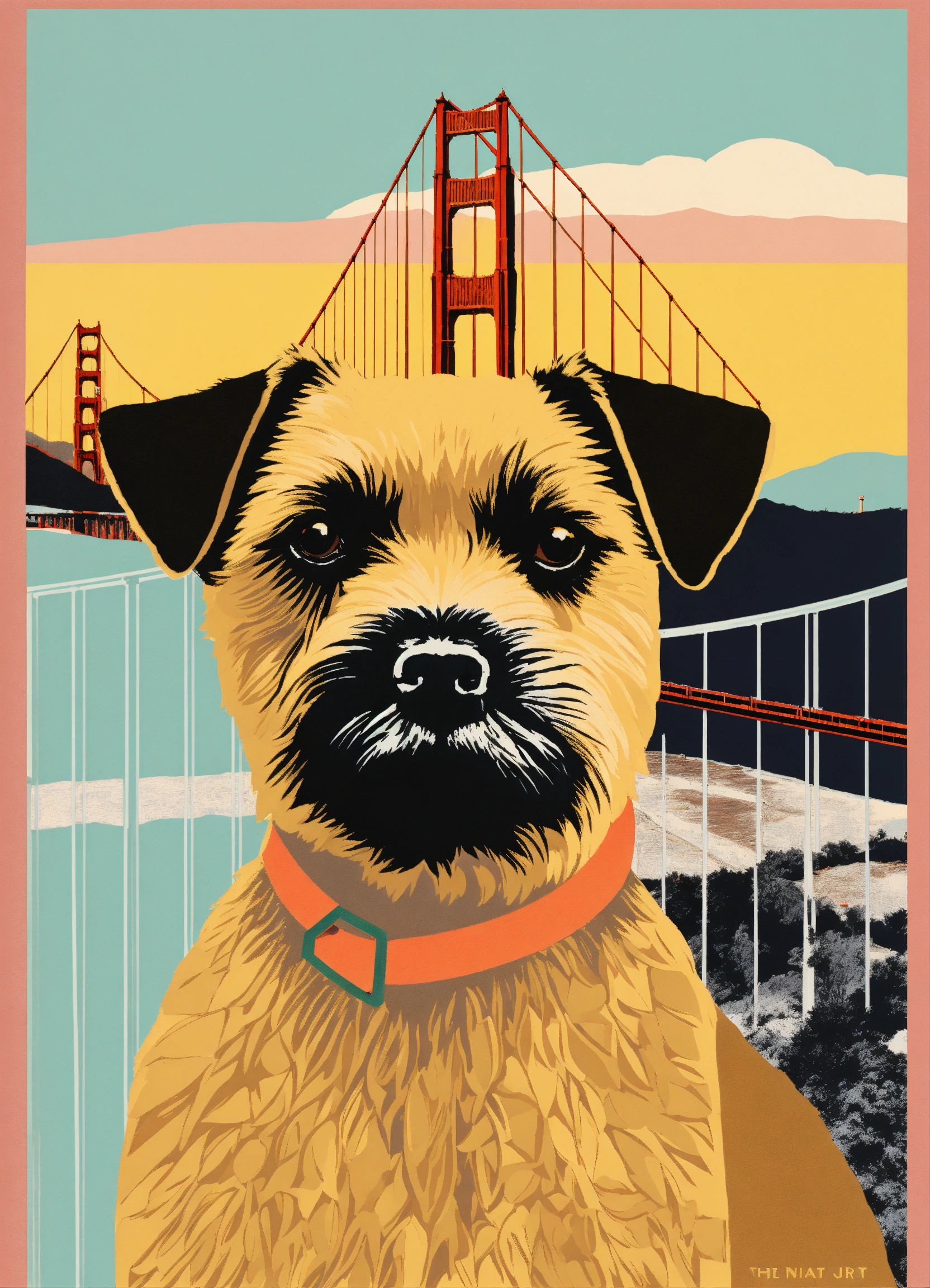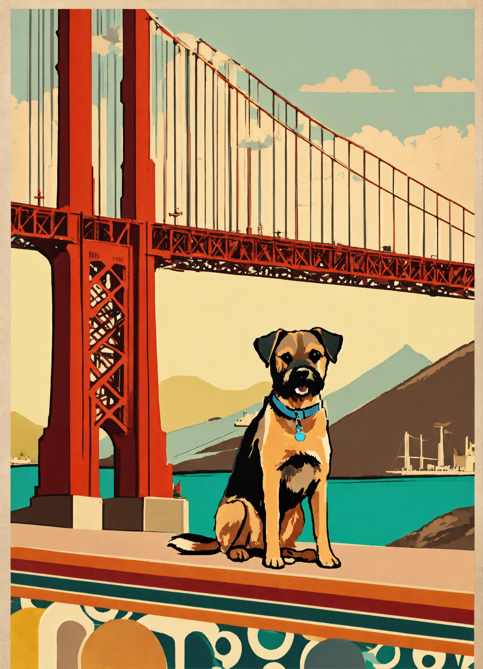Border terrier, mid century modern, golden gate bridge, poster pop art, postcard, pastel shades, collage