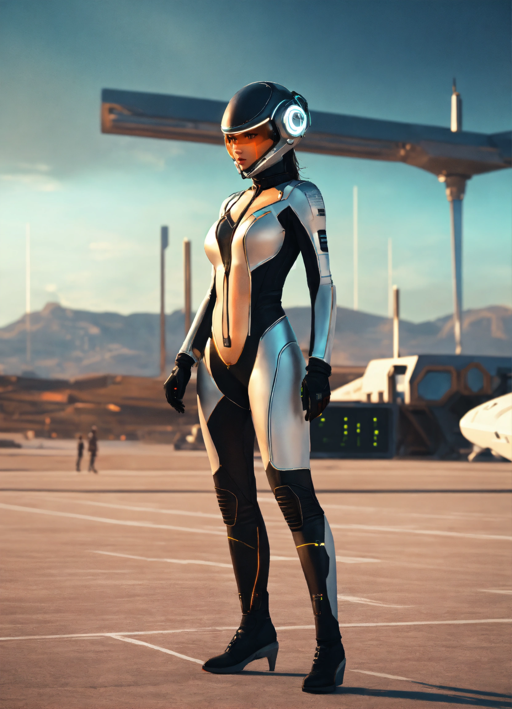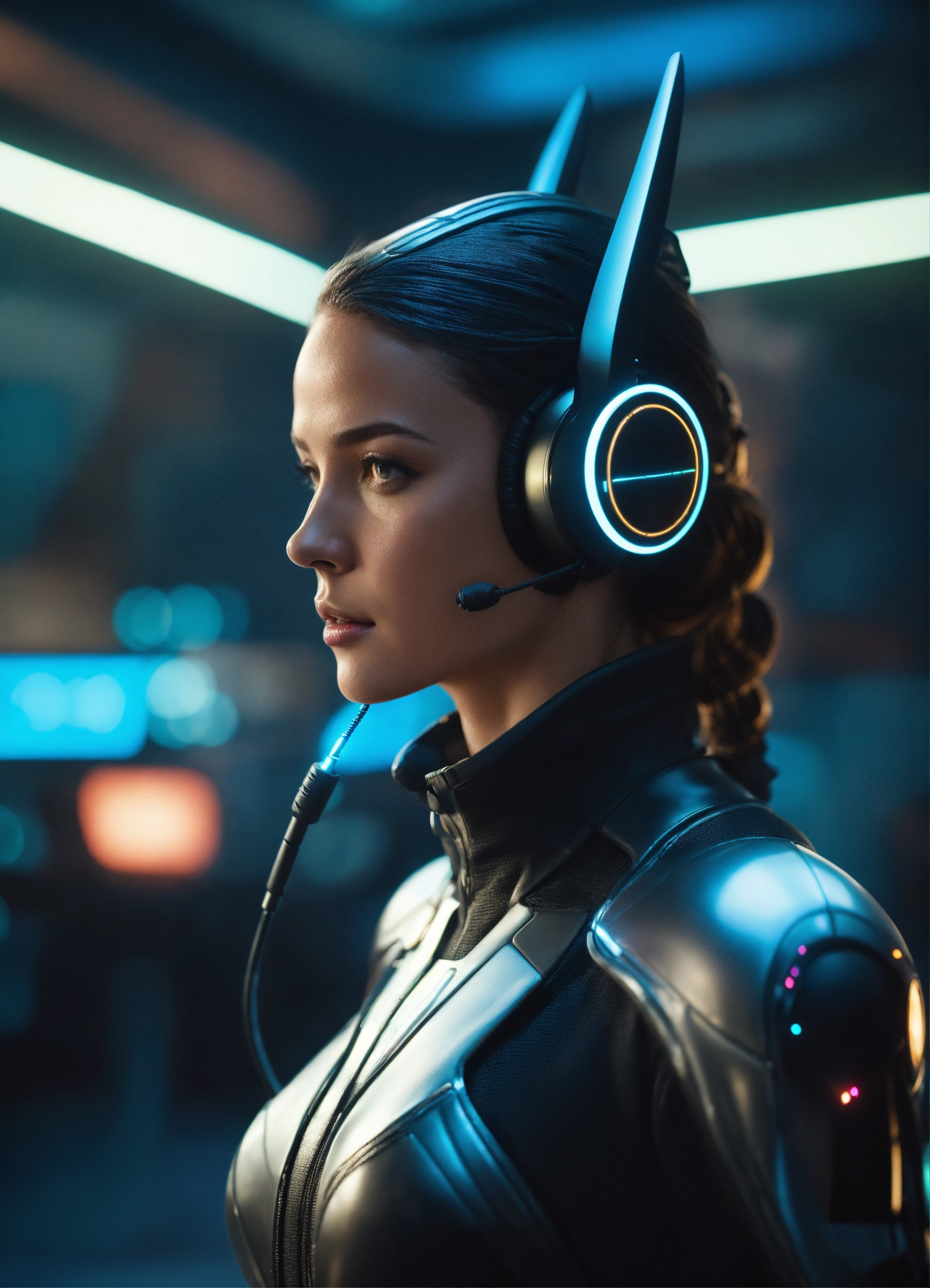 Wide shot of a female super spy wearing a tight futuristic spy suit and alien earphones with long pointy antennas, hacking on the controls at a spaceport of a space port, realistic, futuristic, sci-fi, 8k, tron, unreal engine