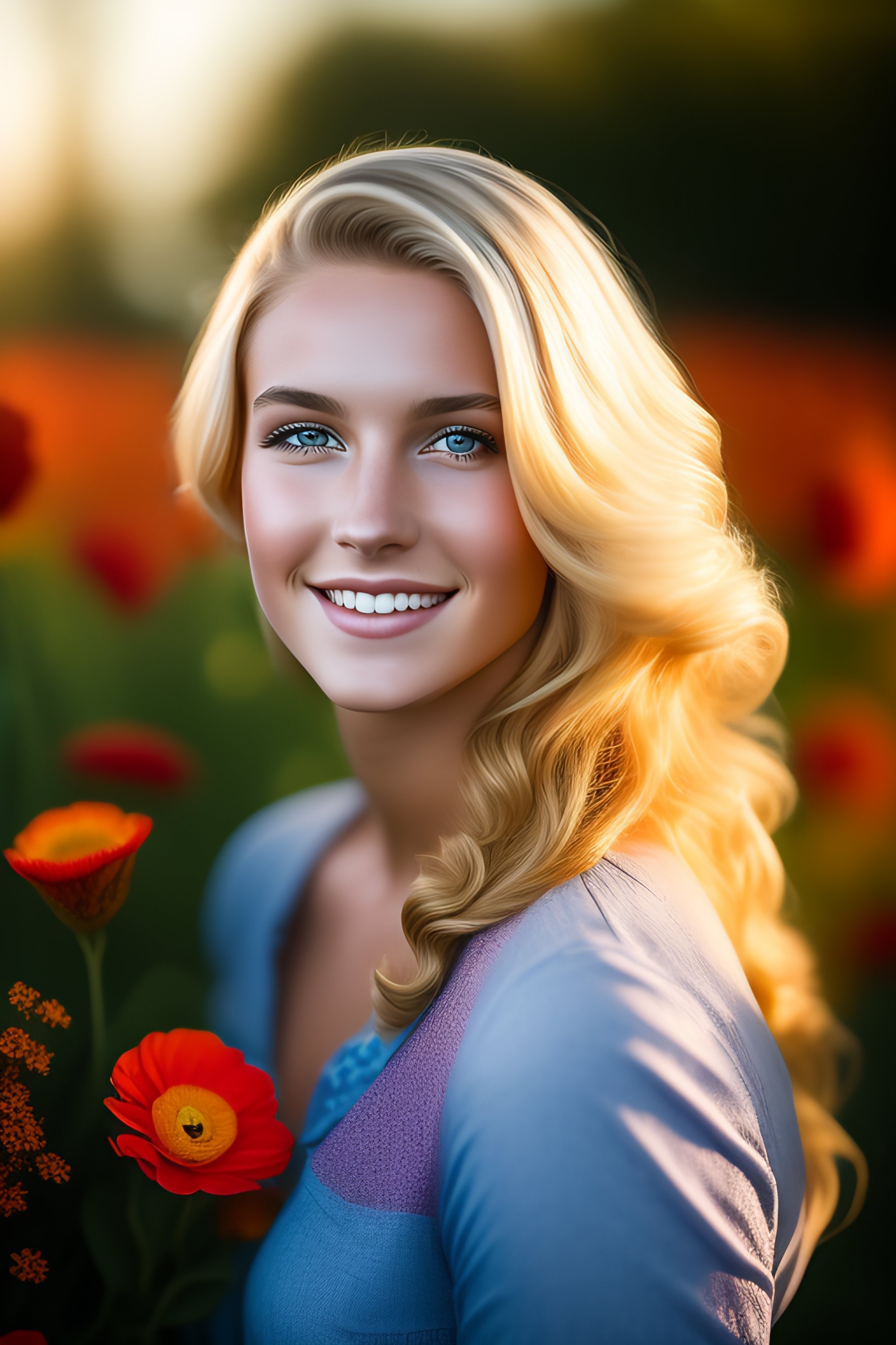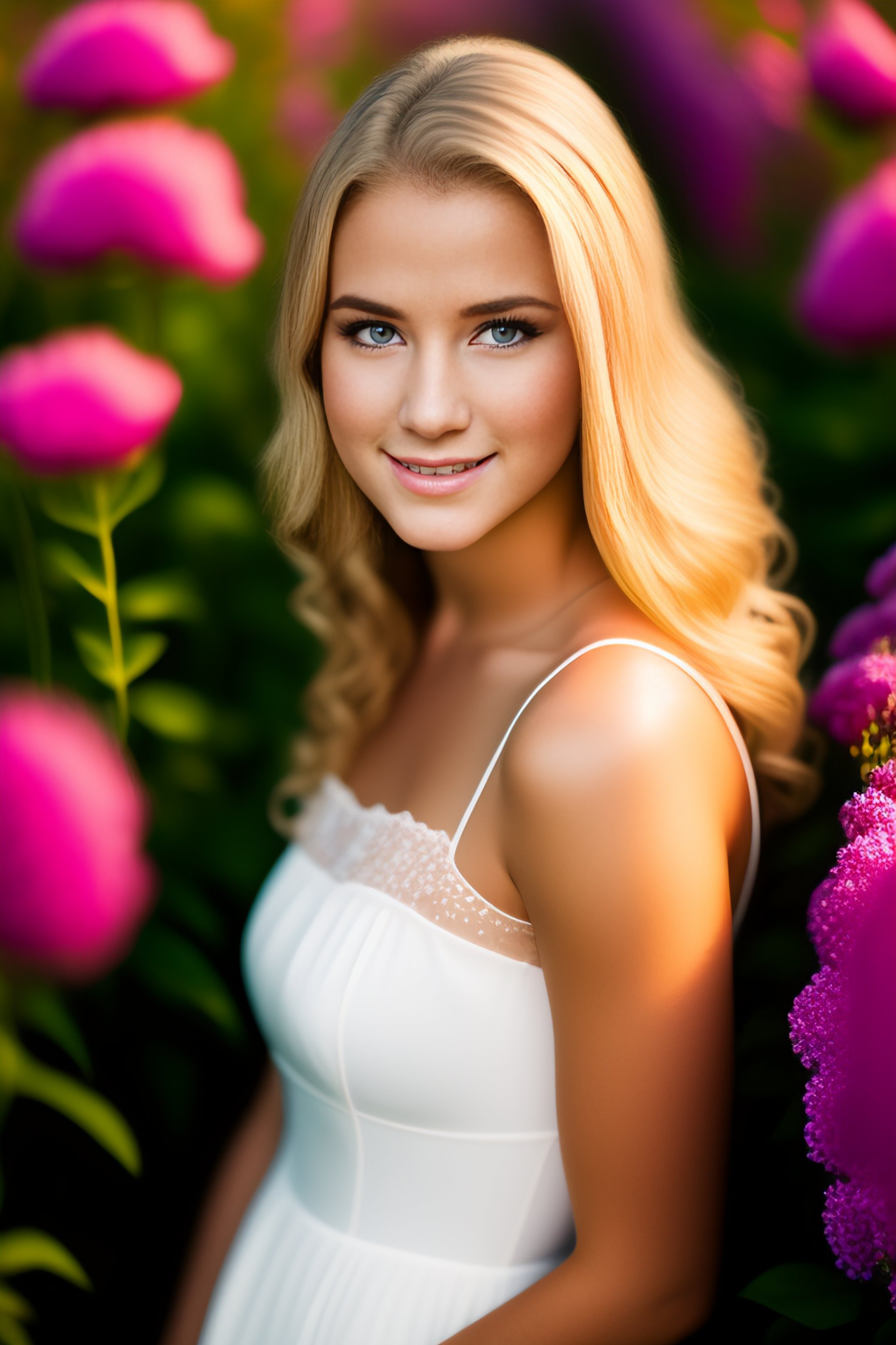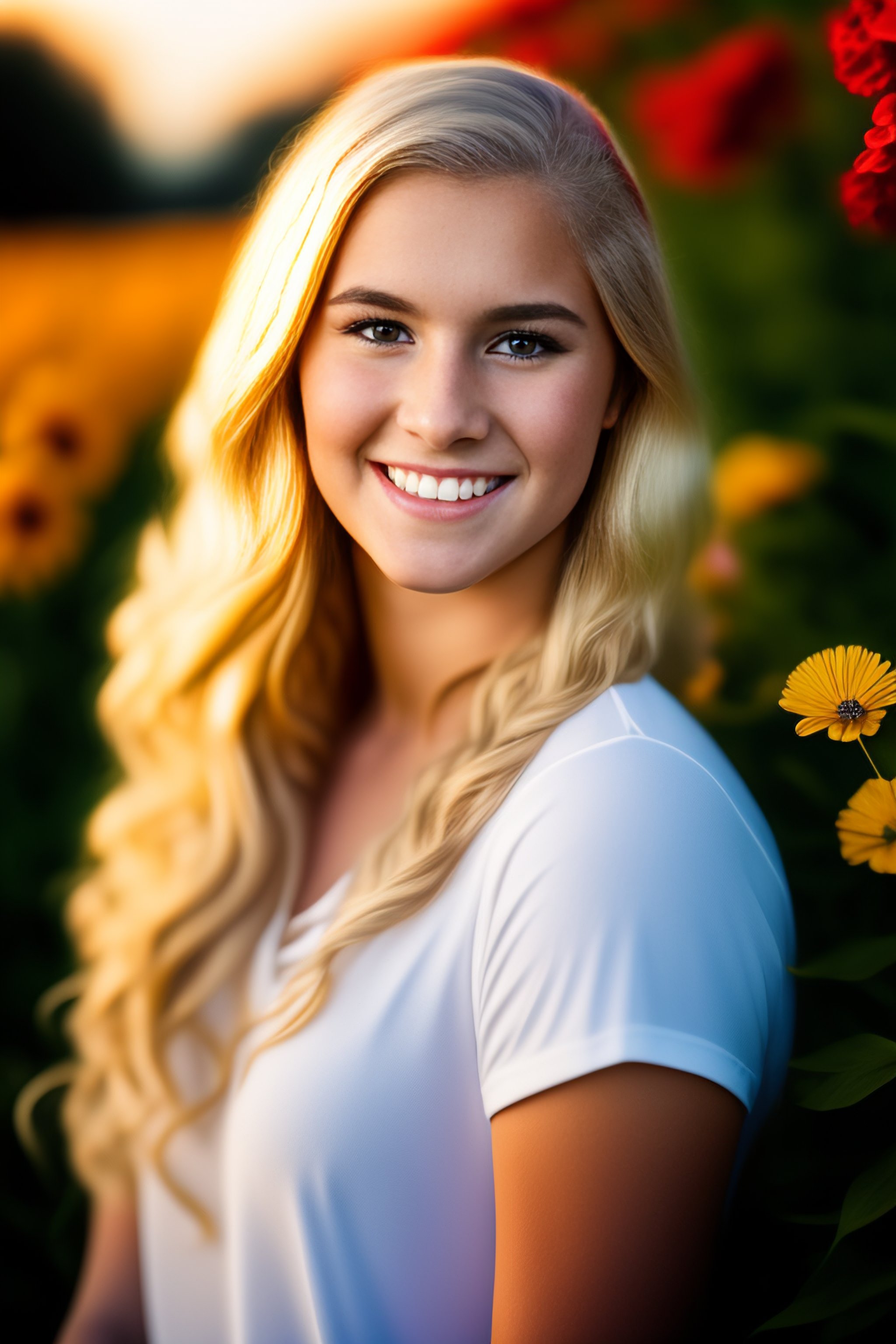 Senior picture of an 18 year old girl with blonde shoulder-length hair in a flower garden
