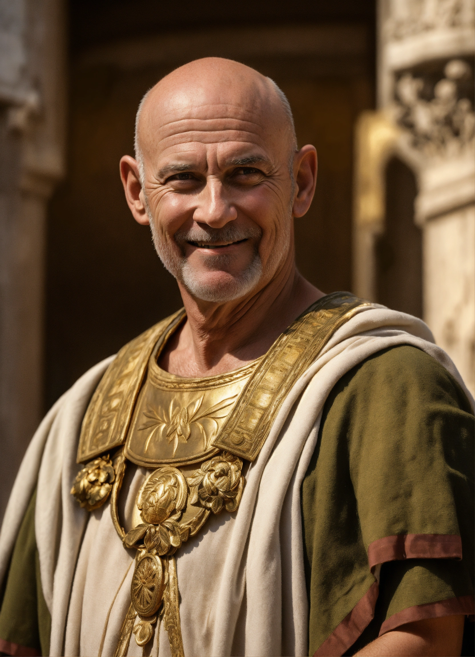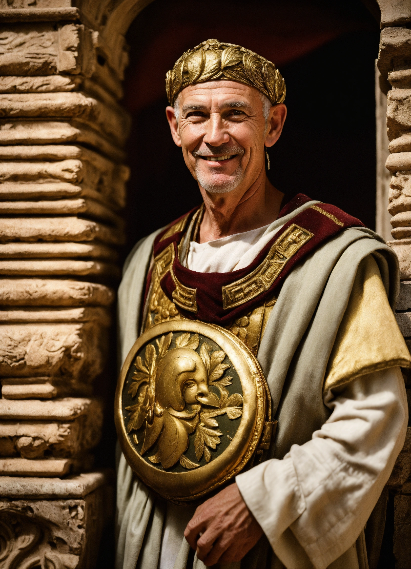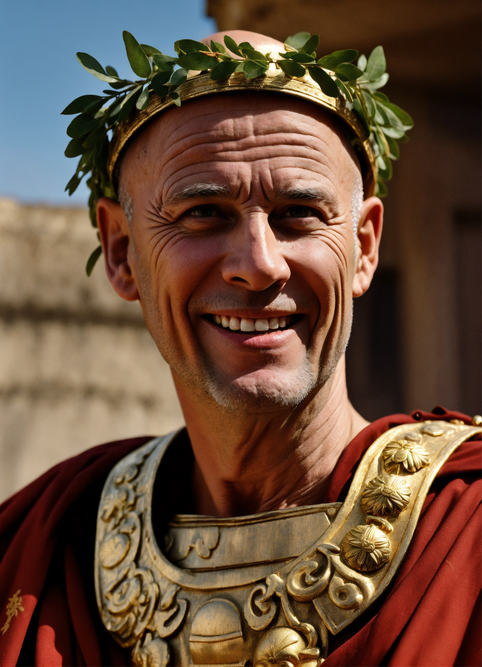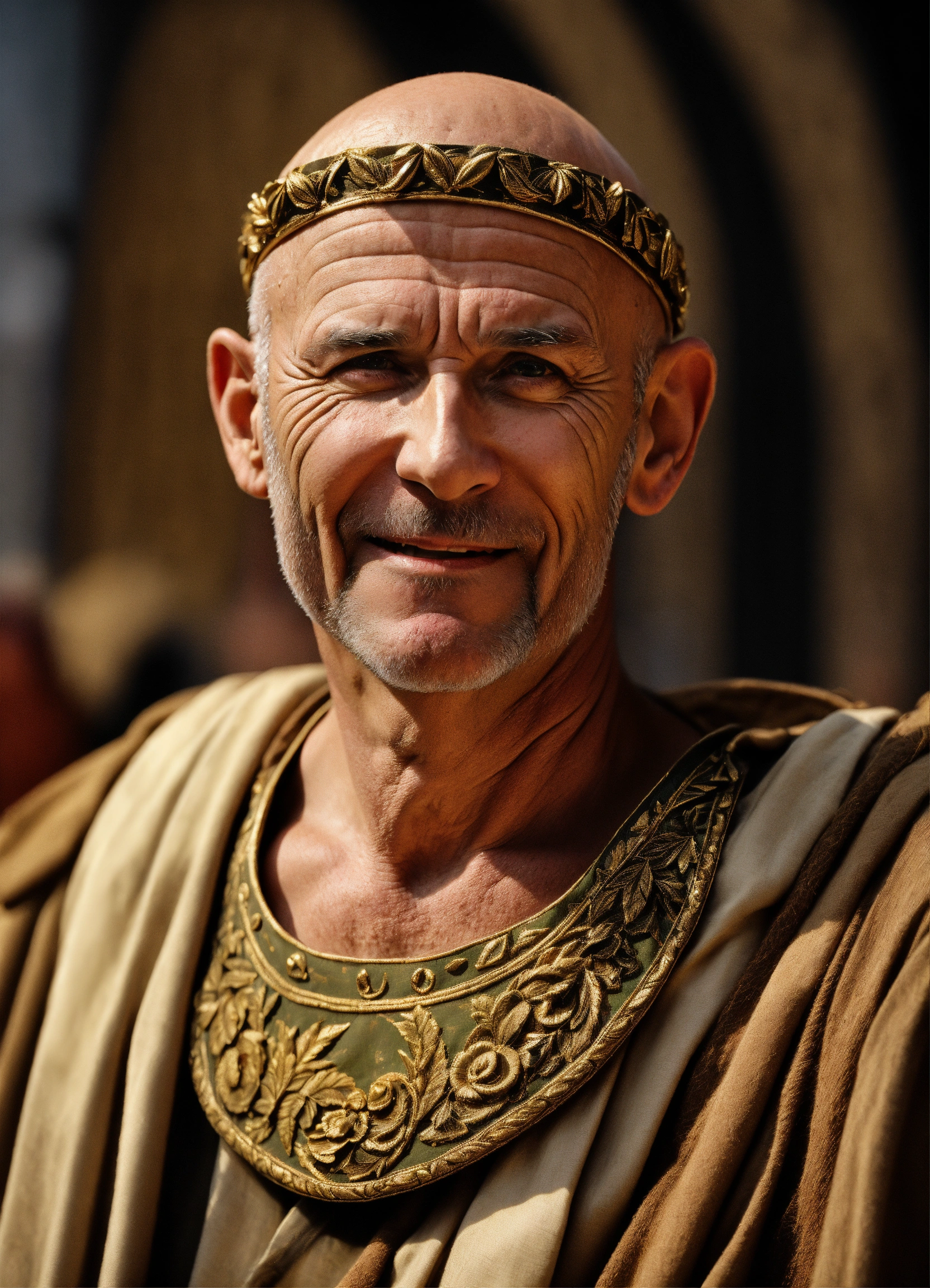 A realistic photo of an ugly 60-year-old man, almost bald, sharp nose, white skin, cocky smile, sour thin face, wrinkled skin, wearing a fancy roman tunic, with a roman golden olive wreath on the head, in the box of a roman amphitheater, menacing, imposing, hyperrealistic, hyperdetailed, 8 k
