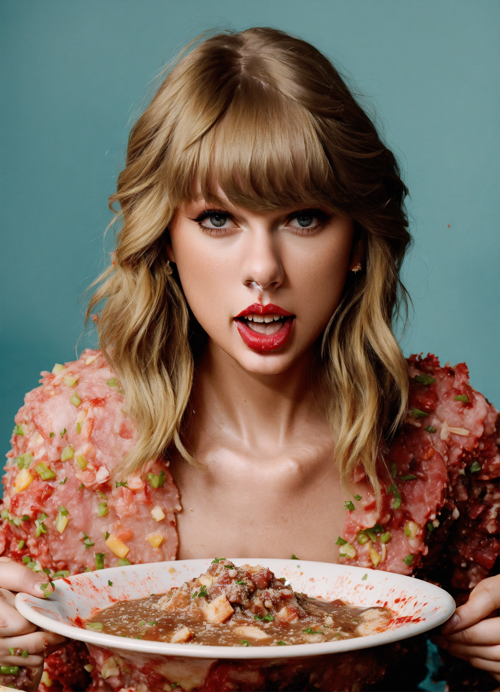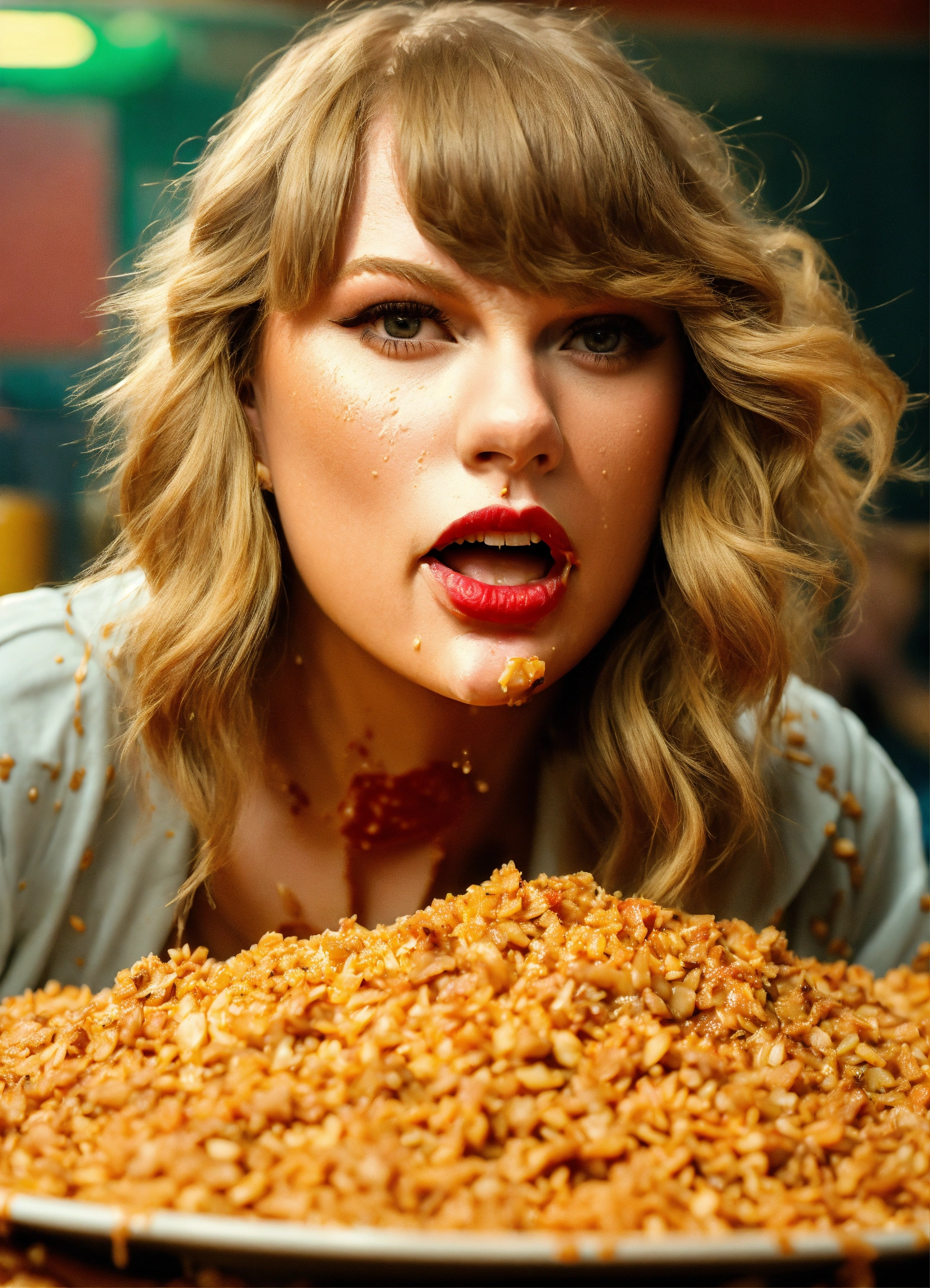 Photo realistic shot of taylor swift eating a disgusting pile of slop with food all over her face and clothes